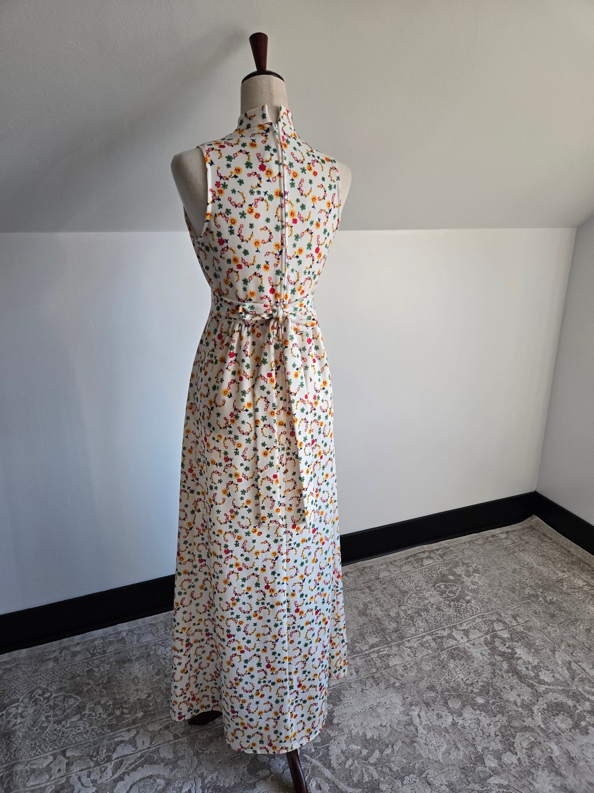Gay Gibson 1970s vintage micro print high neck maxi dress. It has an attached waist tie and zips in the back. It is a thicker poly knit material, so not shear. There is a button at the top of the high. neck, so it creates a peep hole at the chest. This dress has been washed and steamed!