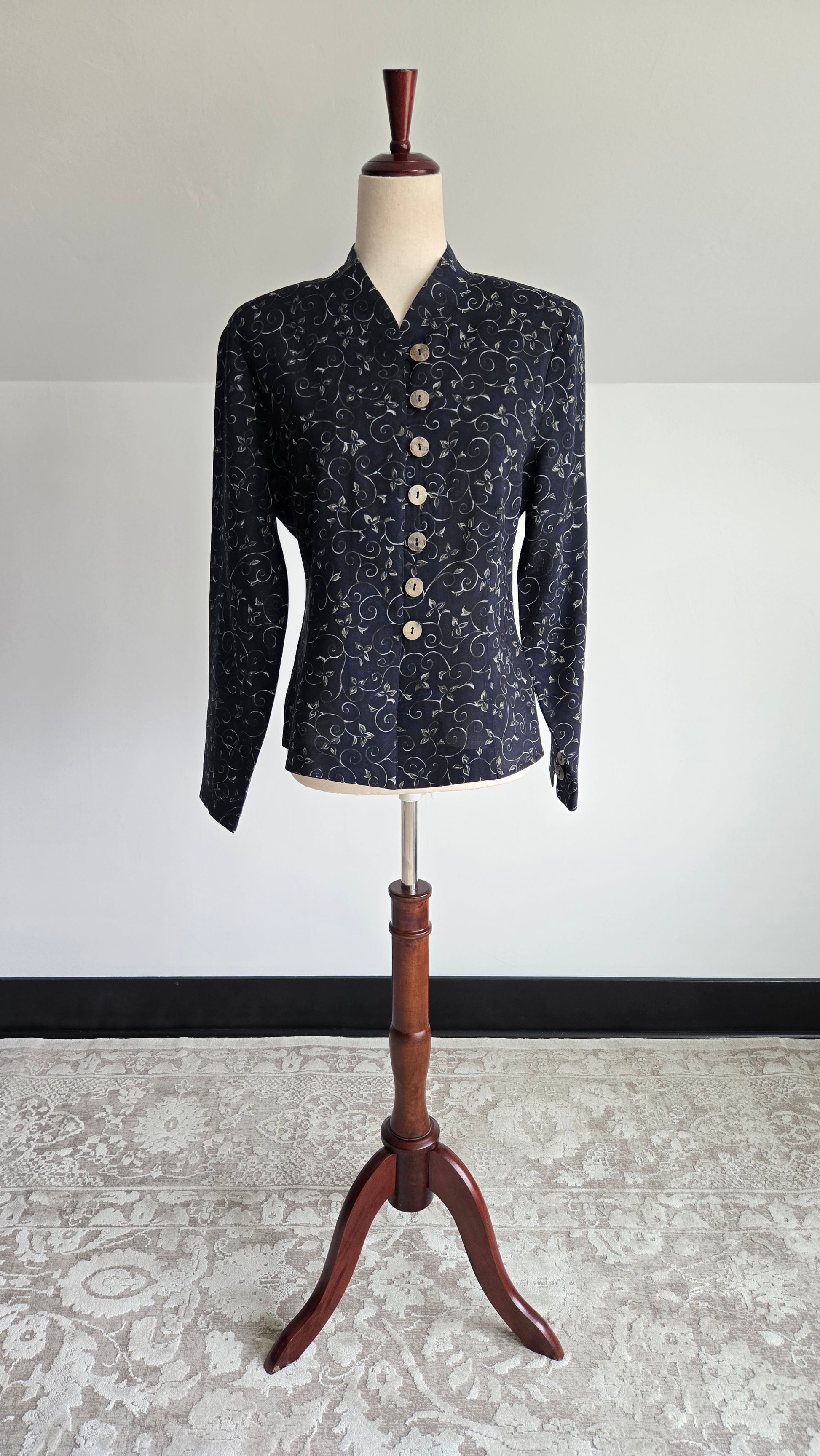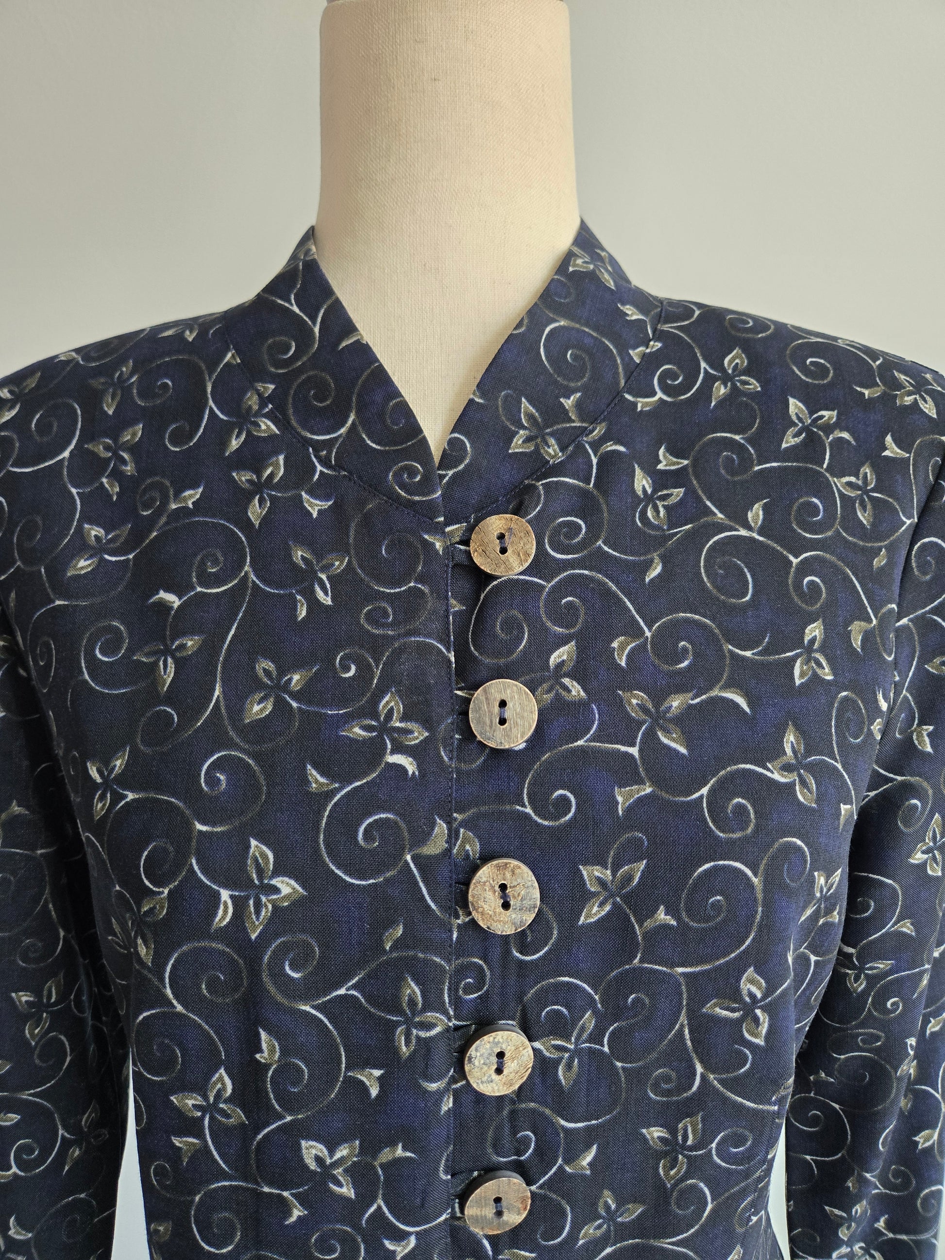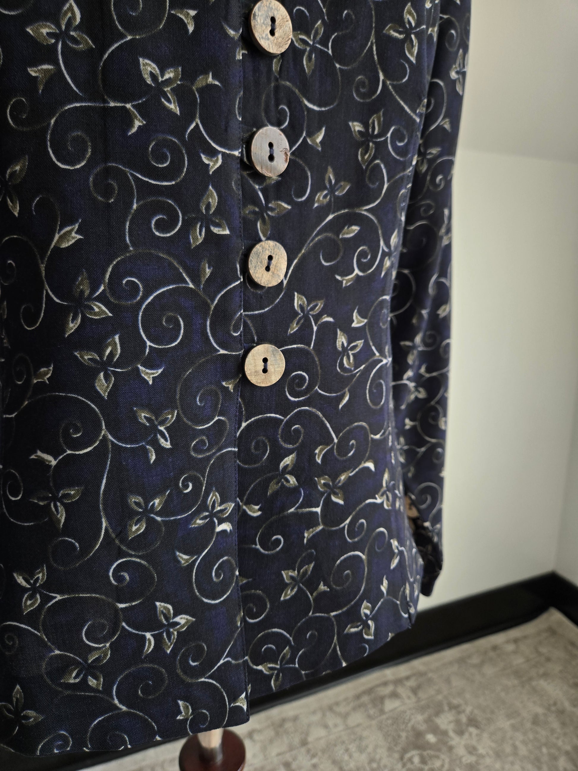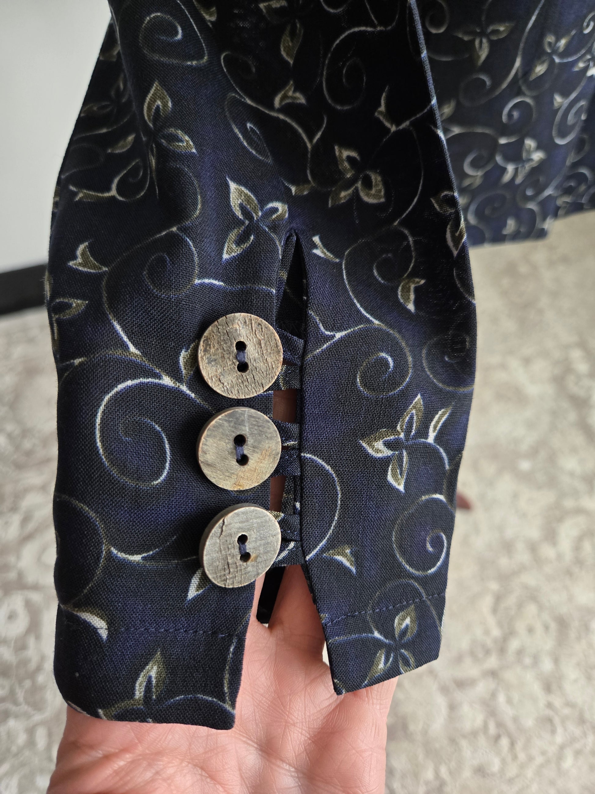 Vintage Geiger Collections top made in Austria lightweight wool blouse with wood buttons down center front and a mandarin collar. There are buttons on the sleeves as well. It is in perfect condition.