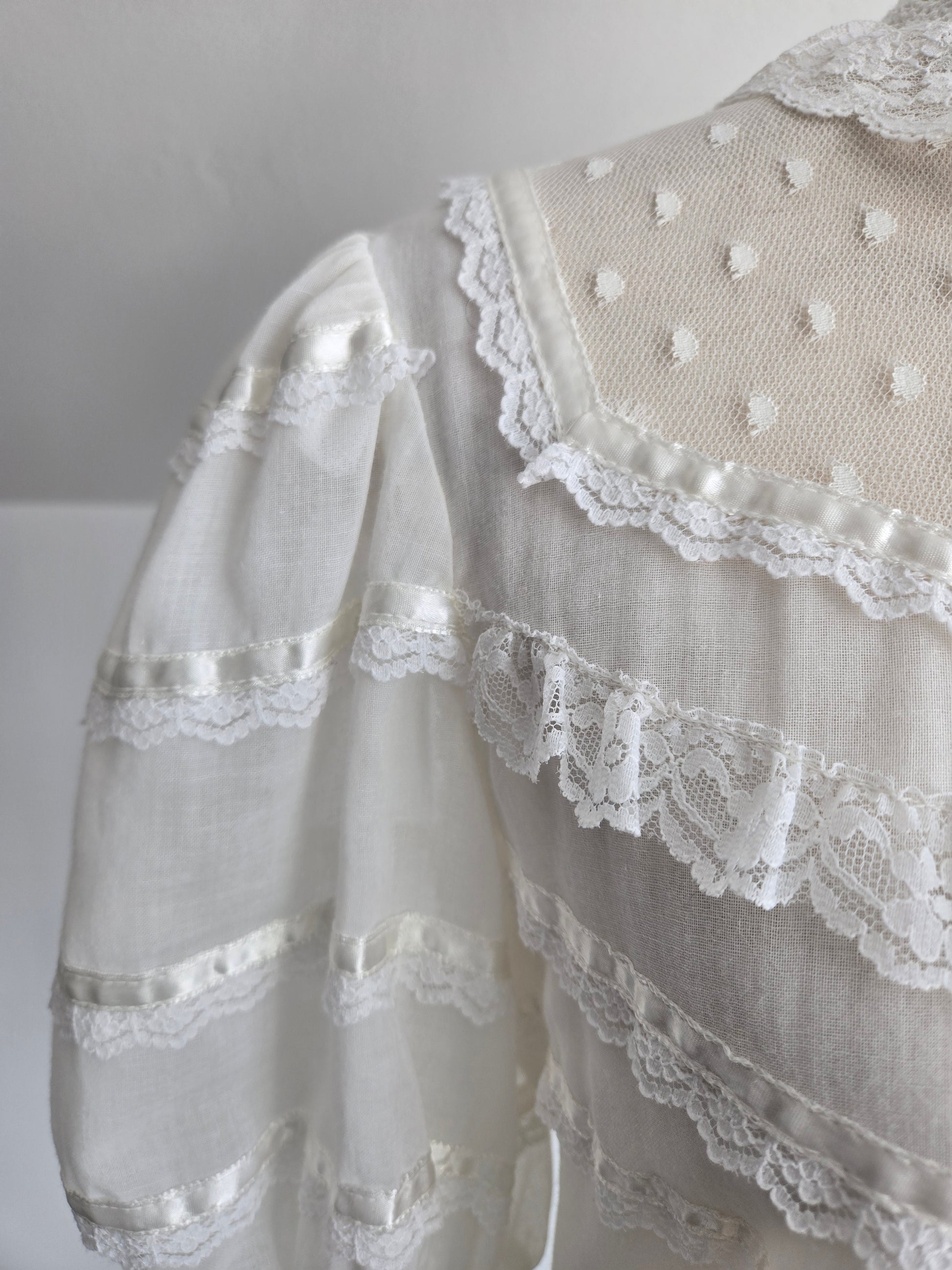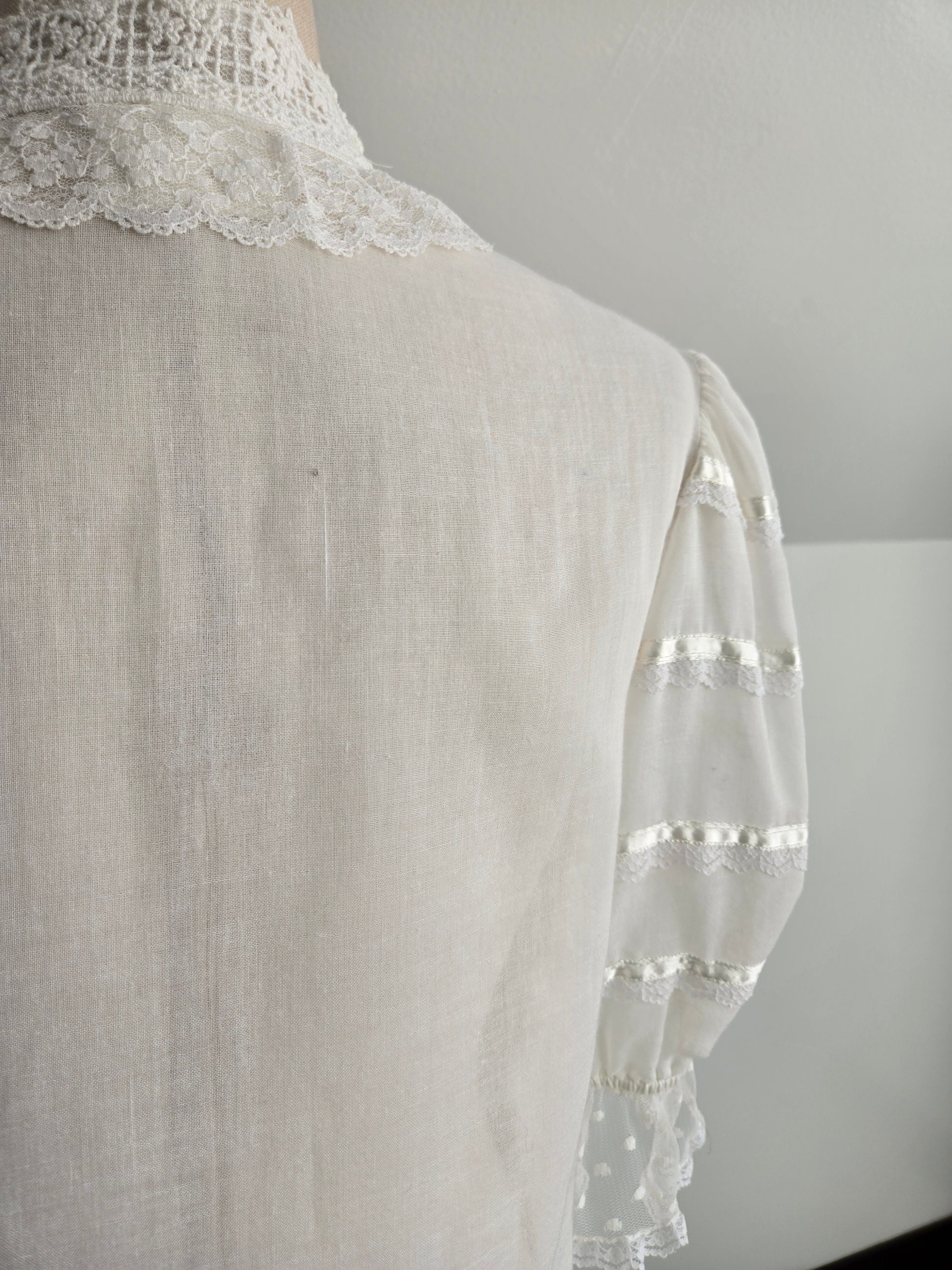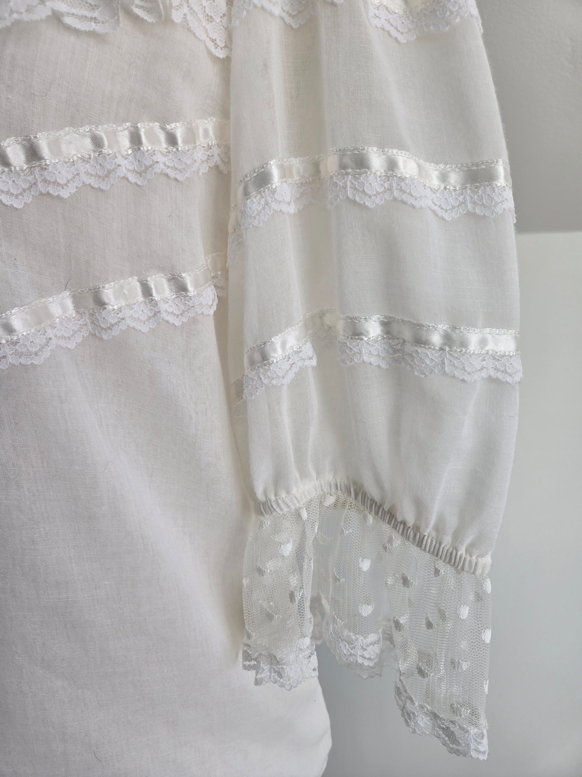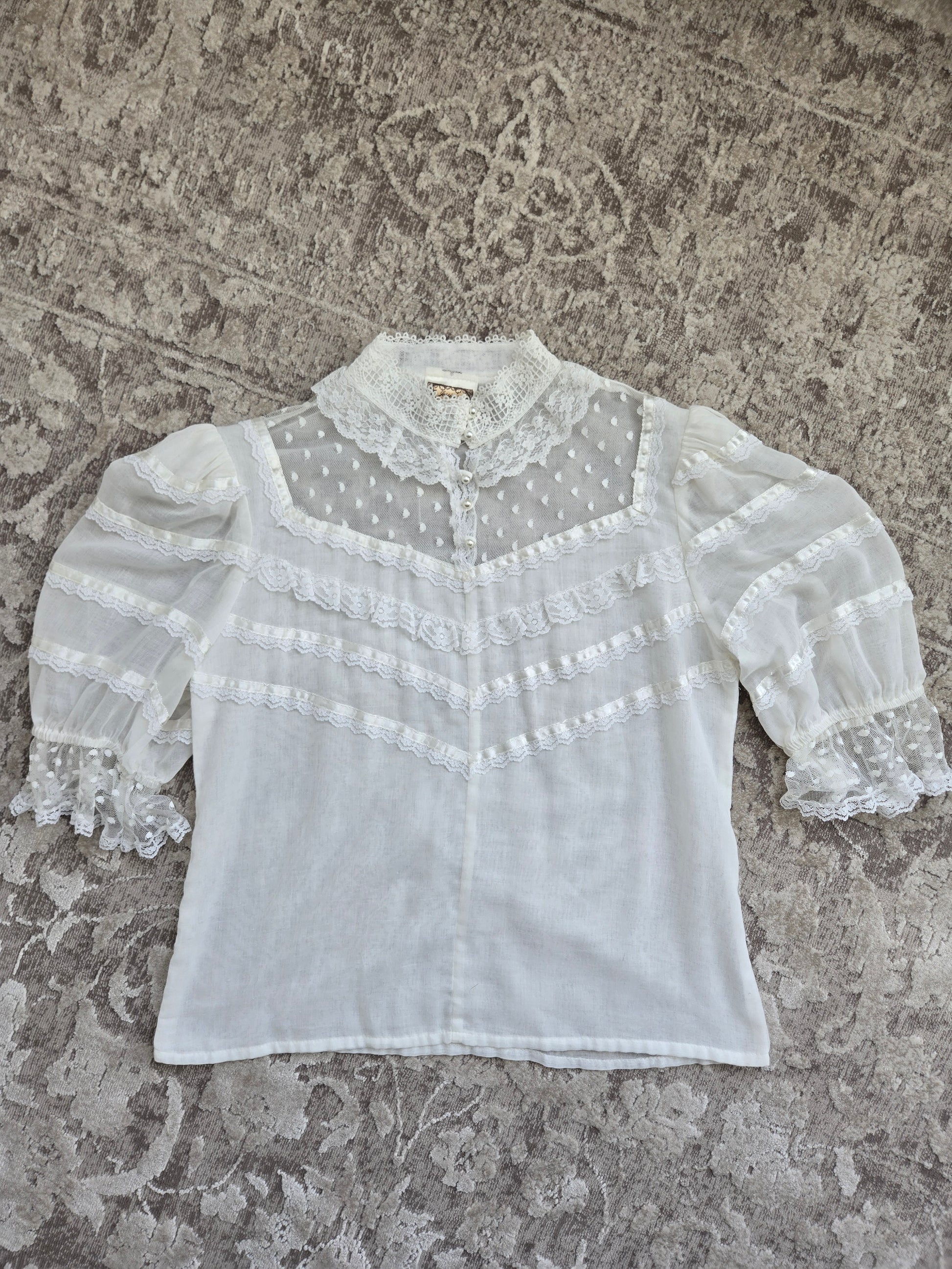 Vintage 70s Gunne Sax white gauzy blouse. It has the Jessica's Gunnies San Fransisco tag and it a mixture of semi shear cotton and shear lace fabrics. It has a shorter puff sleeve and satin ribbon trim. It features the classic Gunne Sax pearl buttons at the front. It has been washed and steamed and is ready to wear. Perfect condition.