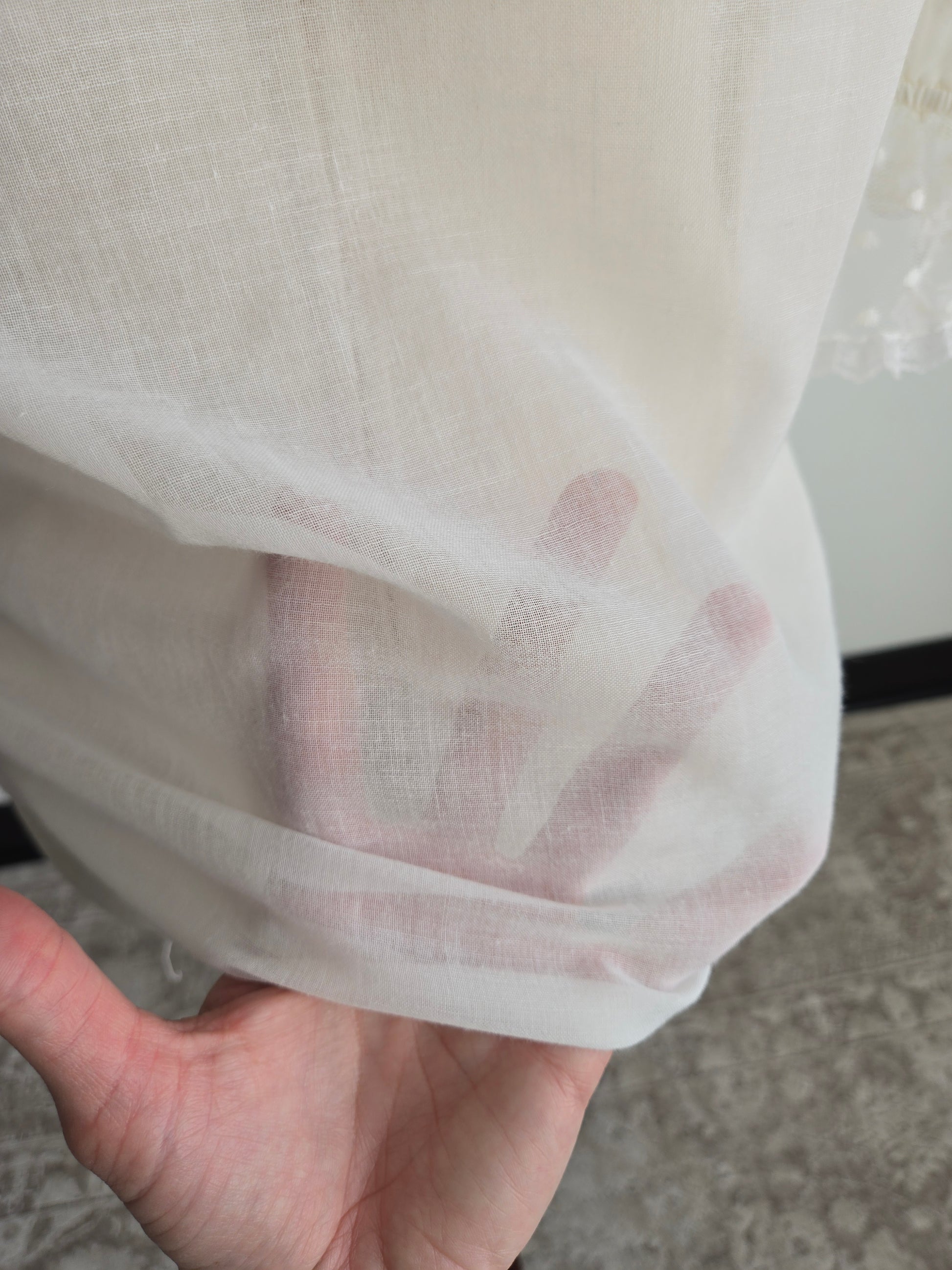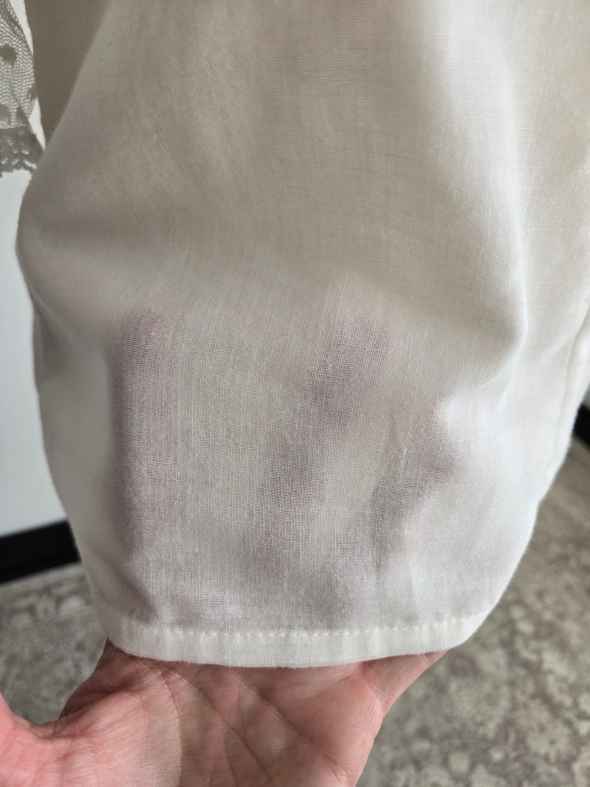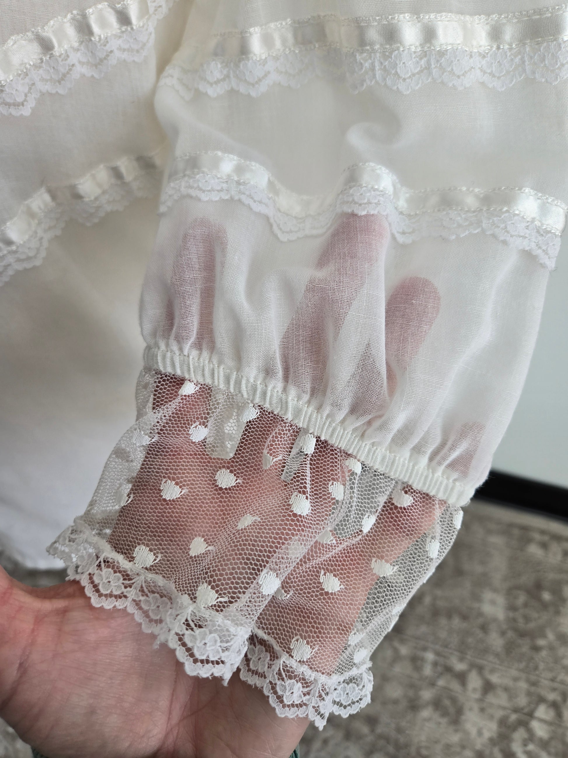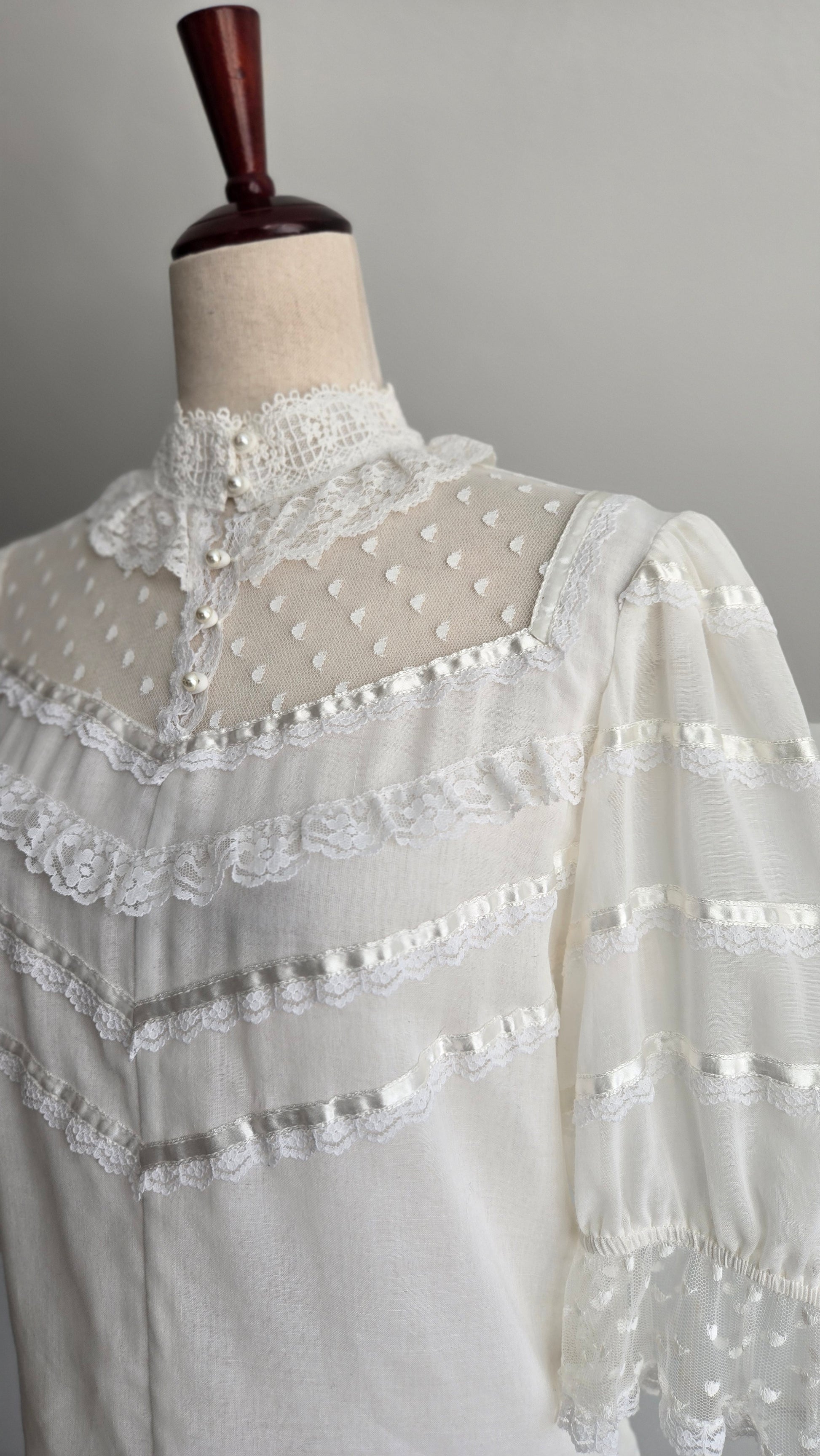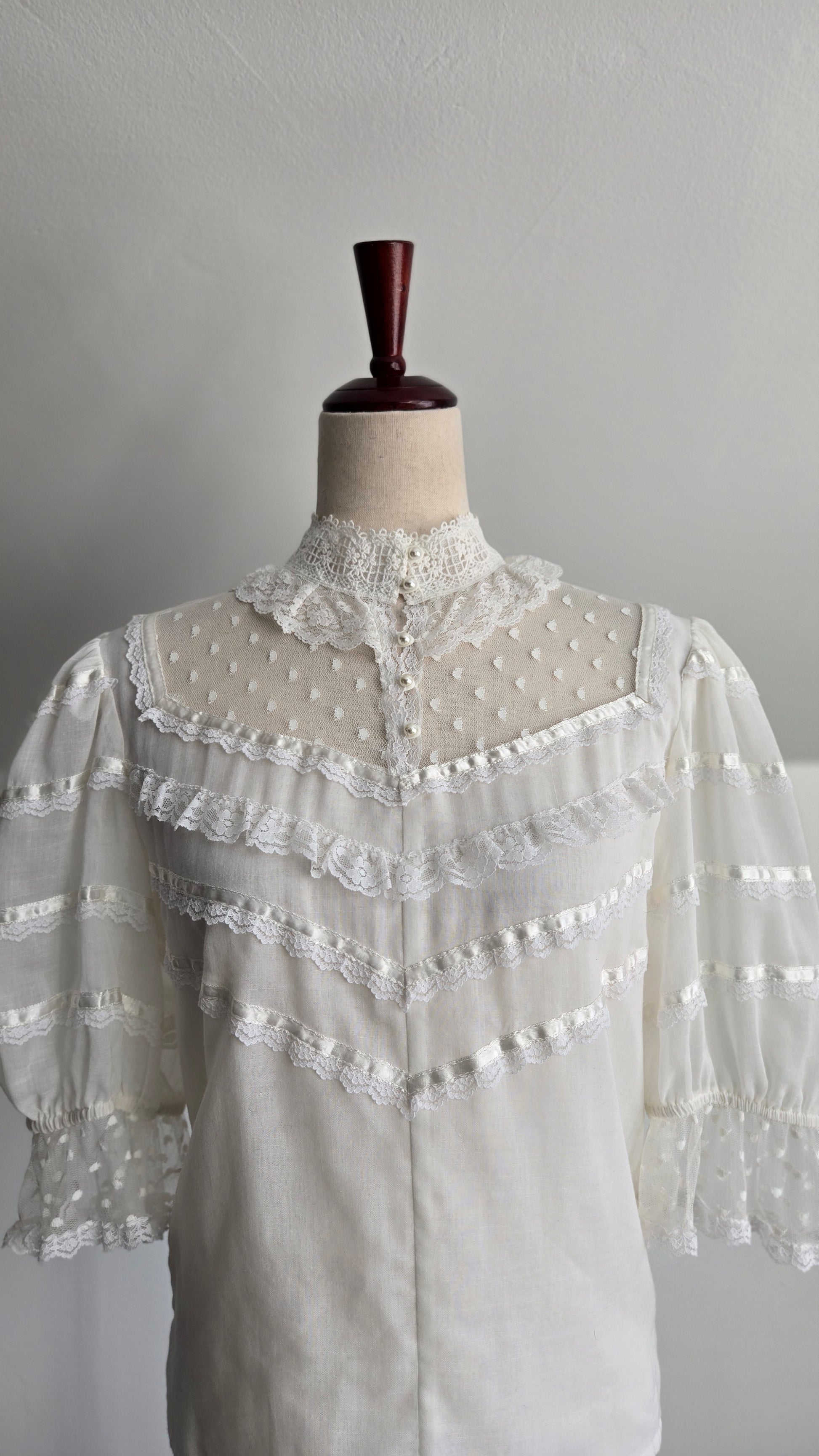 Vintage 70s Gunne Sax white gauzy blouse. It has the Jessica's Gunnies San Fransisco tag and it a mixture of semi shear cotton and shear lace fabrics. It has a shorter puff sleeve and satin ribbon trim. It features the classic Gunne Sax pearl buttons at the front. It has been washed and steamed and is ready to wear. Perfect condition.