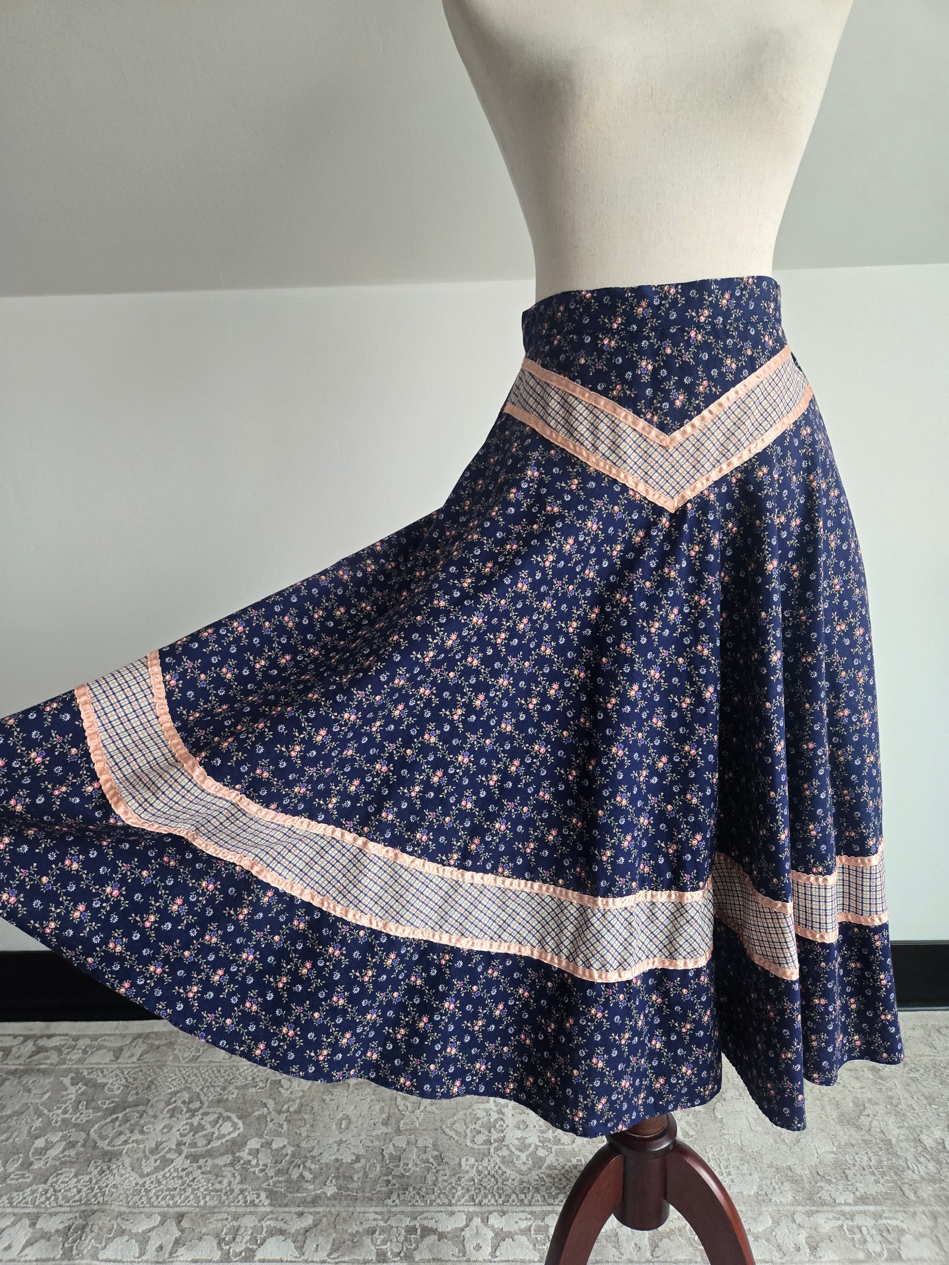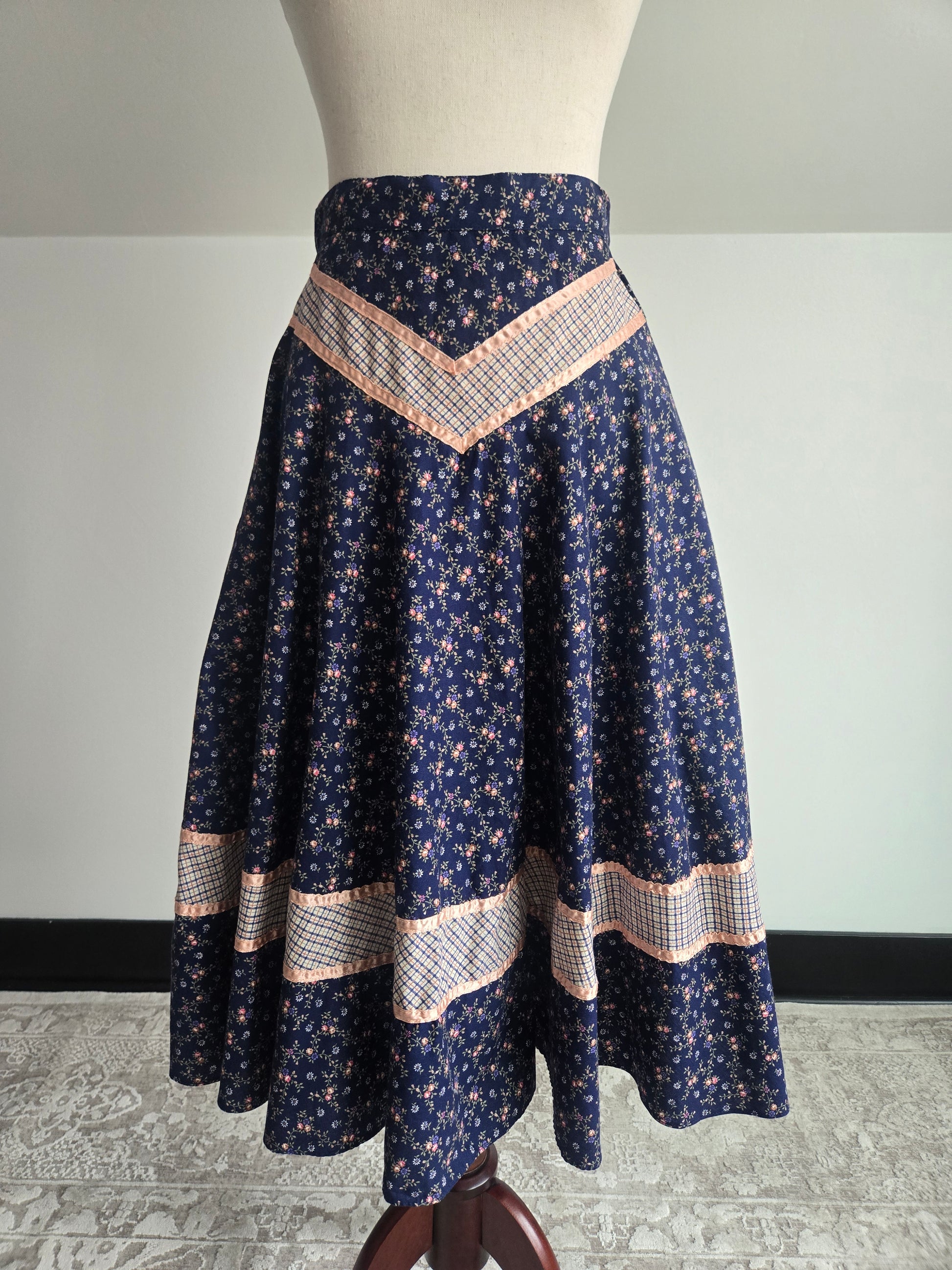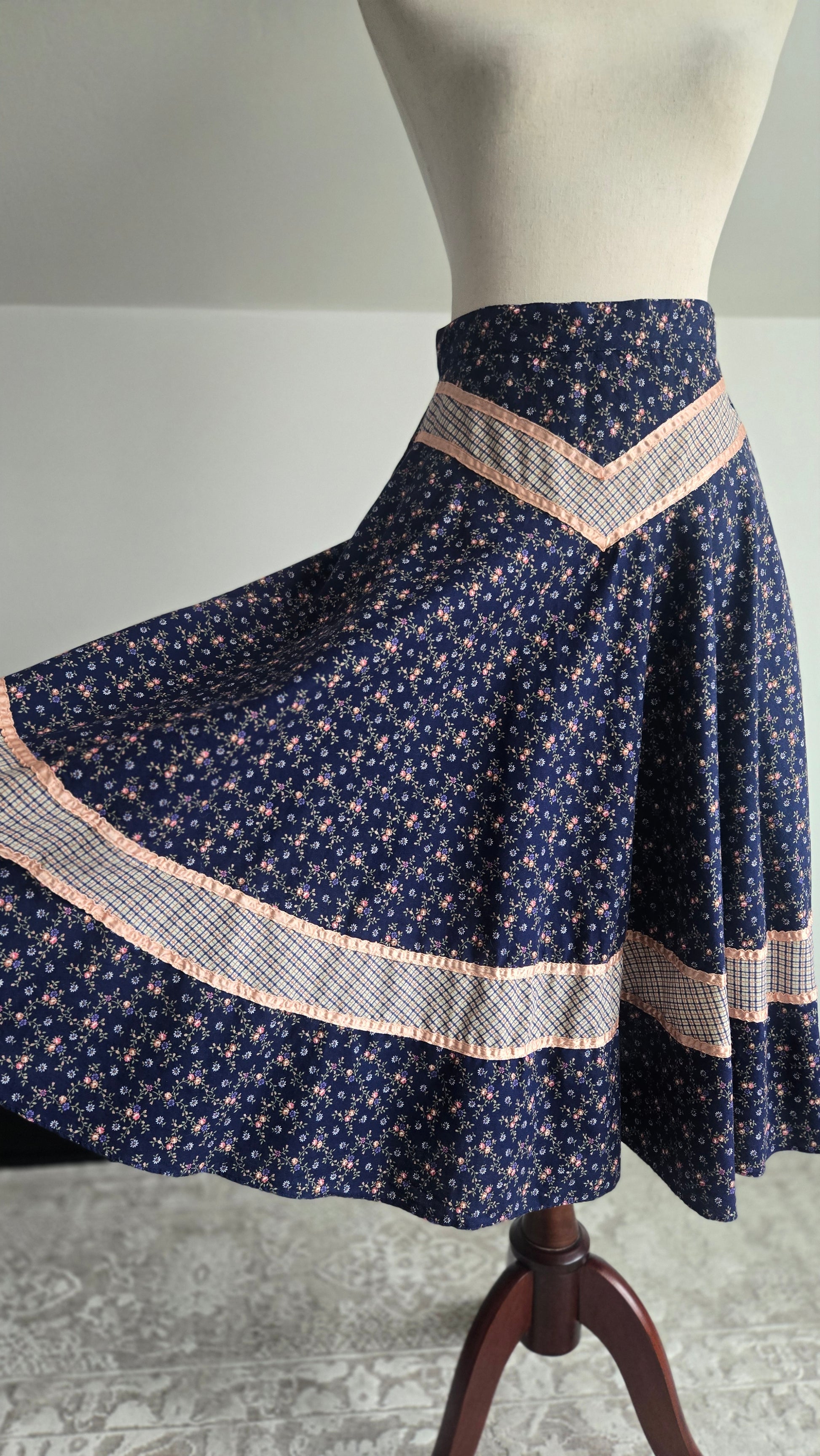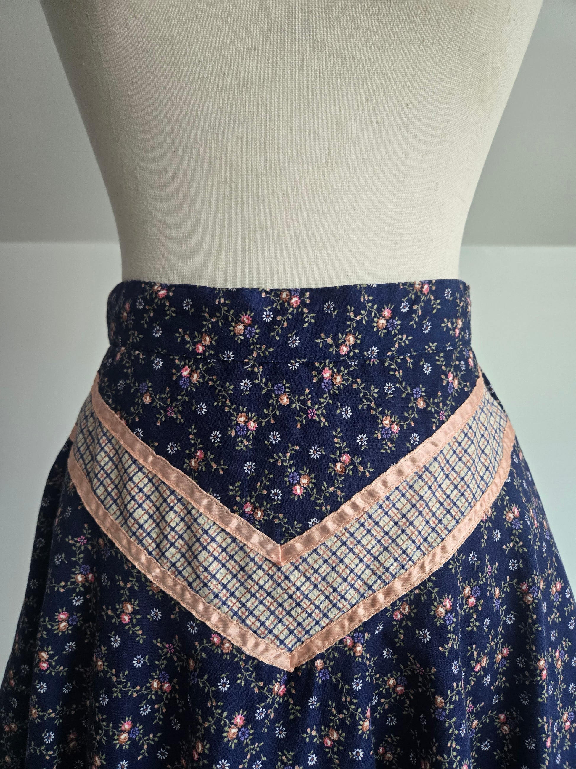 Jessica's authentic Gunnies San Fransisco vintage navy blue floral skirt. It has a micro floral print mixed with a plaid patterned material trimmed in a pink satin ribbon. It zips in the back and has a swing style skirt shape with lots of fabric. It is in perfect condition and has been freshly washed.