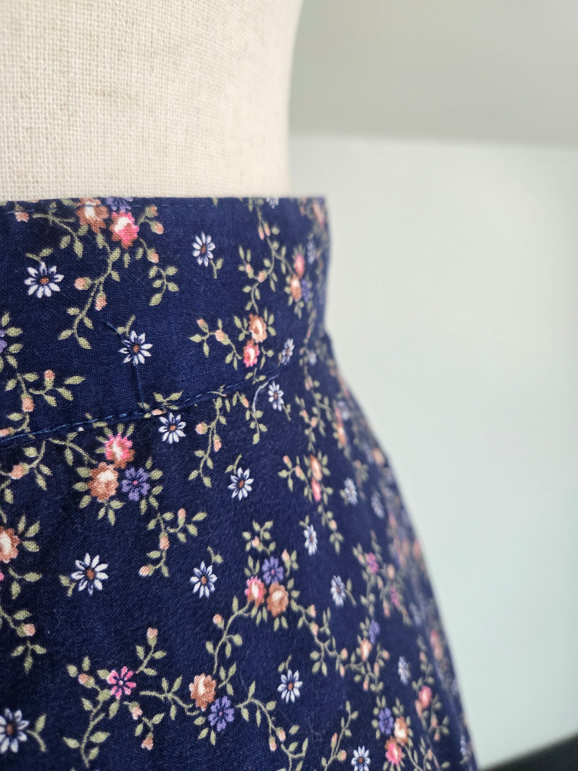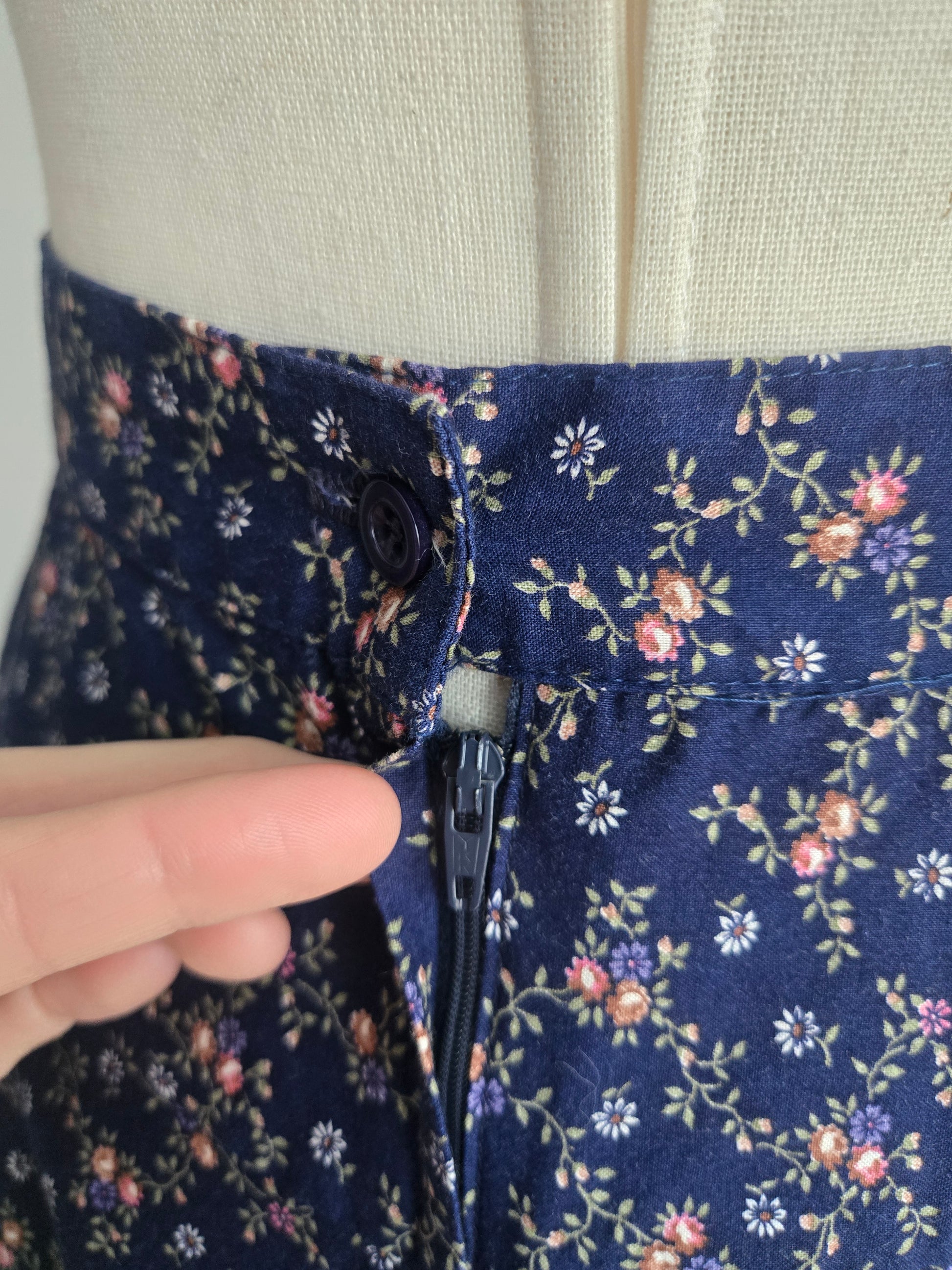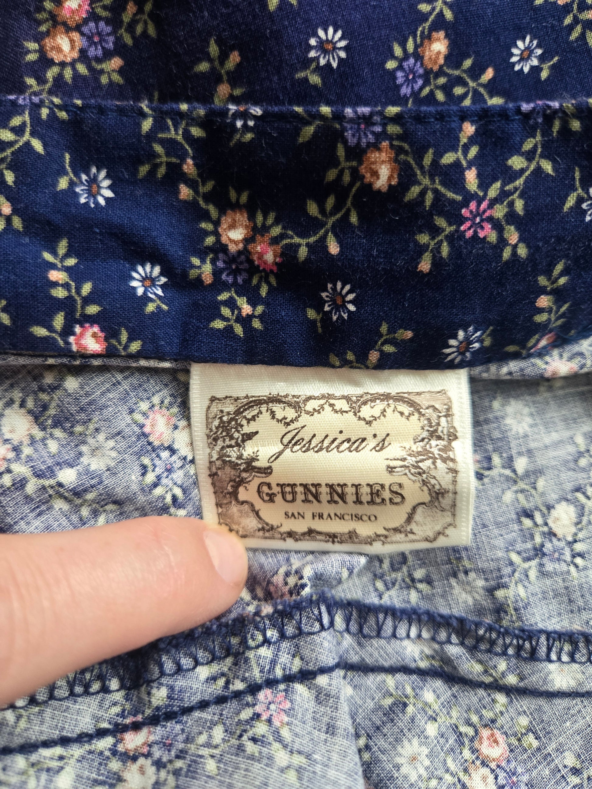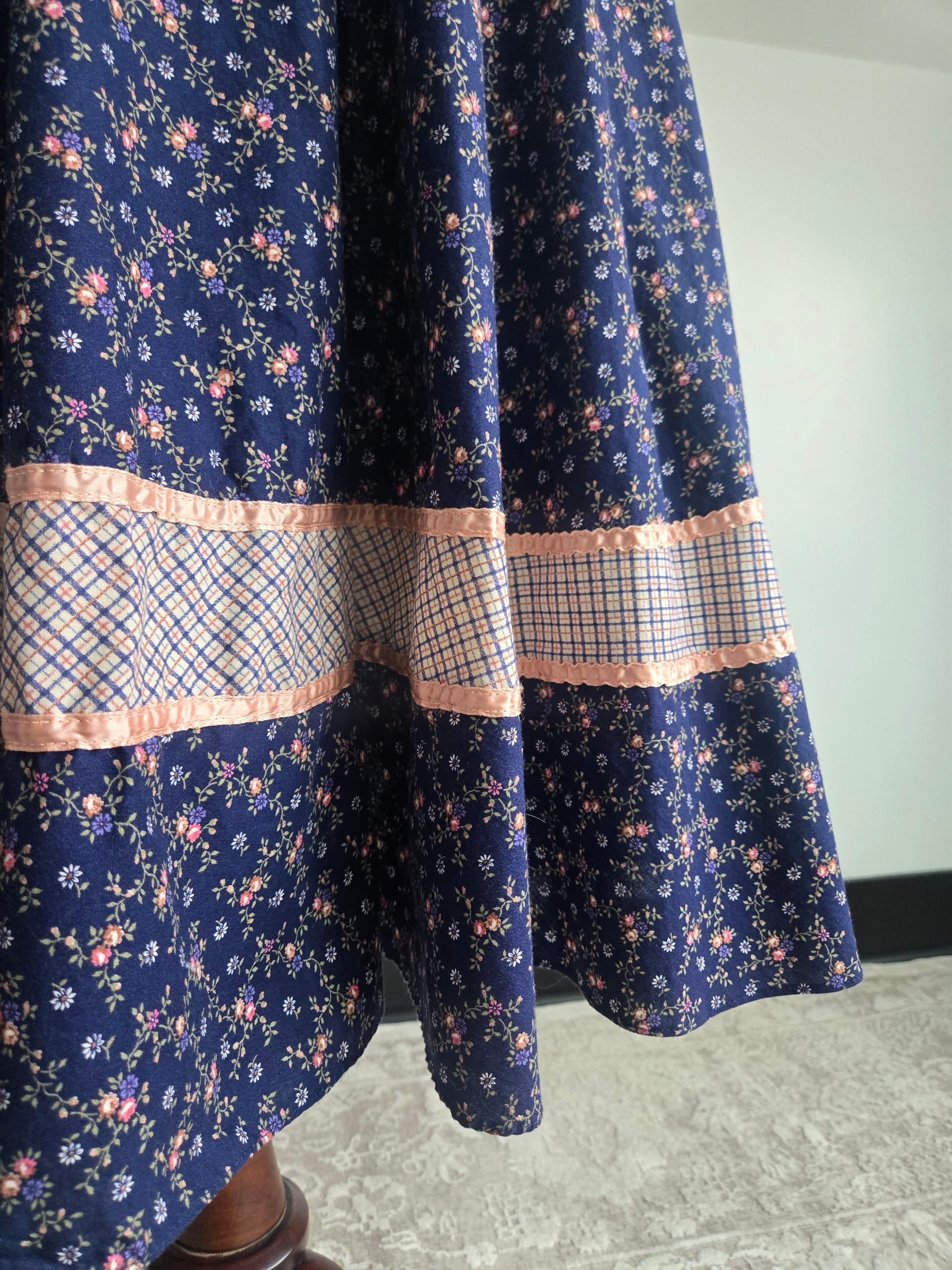 Jessica's authentic Gunnies San Fransisco vintage navy blue floral skirt. It has a micro floral print mixed with a plaid patterned material trimmed in a pink satin ribbon. It zips in the back and has a swing style skirt shape with lots of fabric. It is in perfect condition and has been freshly washed.