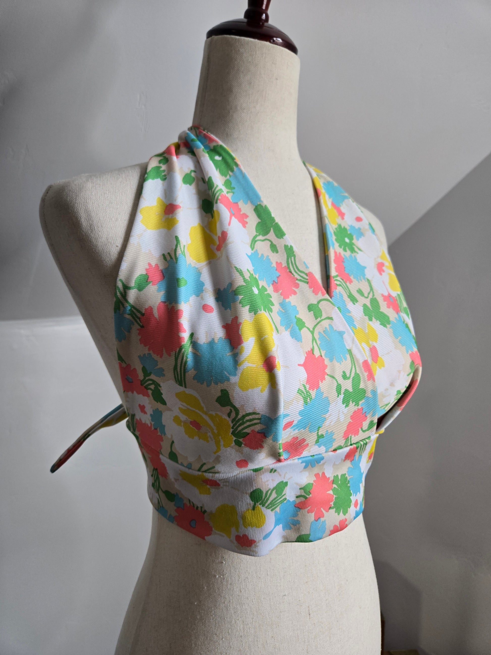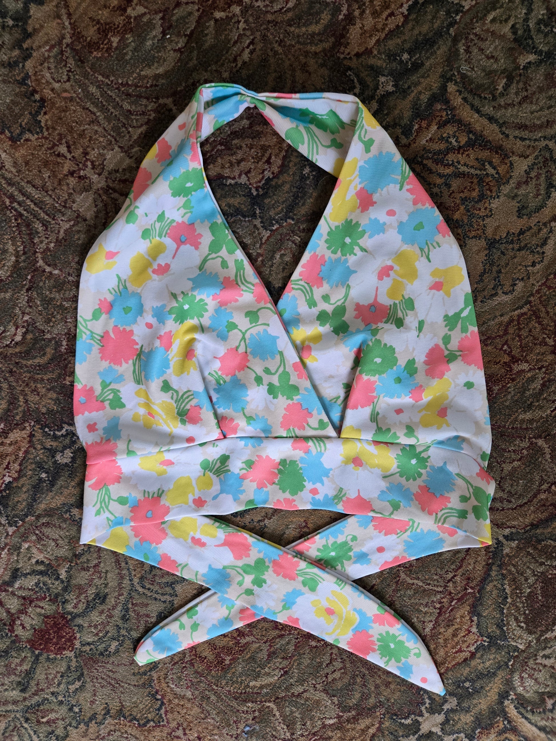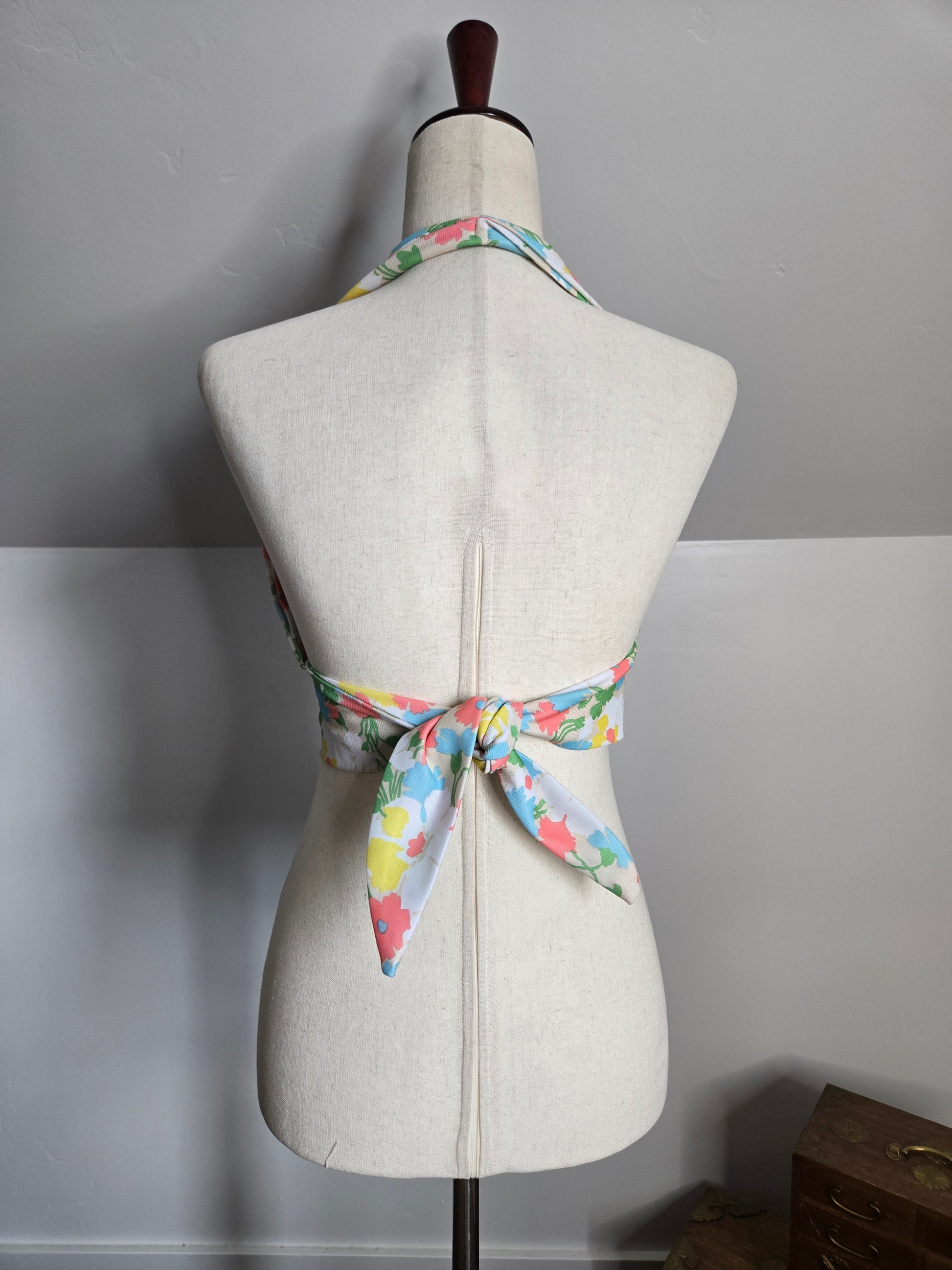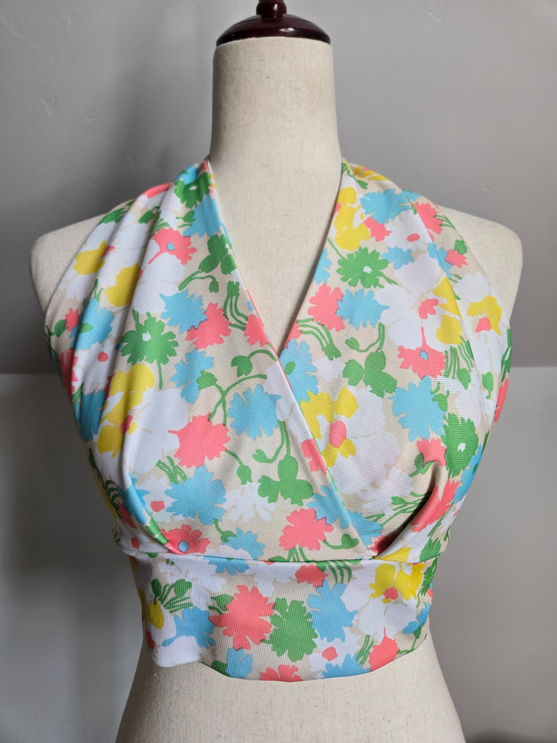 Vintage 70s poly knit floral print halter top with a tie in the back. The neck is not adjustable, but the tie around the waist is. This piece is hard to measure, but I think it will fit best for a small/medium, or maybe up to a smaller large.