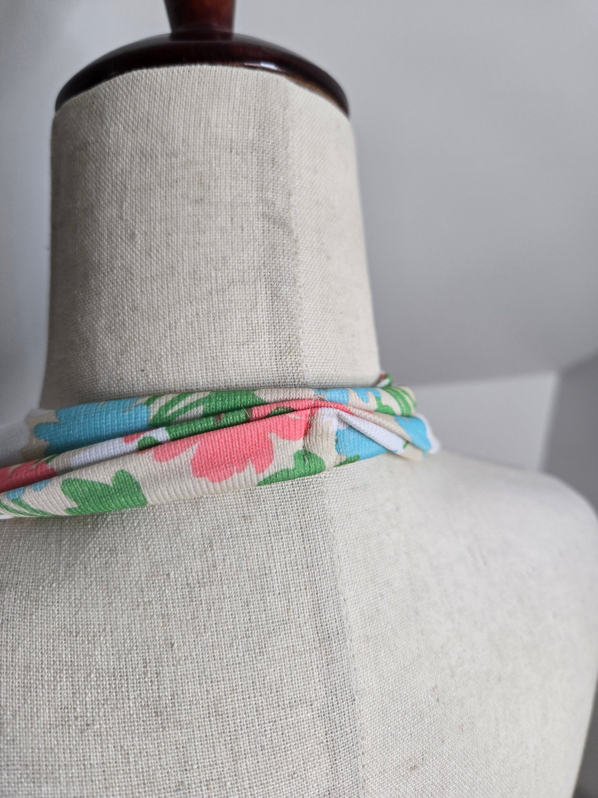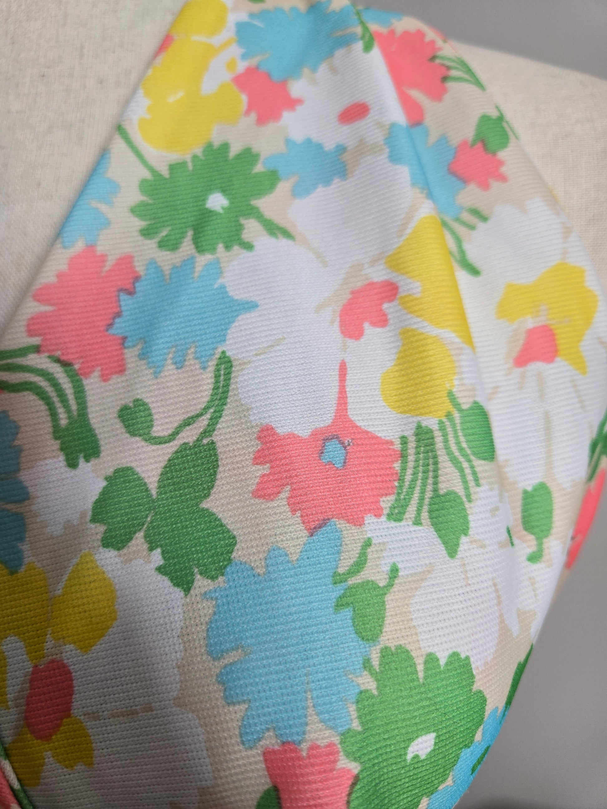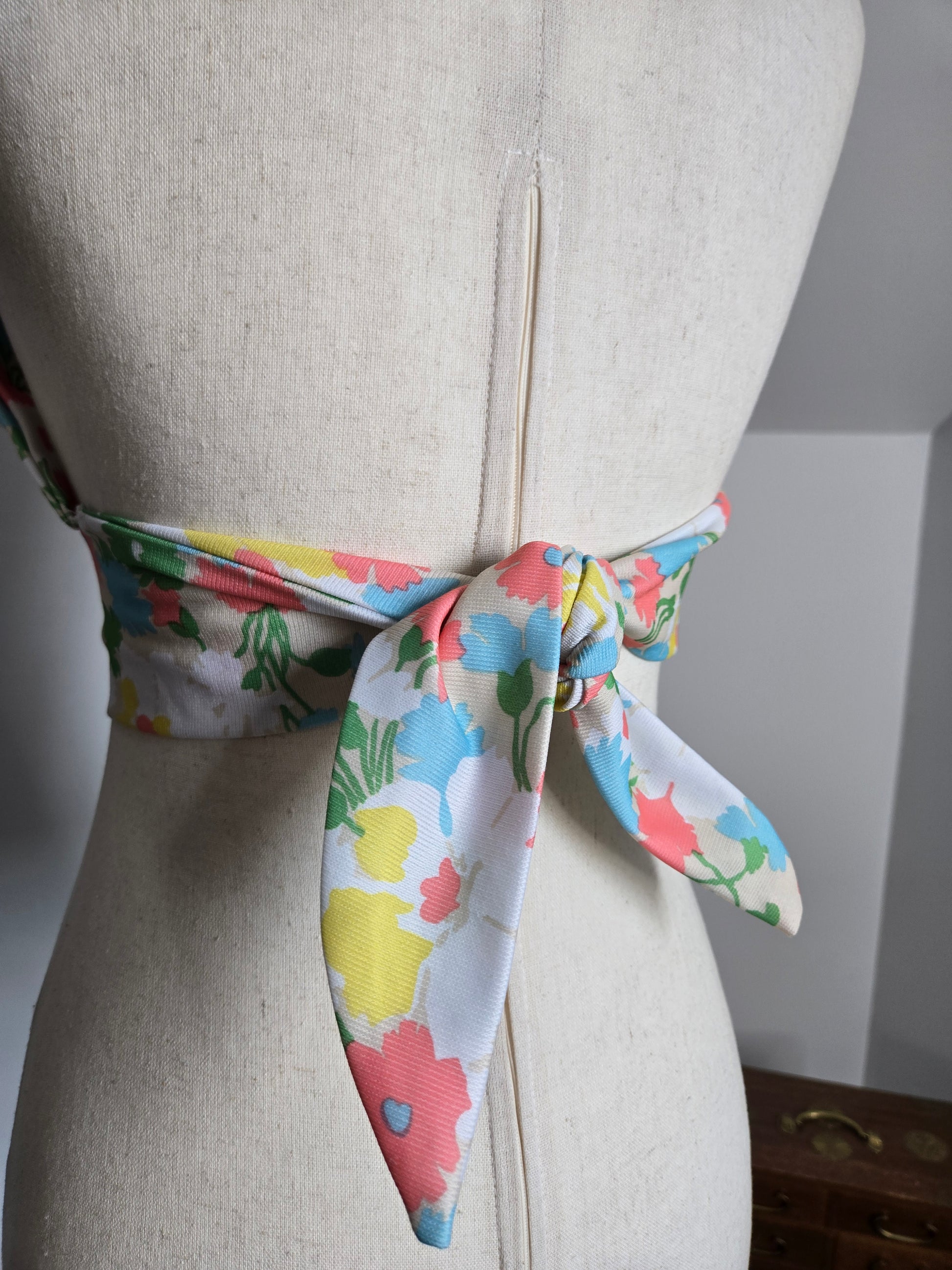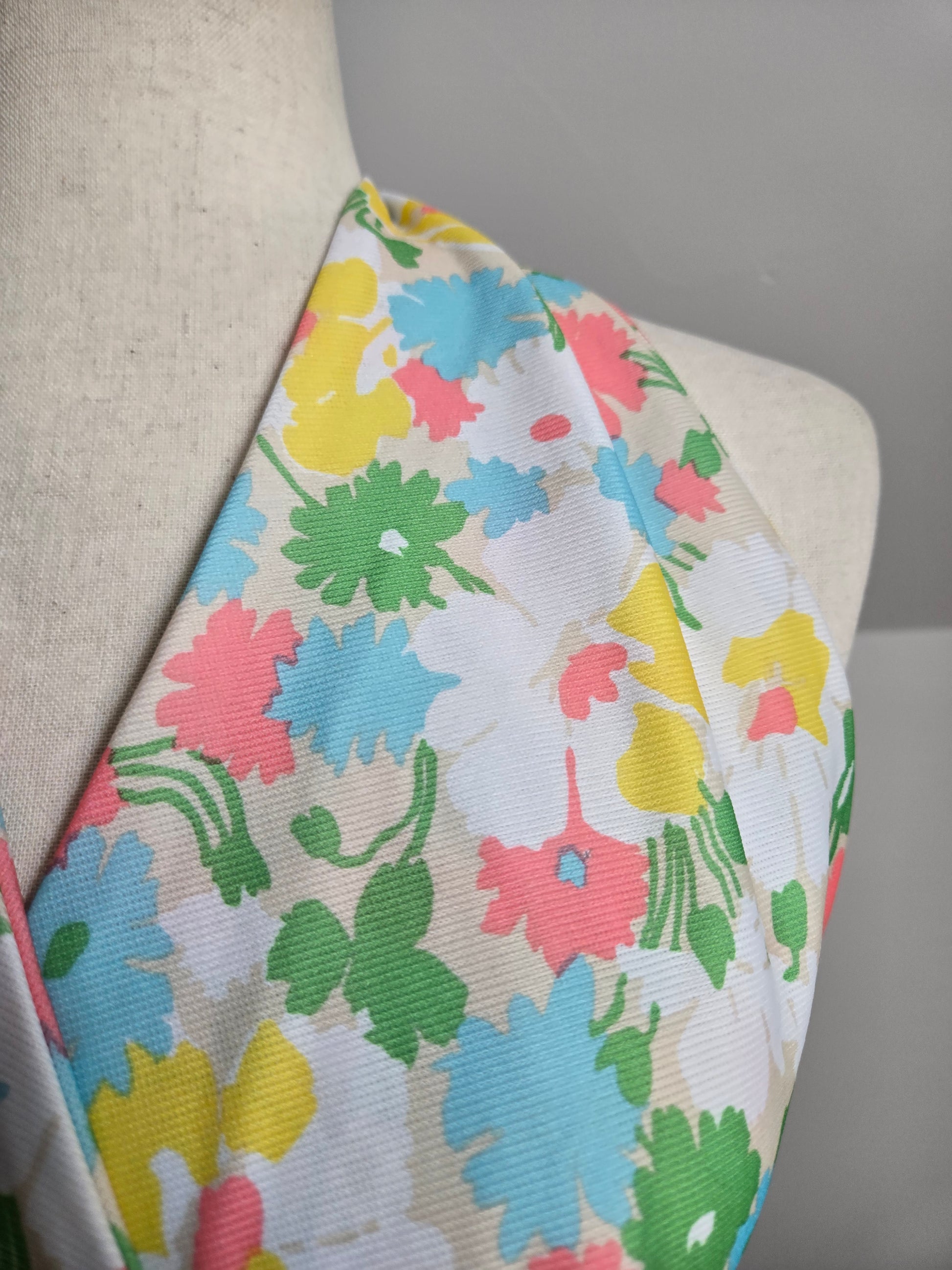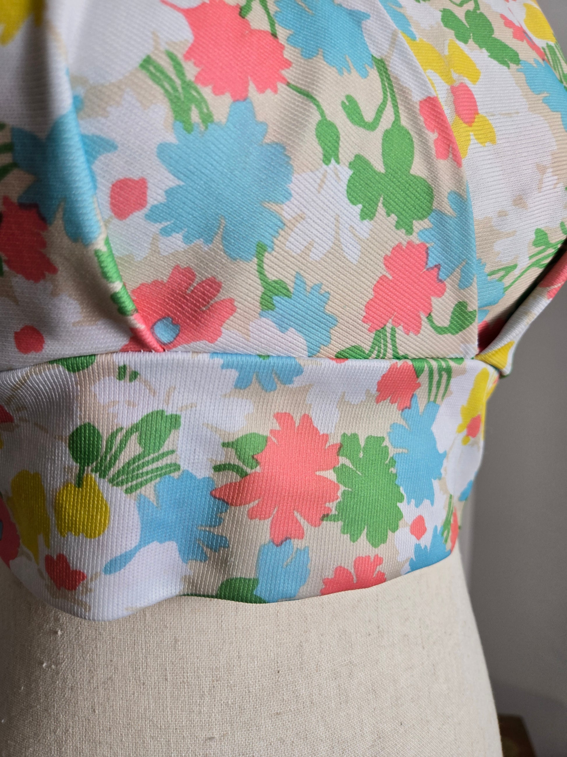 Vintage 70s poly knit floral print halter top with a tie in the back. The neck is not adjustable, but the tie around the waist is. This piece is hard to measure, but I think it will fit best for a small/medium, or maybe up to a smaller large.