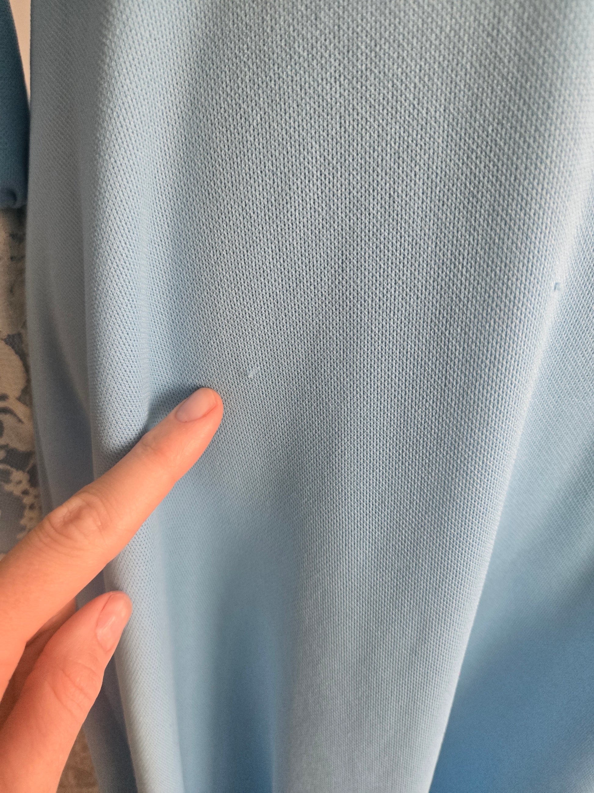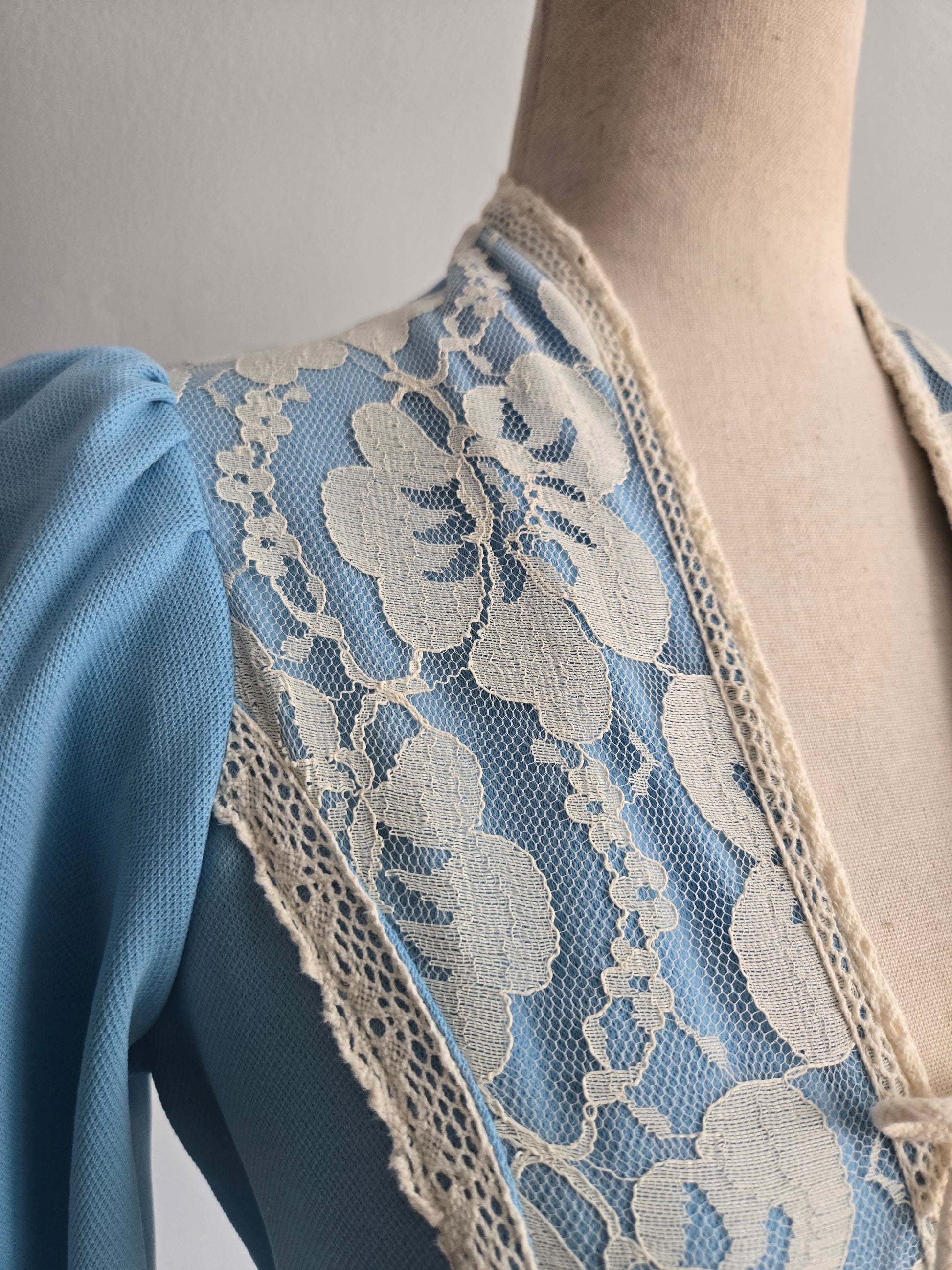 Vintage 70s sky blue poly knit maxi dress with a Hawaiian style floral lace at the front and sleeves of the dress. Small puff shoulder and lace up corset style top. There is a zipper at the back closure and also at the each cuffs. There are tiny small snags in the fabric, pointed out in the pictures. It has been washed and is ready to wear.