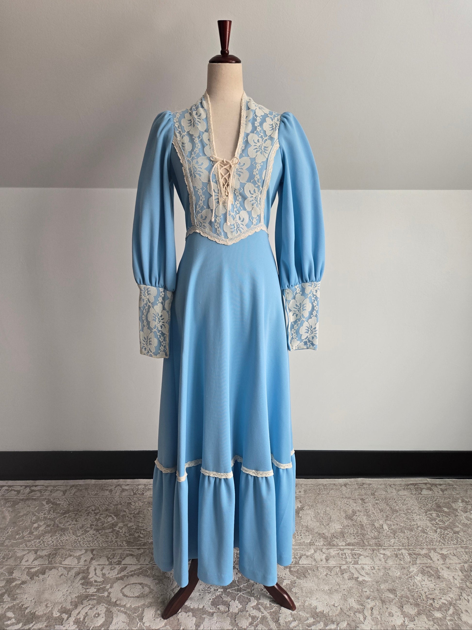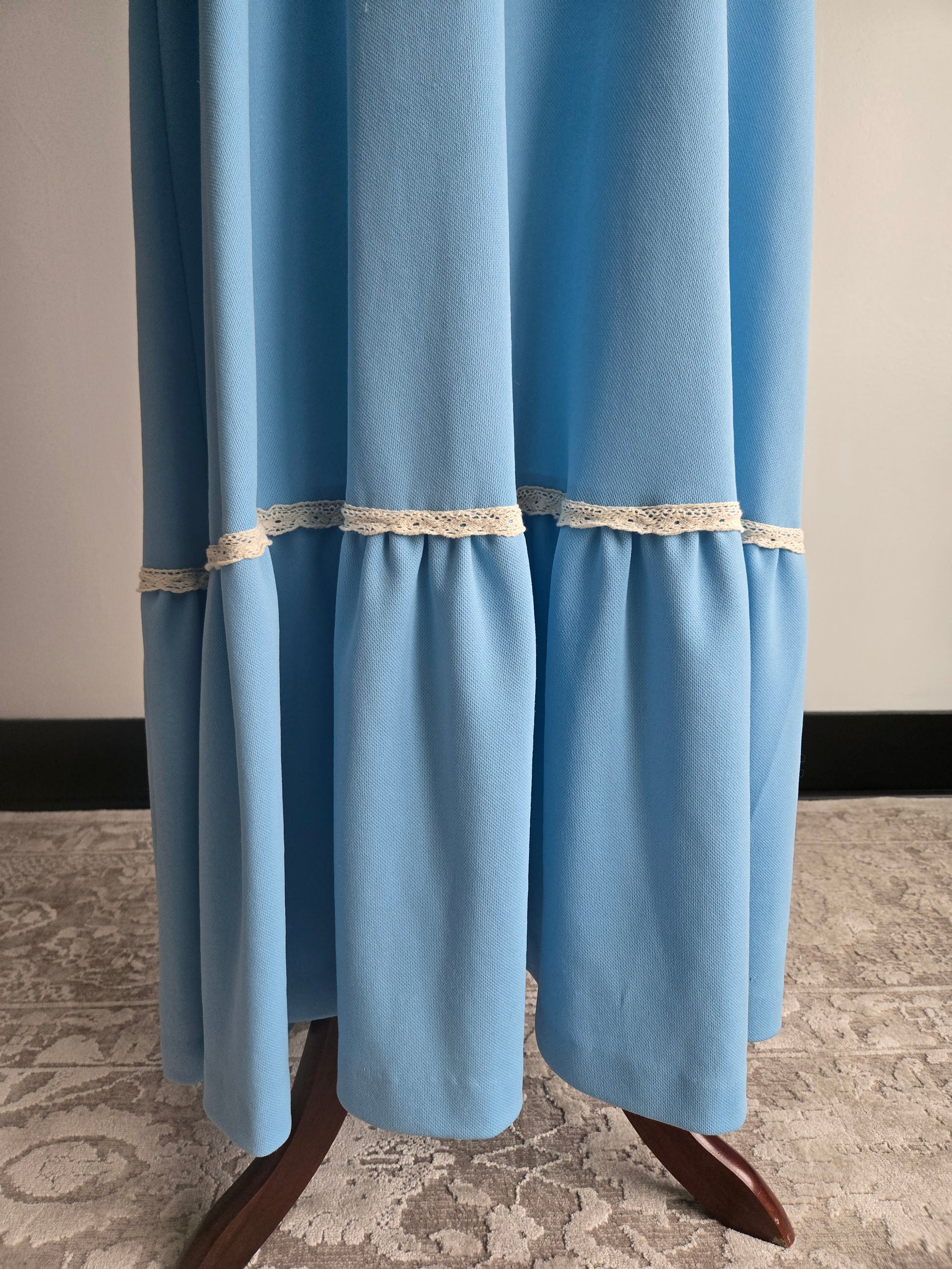Vintage 1970s Sky Blue Prairie Dress with Floral Lace Details and Corset Top - Small
