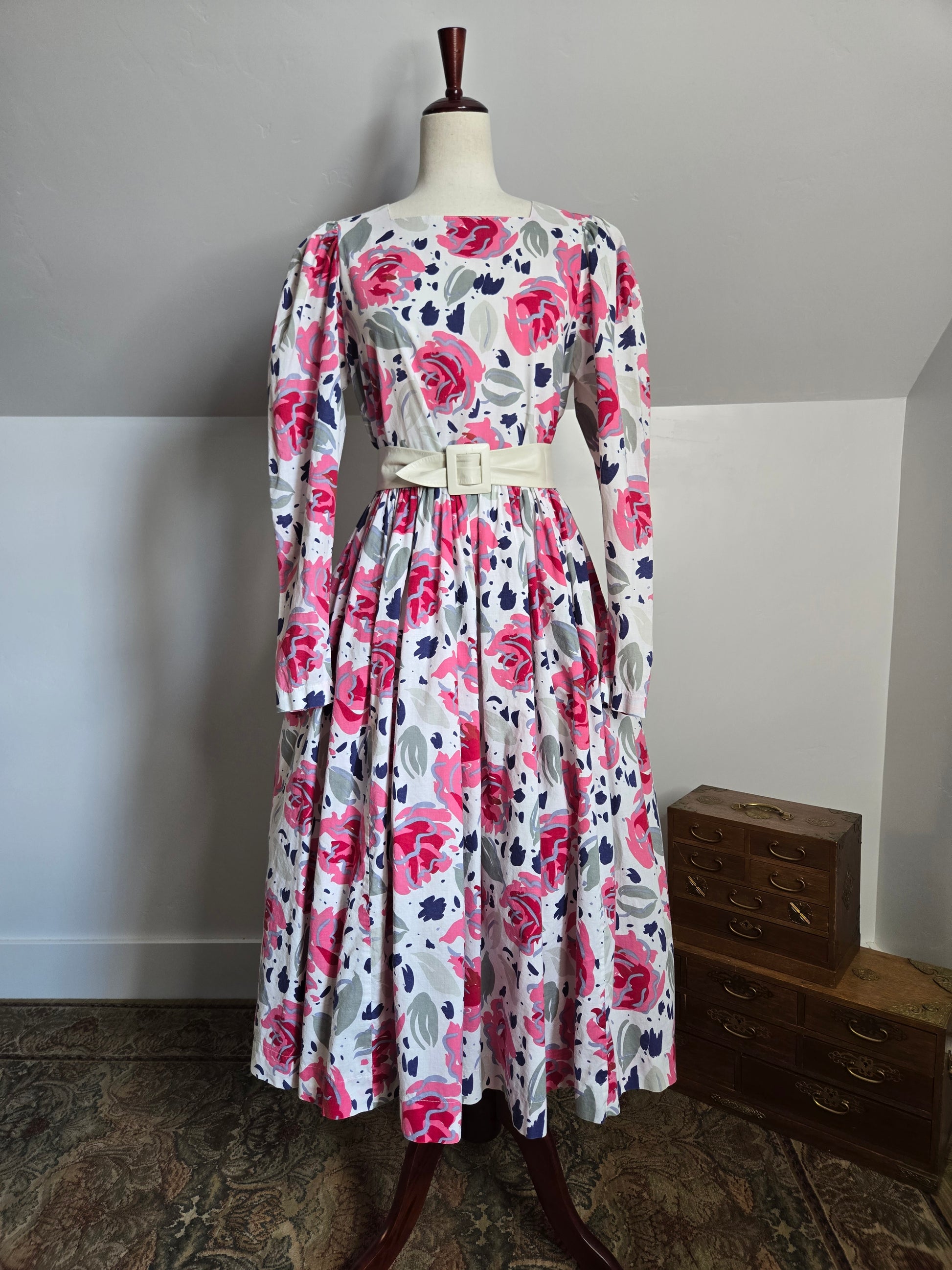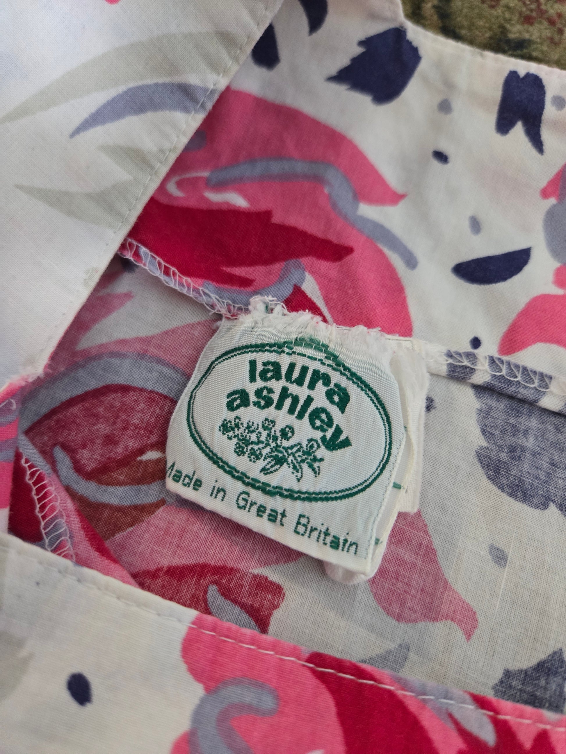 Laura Ashley vintage 100% cotton floral made in Great Britain dress. It is a white base with pink, red, and shades of gray floral print all over. It zips in the back and has a small puff shoulder with a long sleeve for a really cute shape. I also pictured it belted, but please note, the belt is not included, just for styling. It is in amazing condition and has been washed and steamed.