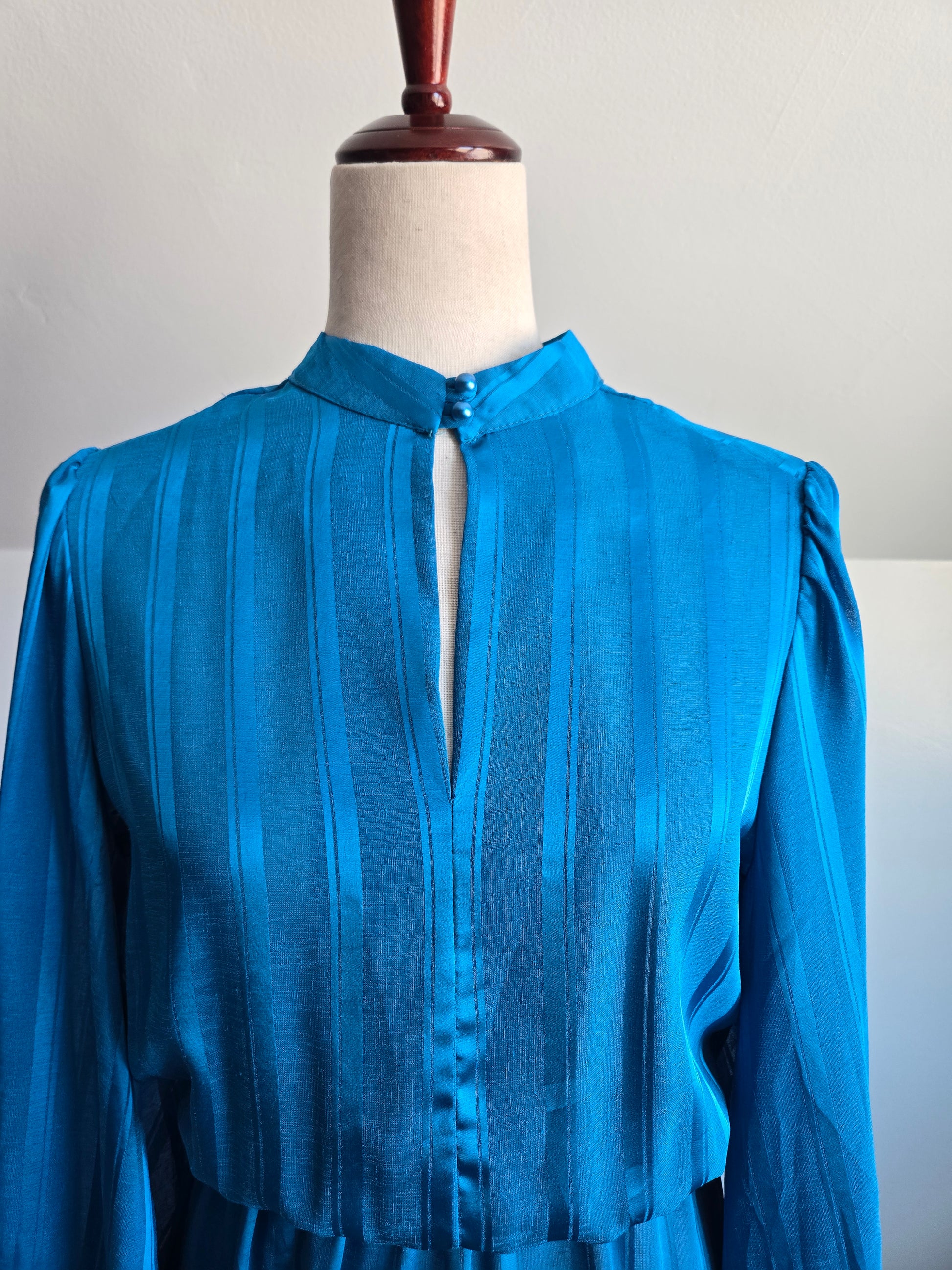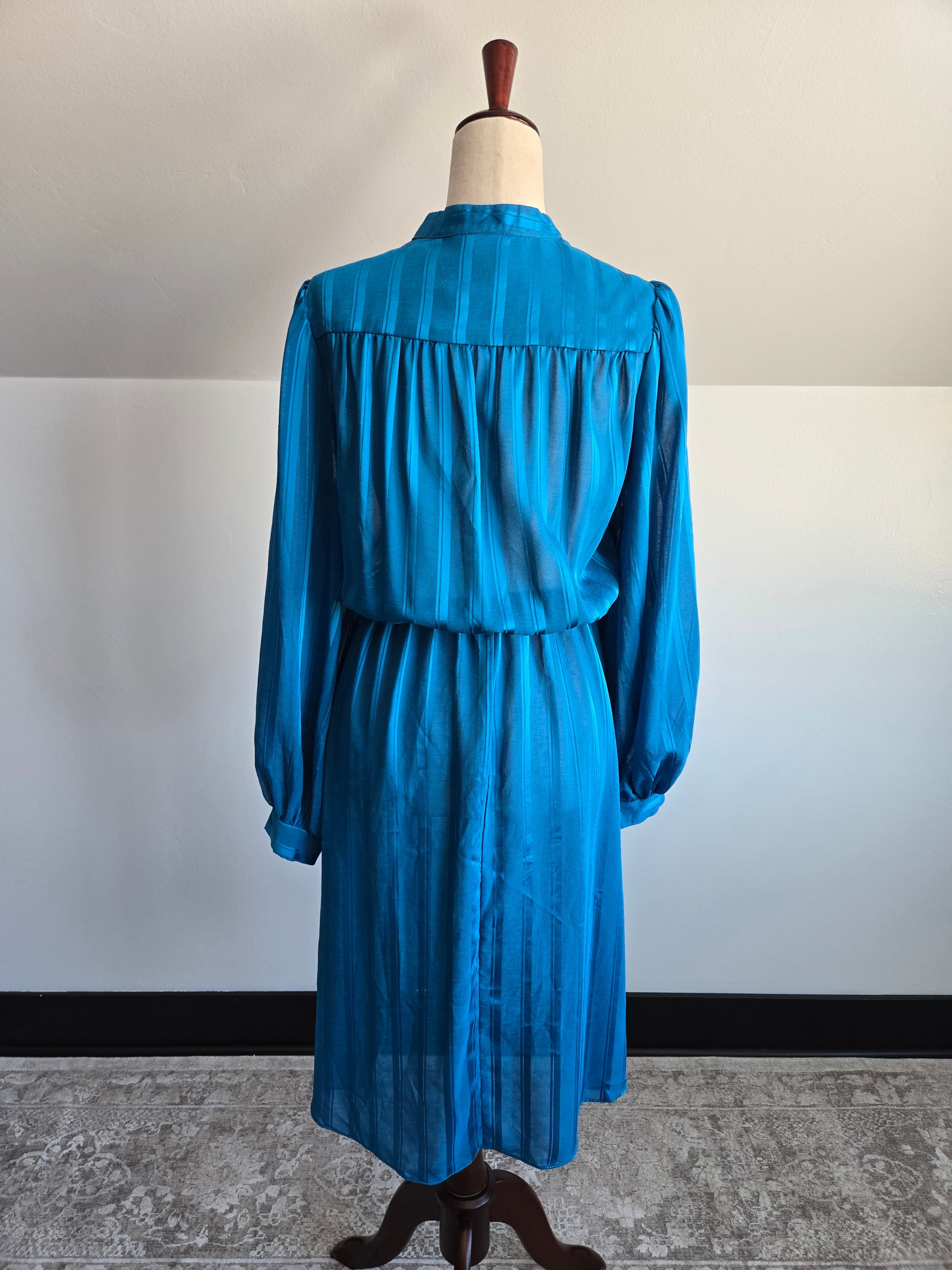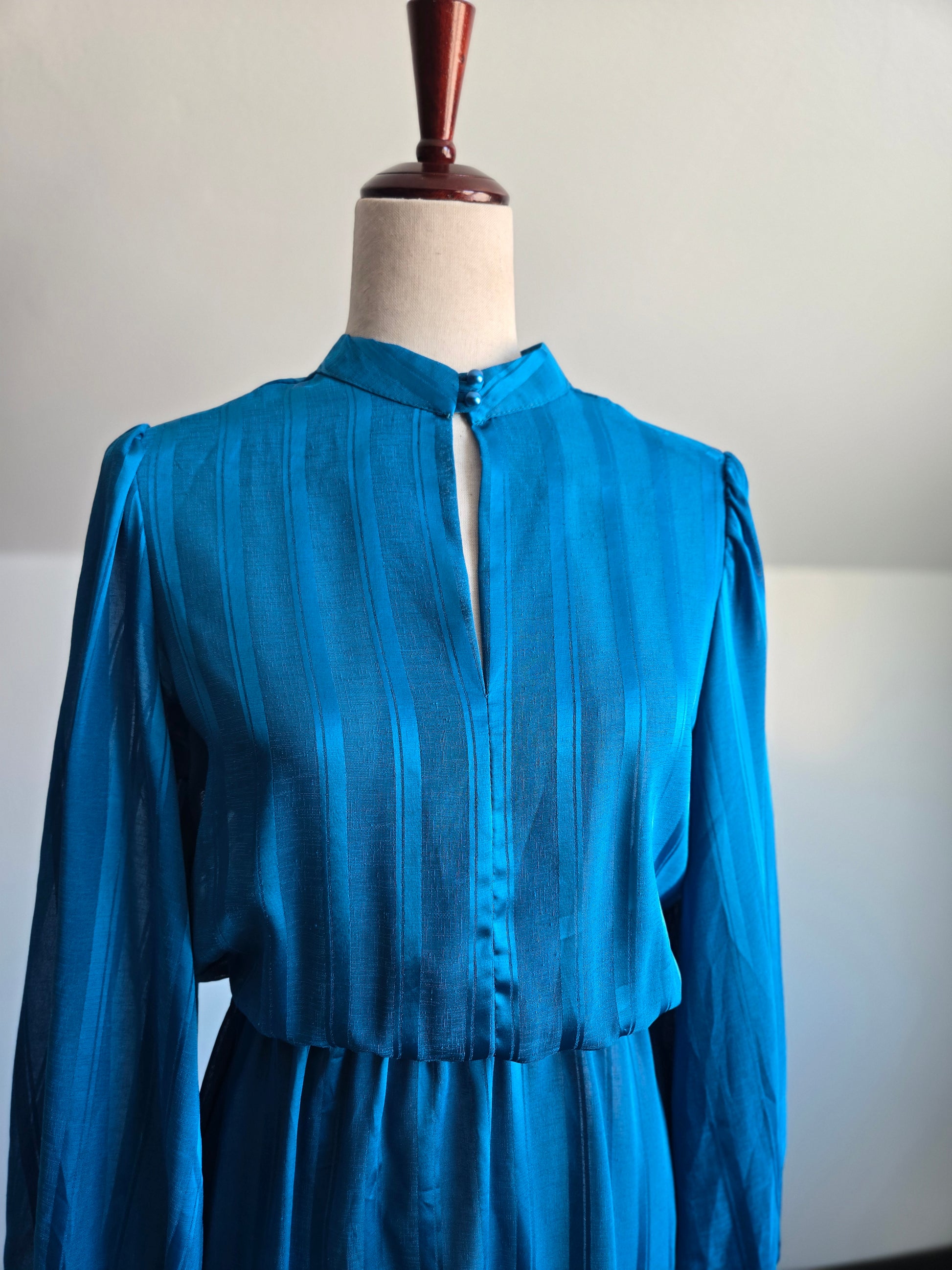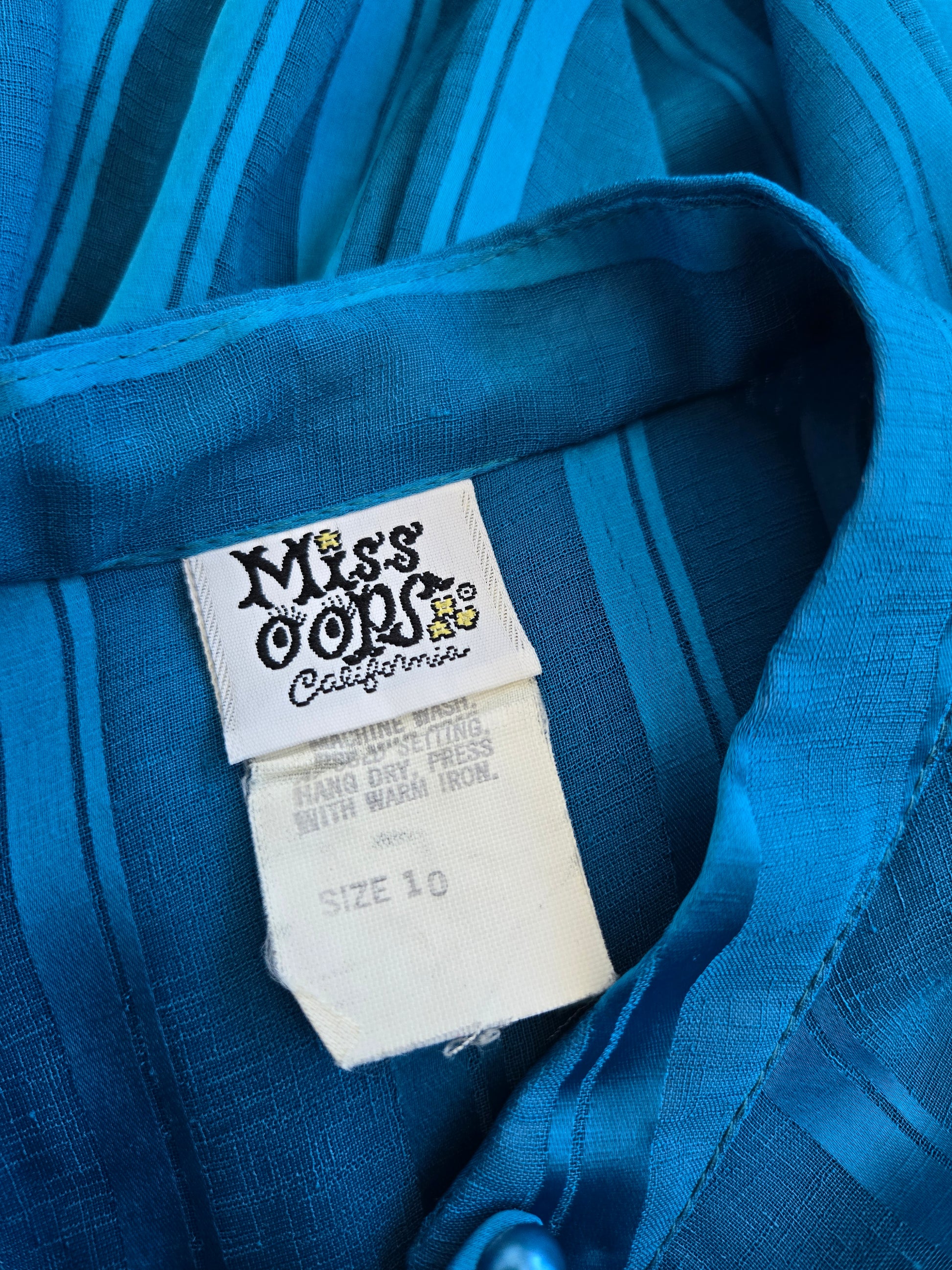 Vintage 80s Miss Oops California blue secretary style dress featuring a high neck with peep hole, elastic waist, and cuffed sleeves. The fabric has a woven texture to it, almost like a linen look. Elastic is healthy and the dress is overall slightly semi-shear. Perfect condition and has been washed and steamed.