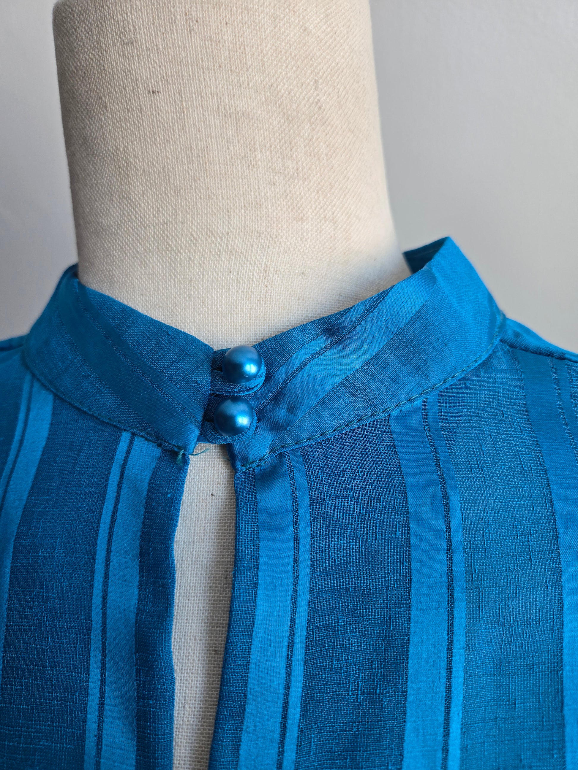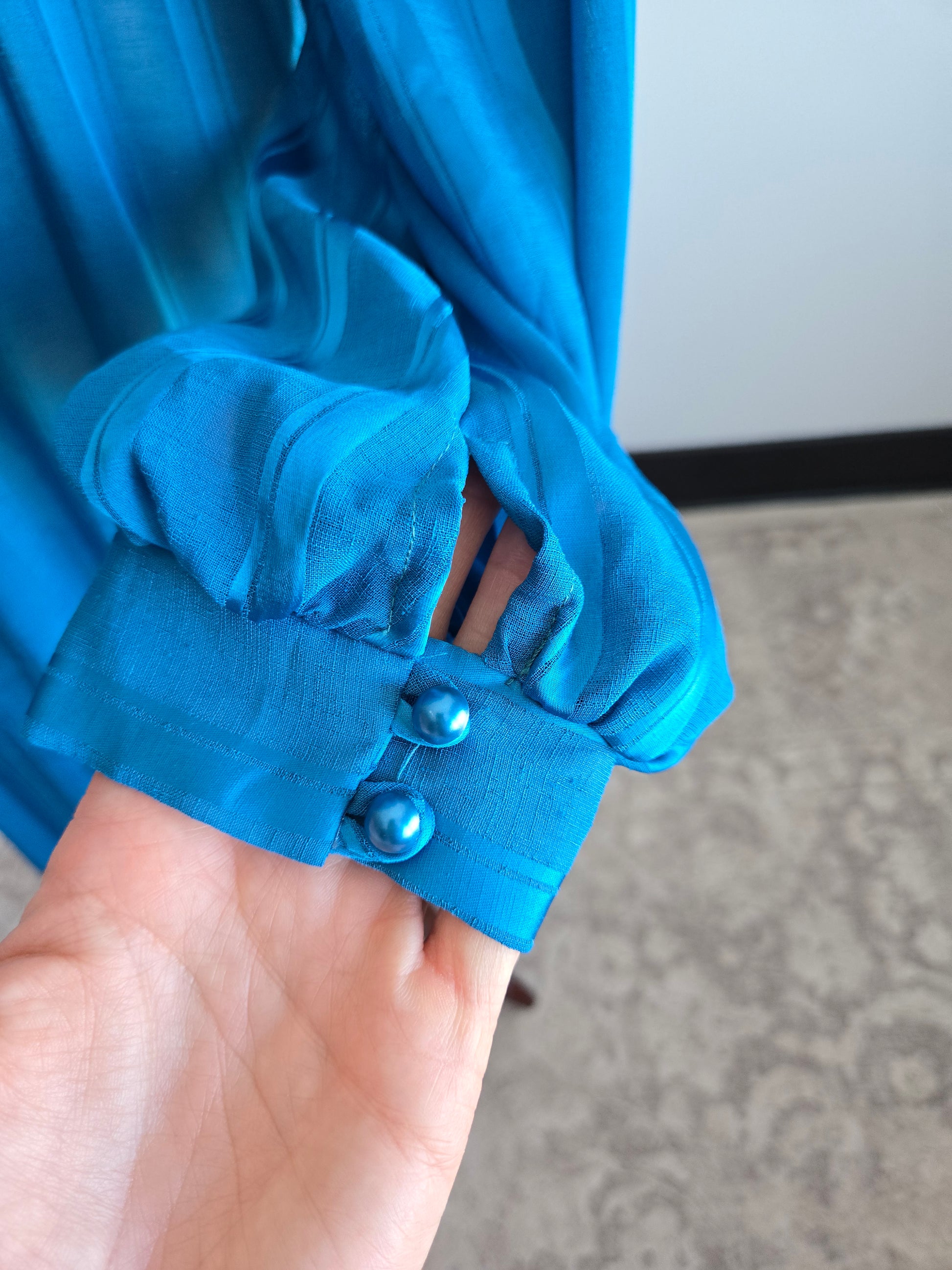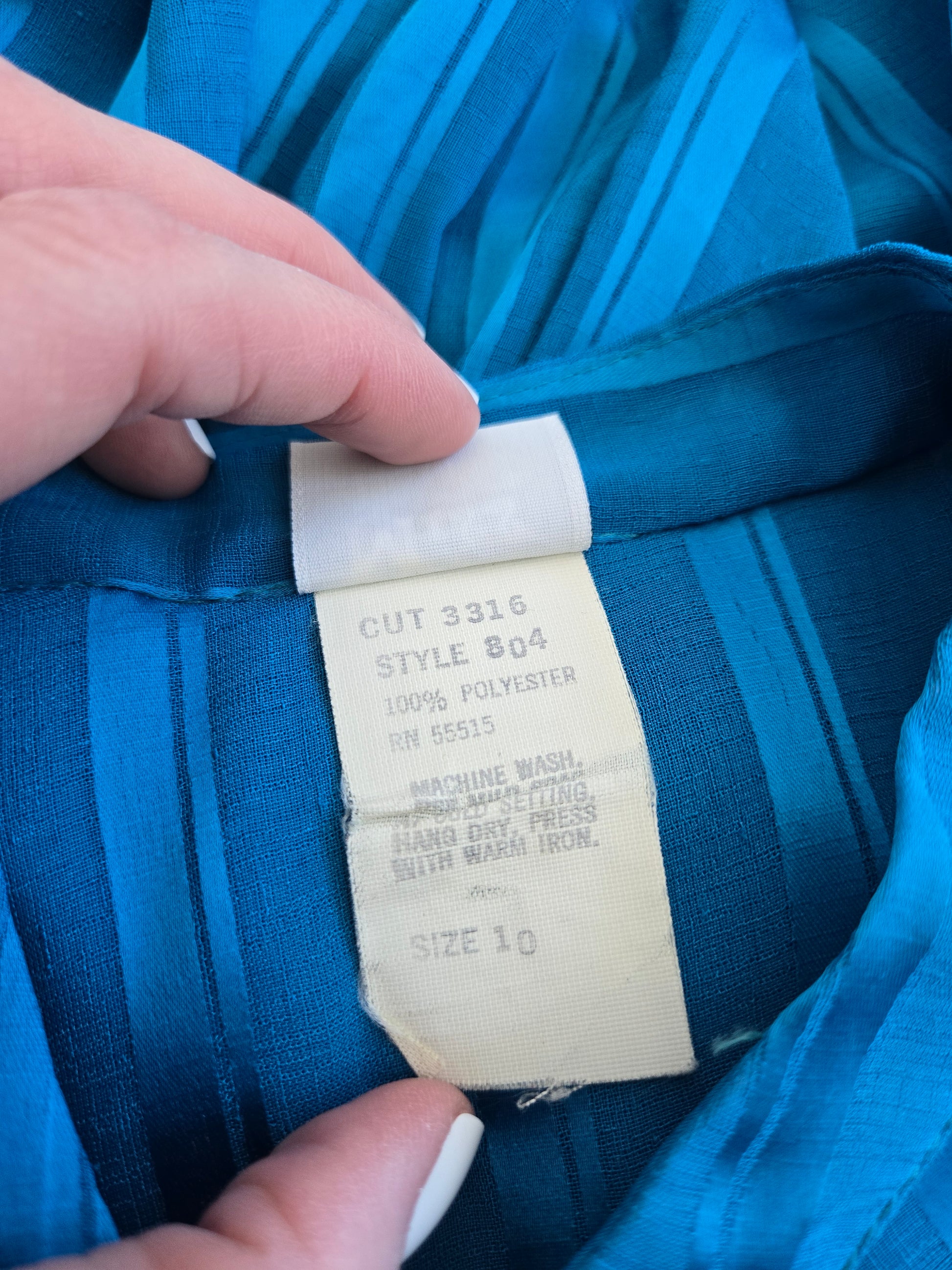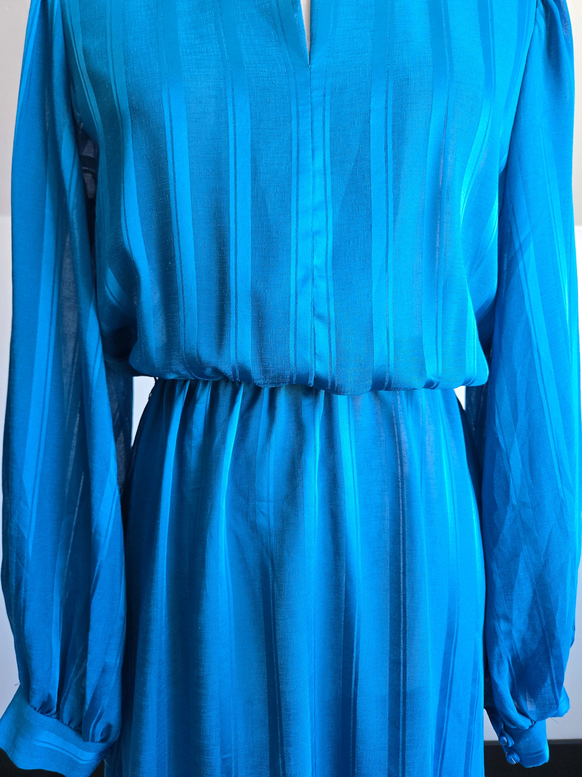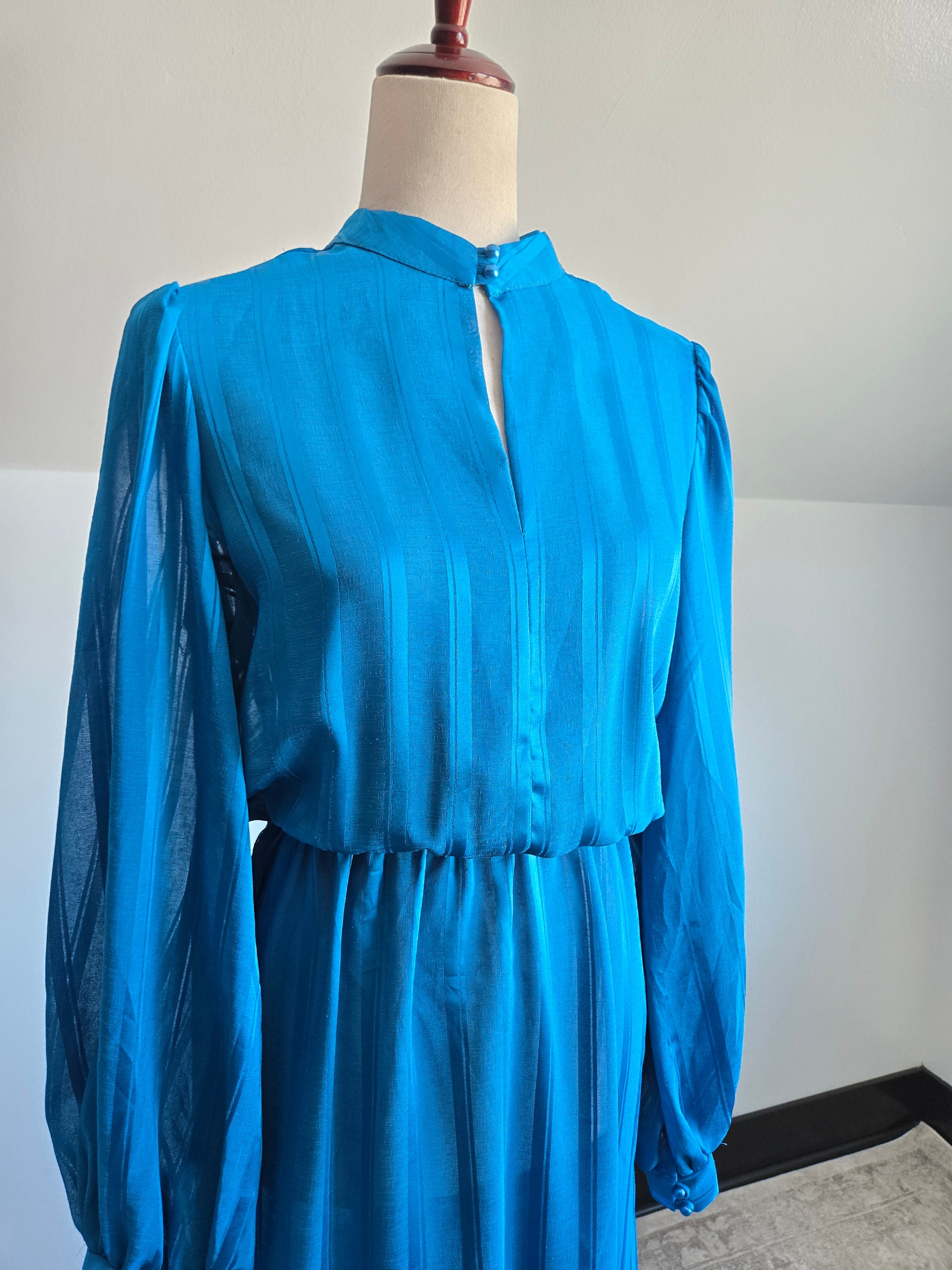 Vintage 80s Miss Oops California blue secretary style dress featuring a high neck with peep hole, elastic waist, and cuffed sleeves. The fabric has a woven texture to it, almost like a linen look. Elastic is healthy and the dress is overall slightly semi-shear. Perfect condition and has been washed and steamed.
