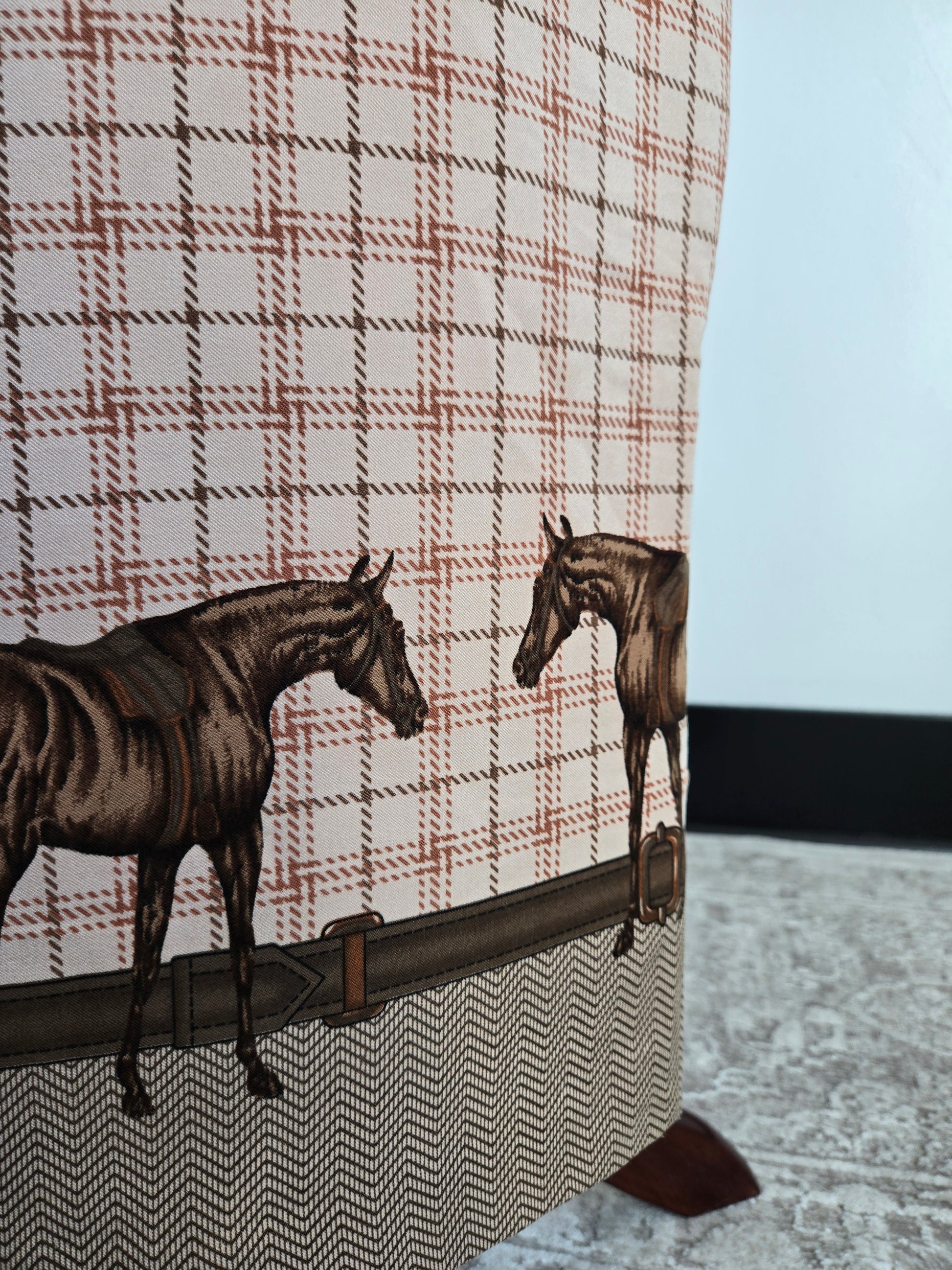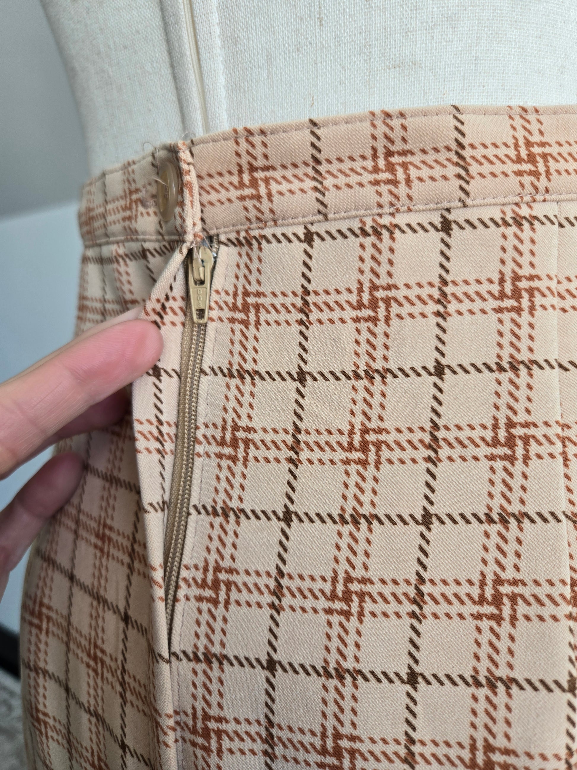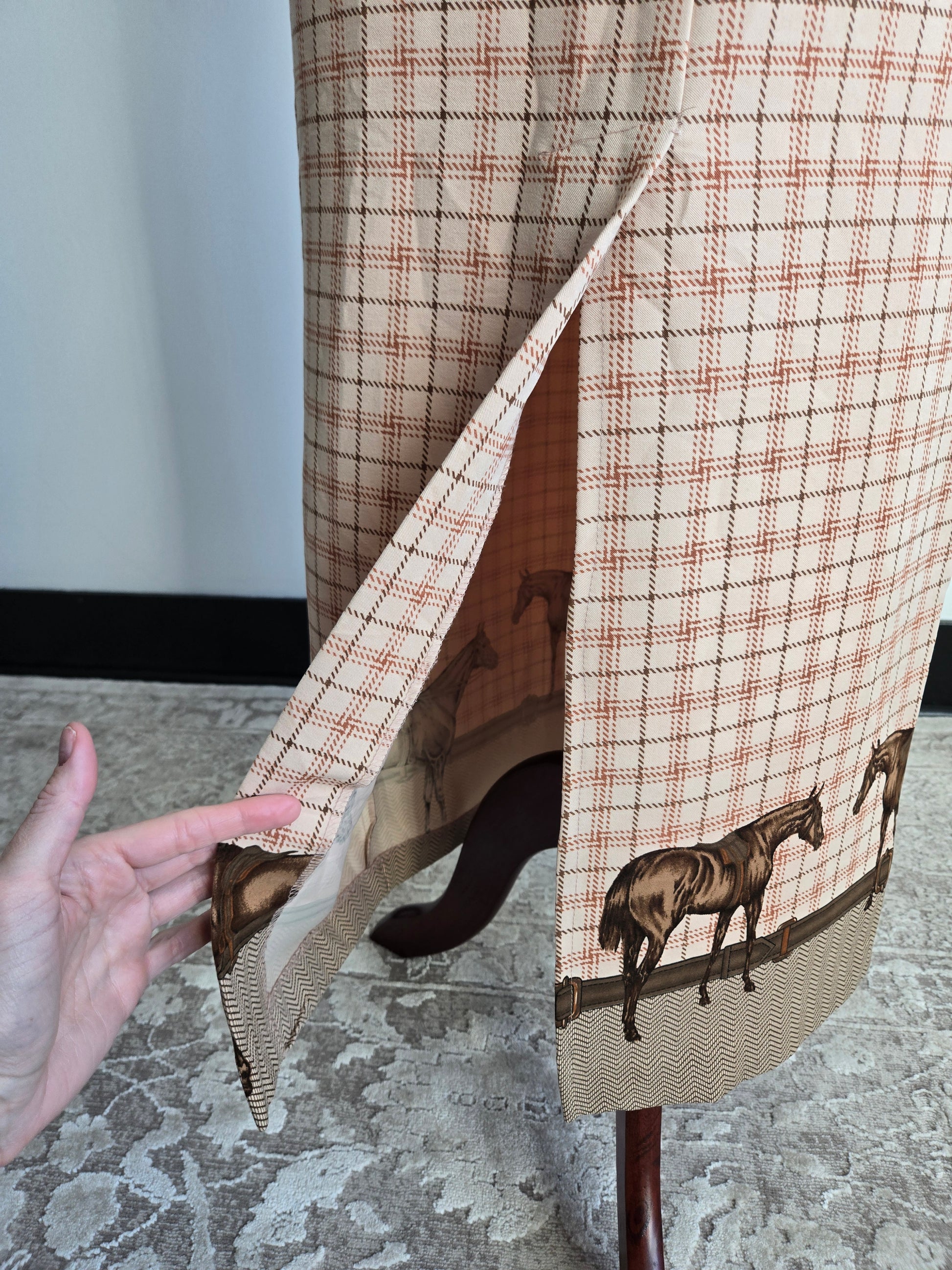 Vintage 90s Intriguing Threads plaid equestrian maxi pencil skirt. It has belts and horses around the bottom with a kick split in the back. No liner. It zips and buttons to get in. It is in amazing condition with no callouts.