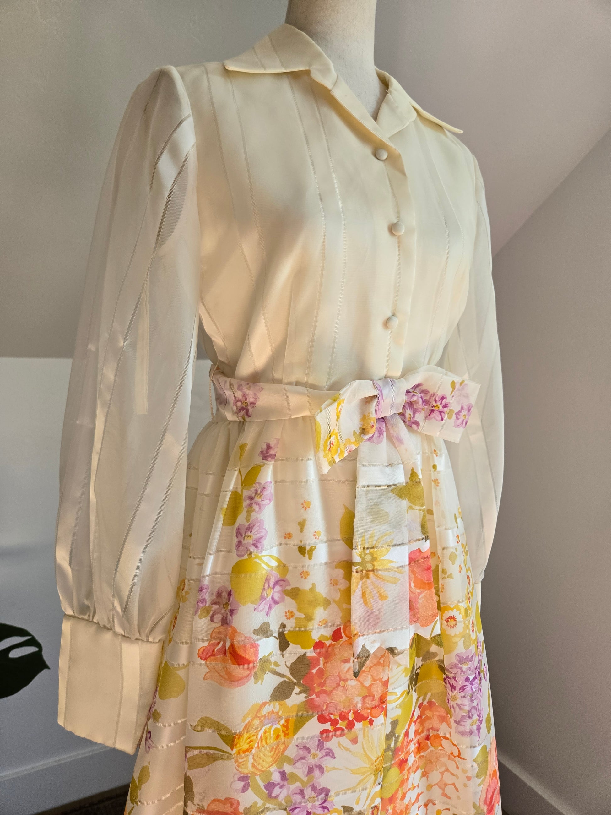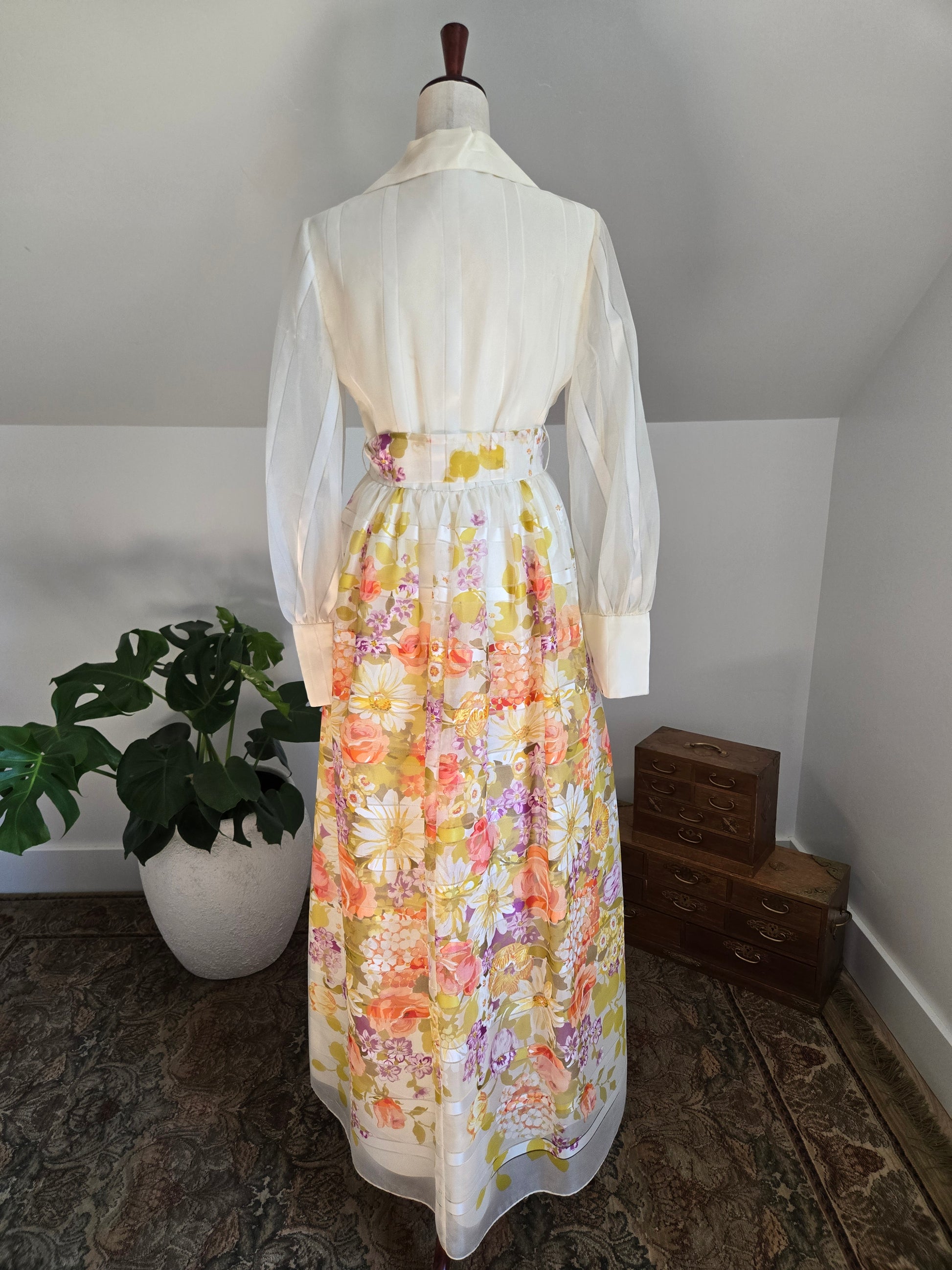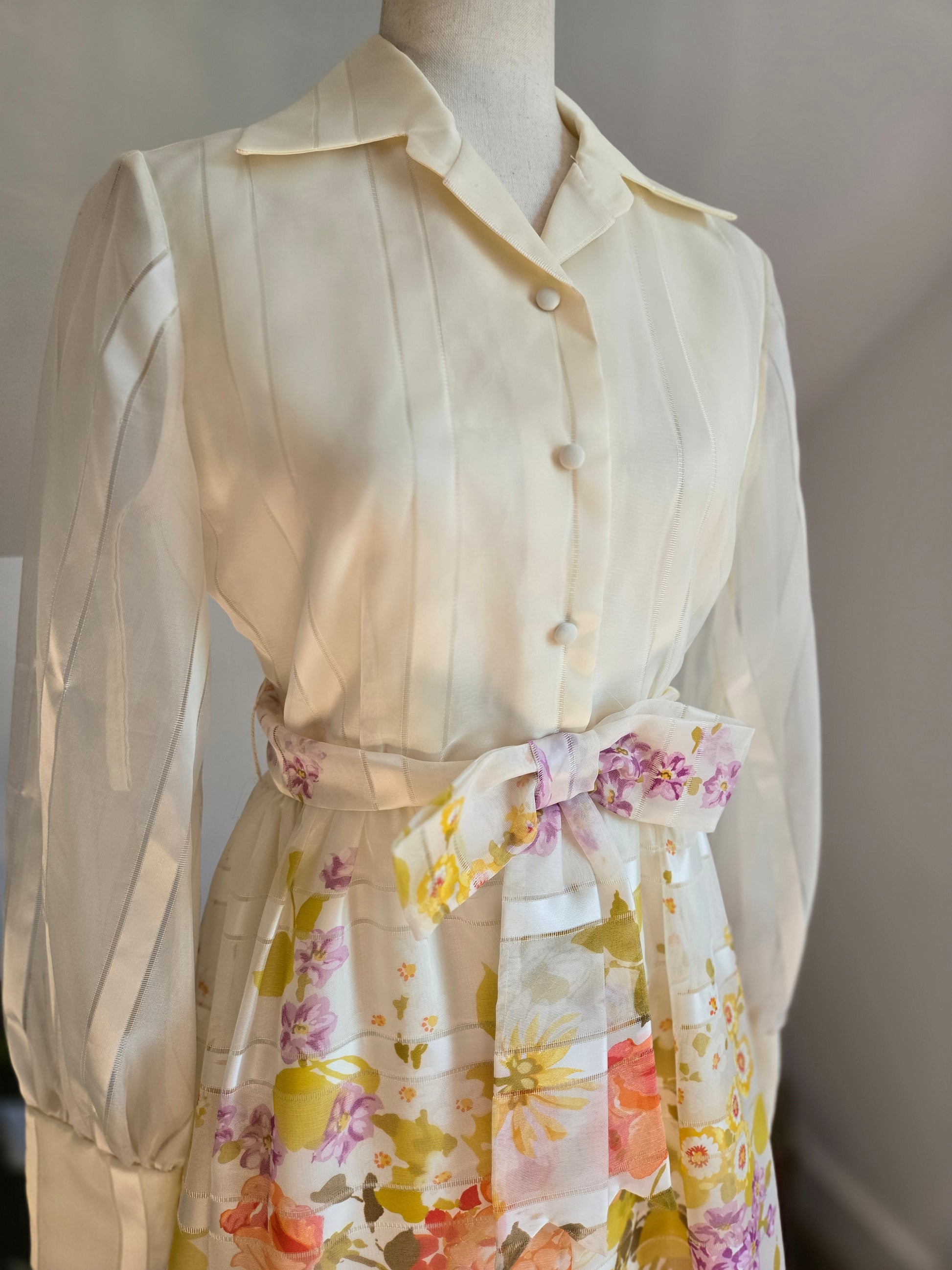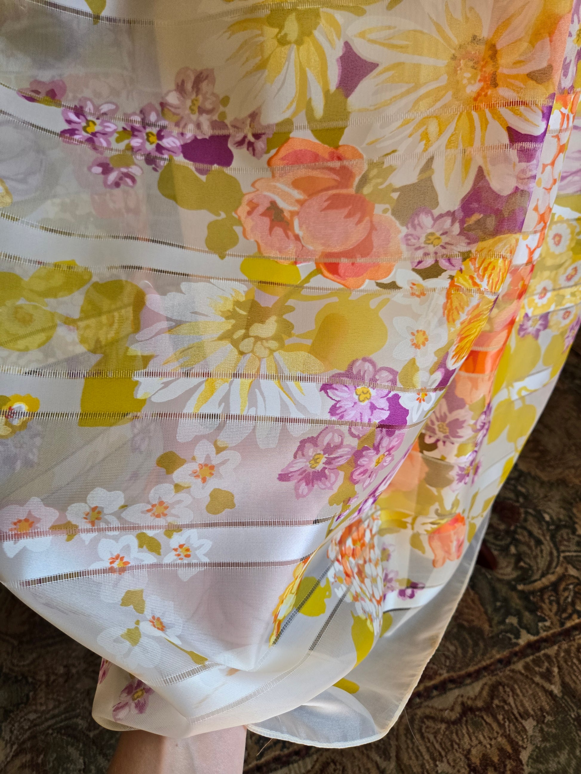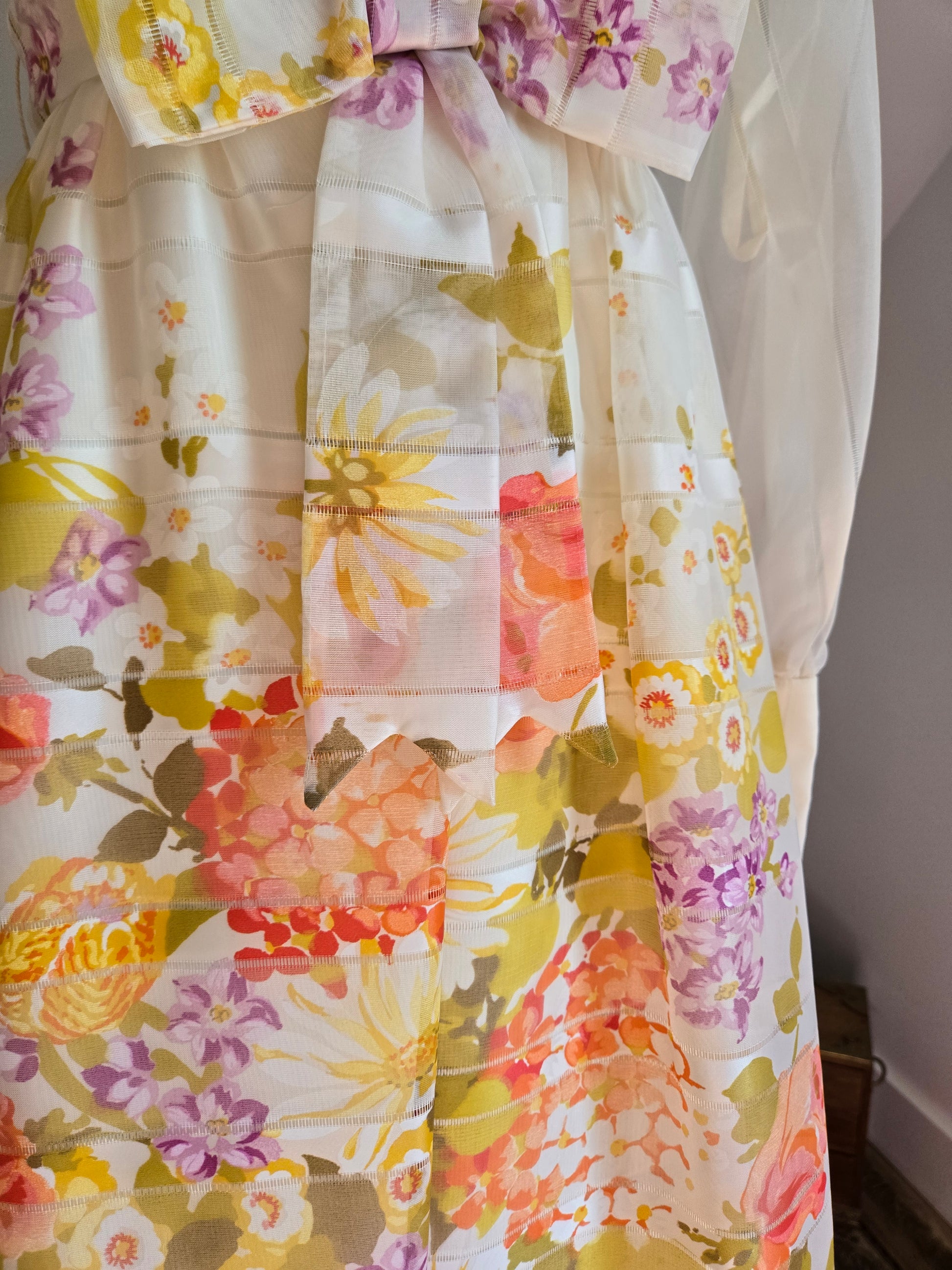 Lorrie Deb San Fransisco vintage 60s/70s Union Made hostess dress with the most insanely beautiful flower print on the skirts. The top is a collared faux button down body in a creamy off white color with jacquard stripes. The faux buttons means they are not functional and they actually snap on the other side of the placket, which I love because then the buttons wont get worn out or fall off. The body and skirt is fully lined and the sleeves are a single layer of shear fabric with a snap cuff. It has an attached belt that snaps at the waist. The back is even more beautiful than the front, and it is in amazing condition. There is one small snag at the back and one on the back bicep of the sleeve. The fabric being striped/textured, it is hard to see them, but they are pictured in the last two photos.