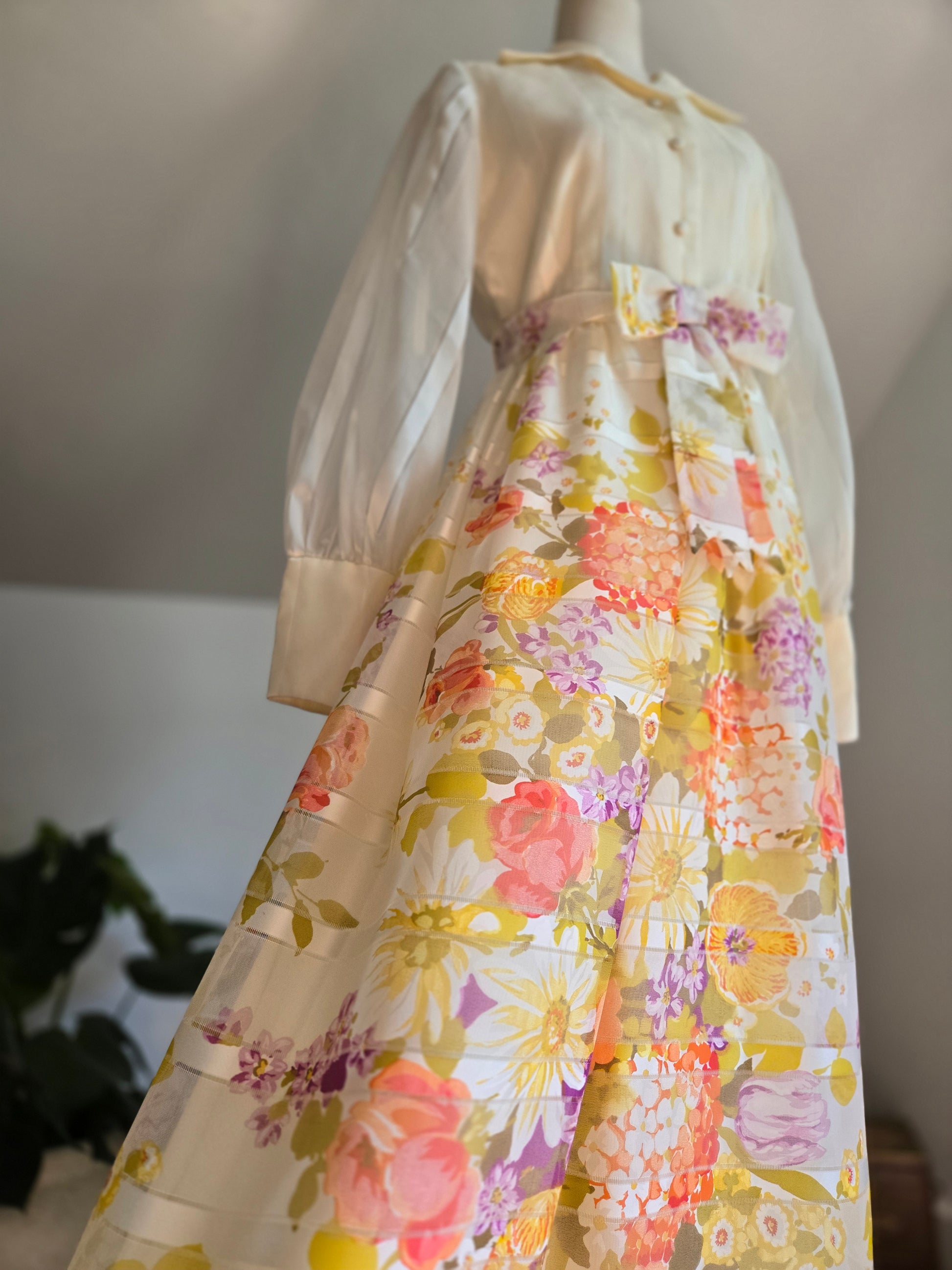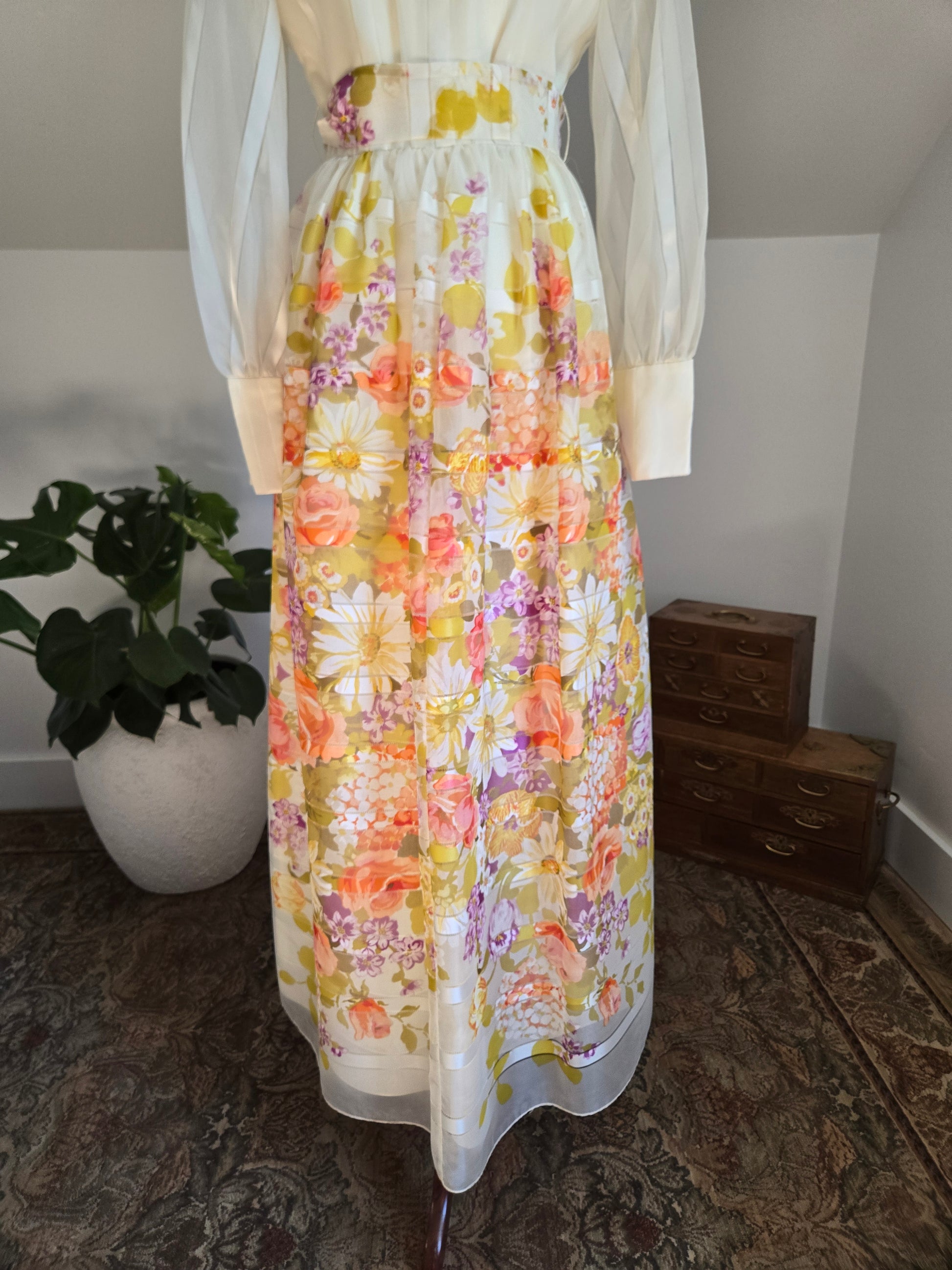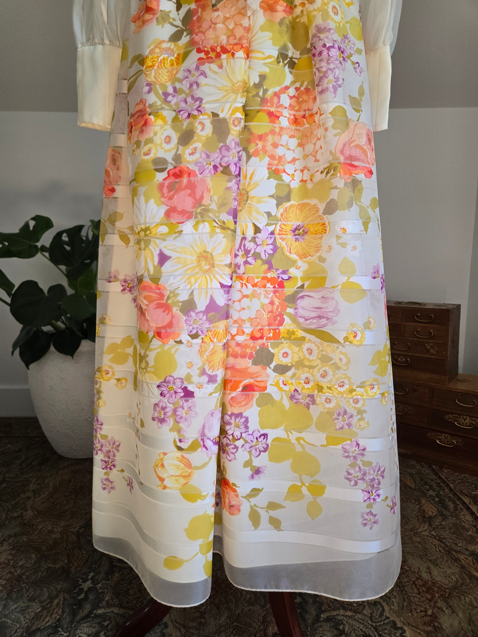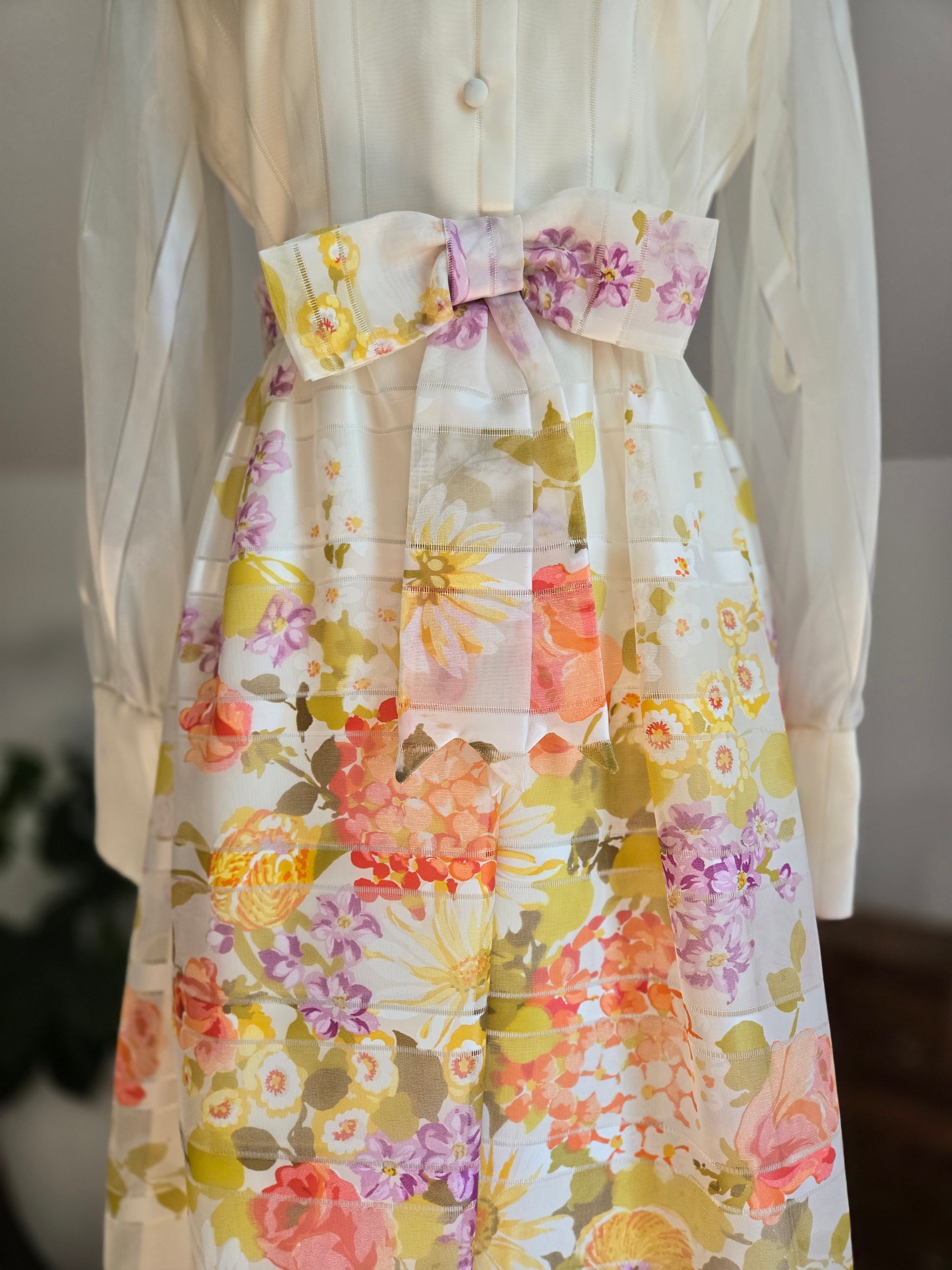 Lorrie Deb San Fransisco vintage 60s/70s Union Made hostess dress with the most insanely beautiful flower print on the skirts. The top is a collared faux button down body in a creamy off white color with jacquard stripes. The faux buttons means they are not functional and they actually snap on the other side of the placket, which I love because then the buttons wont get worn out or fall off. The body and skirt is fully lined and the sleeves are a single layer of shear fabric with a snap cuff. It has an attached belt that snaps at the waist. The back is even more beautiful than the front, and it is in amazing condition. There is one small snag at the back and one on the back bicep of the sleeve. The fabric being striped/textured, it is hard to see them, but they are pictured in the last two photos.