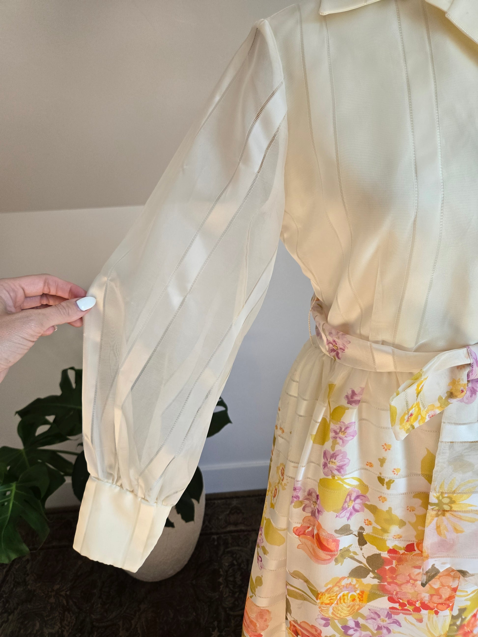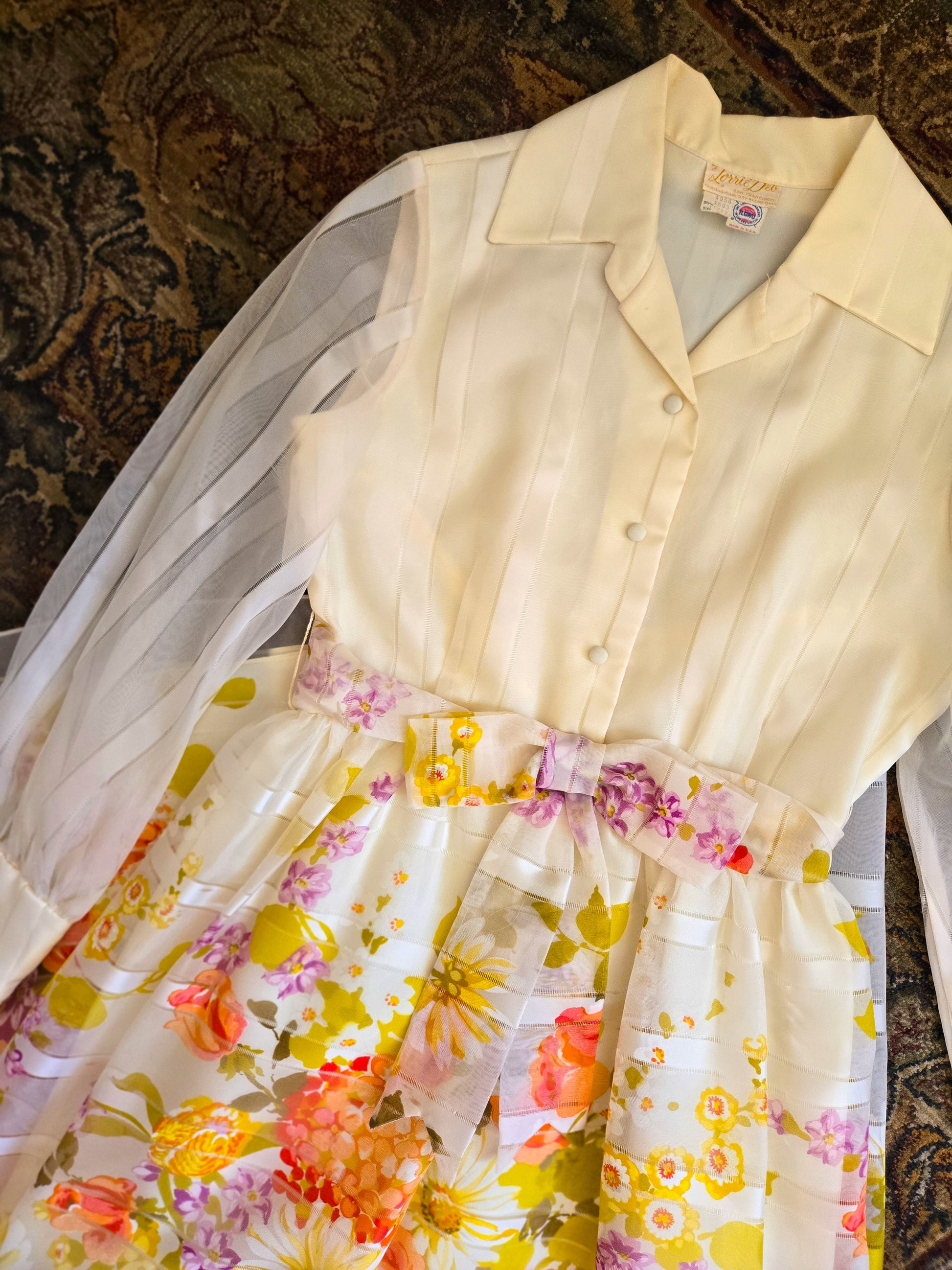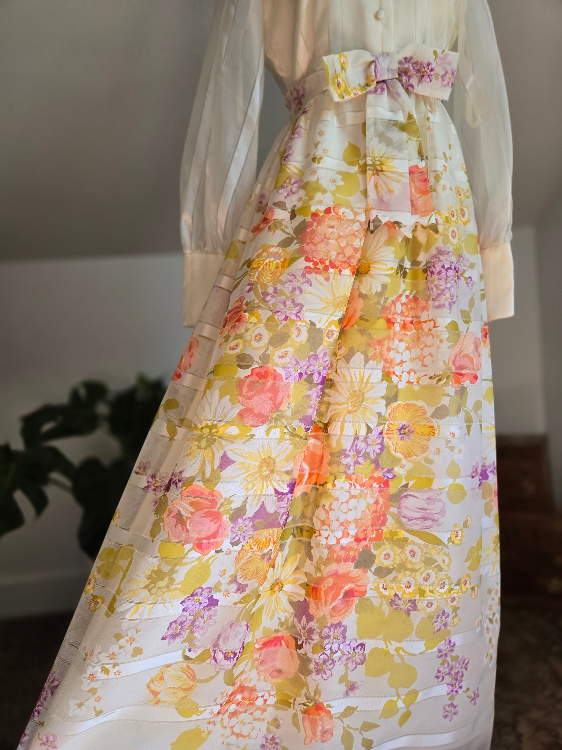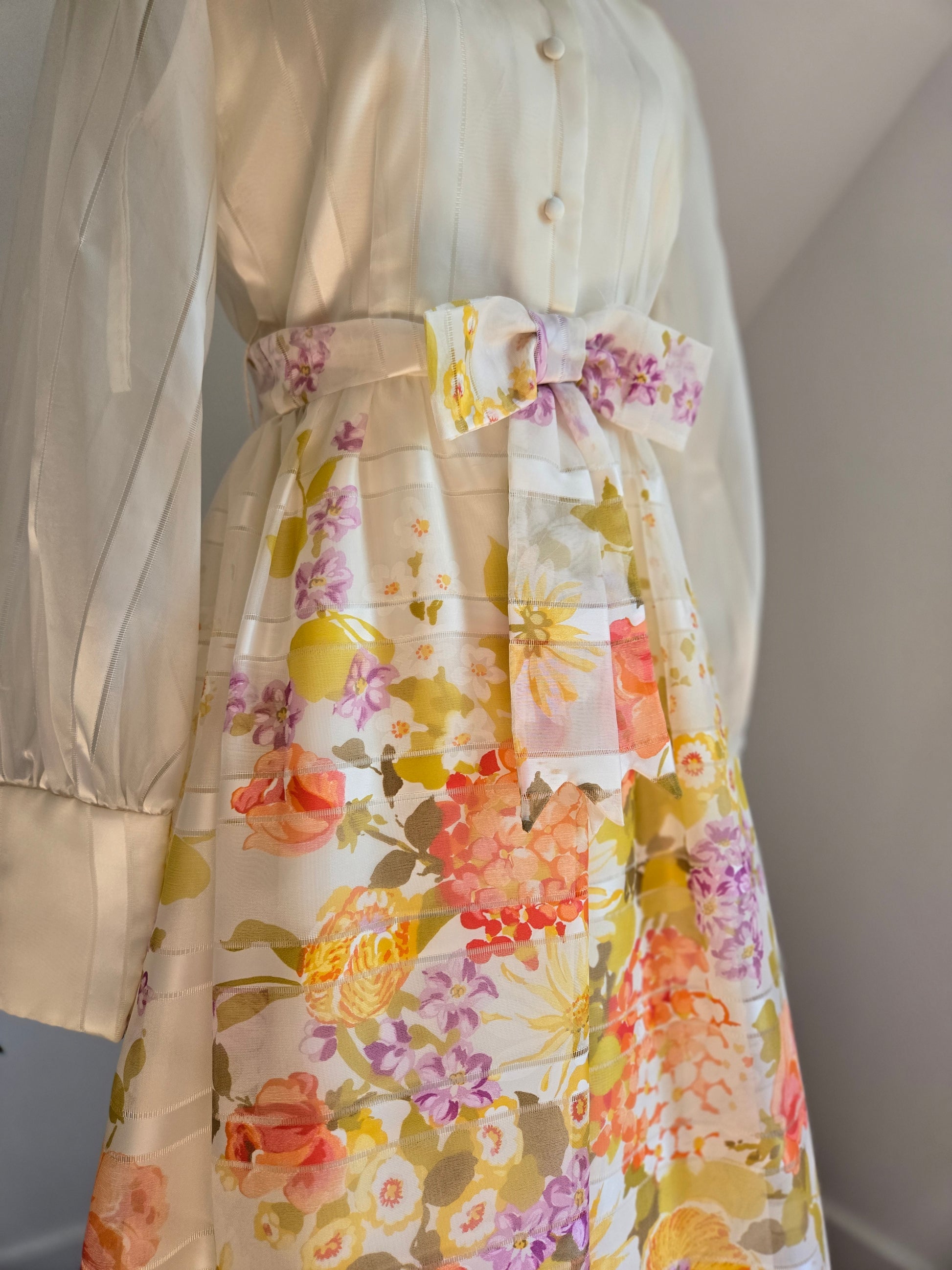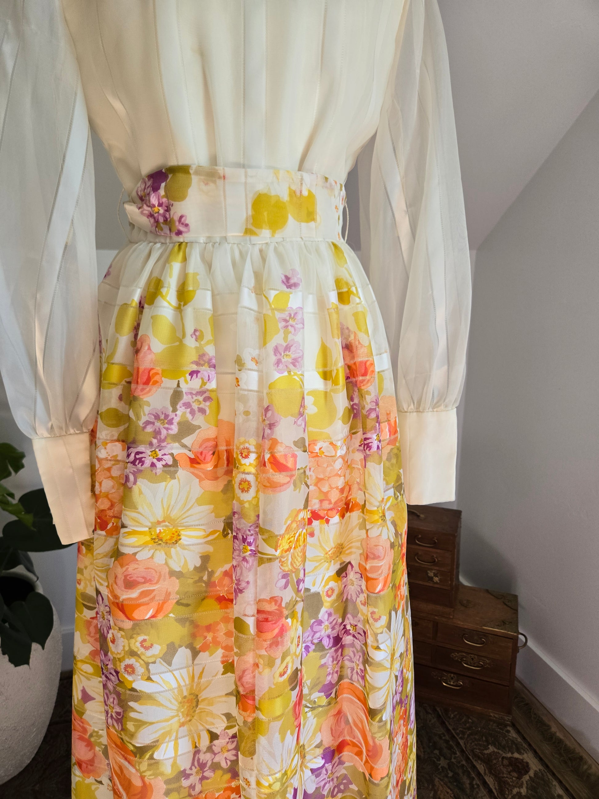 Lorrie Deb San Fransisco vintage 60s/70s Union Made hostess dress with the most insanely beautiful flower print on the skirts. The top is a collared faux button down body in a creamy off white color with jacquard stripes. The faux buttons means they are not functional and they actually snap on the other side of the placket, which I love because then the buttons wont get worn out or fall off. The body and skirt is fully lined and the sleeves are a single layer of shear fabric with a snap cuff. It has an attached belt that snaps at the waist. The back is even more beautiful than the front, and it is in amazing condition. There is one small snag at the back and one on the back bicep of the sleeve. The fabric being striped/textured, it is hard to see them, but they are pictured in the last two photos.