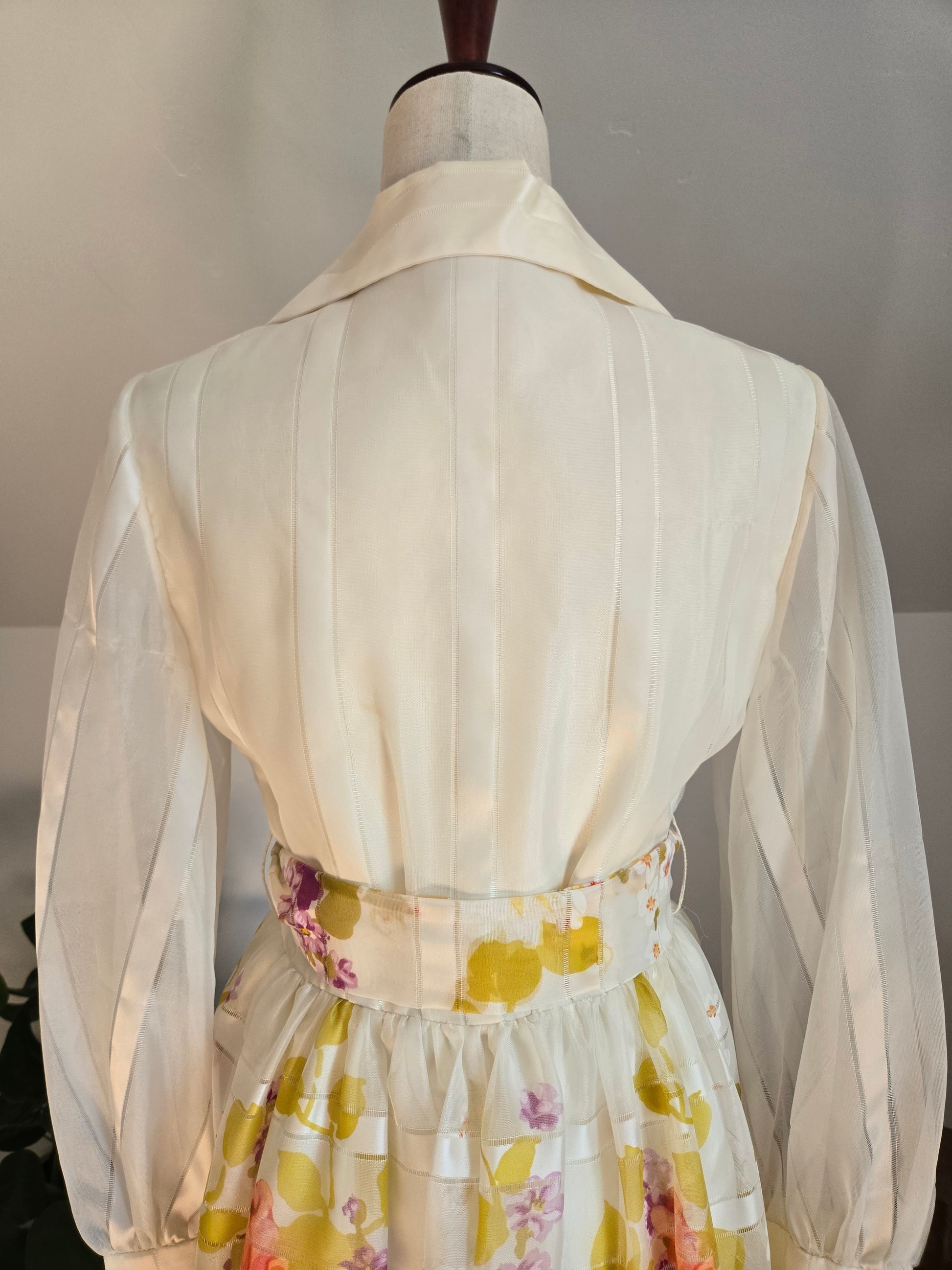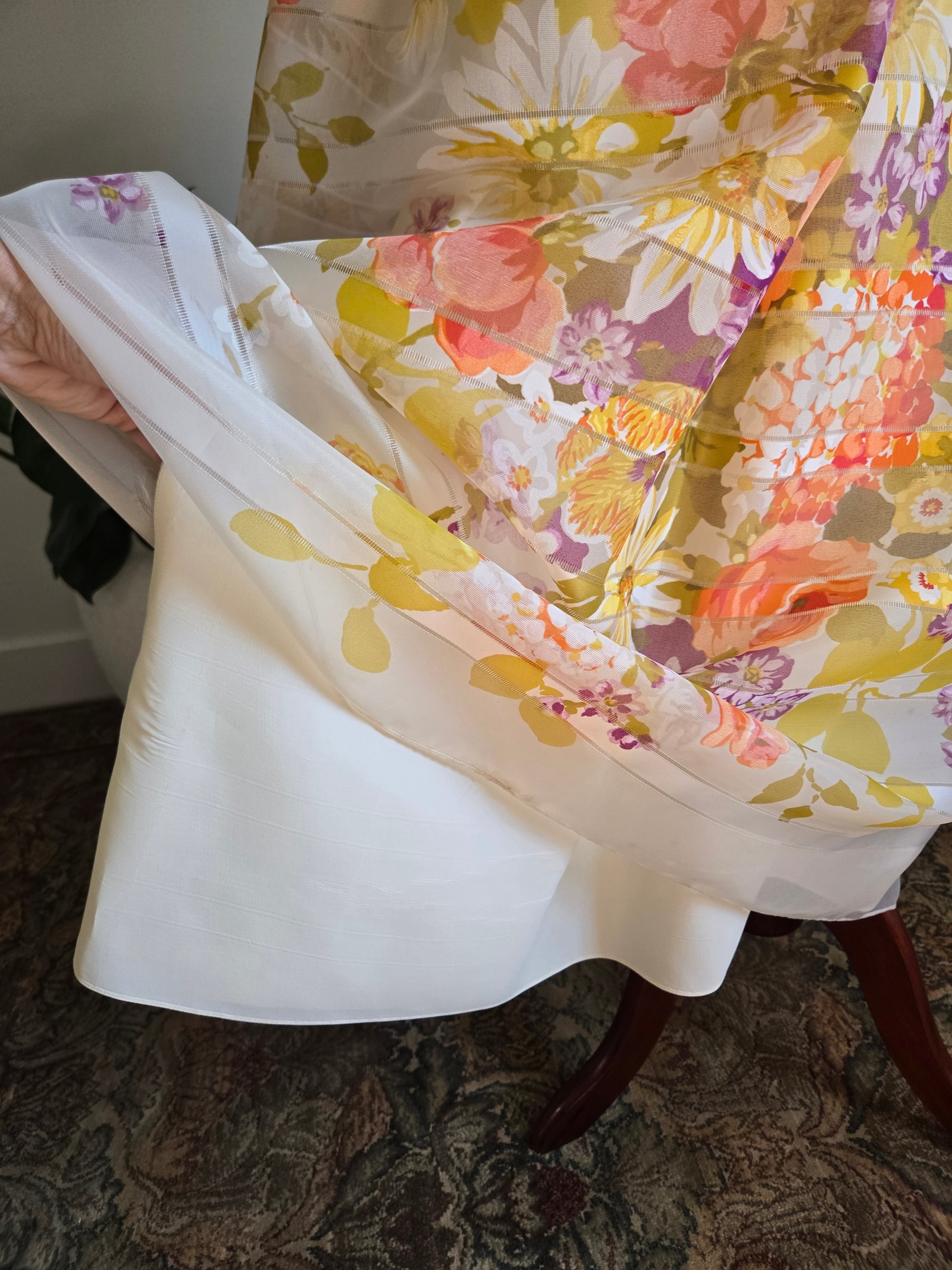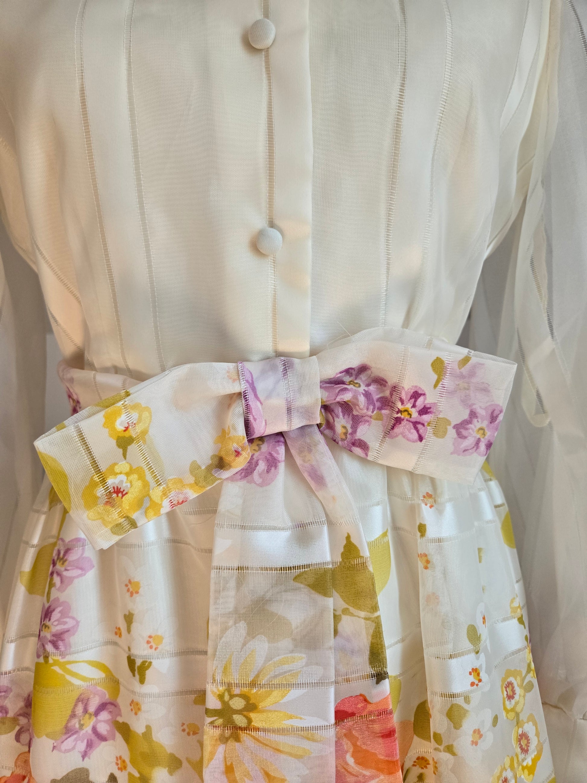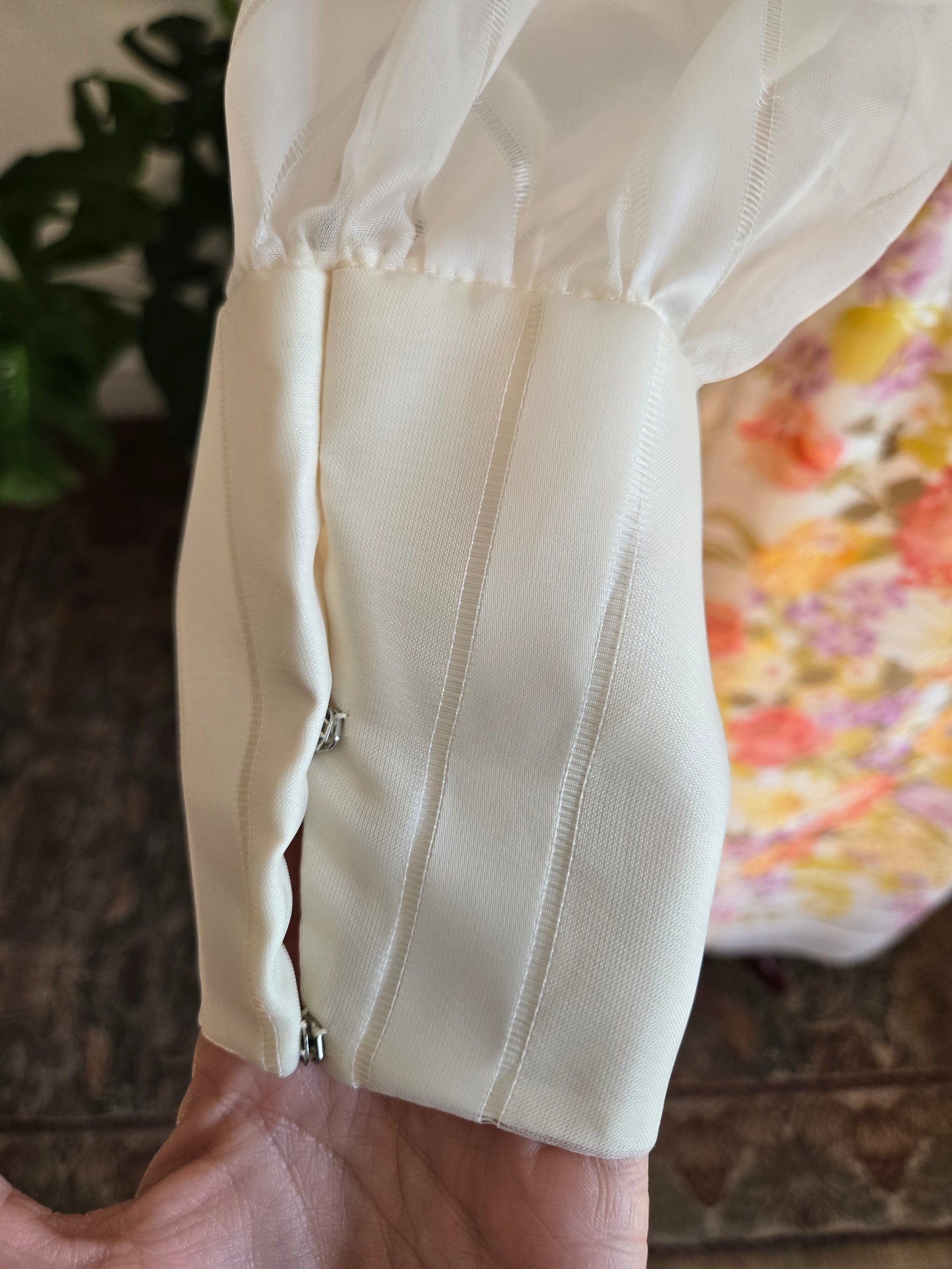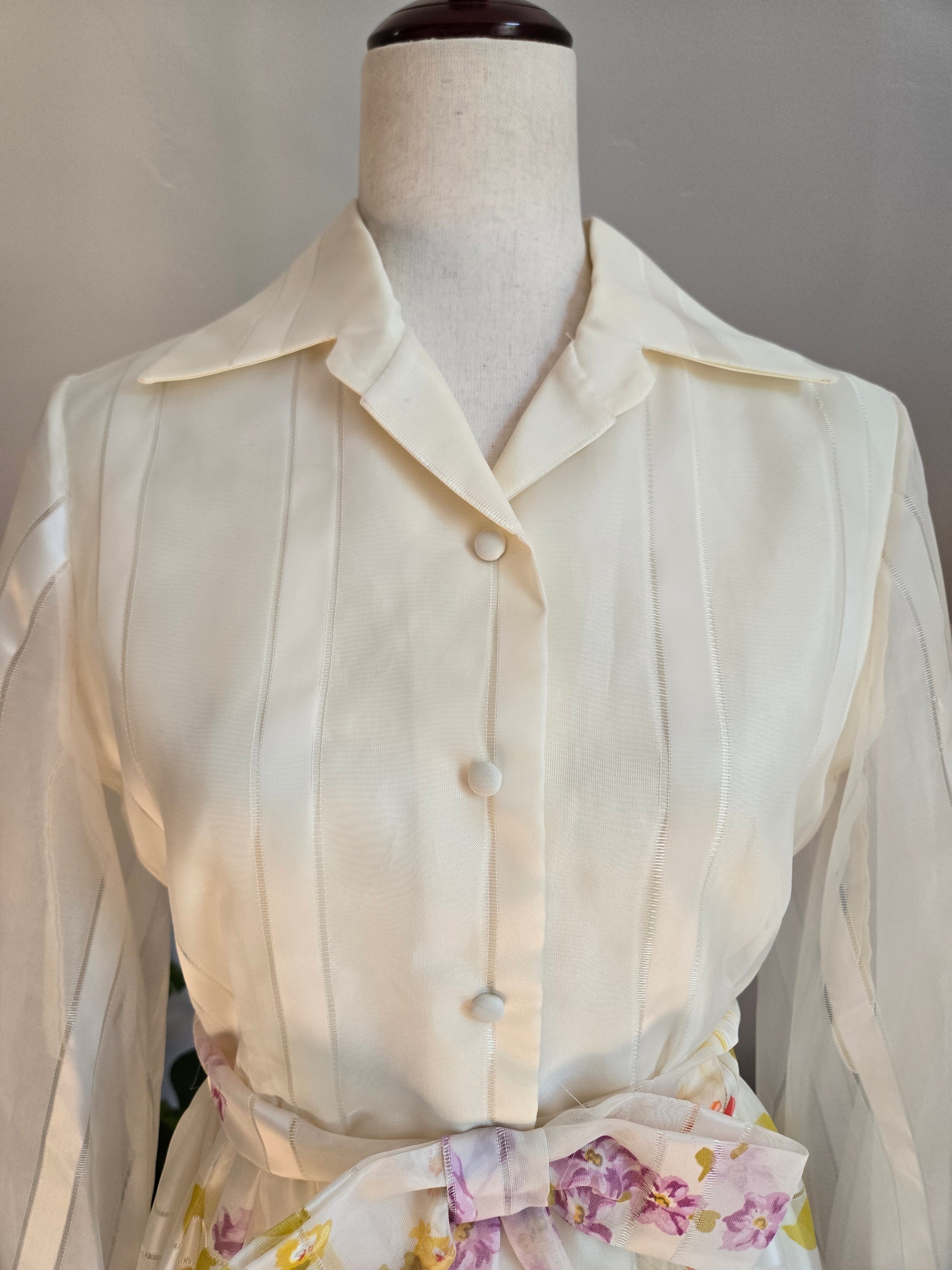 Lorrie Deb San Fransisco vintage 60s/70s Union Made hostess dress with the most insanely beautiful flower print on the skirts. The top is a collared faux button down body in a creamy off white color with jacquard stripes. The faux buttons means they are not functional and they actually snap on the other side of the placket, which I love because then the buttons wont get worn out or fall off. The body and skirt is fully lined and the sleeves are a single layer of shear fabric with a snap cuff. It has an attached belt that snaps at the waist. The back is even more beautiful than the front, and it is in amazing condition. There is one small snag at the back and one on the back bicep of the sleeve. The fabric being striped/textured, it is hard to see them, but they are pictured in the last two photos.