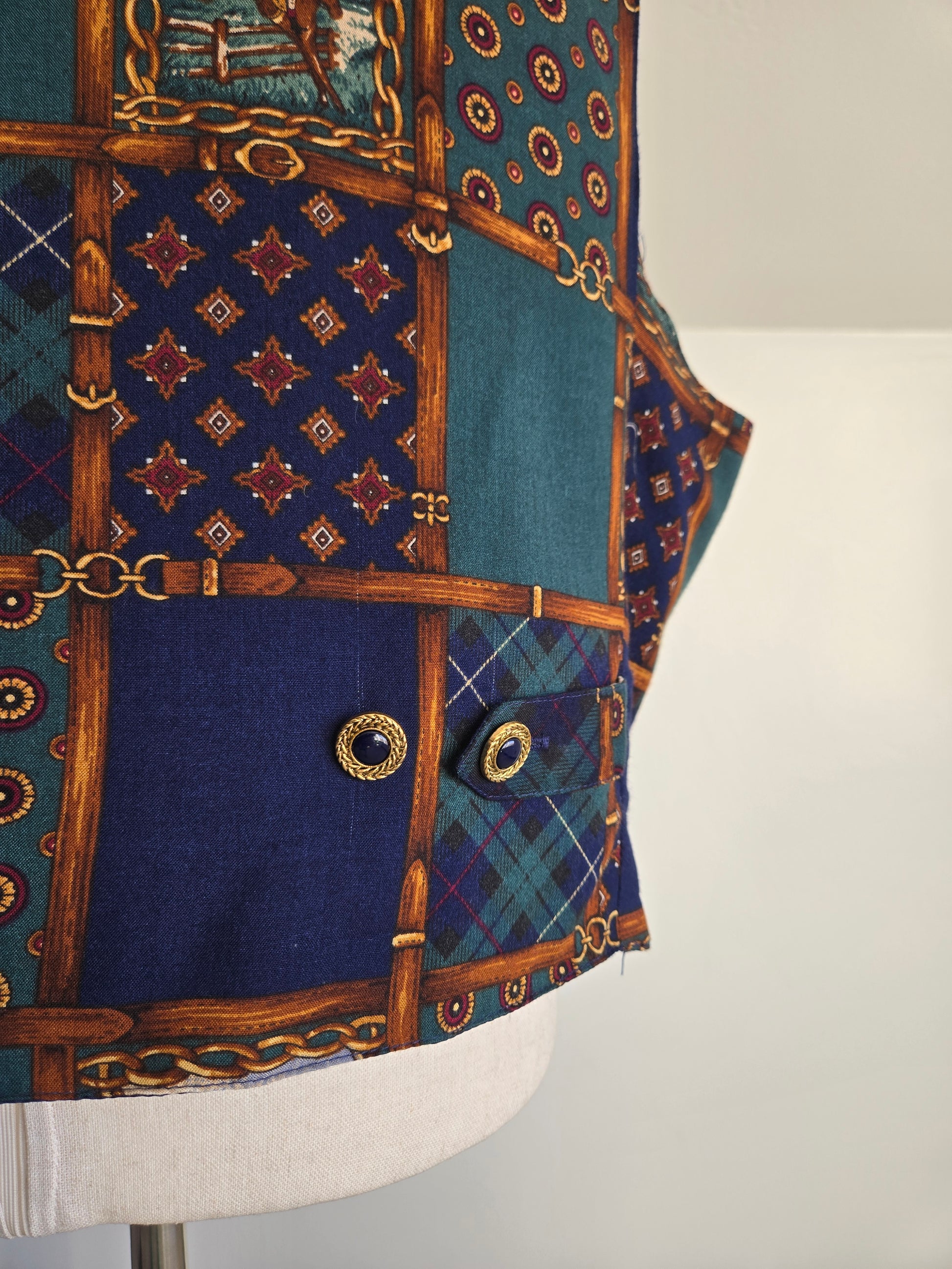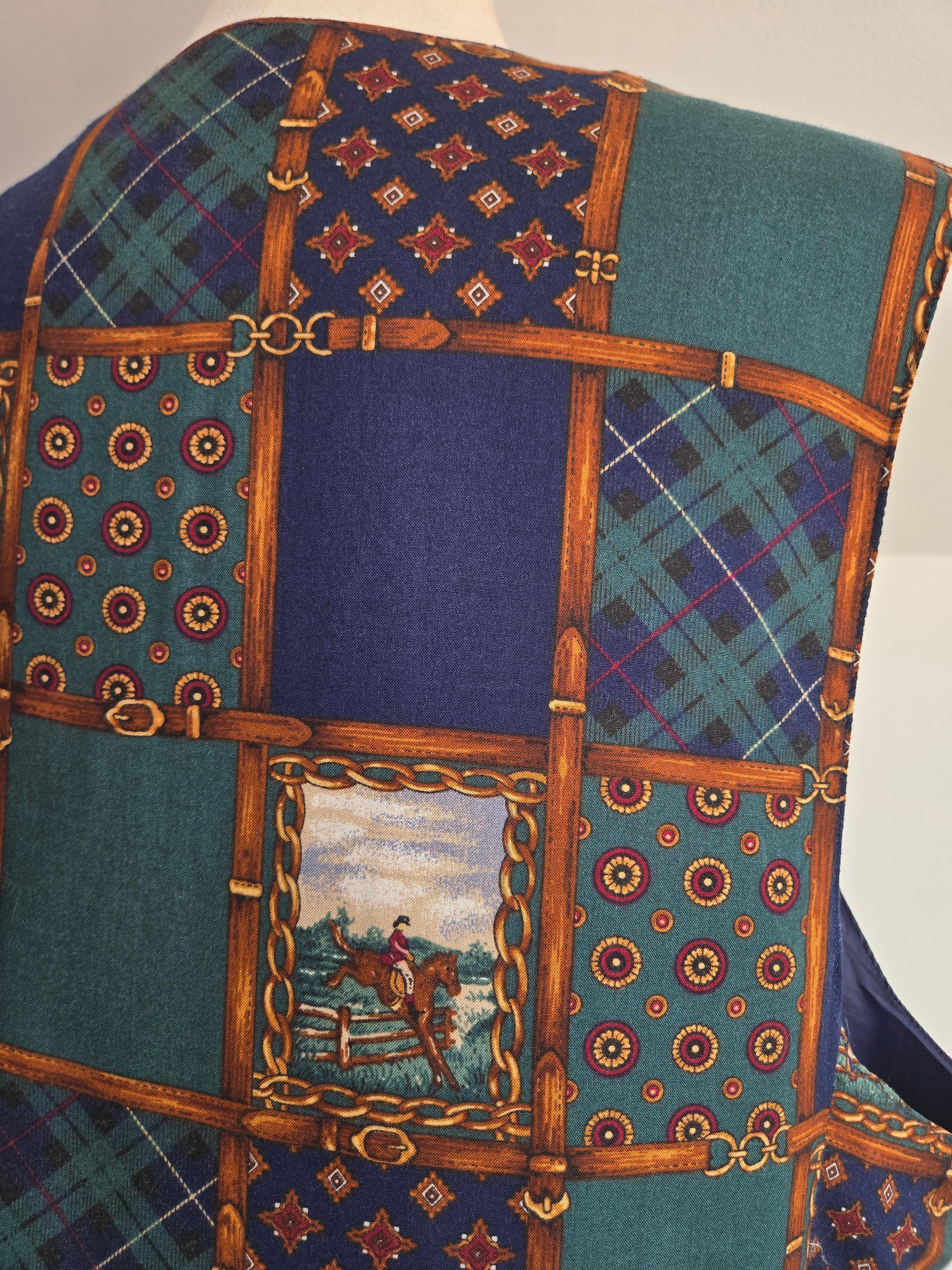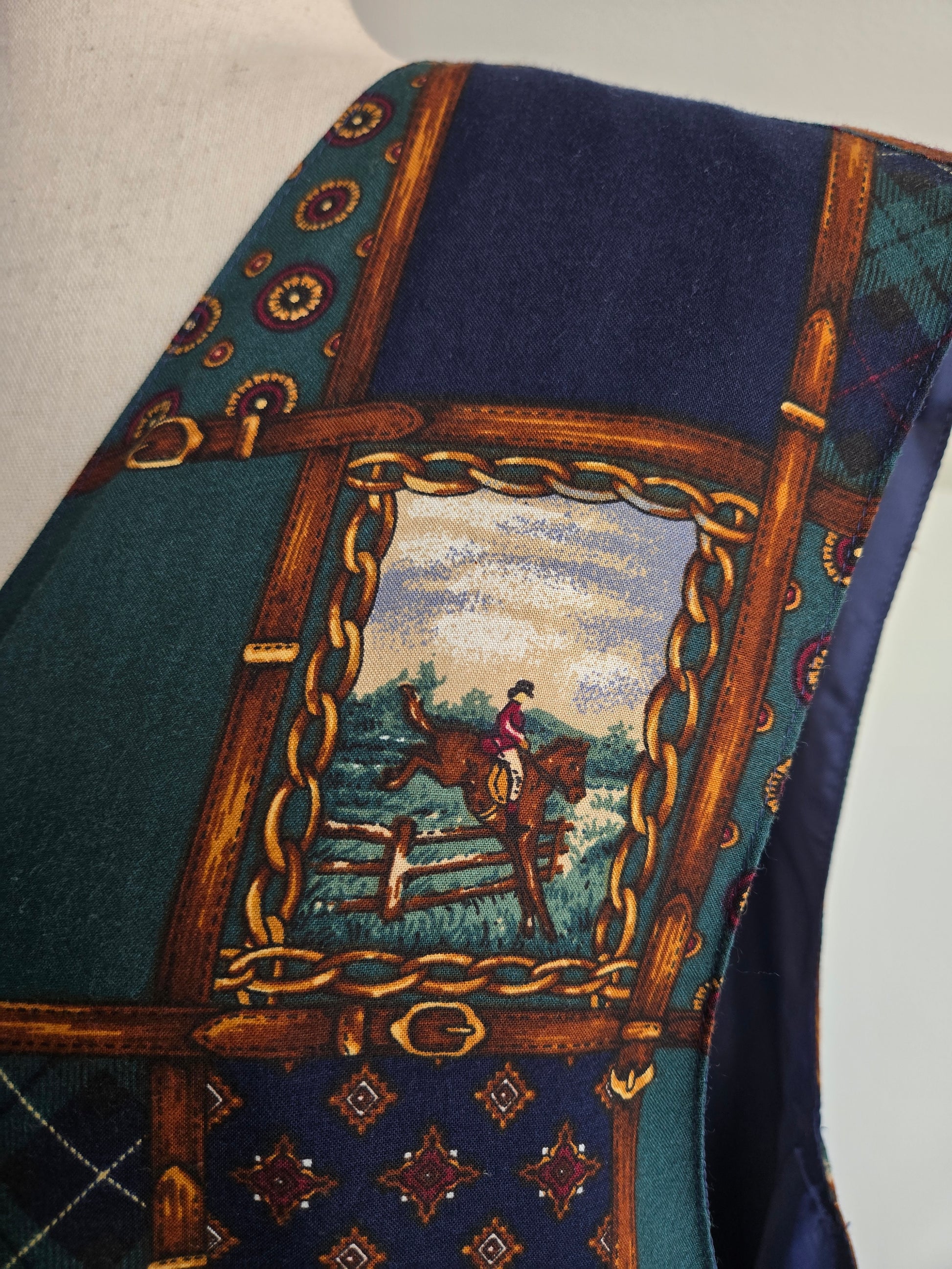 Vintage Jantzen equestrian print vest. It has a green and navy plaid outlined with leather belts and then a horse and rider in the countryside scene in some of the squares. How freaking adorable! It is fully lined on the inside and the printed fabric goes all the way around. There is buttons on the back so if you want to make the waist smaller, you can adjust it. It is in great condition!