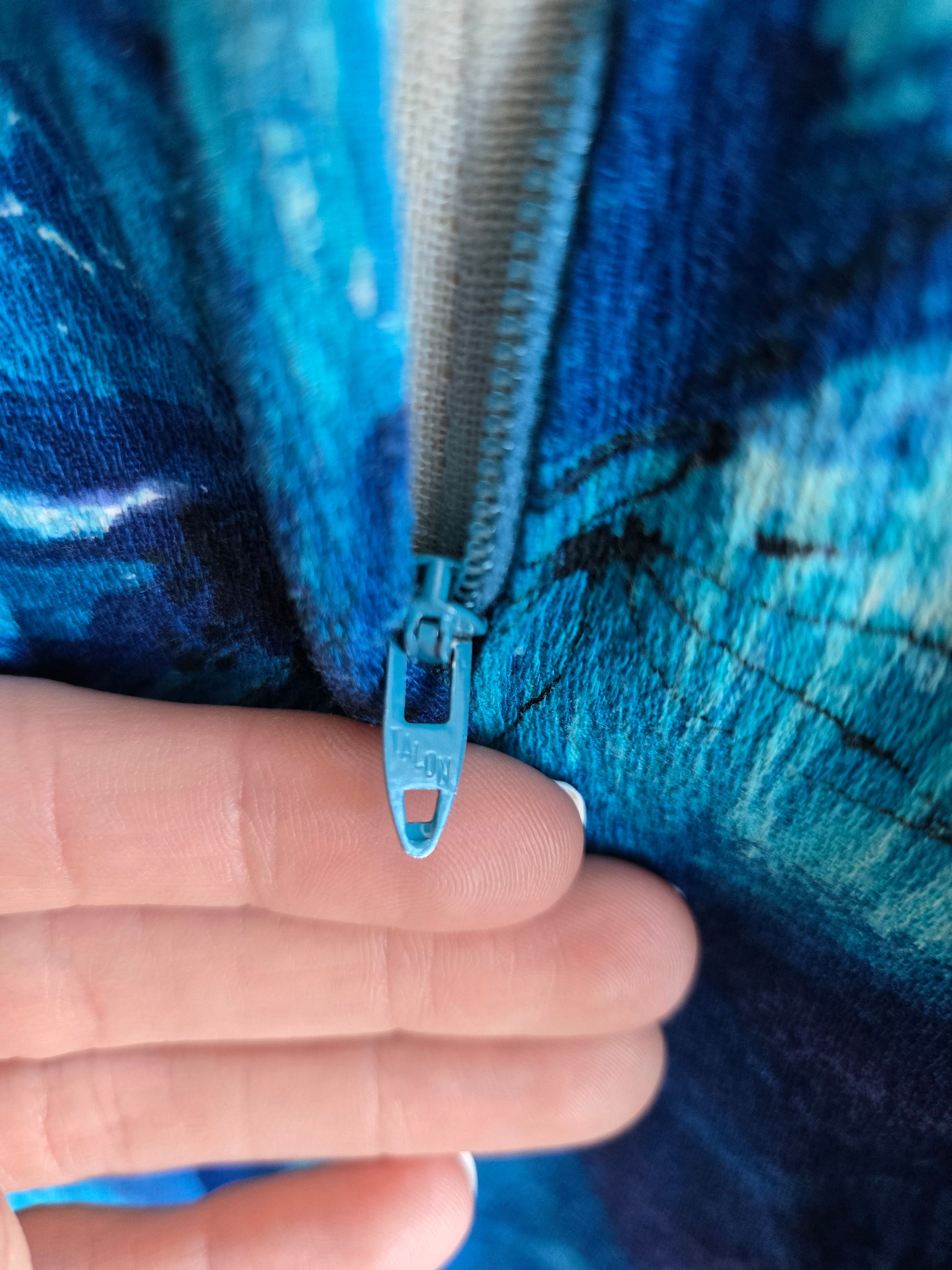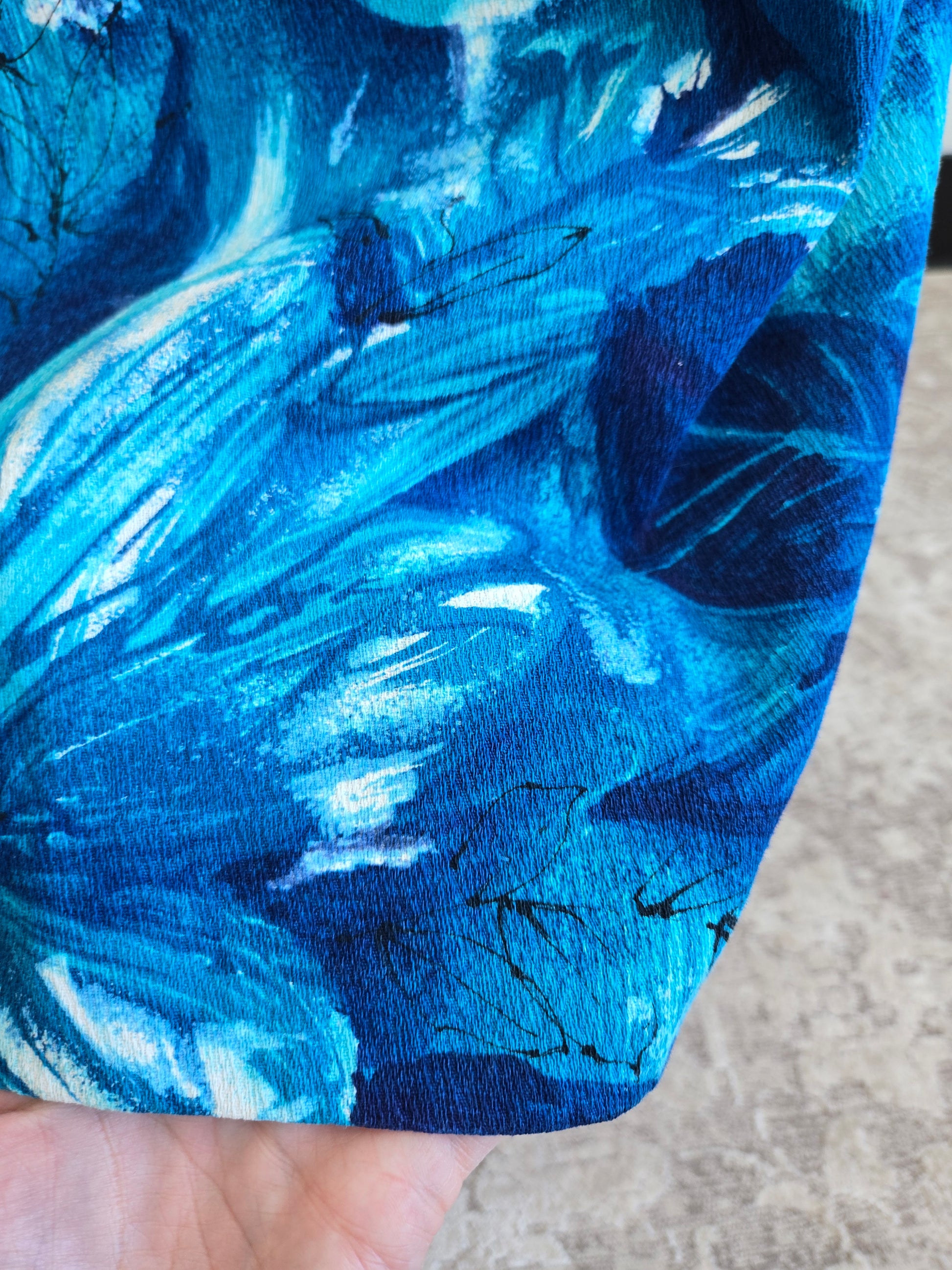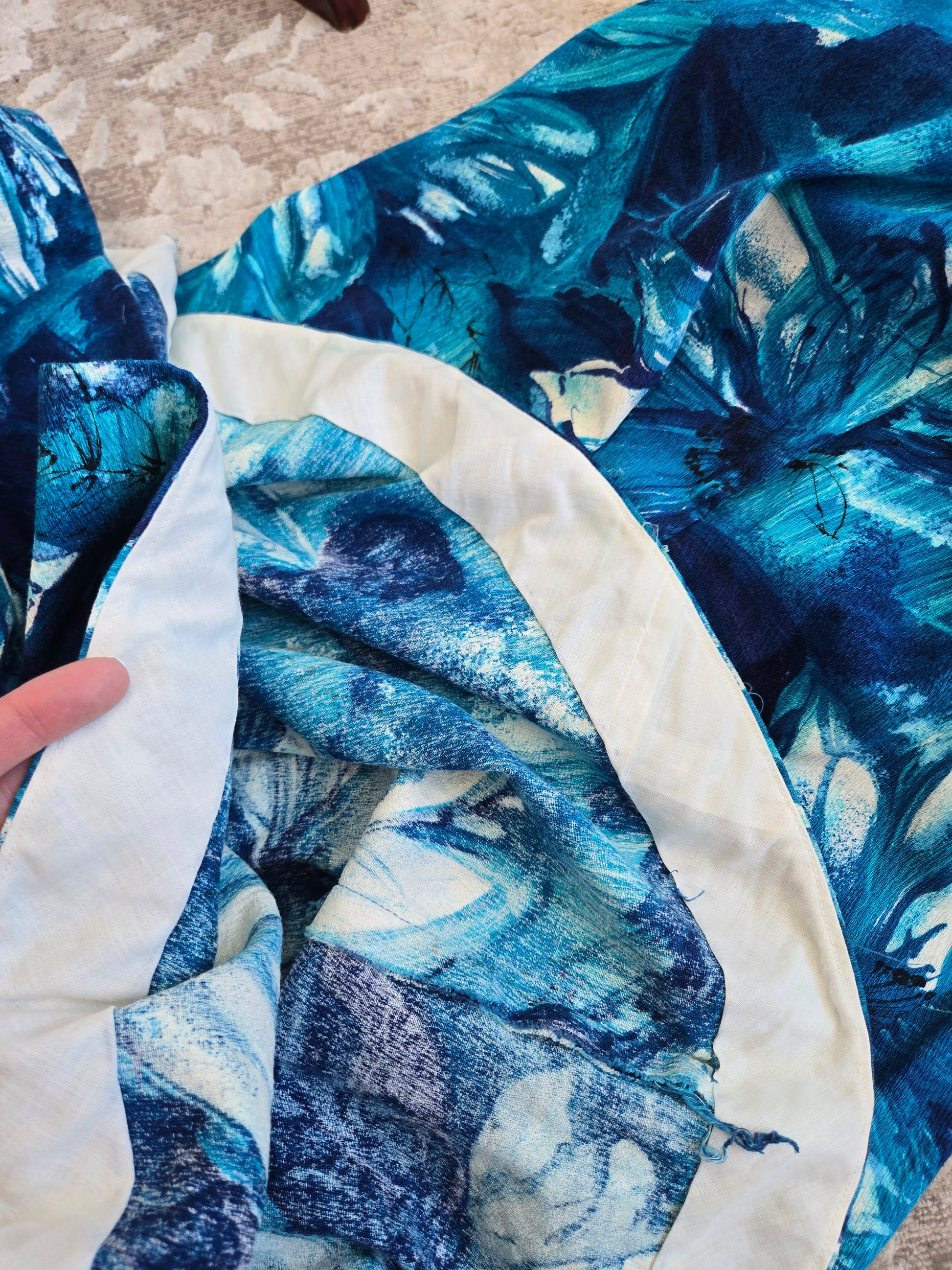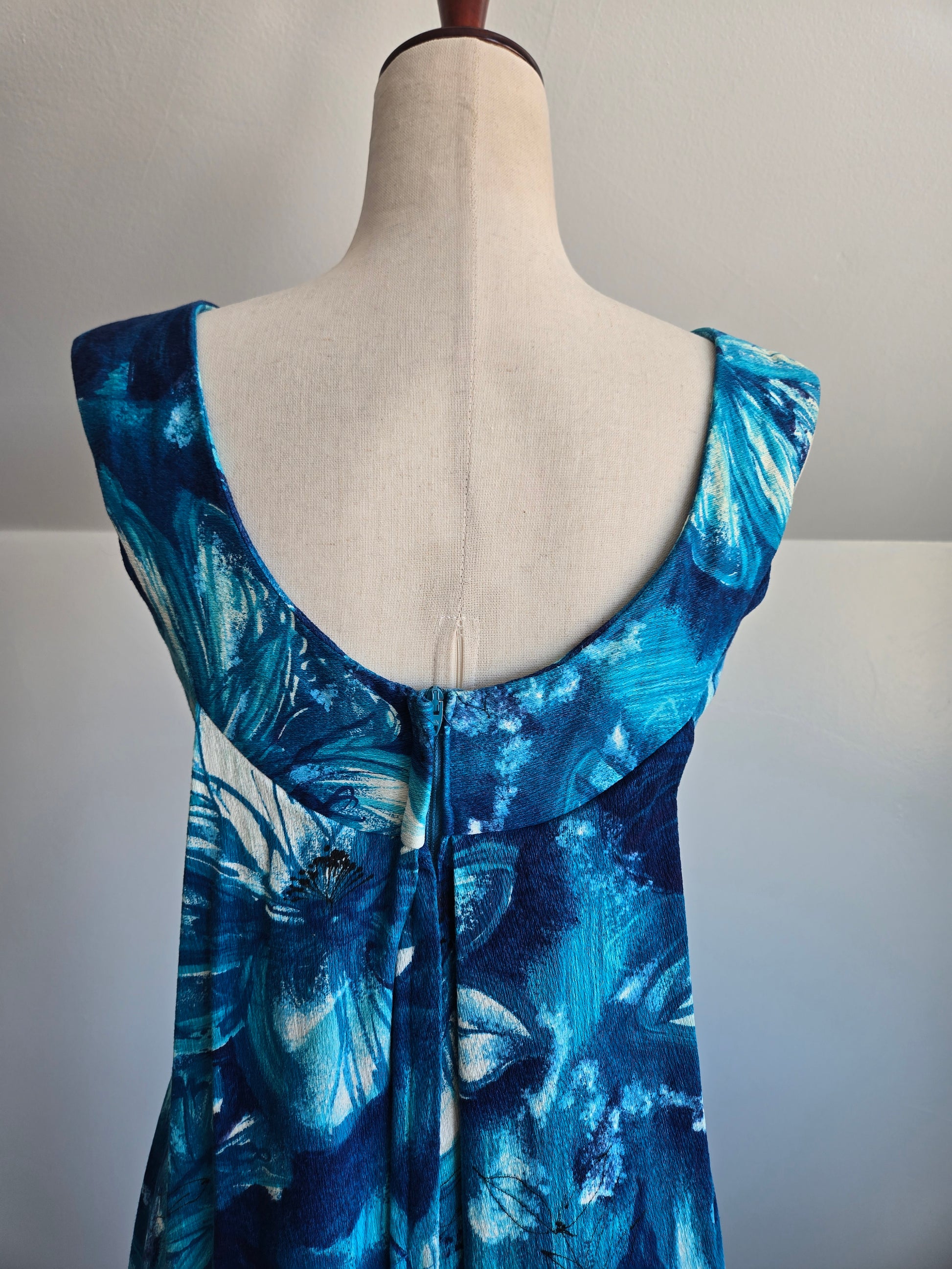 Vintage Royal Hawaiian cotton barkcloth dress in a stunning blue tropical print with the waterfall back. It has a gorgeous scoop neckline and a low back. It zips in the back so you can tie it up to pull the front in and then zip over it to allow the waterfall to drape loosely in the back. It has a Talon zipper. I have washed and steamed it, so it is ready to wear and is in perfect condition.