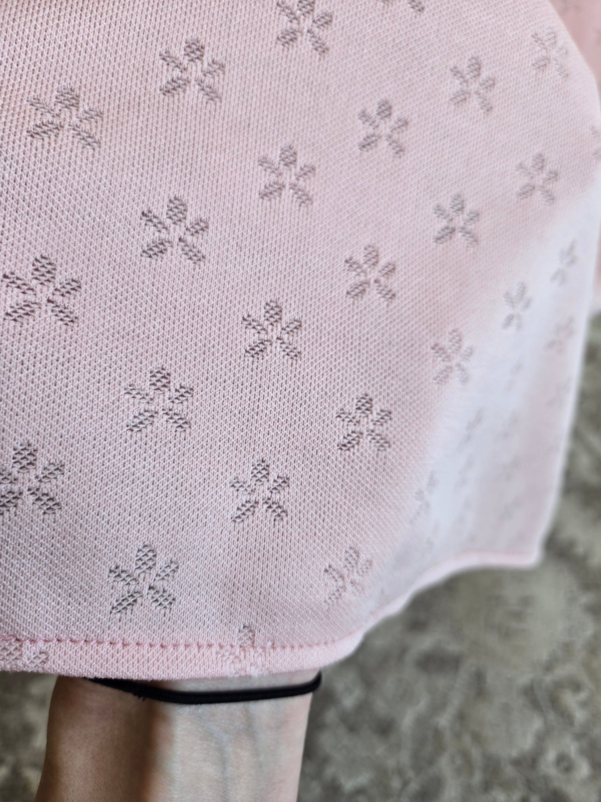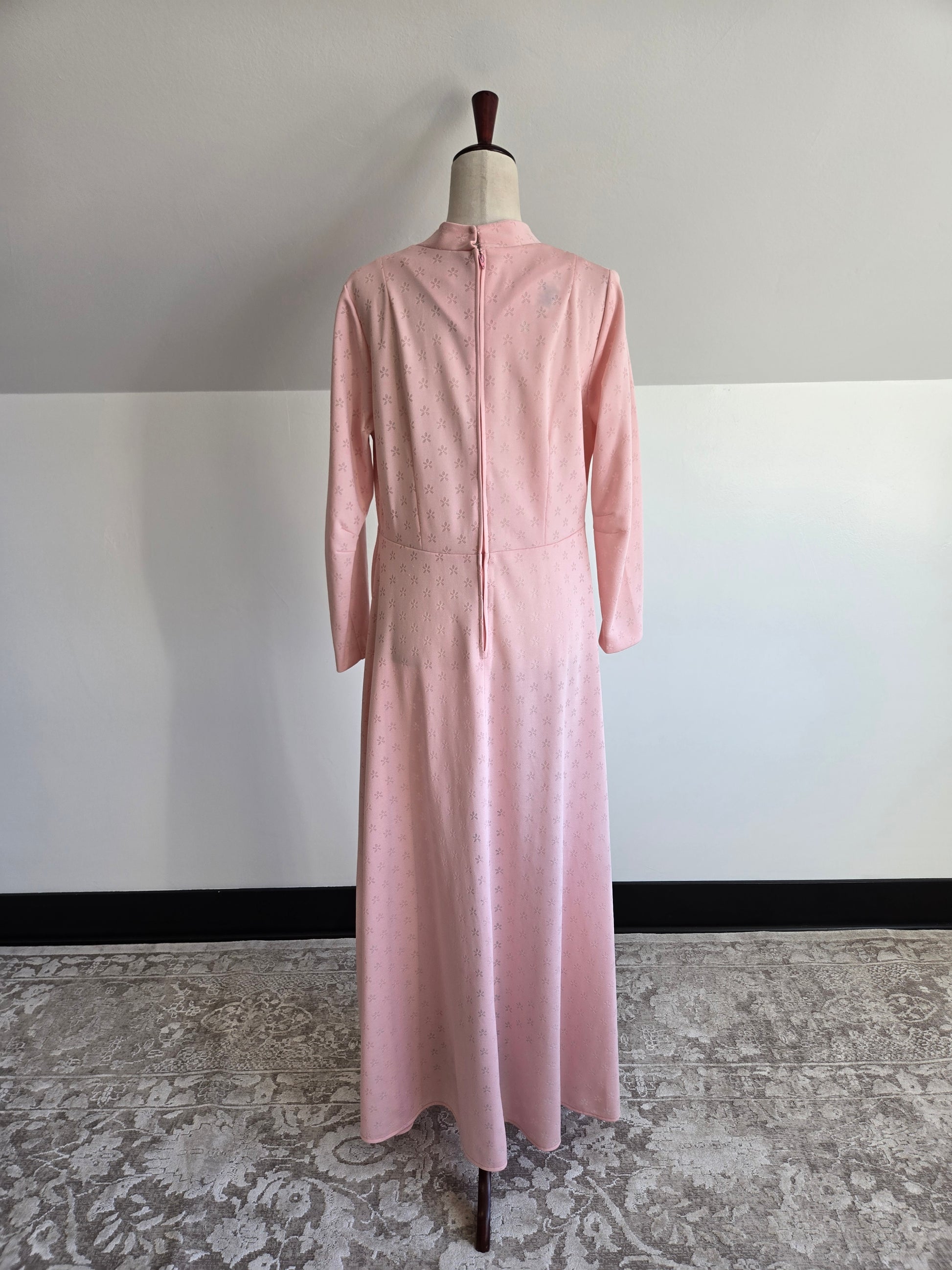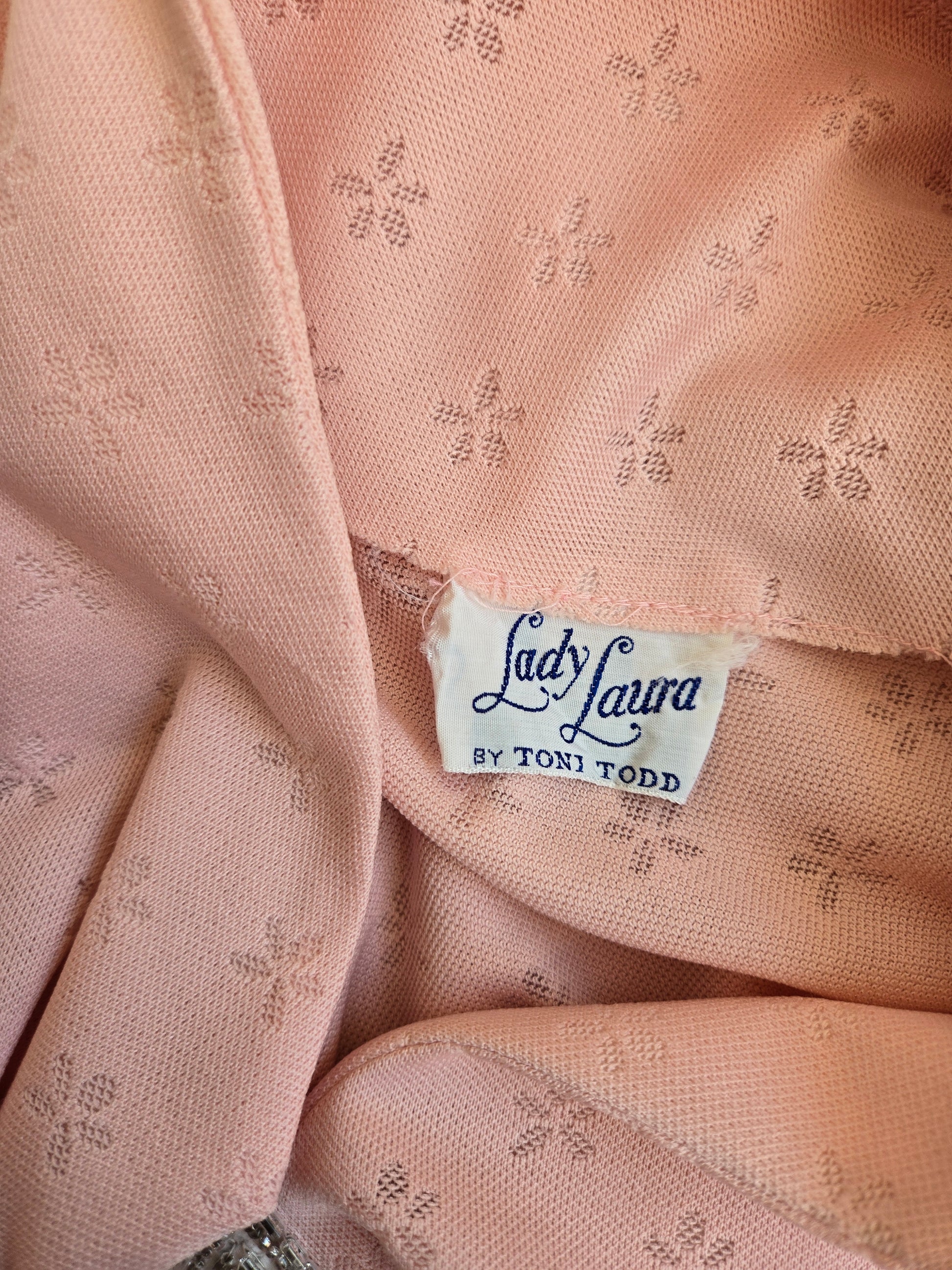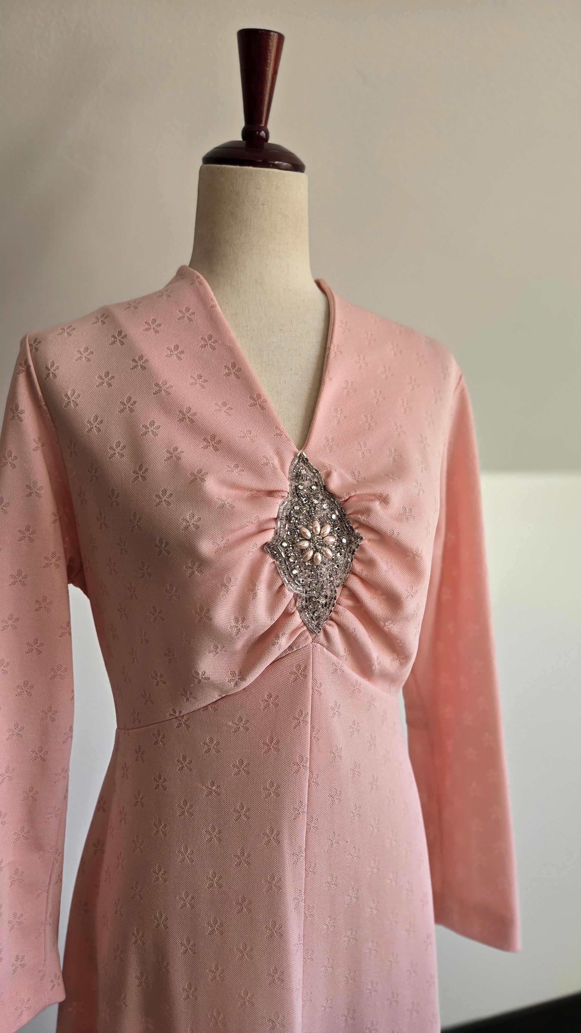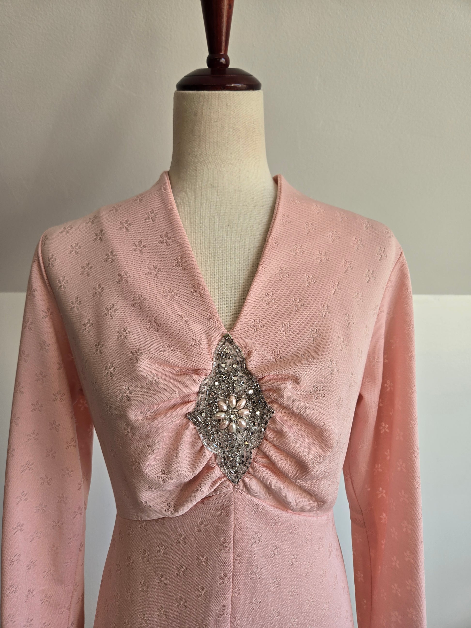 Vintage Lady Laura by Toni Todd pale pink poly knit long sleeve maxi dress. It has a beaded and rhinestone detail at the front bust area where there is rushing to create a beautiful shape. The poly knit fabric does have a floral knitted in that is slightly shear where the florals are, so you may want to wear a slip with this one. It is machine washable, even with the beadwork, and I have already washed and steamed it, so it is ready to wear. Zips in the back and no imperfections to call out.
