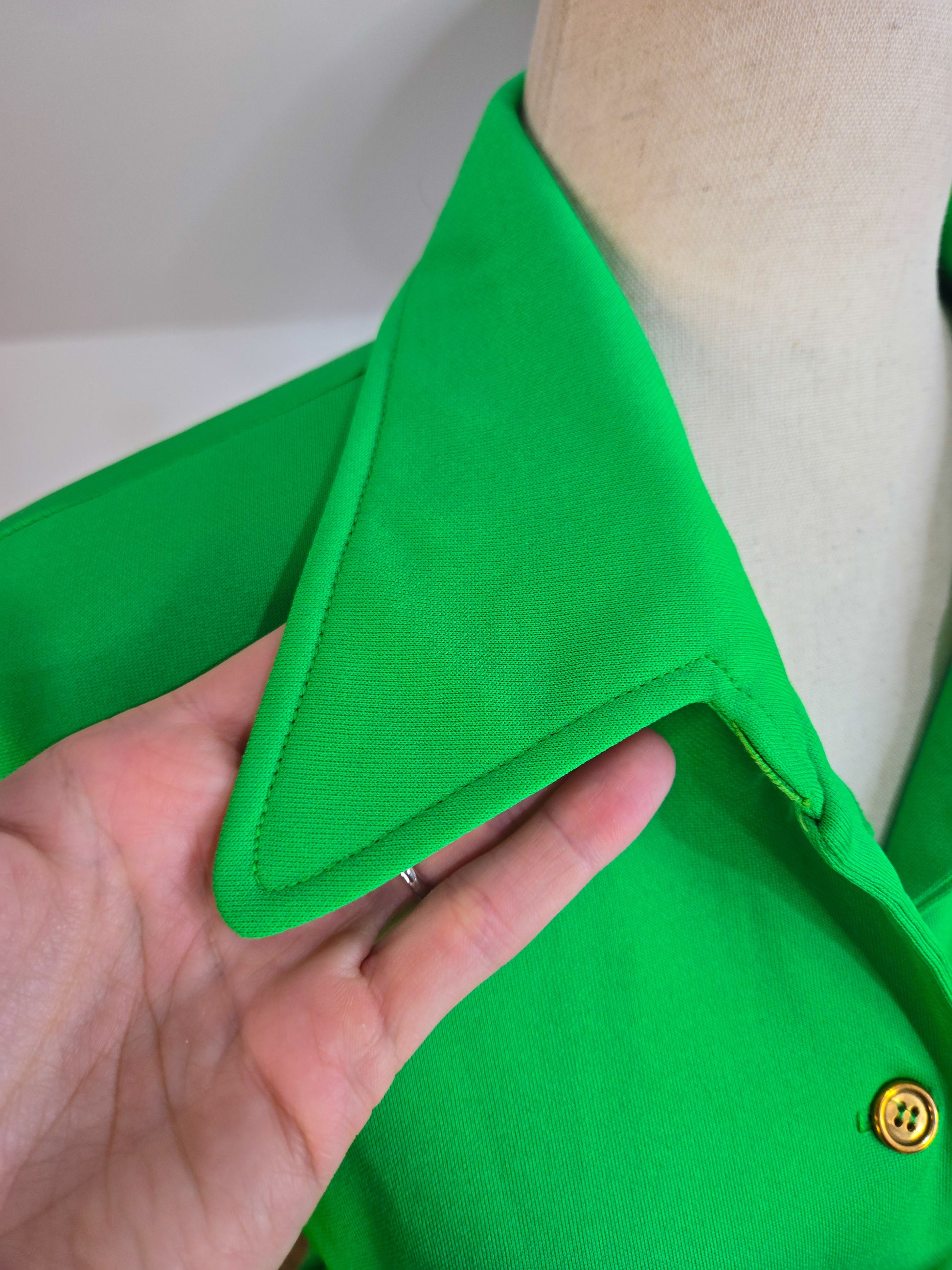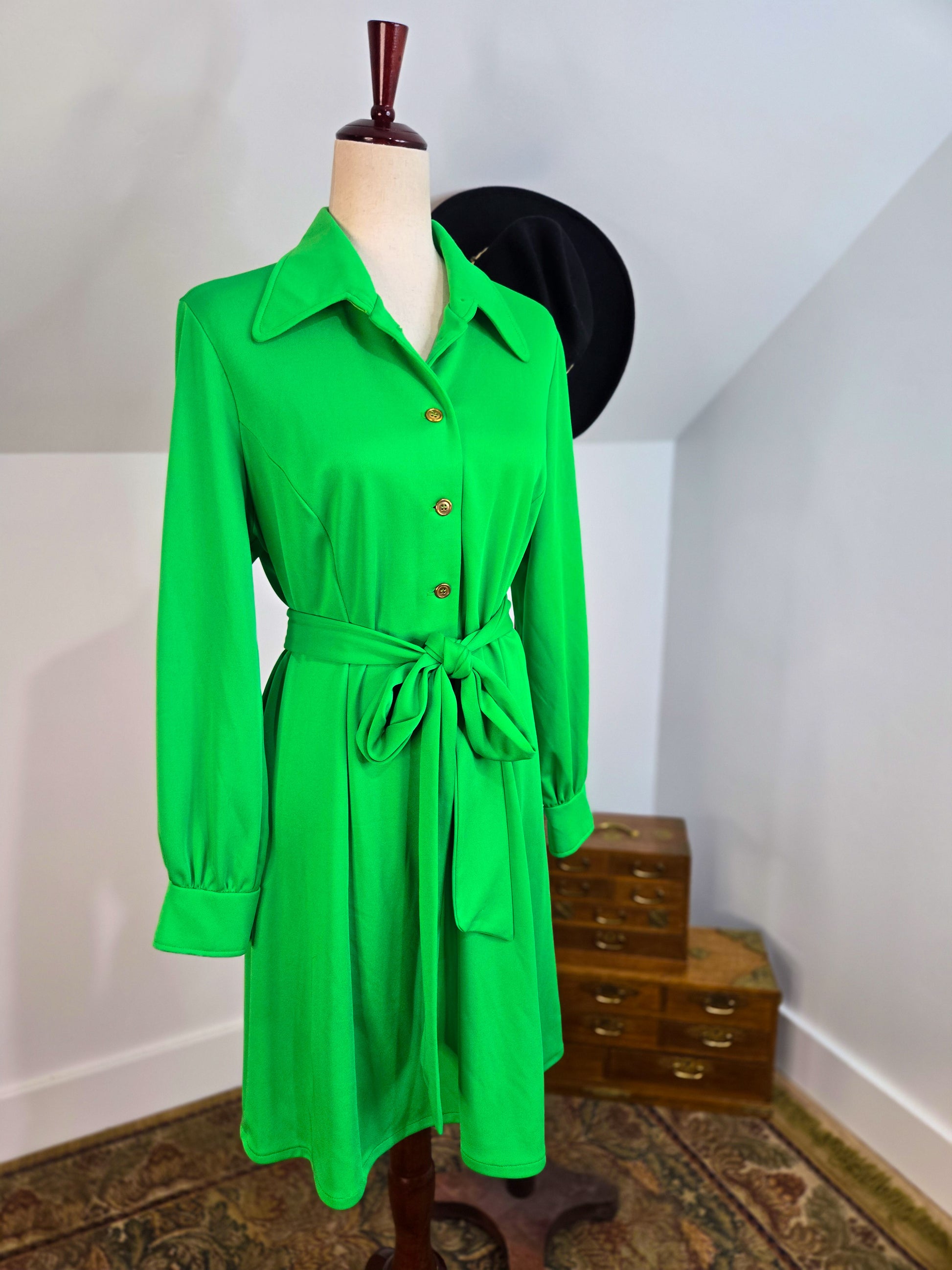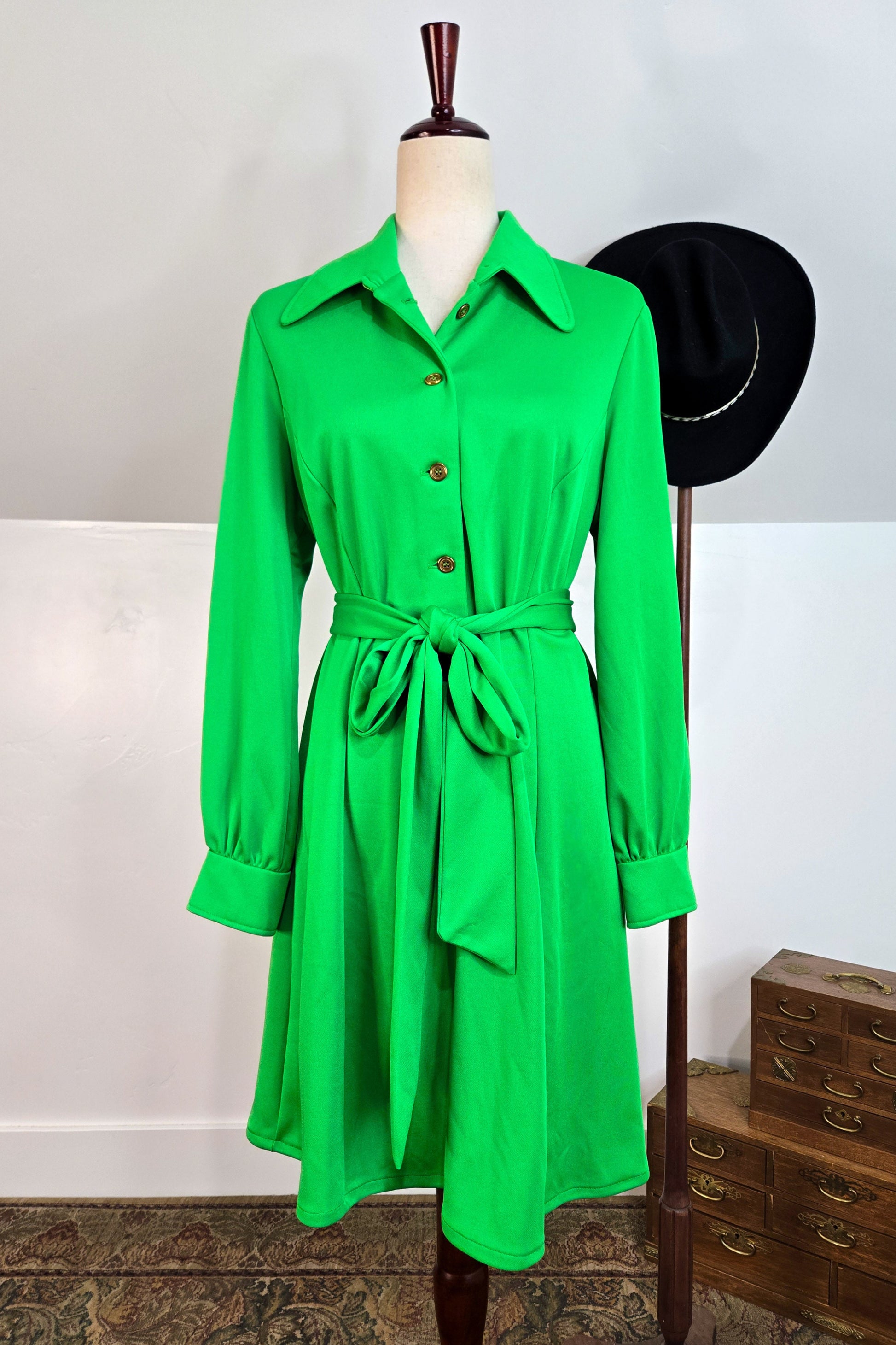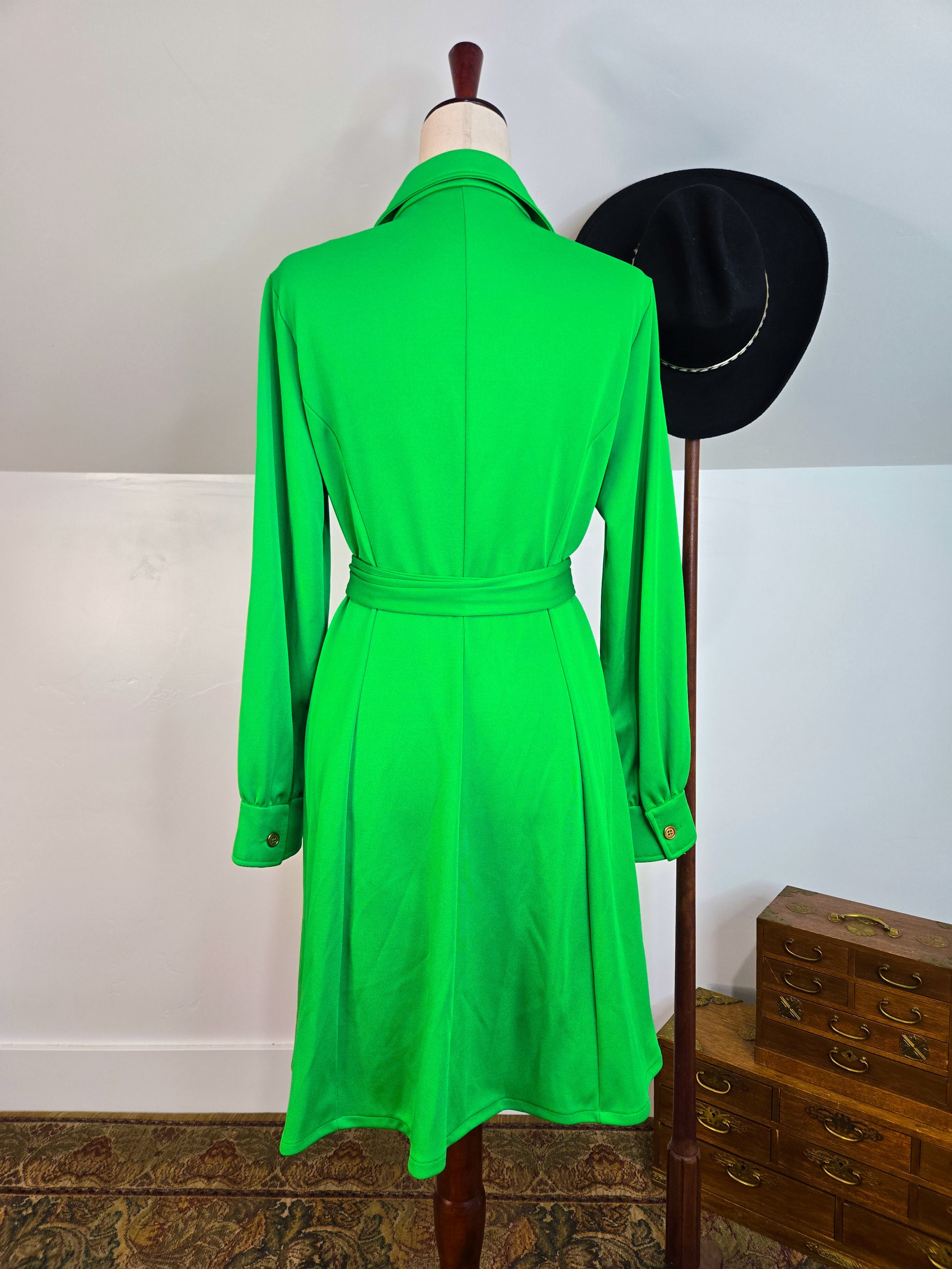 Vintage 70s lime green poly knit button down dress with matching waist tie. The waist tie is not attached, so you can remove it. Without waist tie, it still has a little bit of a flare to the skirt, so it's super cute! It has been hemmed to this length by my seamstress due to an imperfection. It is in amazing condition and has been laundered.