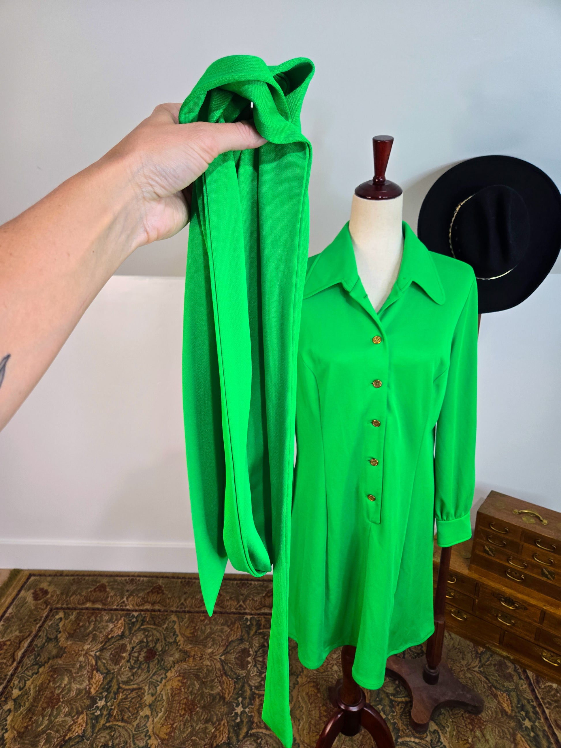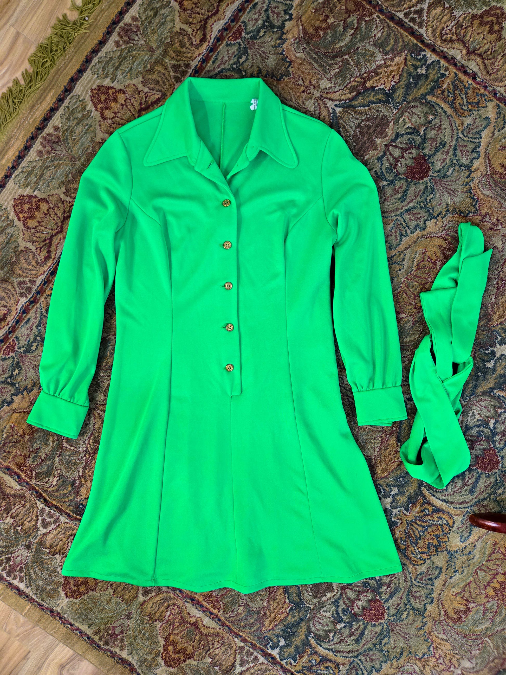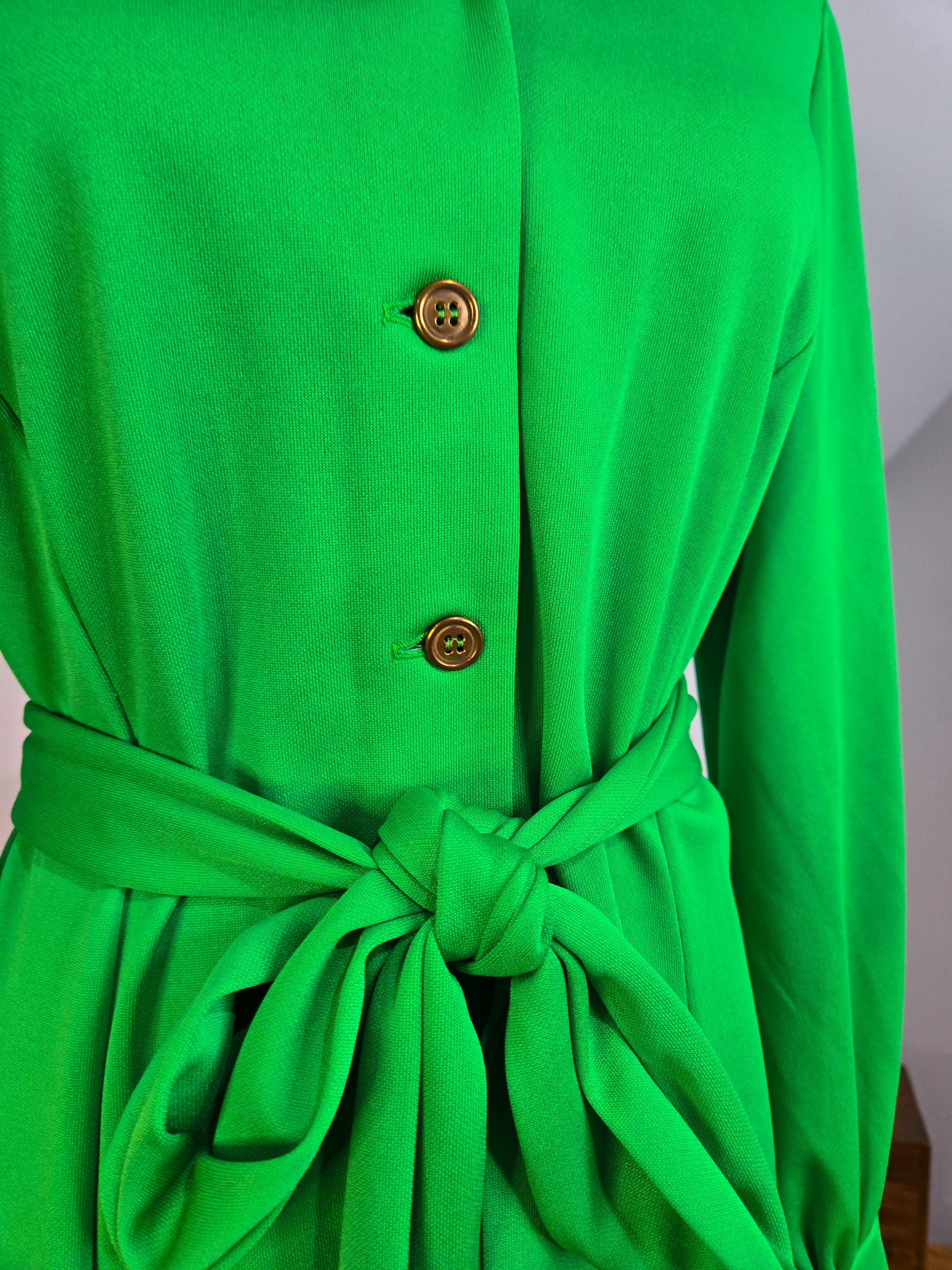 Vintage 70s lime green poly knit button down dress with matching waist tie. The waist tie is not attached, so you can remove it. Without waist tie, it still has a little bit of a flare to the skirt, so it's super cute! It has been hemmed to this length by my seamstress due to an imperfection. It is in amazing condition and has been laundered.