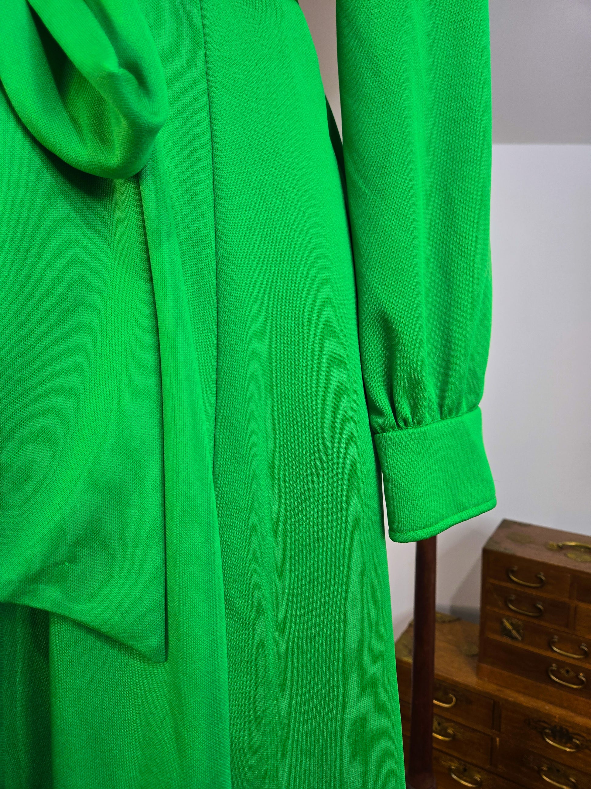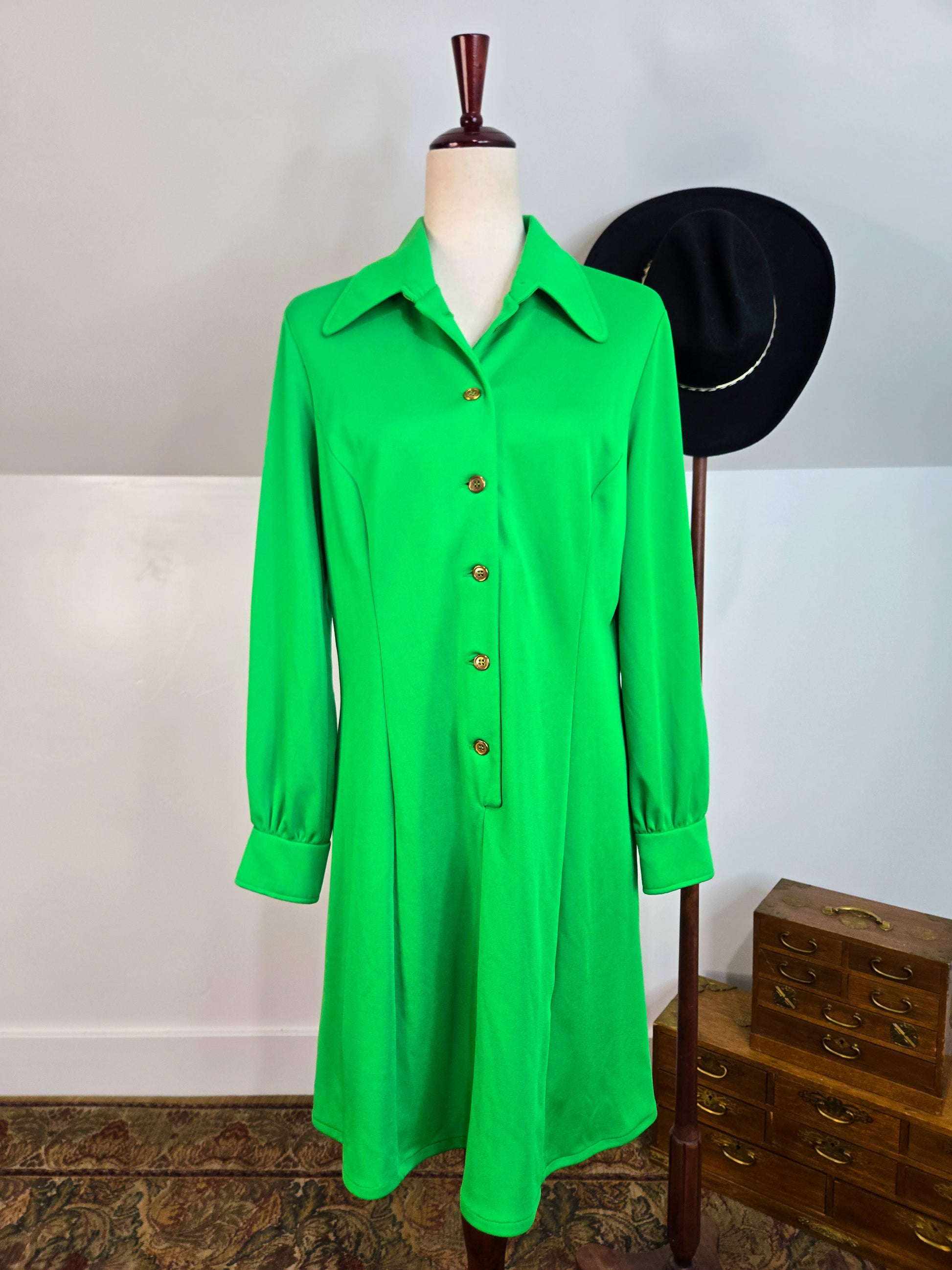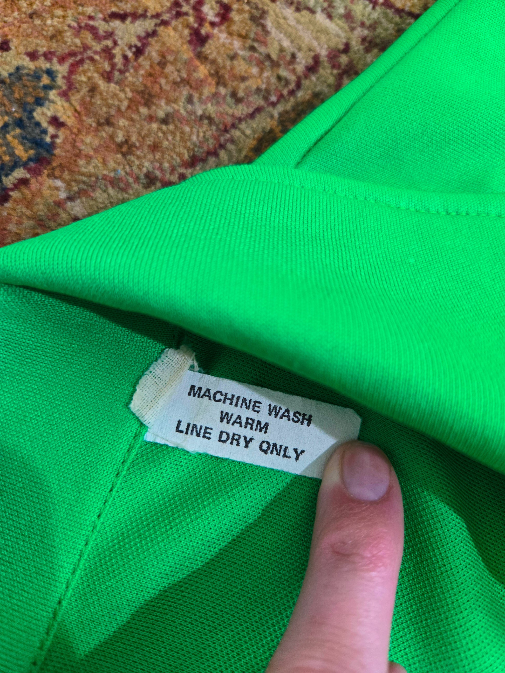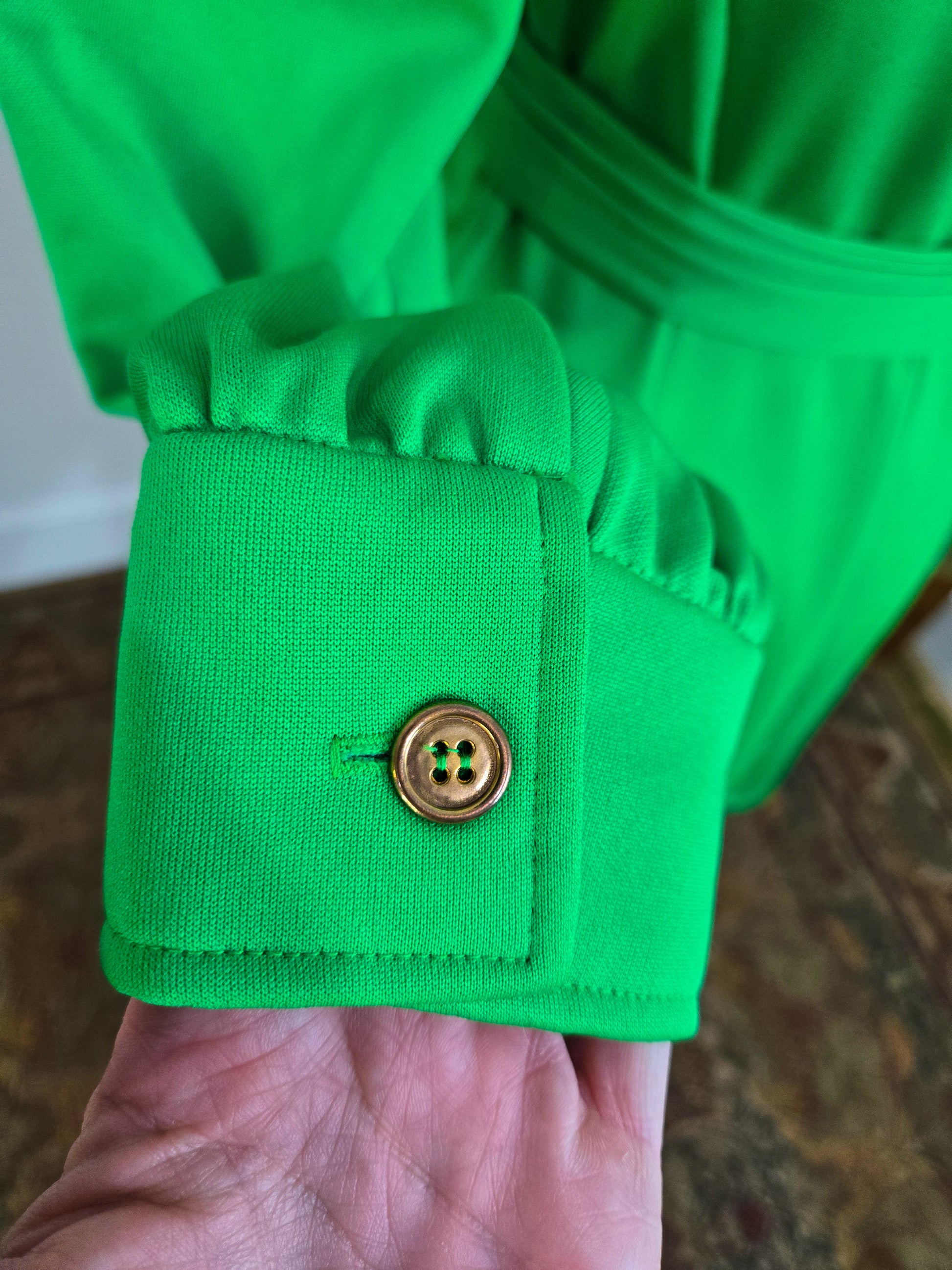 Vintage 70s lime green poly knit button down dress with matching waist tie. The waist tie is not attached, so you can remove it. Without waist tie, it still has a little bit of a flare to the skirt, so it's super cute! It has been hemmed to this length by my seamstress due to an imperfection. It is in amazing condition and has been laundered.