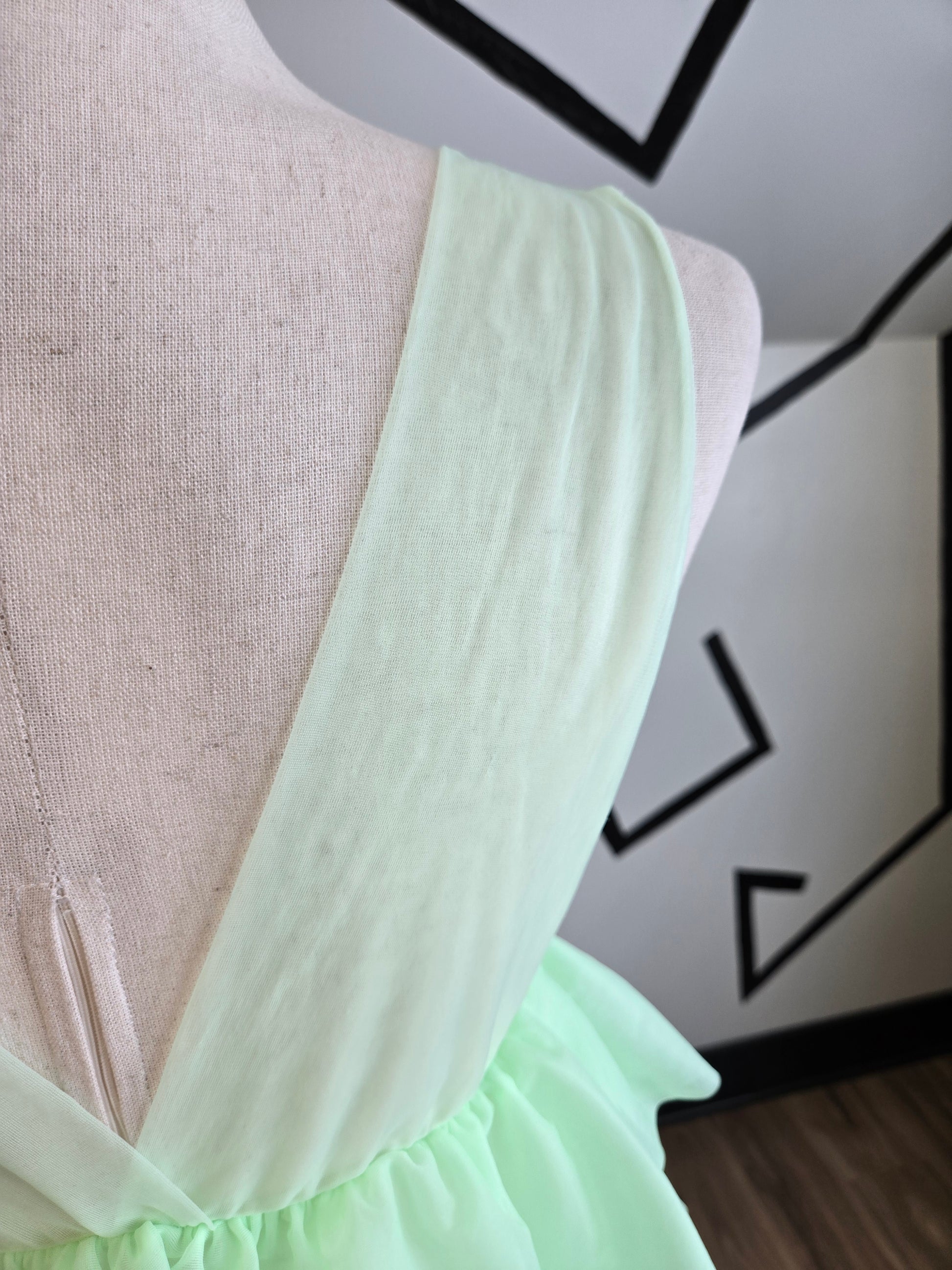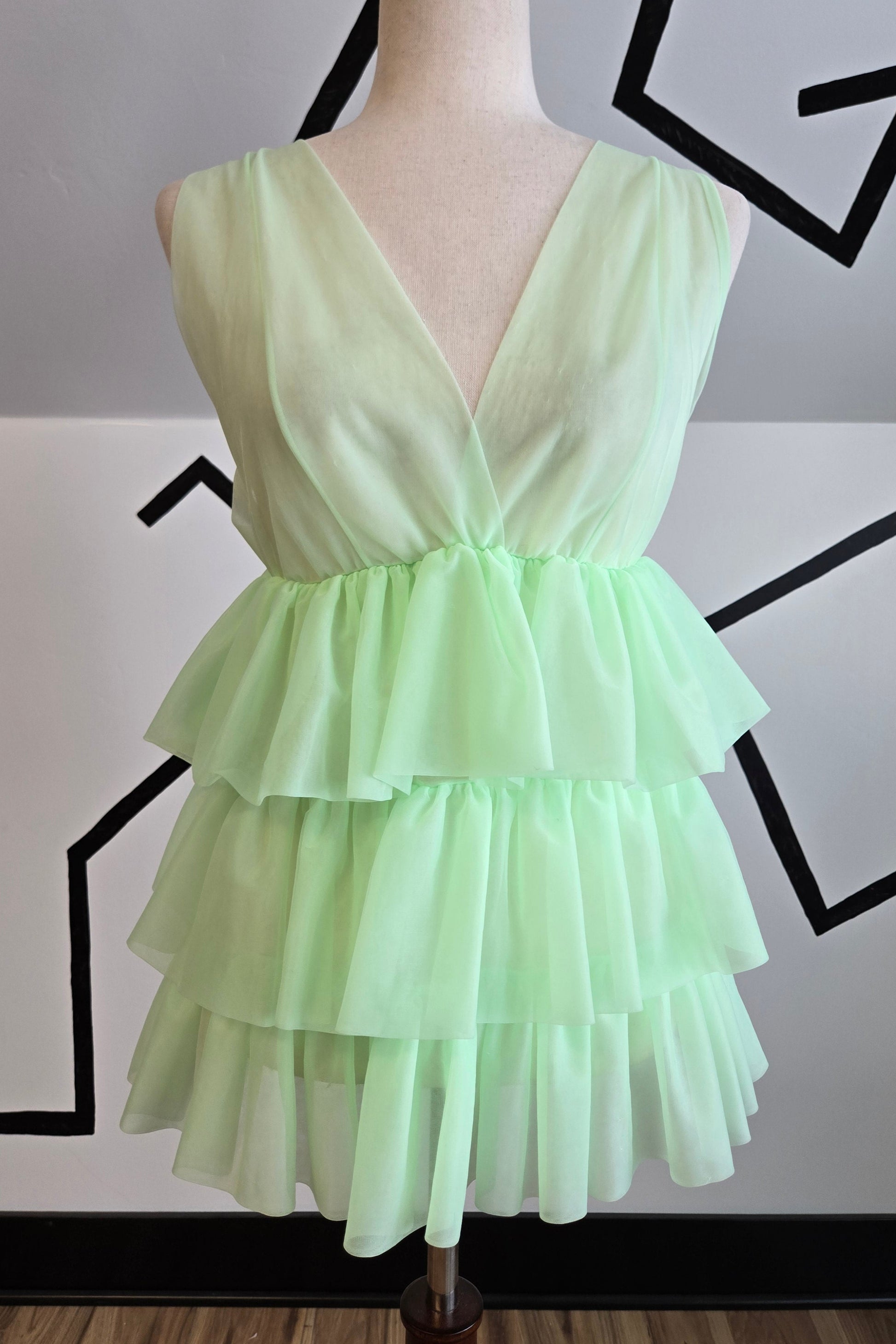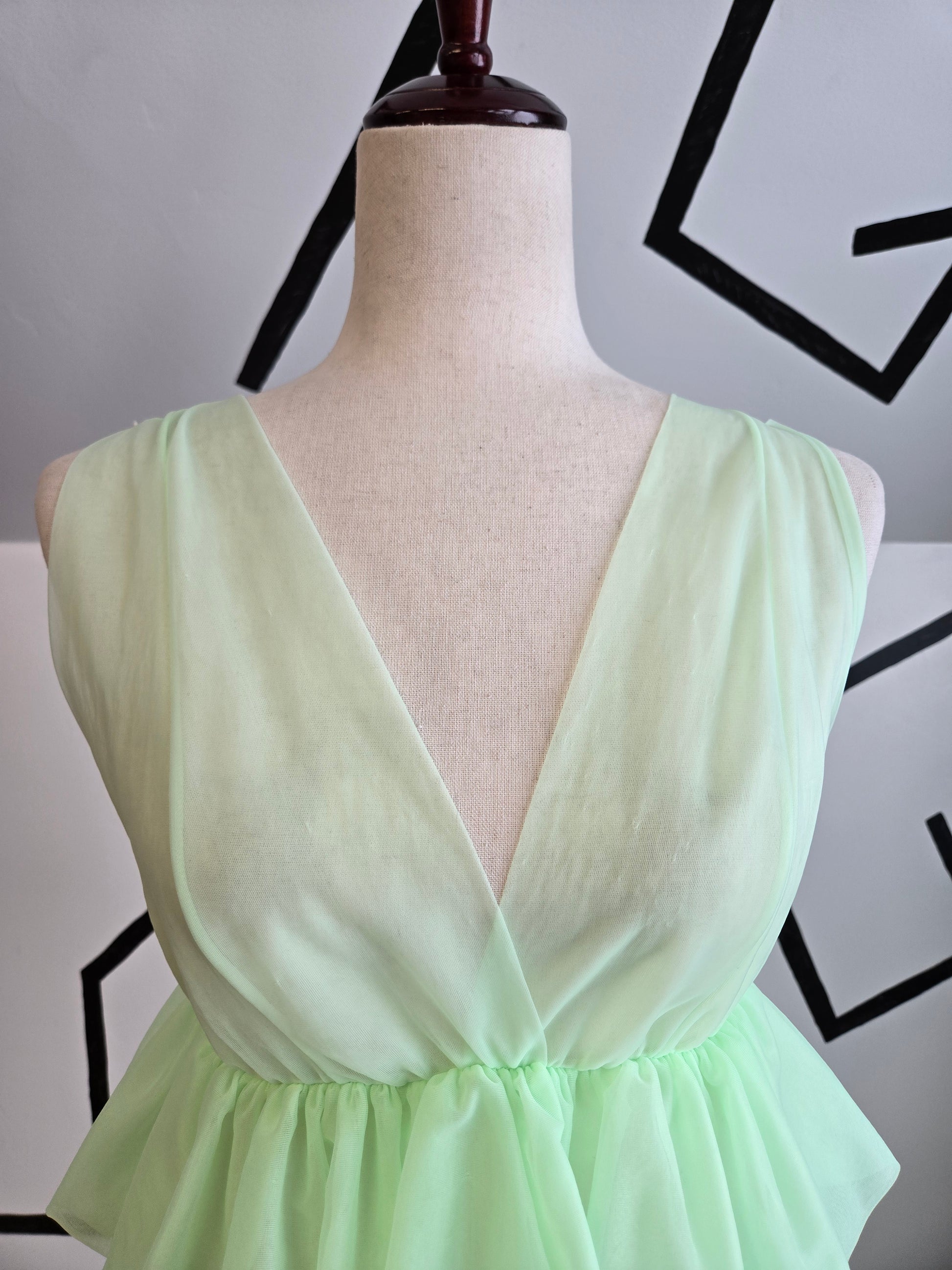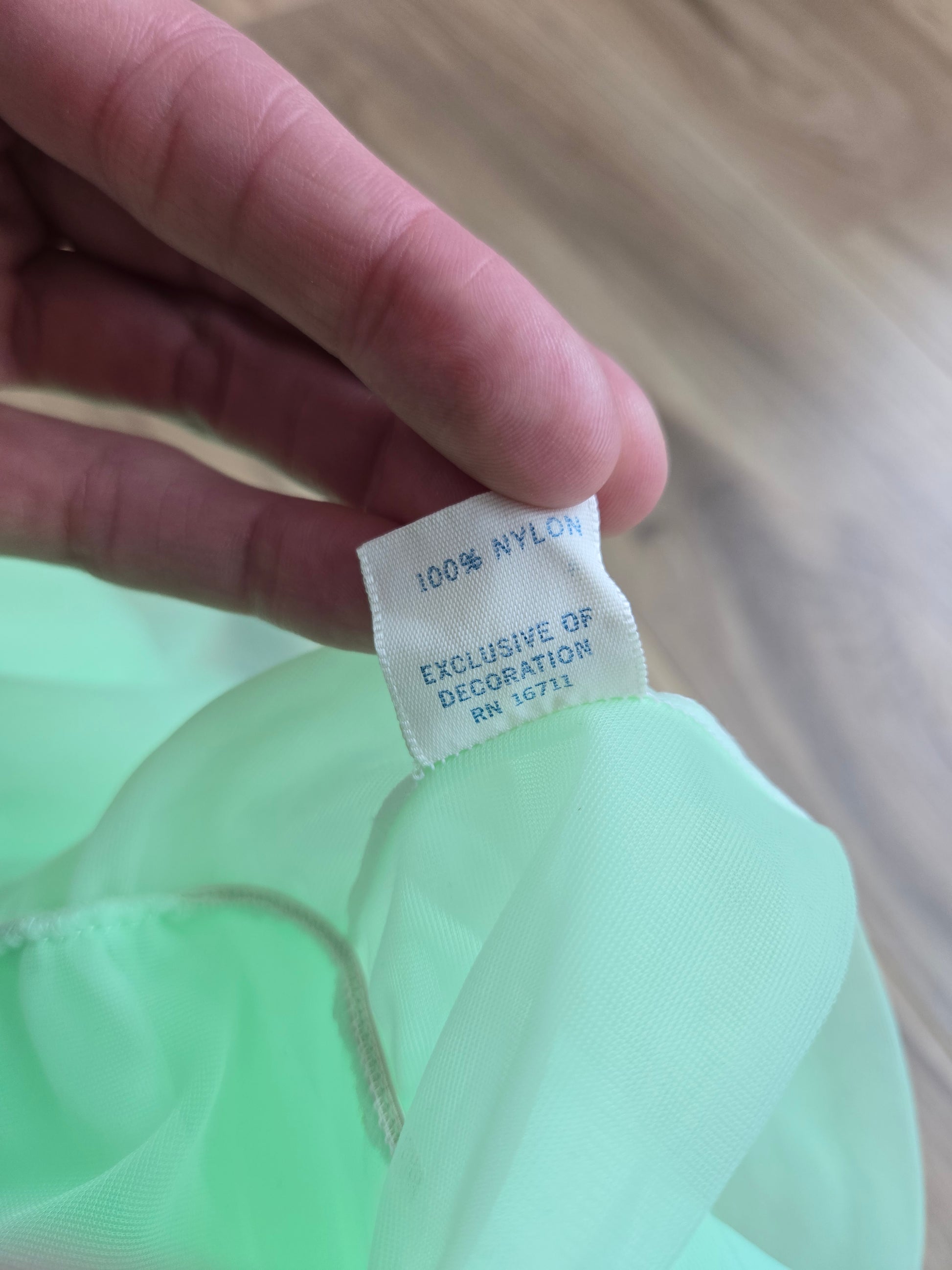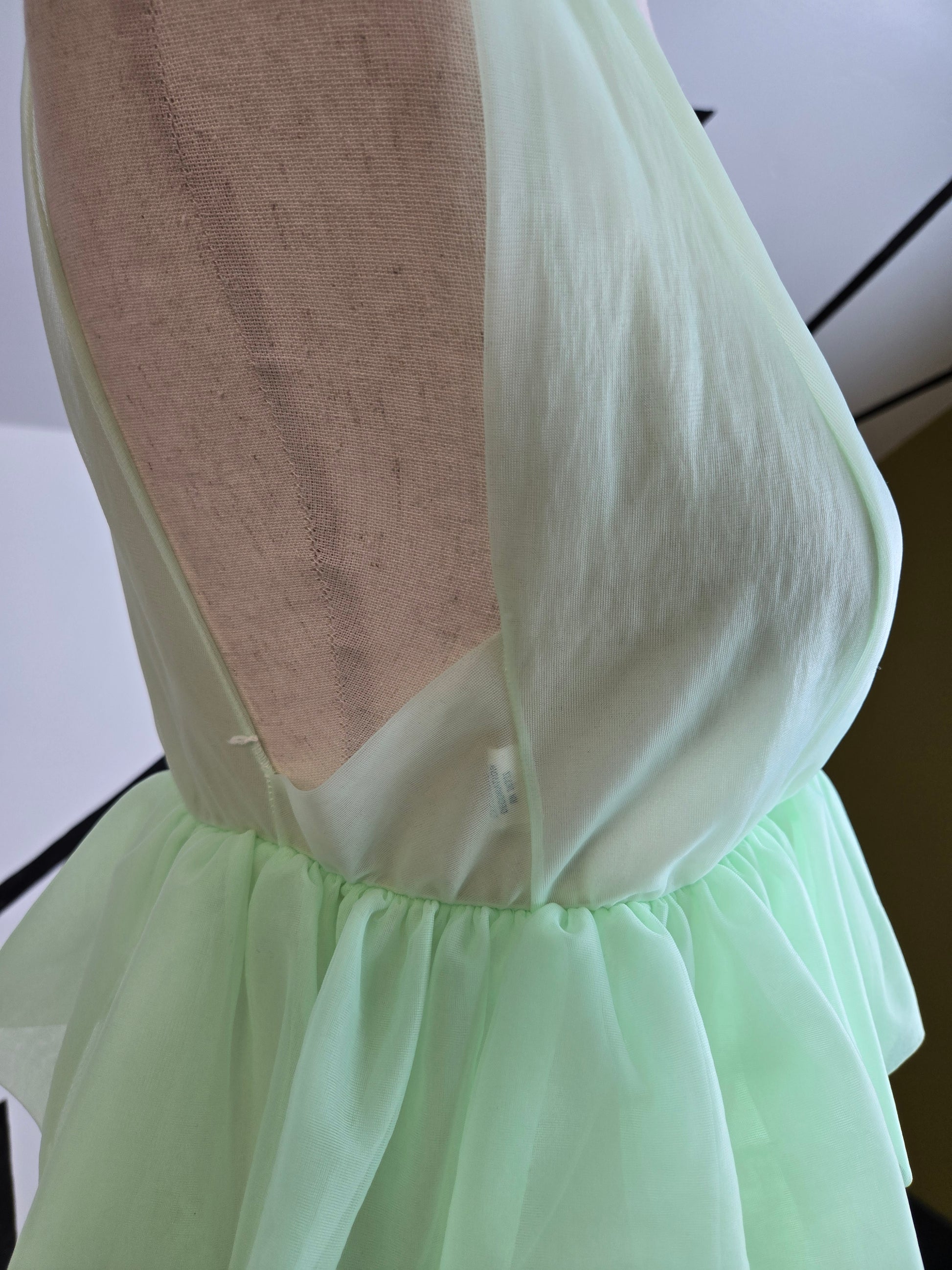 Vintage lime green shear negligee with layered ruffles throughout the skirt part. This piece is very well and thoughtfully made. There is a small side insert at the side of the bust for a tiny bit more coverage, and the ruffles are all folded over and double layered so it looks fuller and there is no stitched or raw hems. I'm literally obsessed! No condition issues at all, which is also rare for this fabric!