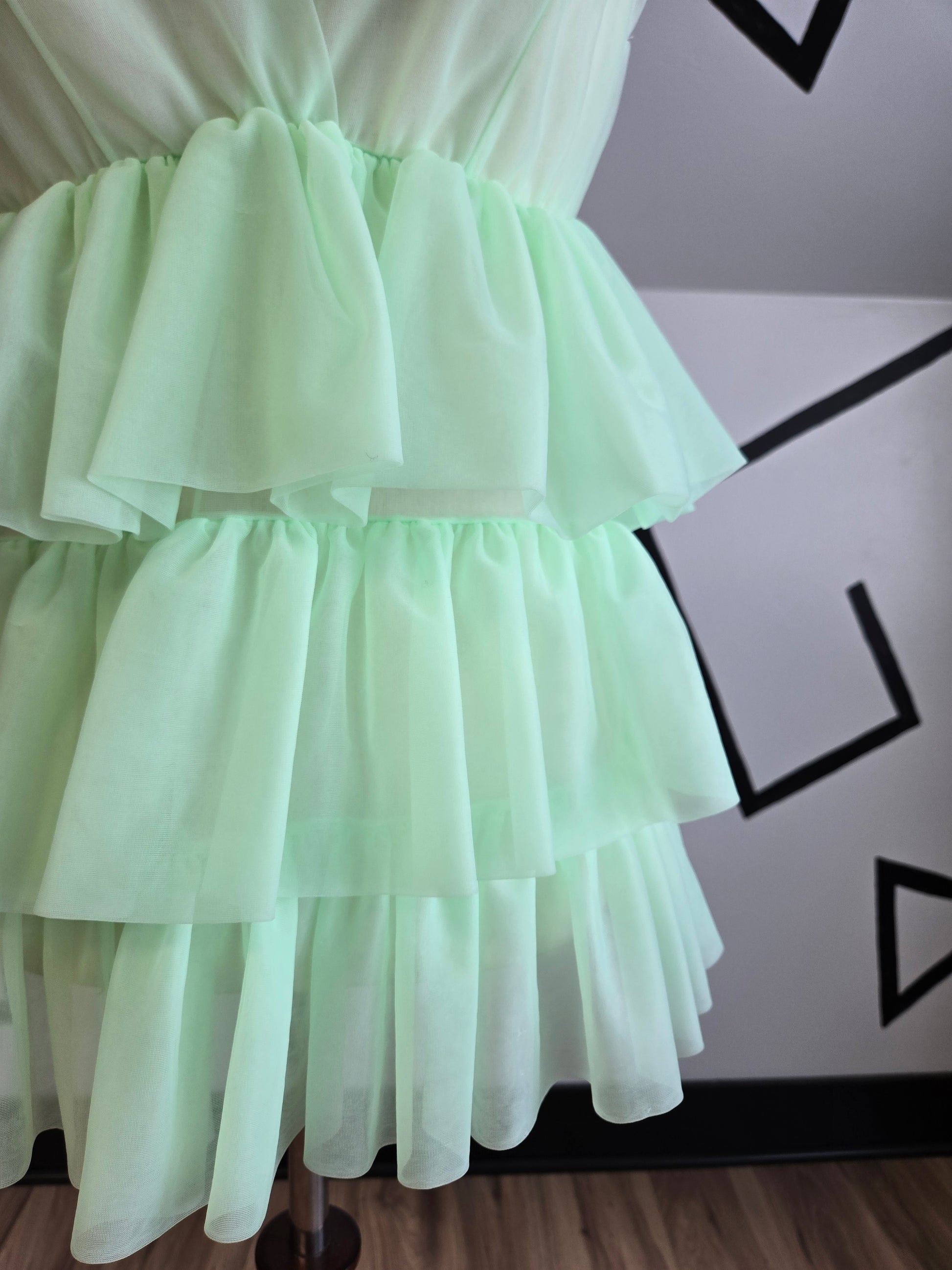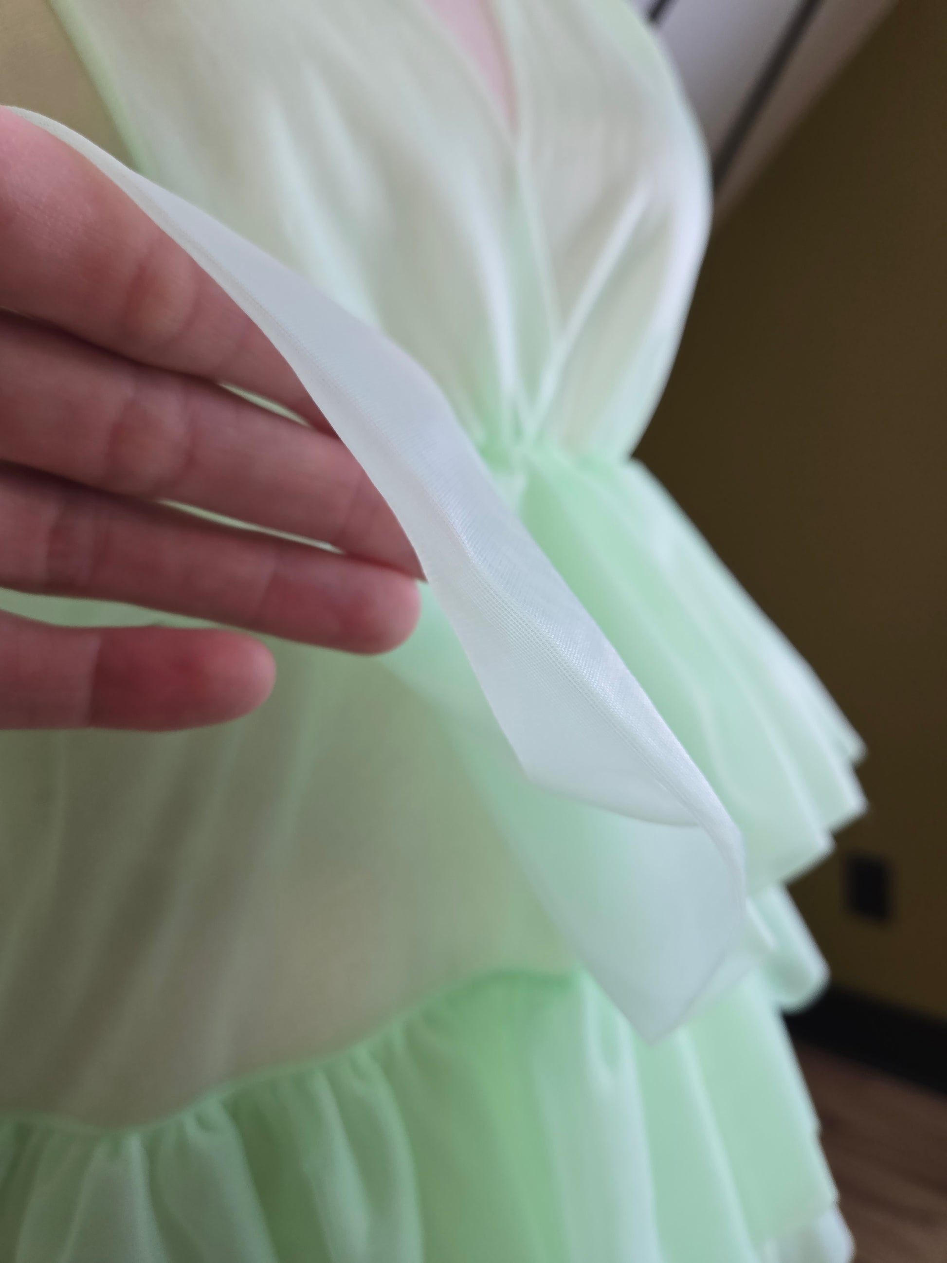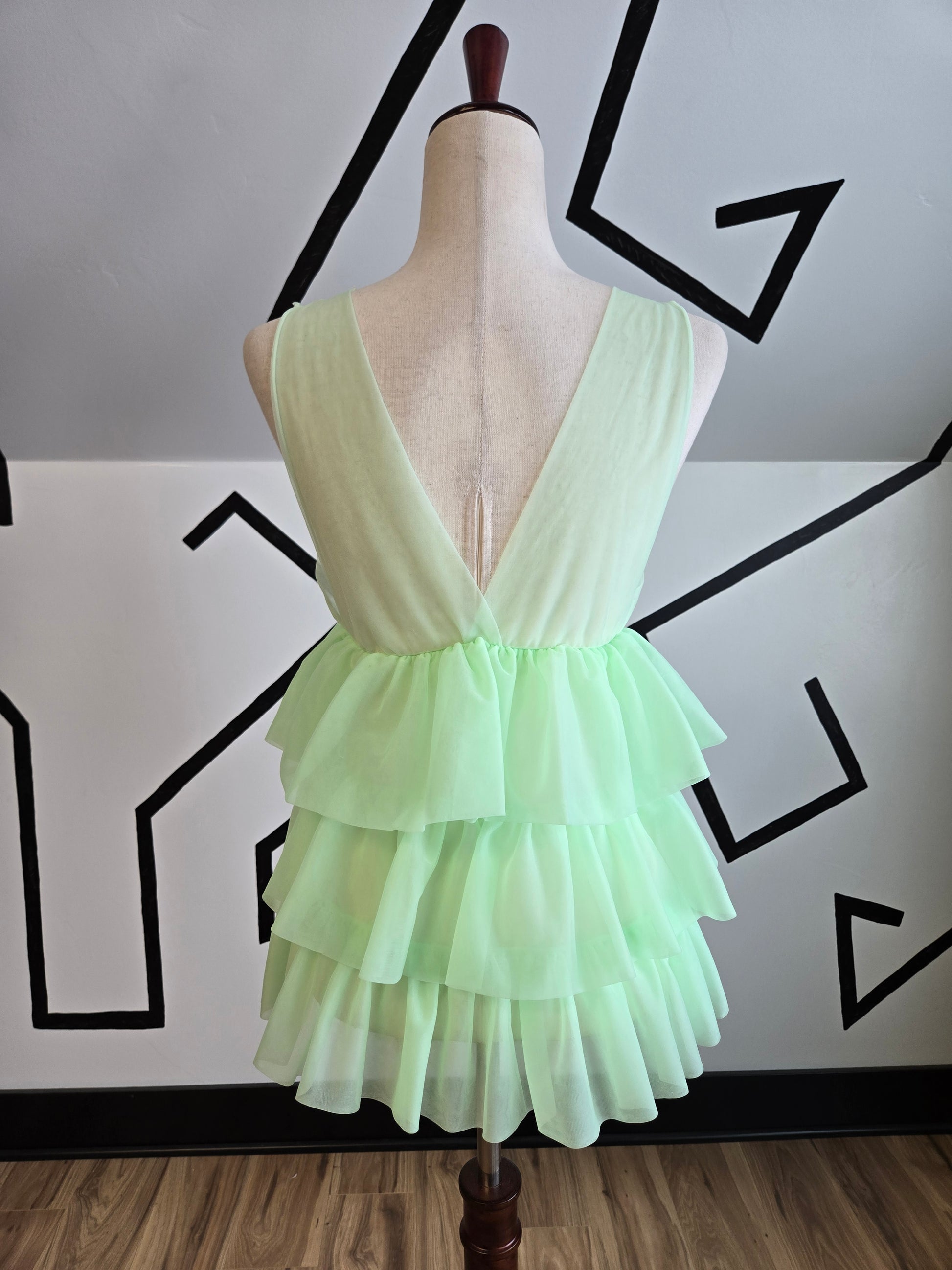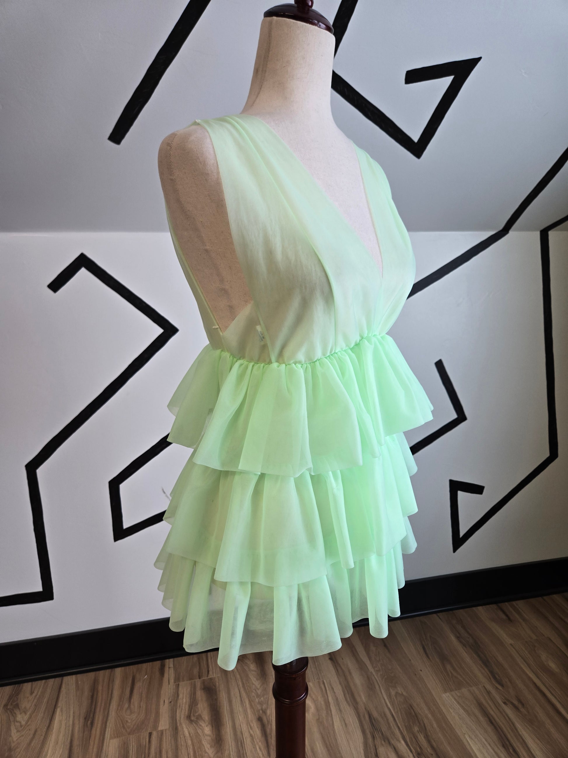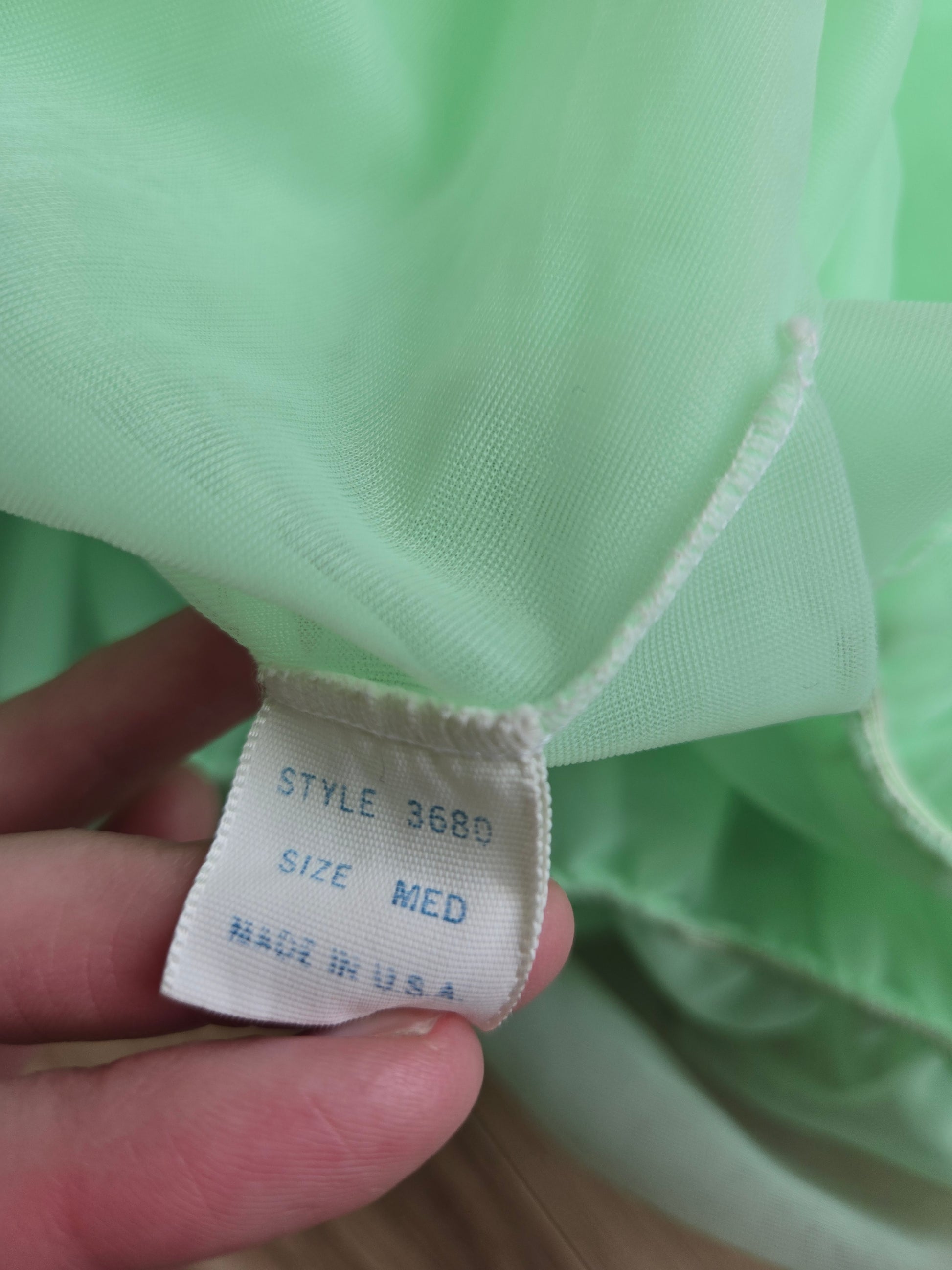 Vintage lime green shear negligee with layered ruffles throughout the skirt part. This piece is very well and thoughtfully made. There is a small side insert at the side of the bust for a tiny bit more coverage, and the ruffles are all folded over and double layered so it looks fuller and there is no stitched or raw hems. I'm literally obsessed! No condition issues at all, which is also rare for this fabric!