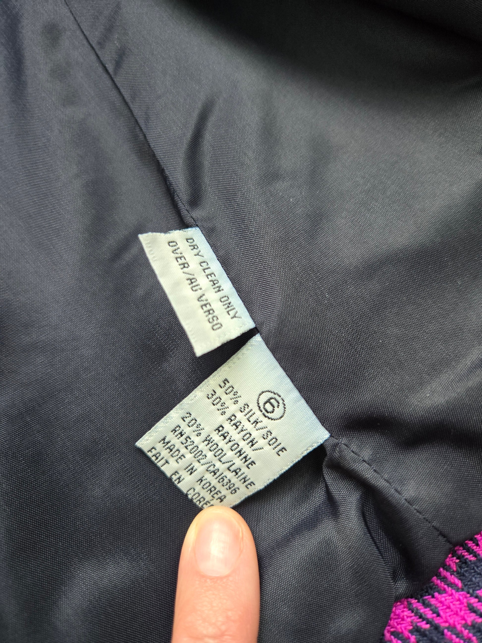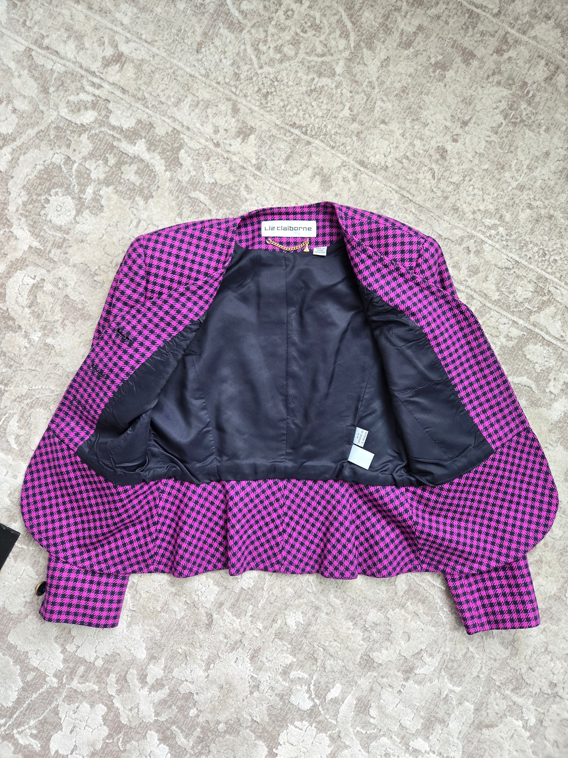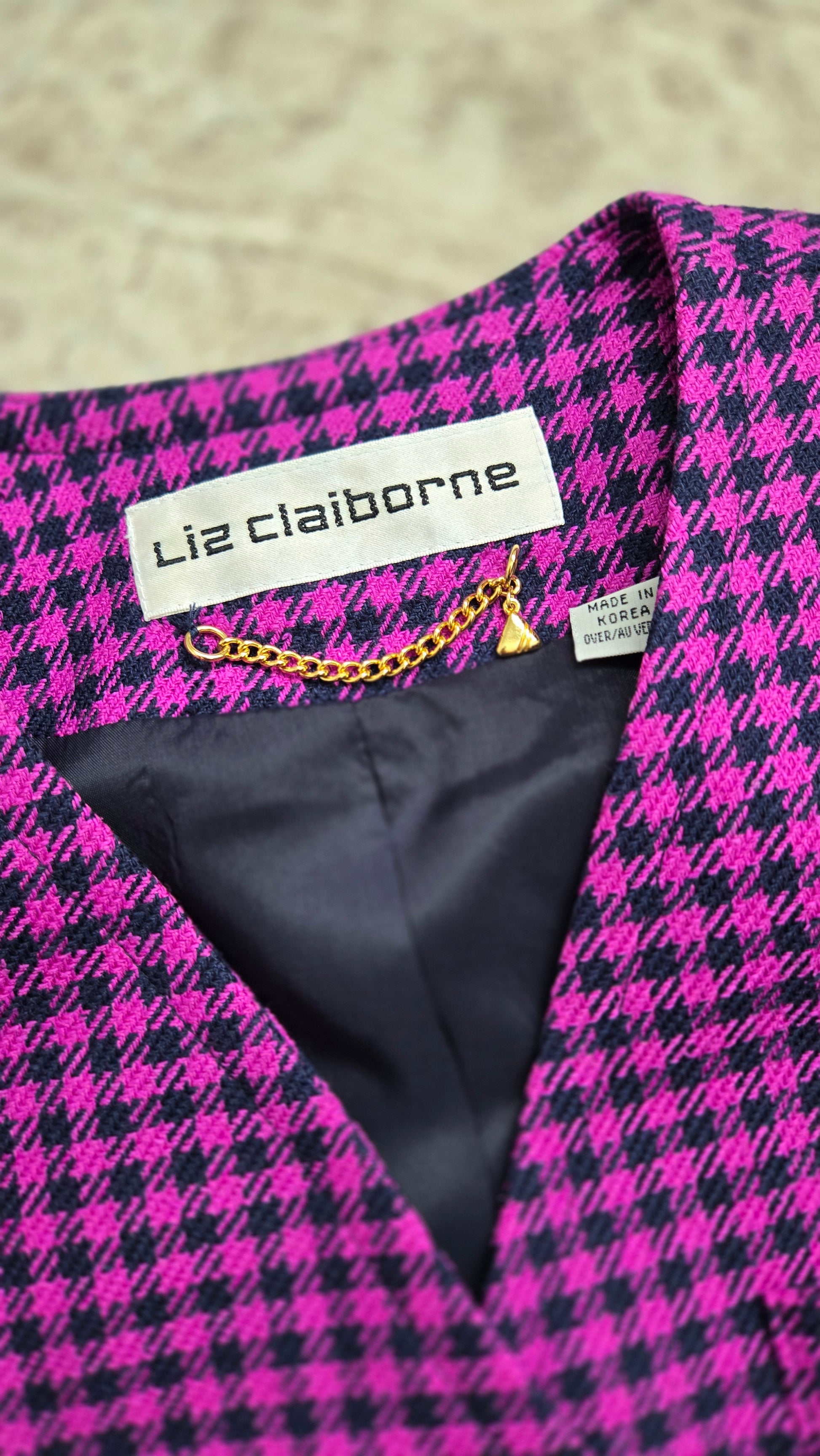 Liz Claiborne vintage 80s silk and wool blend tweed pink and navy plaid two piece set. The blazer has a structured waist line and large navy bubble buttons trimmed in gold. There are small shoulder pads. The skirt has a zipper and button closure and they are both fully lined. Perfect condition. Made in Korea.