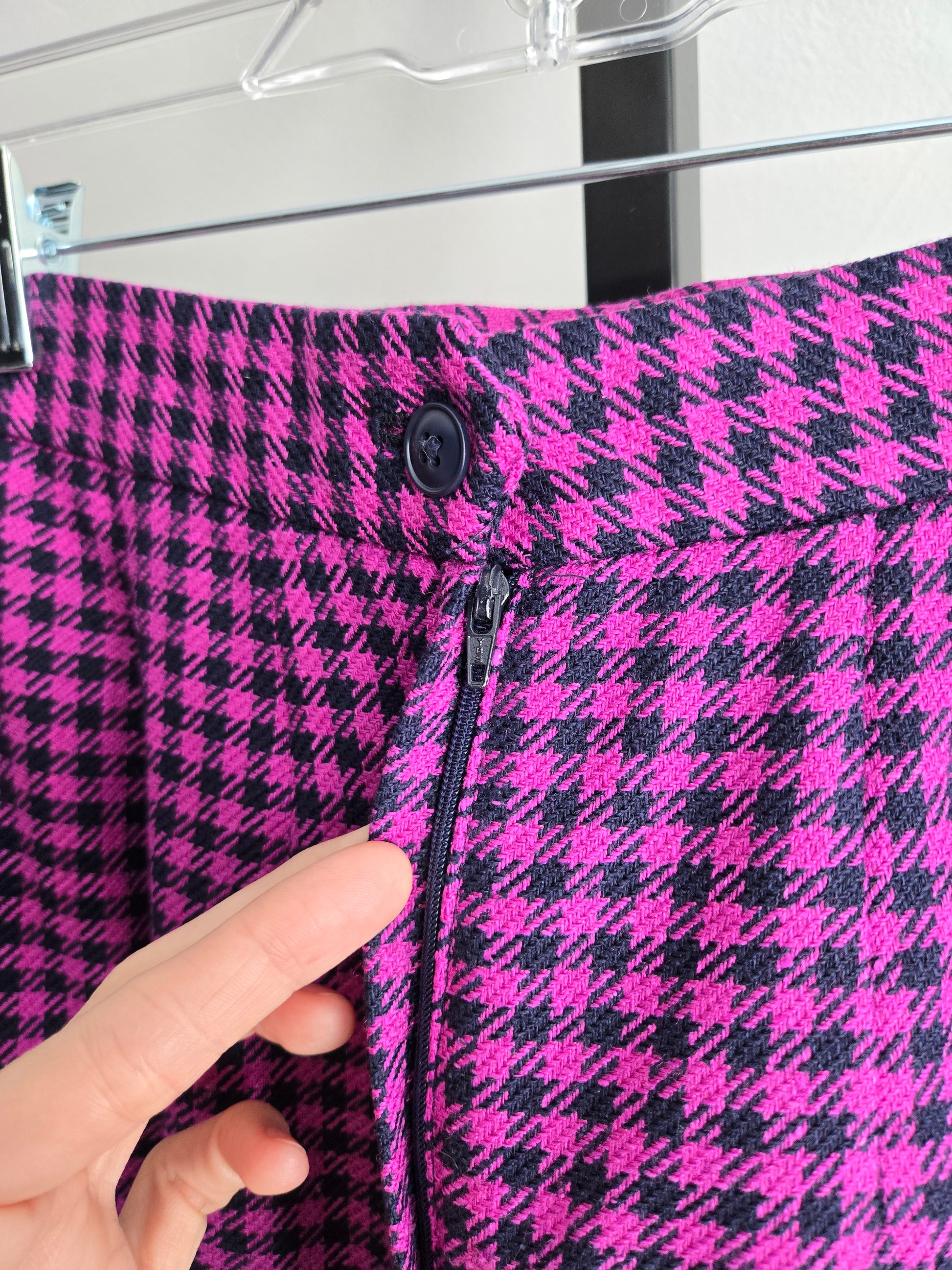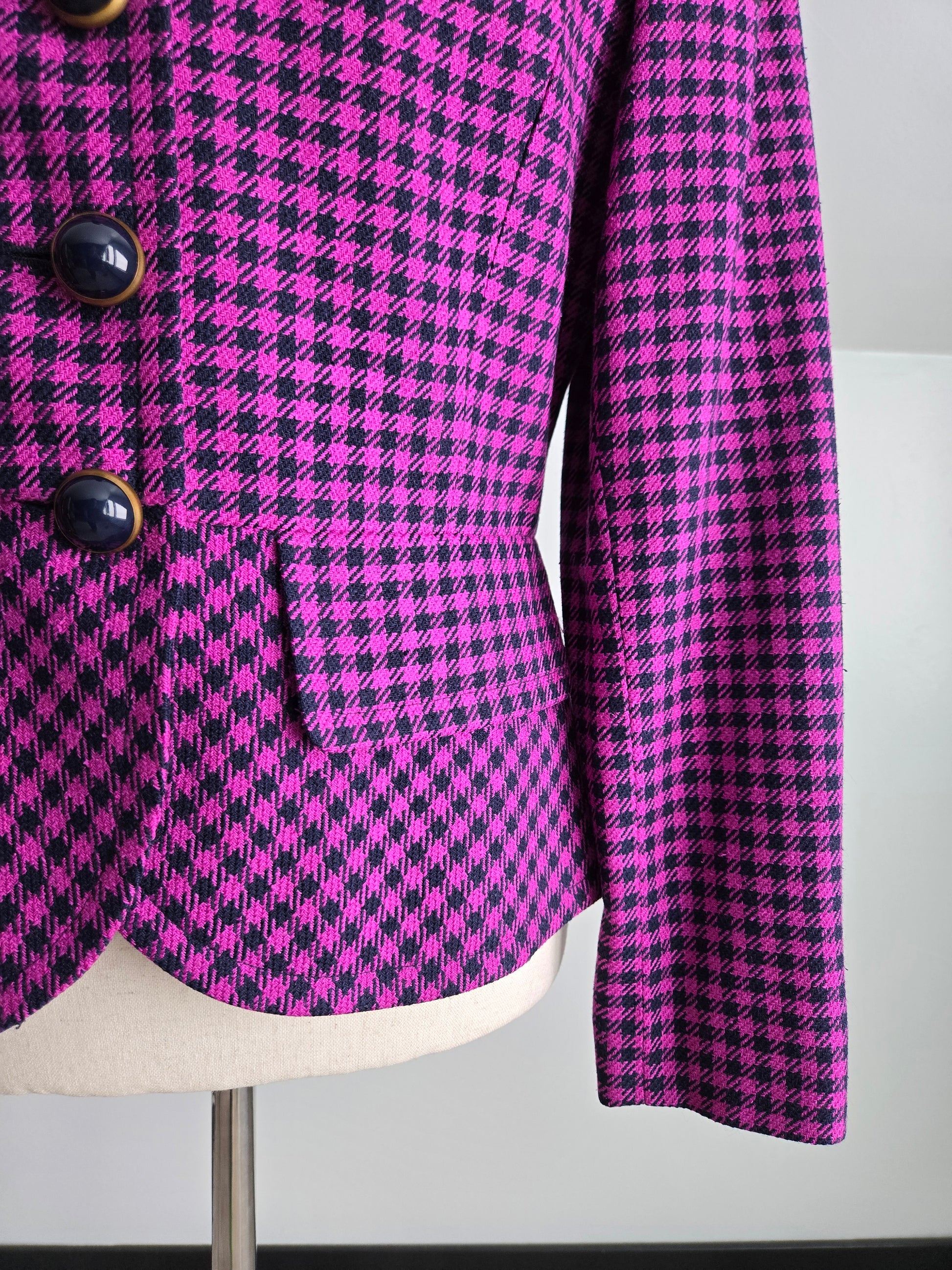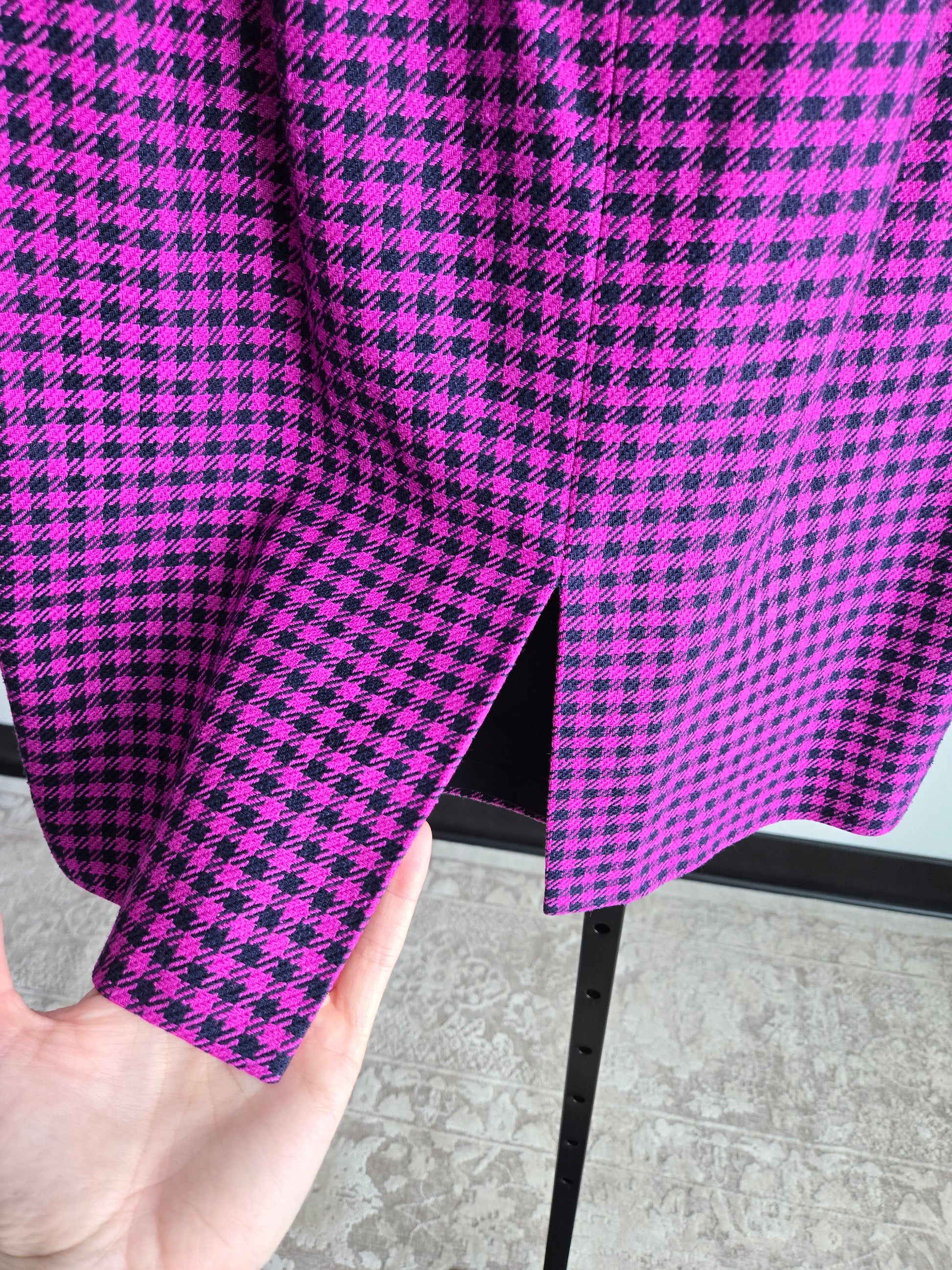 Liz Claiborne vintage 80s silk and wool blend tweed pink and navy plaid two piece set. The blazer has a structured waist line and large navy bubble buttons trimmed in gold. There are small shoulder pads. The skirt has a zipper and button closure and they are both fully lined. Perfect condition. Made in Korea.