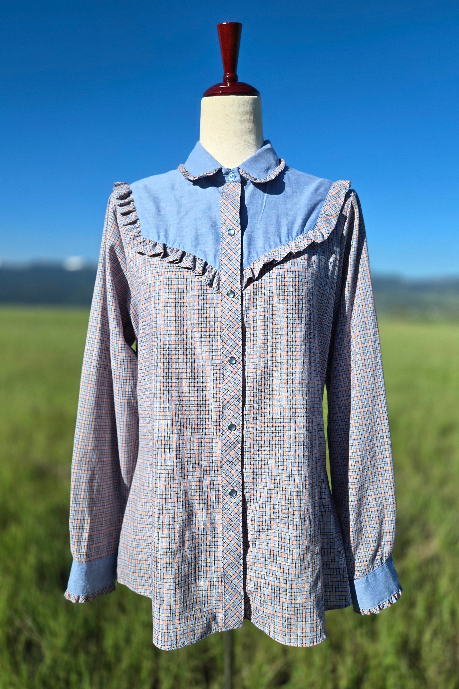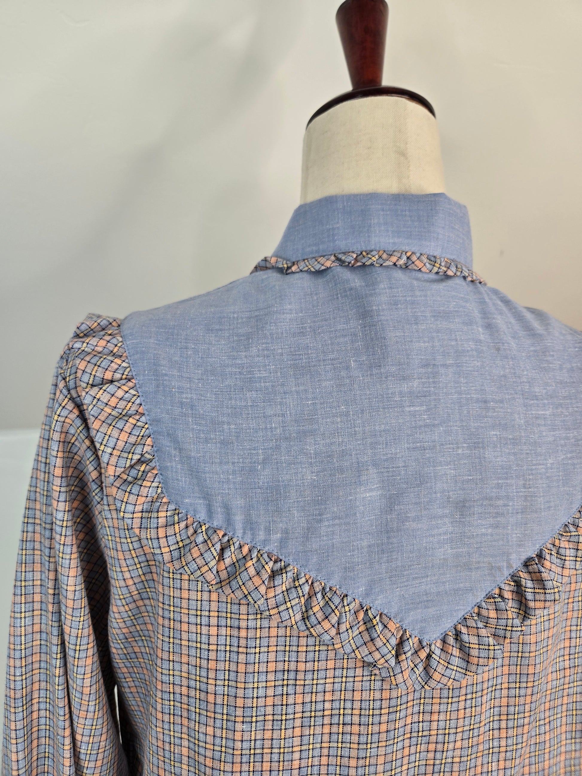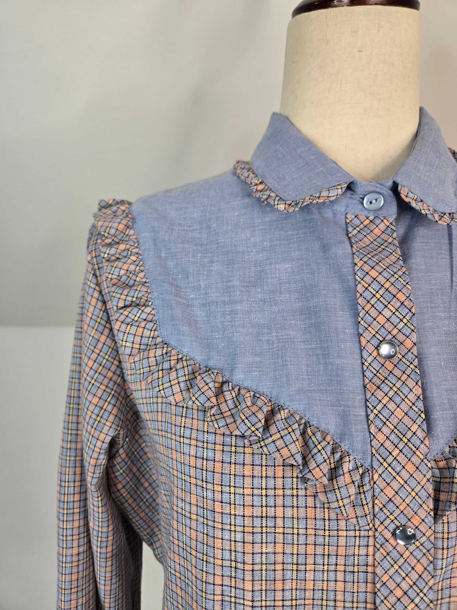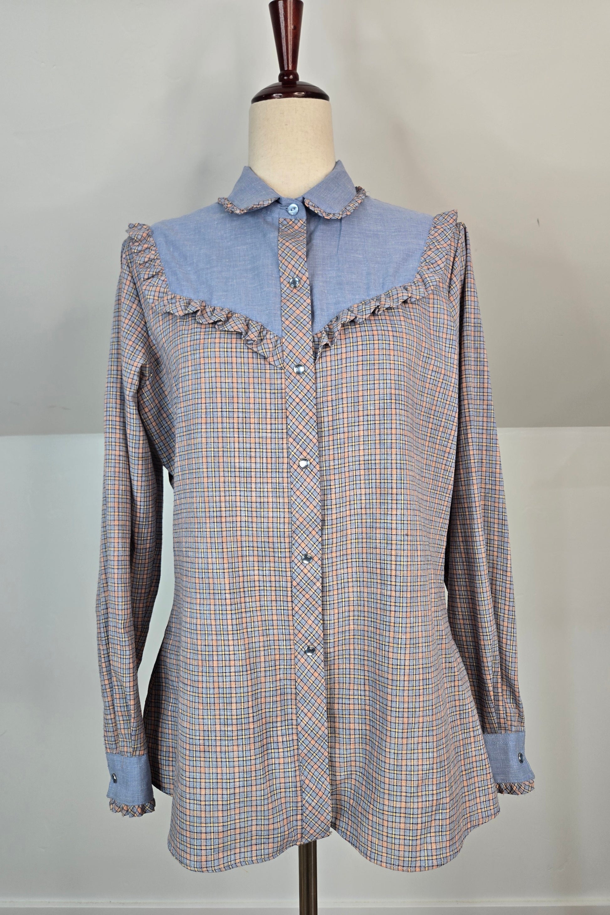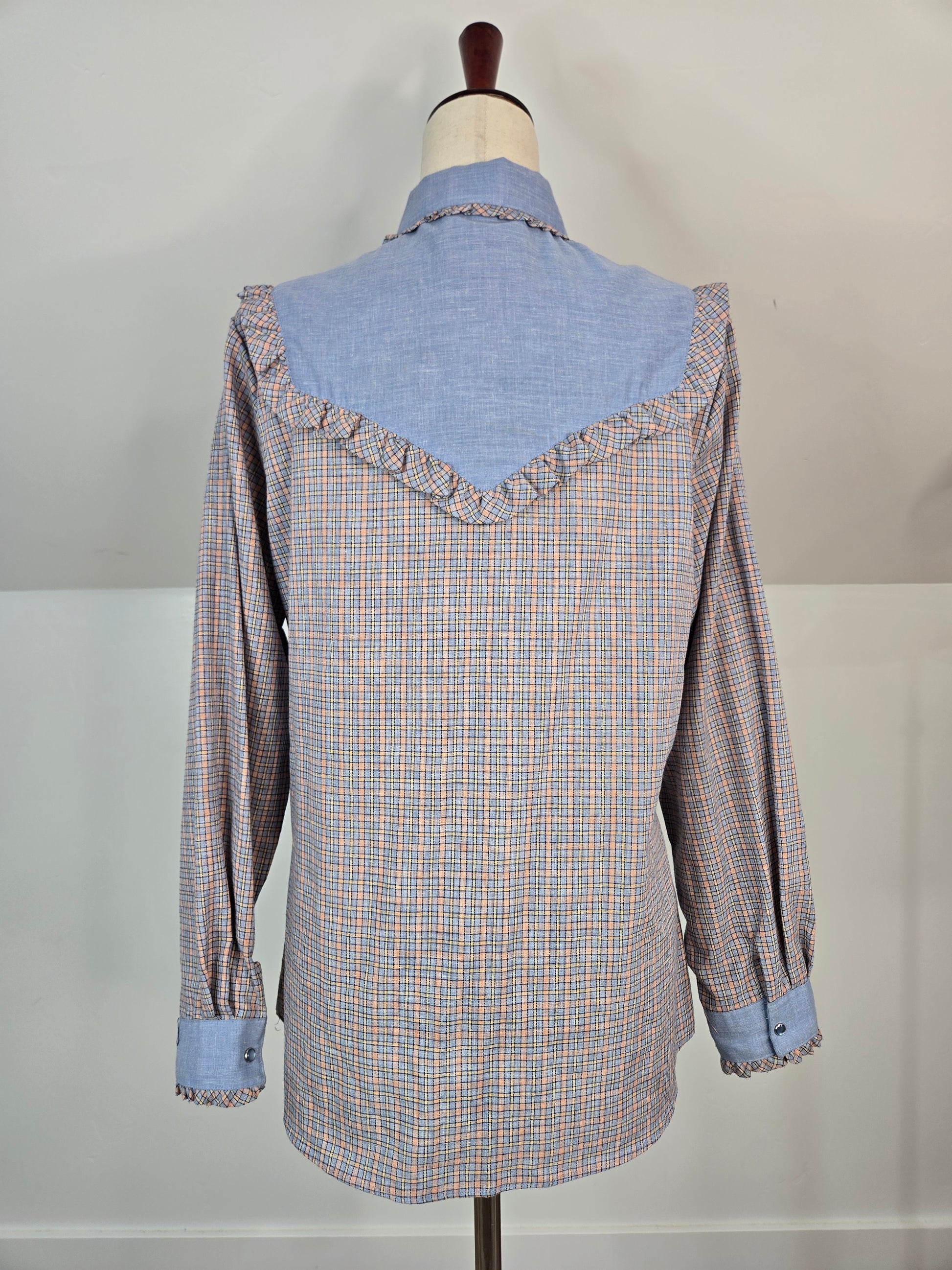 Vintage 70s Millie western cotton blend pearl snap top. It has a cotton chambray yoke and cuff detail and a cotton micro plaid main material. It has blue pearl snaps running down center front and the cutest plaid ruffle detail trimming the yokes, collar, and cuffs. It is the freaking cutest!!! Perfect condition. No pilling or signs of wear, and it has been freshly laundered and is ready to wear!