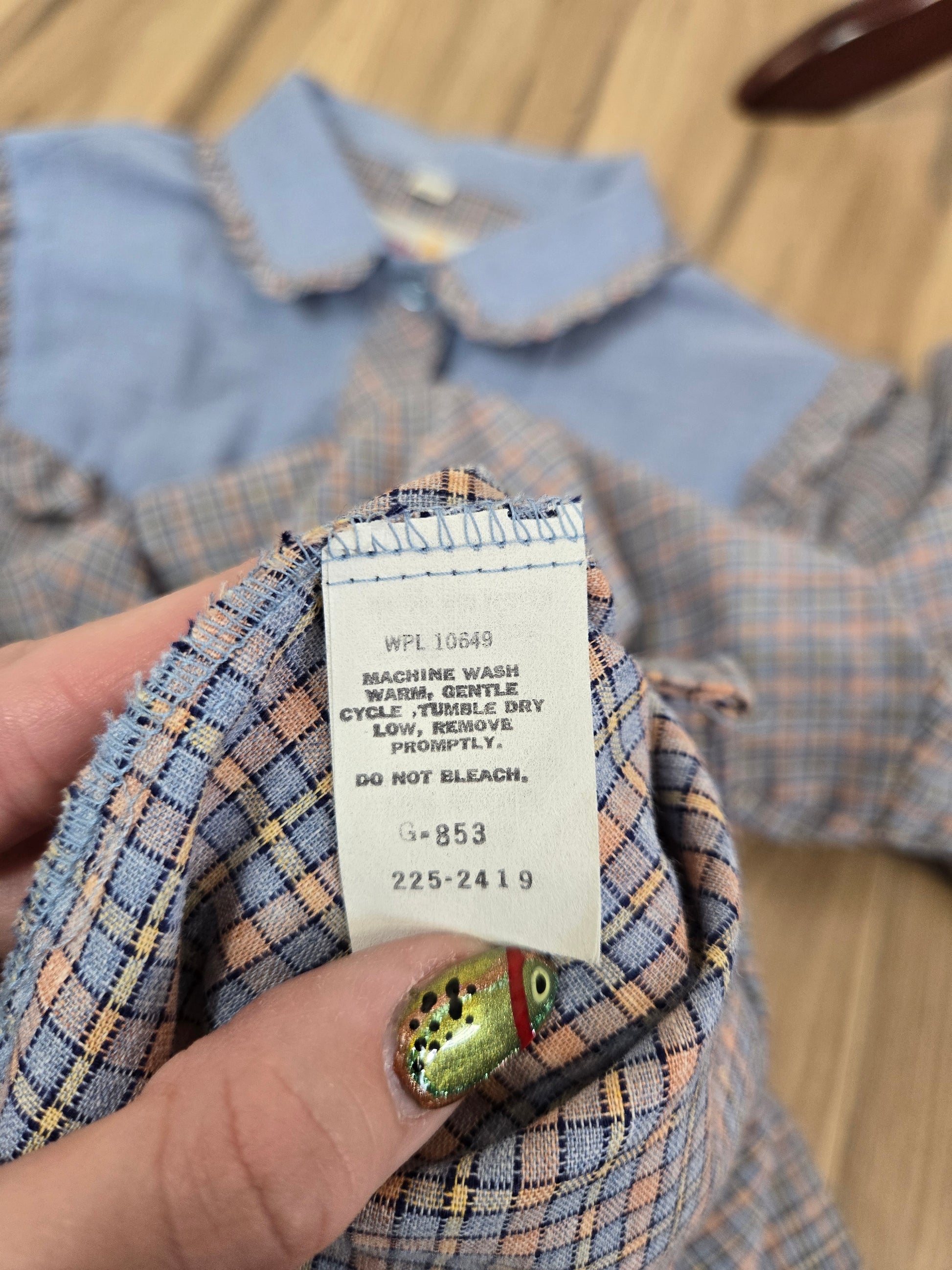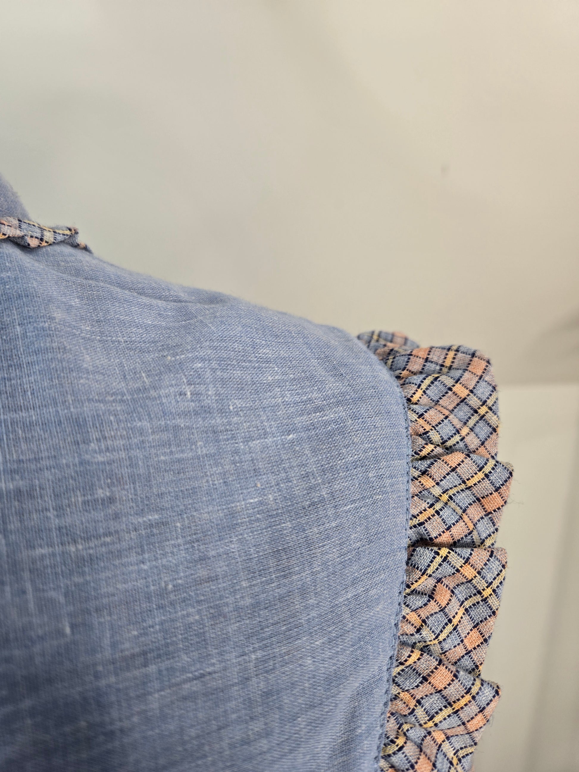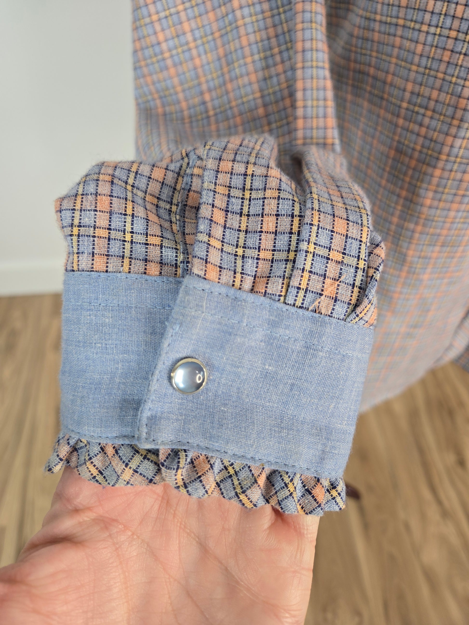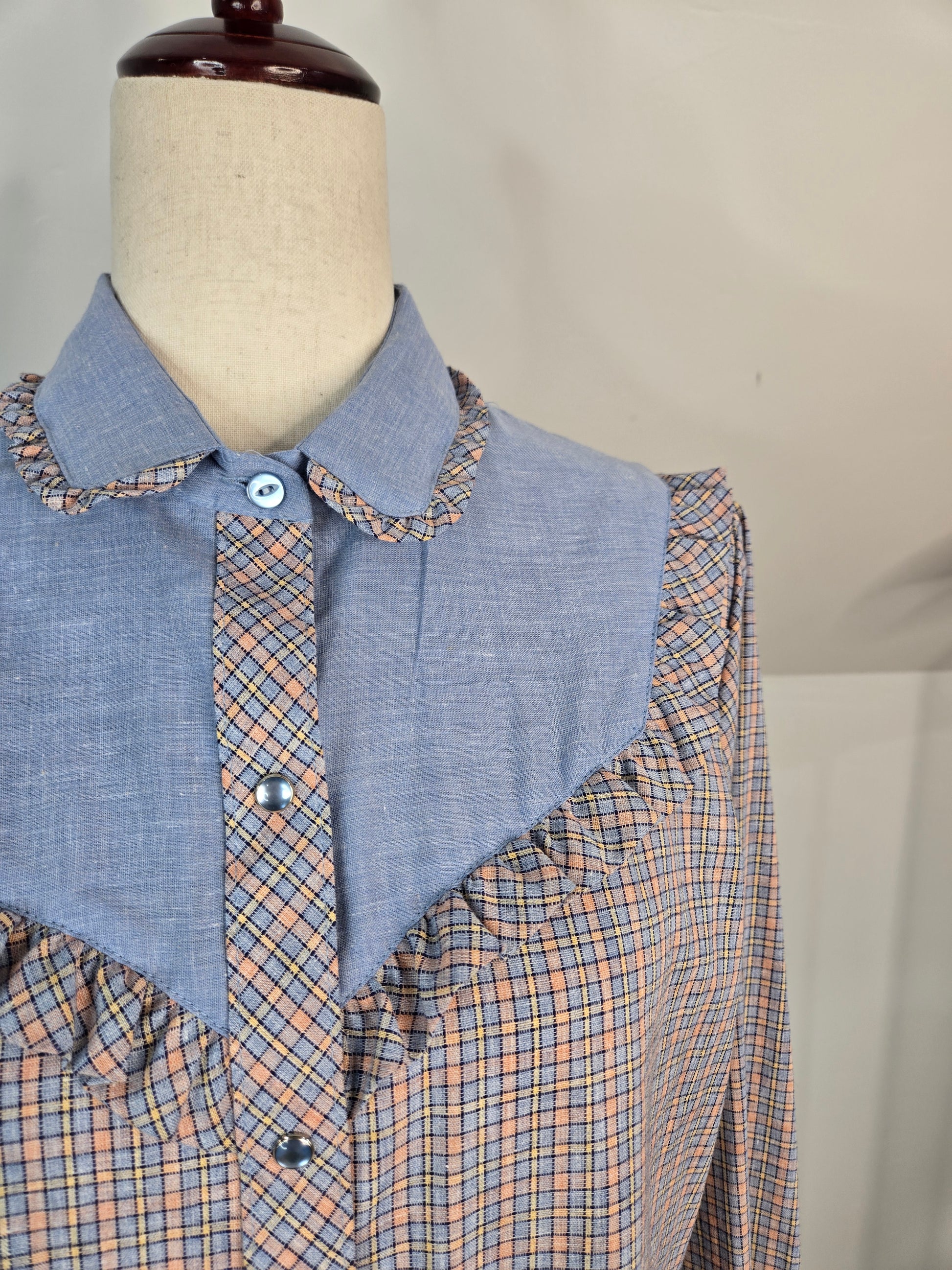 Vintage 70s Millie western cotton blend pearl snap top. It has a cotton chambray yoke and cuff detail and a cotton micro plaid main material. It has blue pearl snaps running down center front and the cutest plaid ruffle detail trimming the yokes, collar, and cuffs. It is the freaking cutest!!! Perfect condition. No pilling or signs of wear, and it has been freshly laundered and is ready to wear!