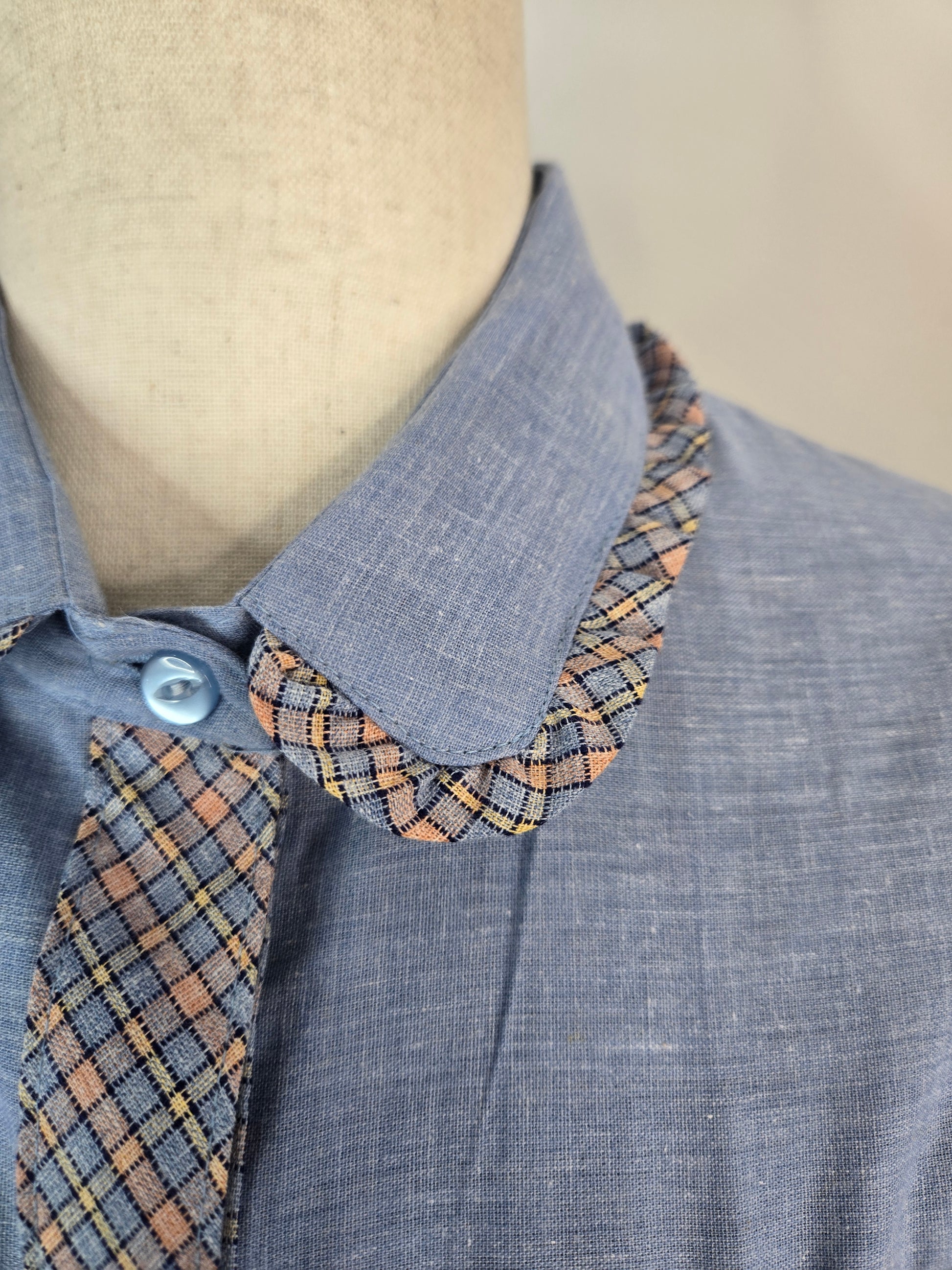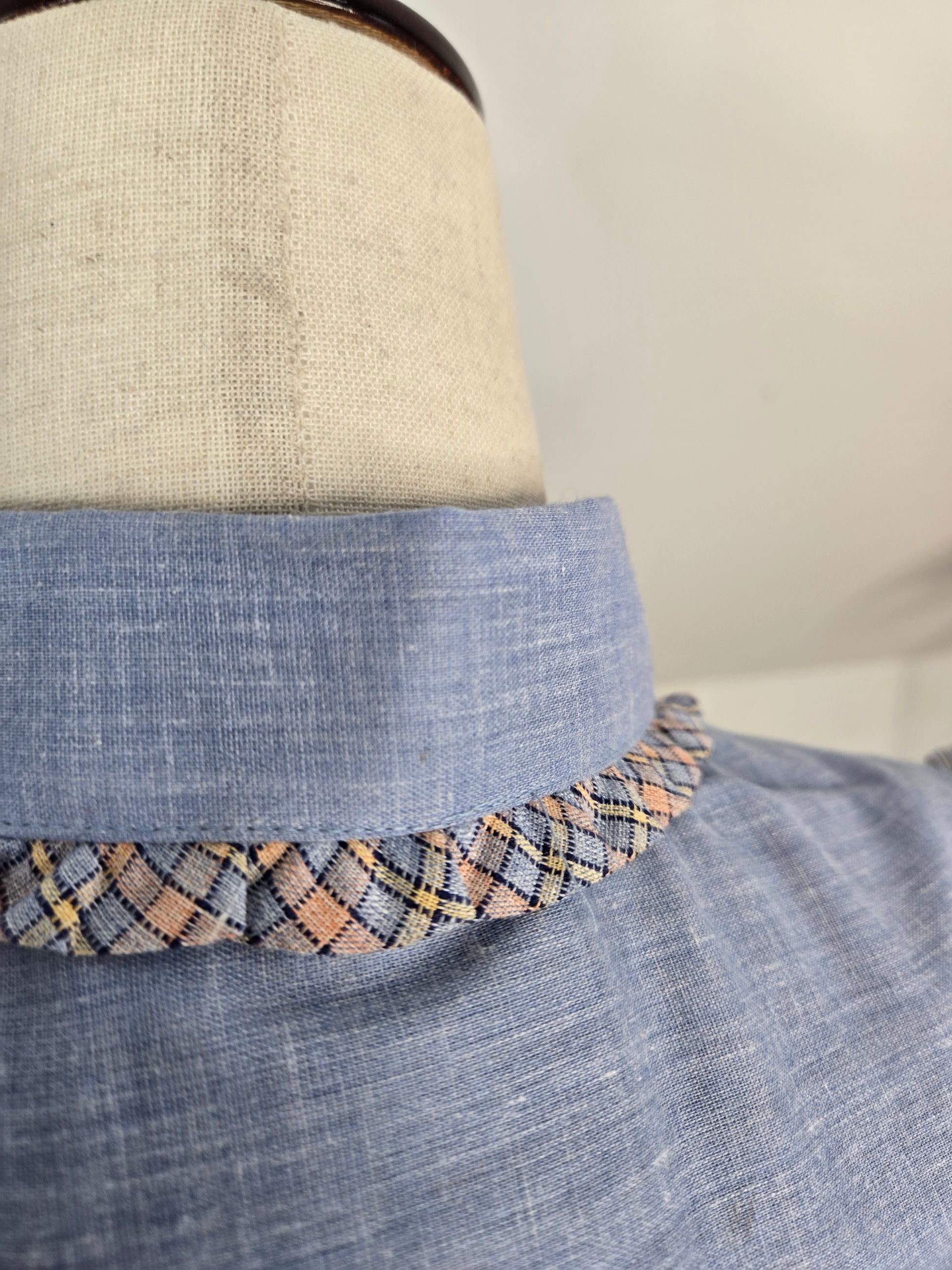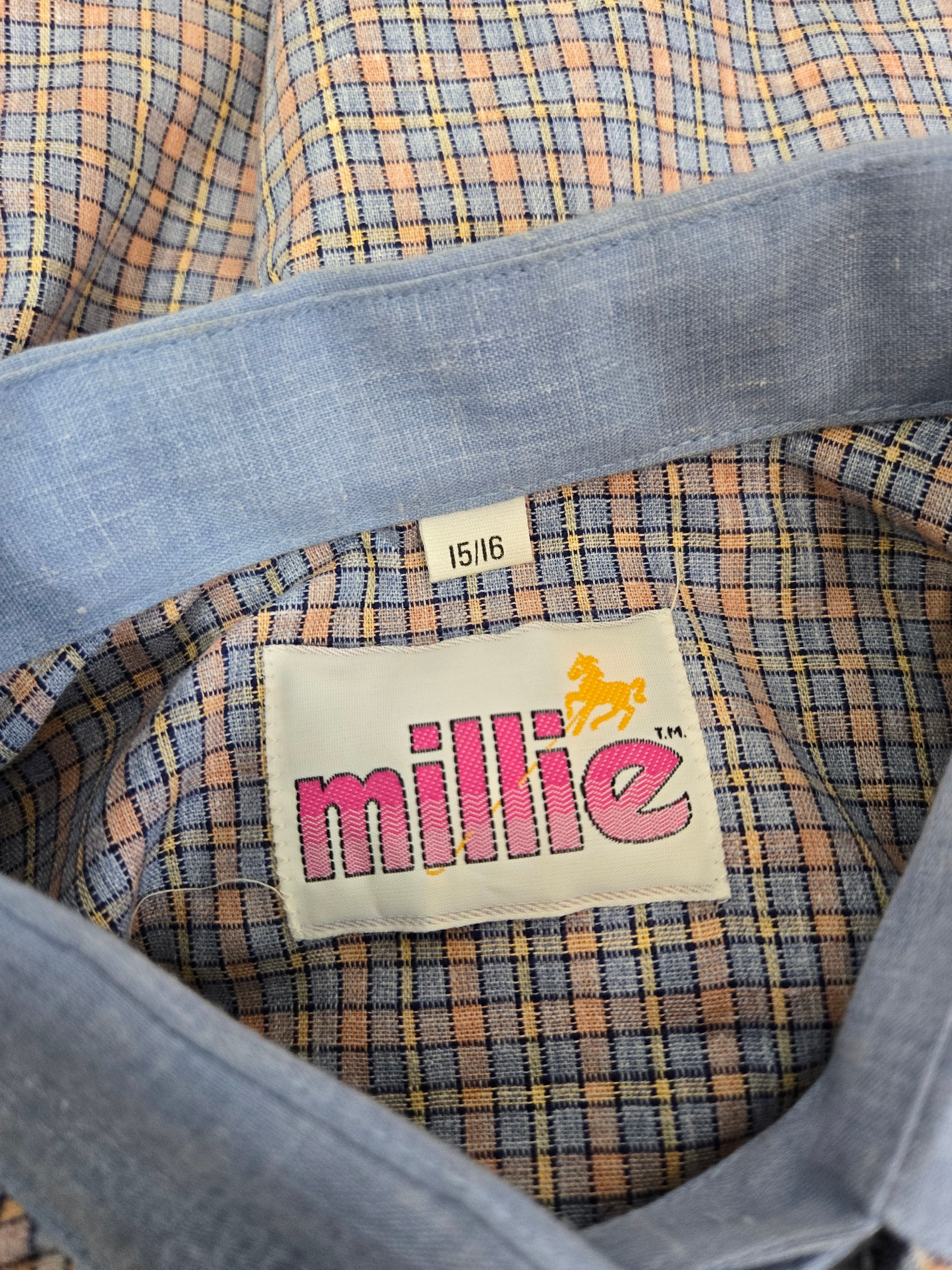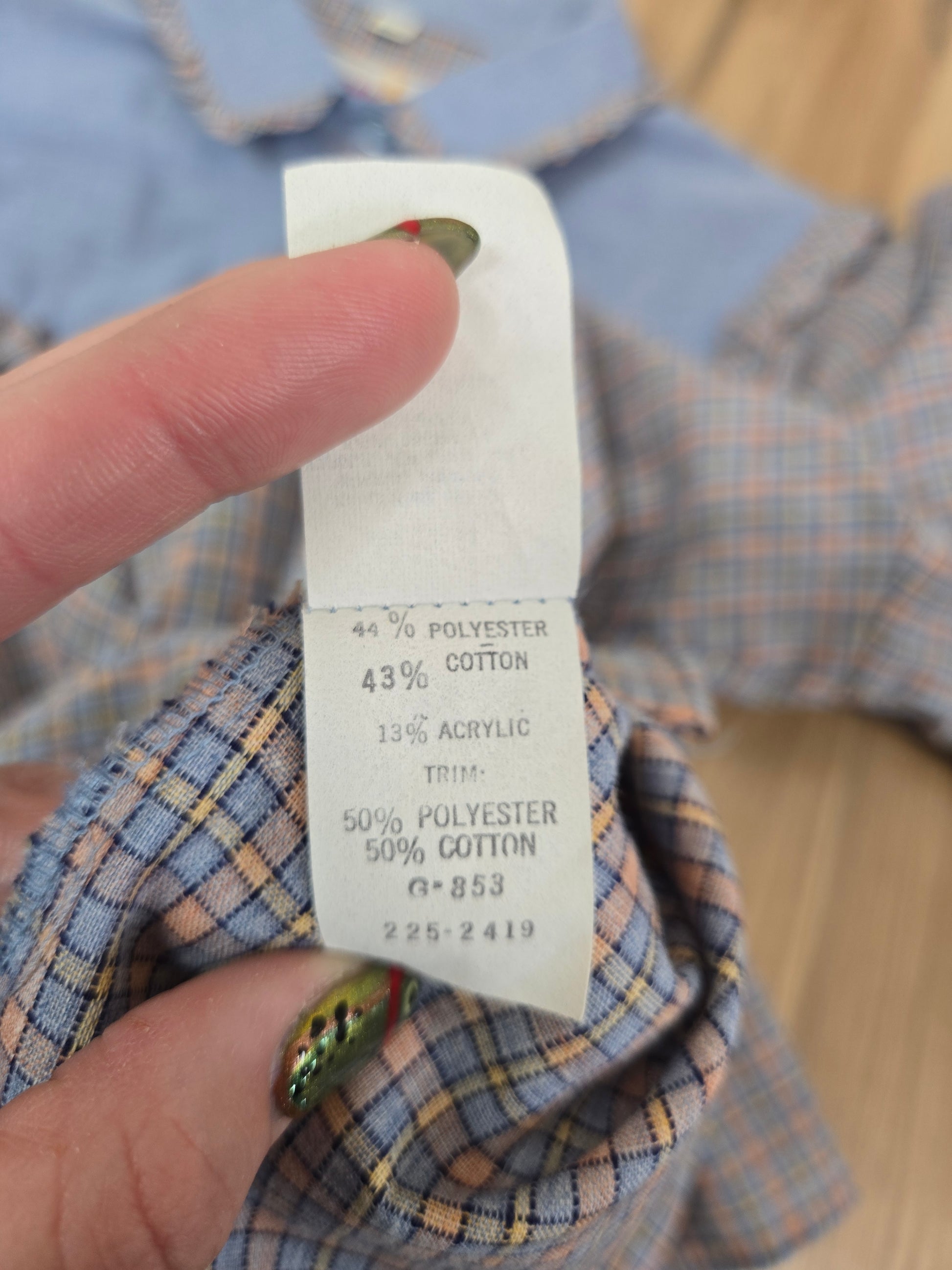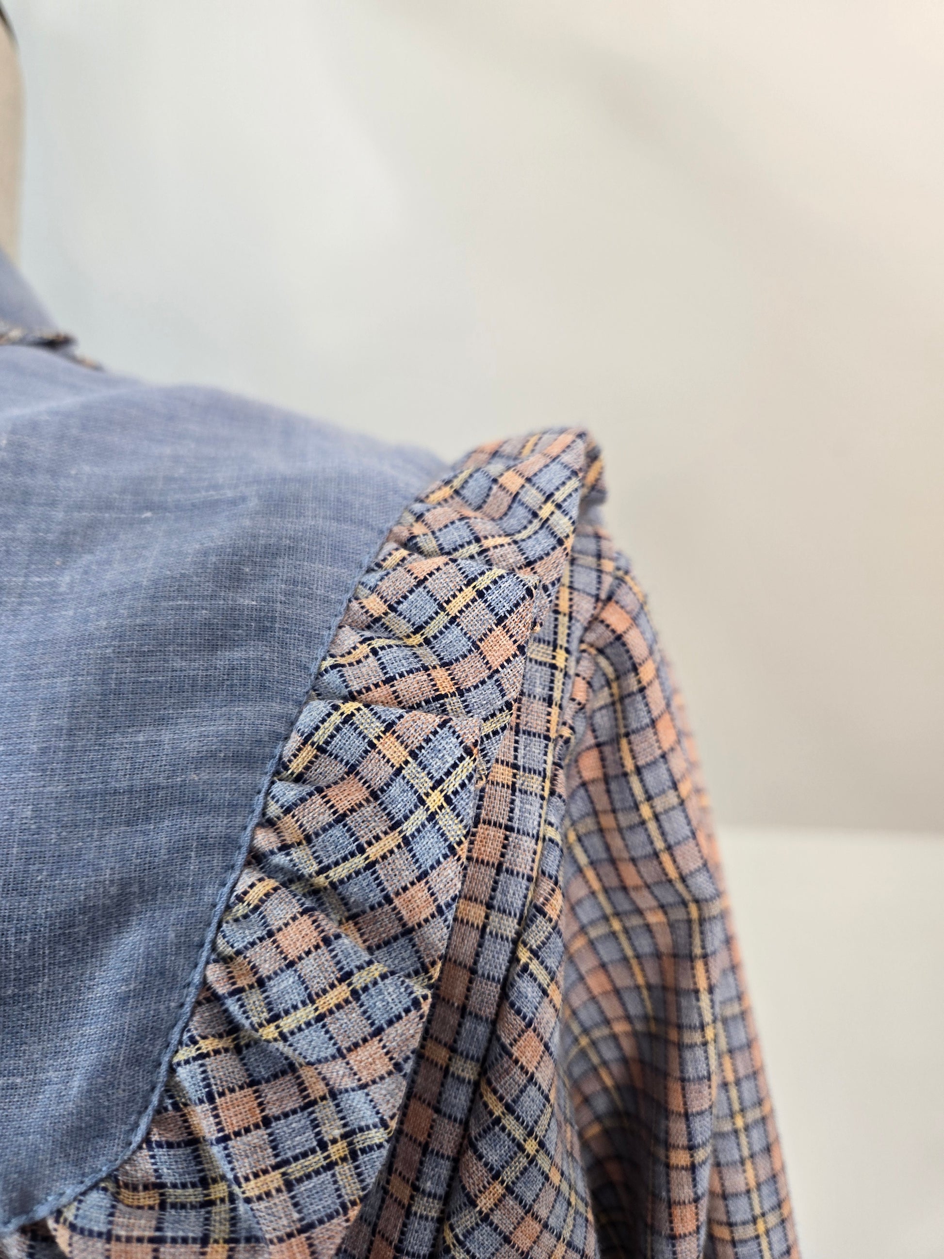 Vintage 70s Millie western cotton blend pearl snap top. It has a cotton chambray yoke and cuff detail and a cotton micro plaid main material. It has blue pearl snaps running down center front and the cutest plaid ruffle detail trimming the yokes, collar, and cuffs. It is the freaking cutest!!! Perfect condition. No pilling or signs of wear, and it has been freshly laundered and is ready to wear!