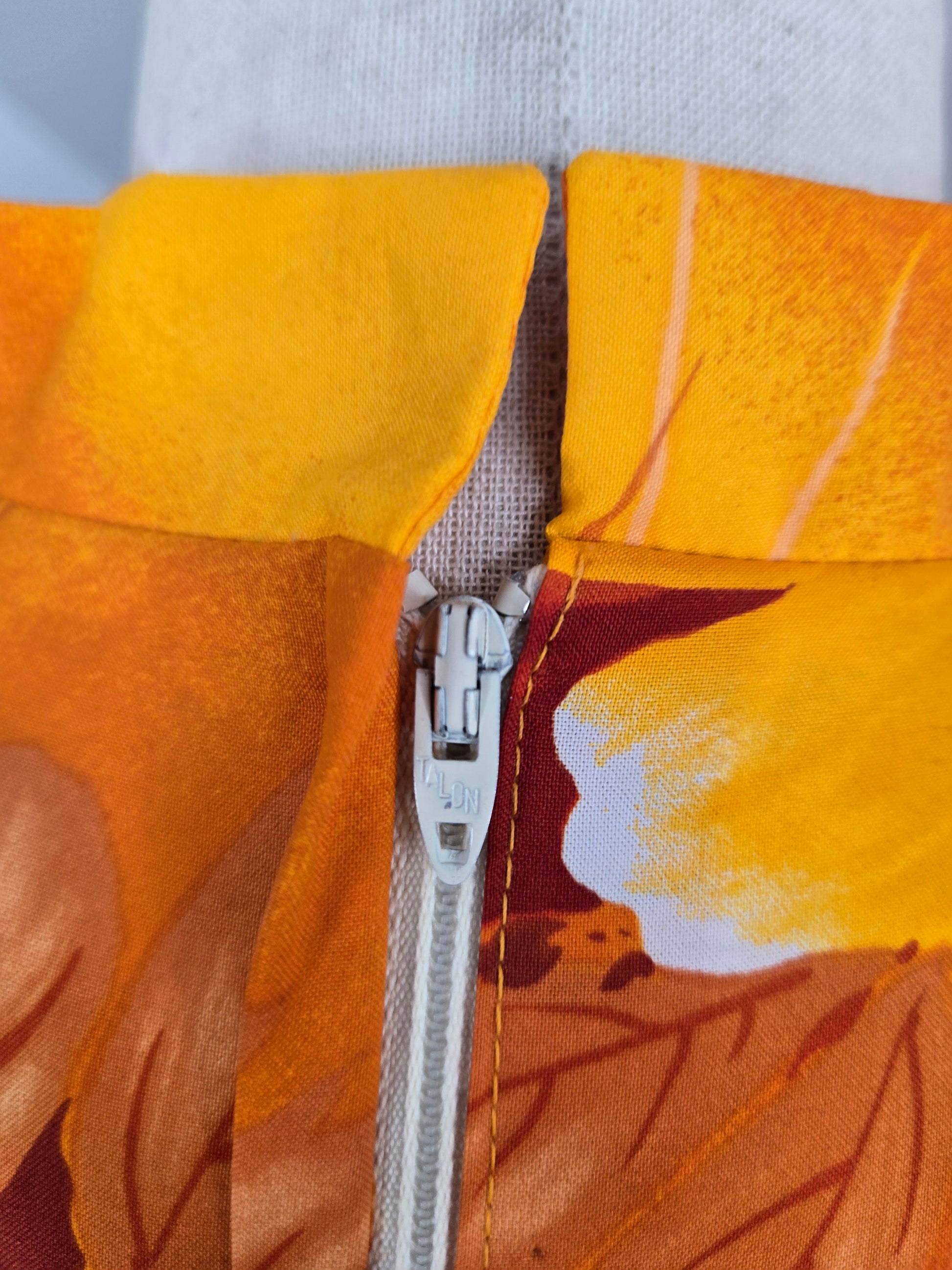 Moko Hawaii super bright orange floral dress with front bib detail and wood buttons at center front. It has a a Talon zipper in the back for its closure and is in amazing condition.