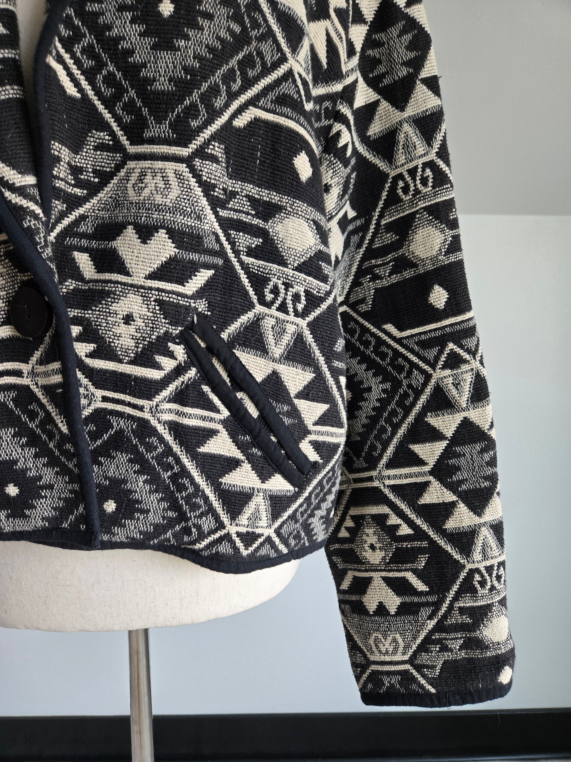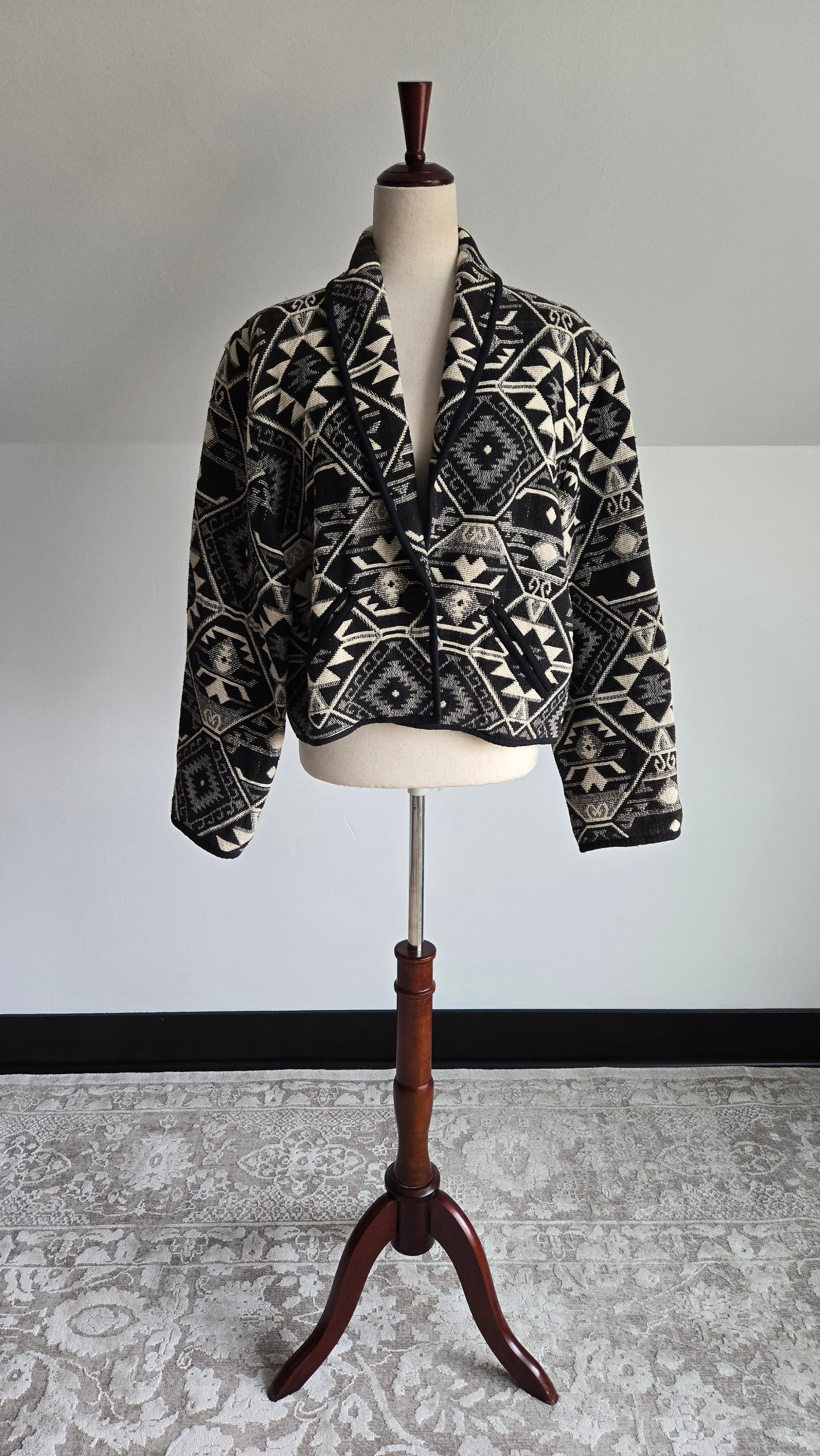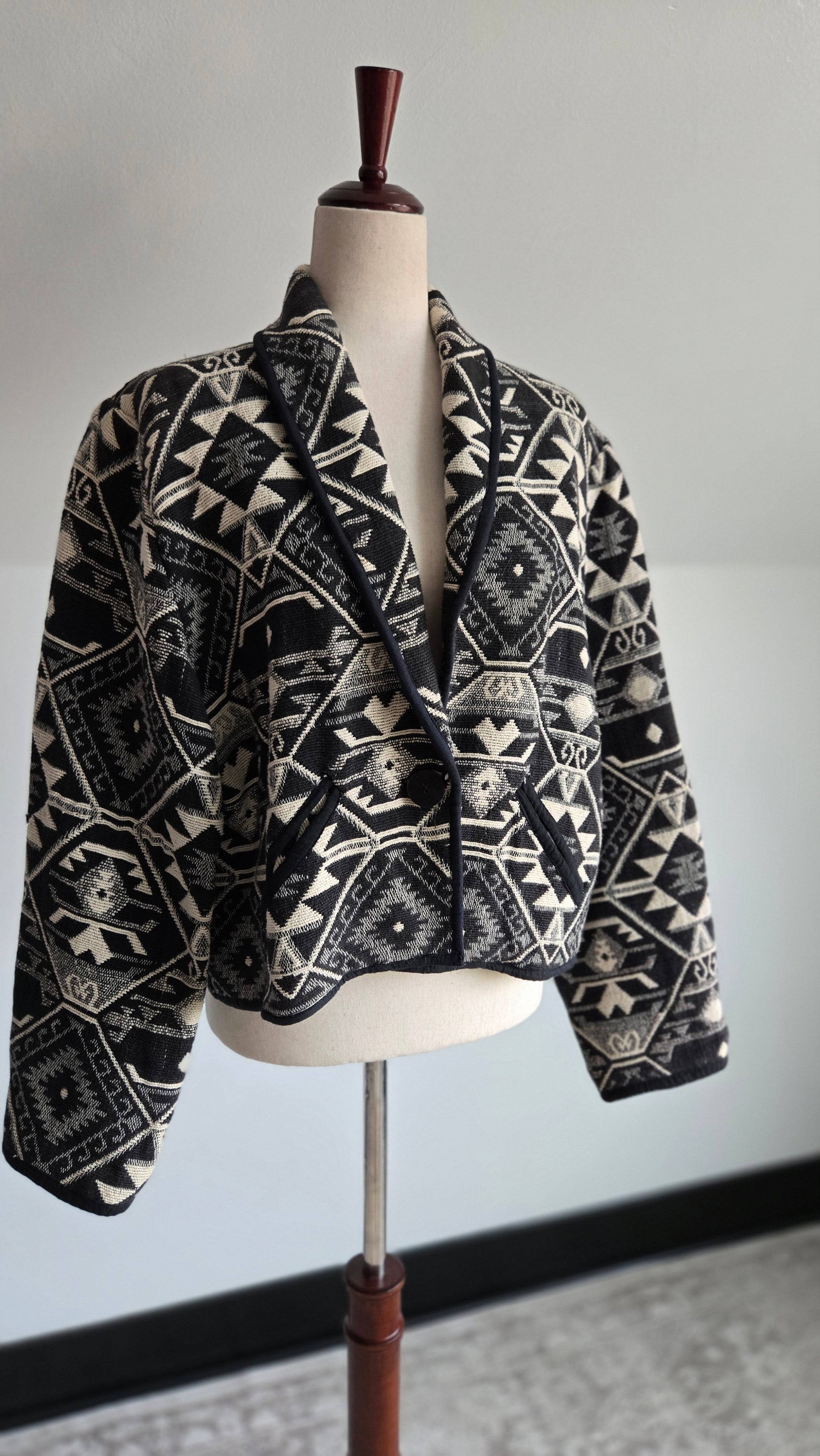 Vintage New Identity black and white western tapestry cropped jacket. It has a single button closure at the front and is a soft cotton that is broken in and comfortable. It is in amazing condition with no imperfections to call out. Made in India.