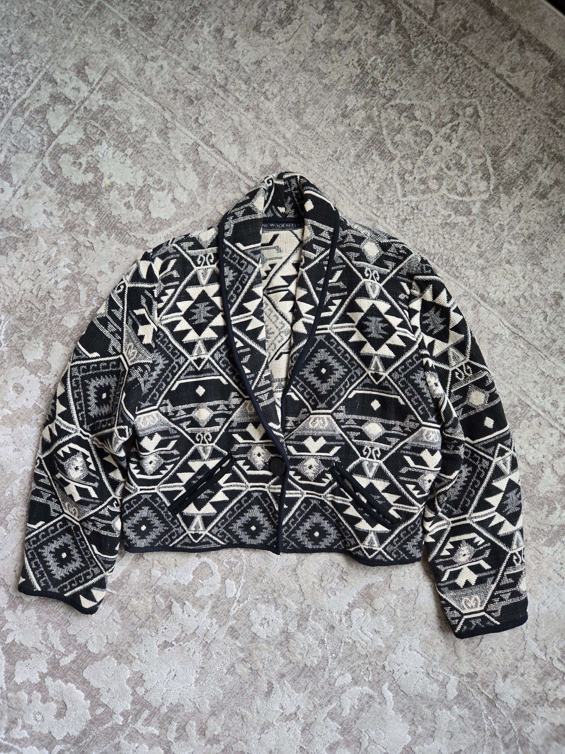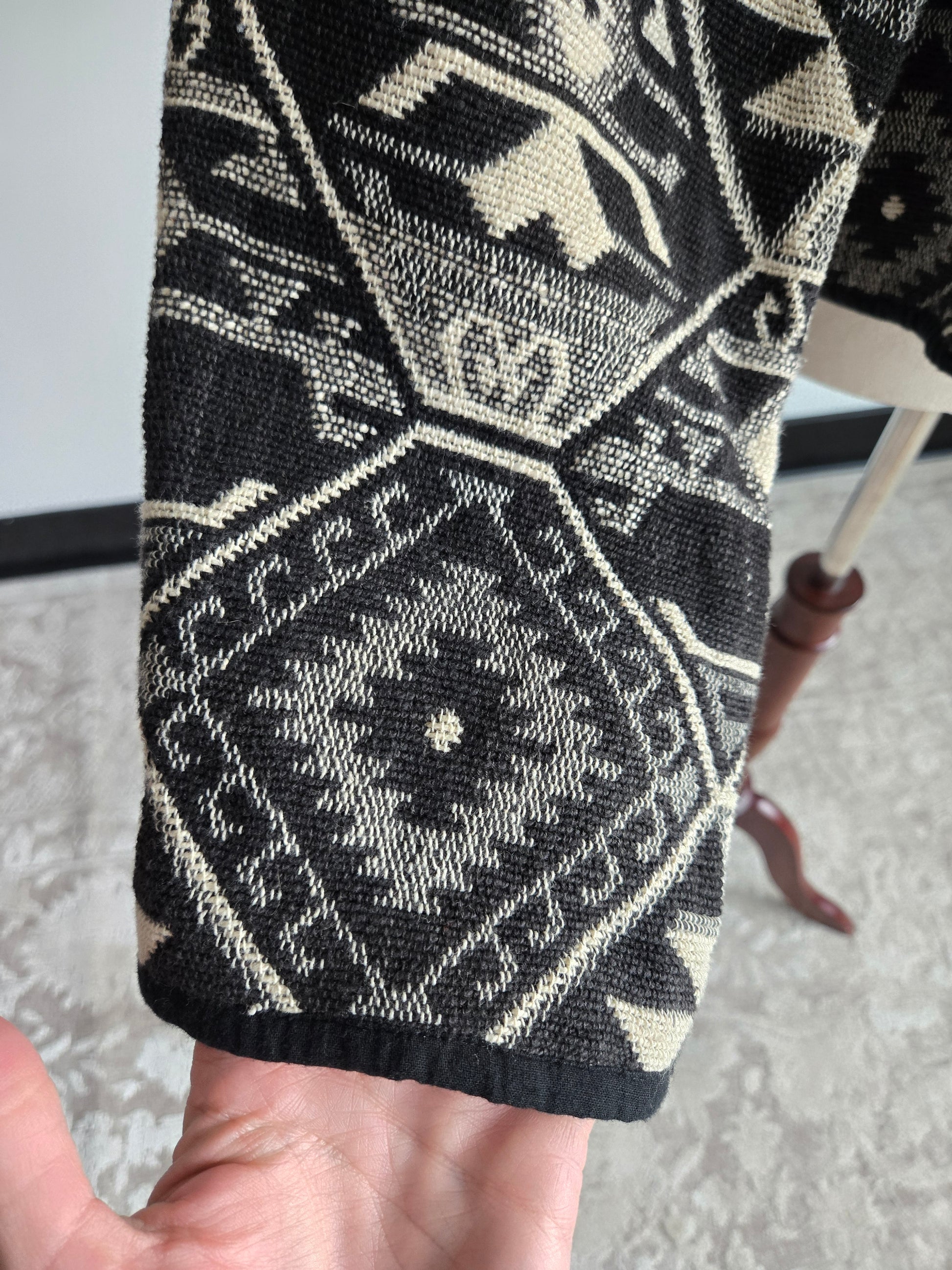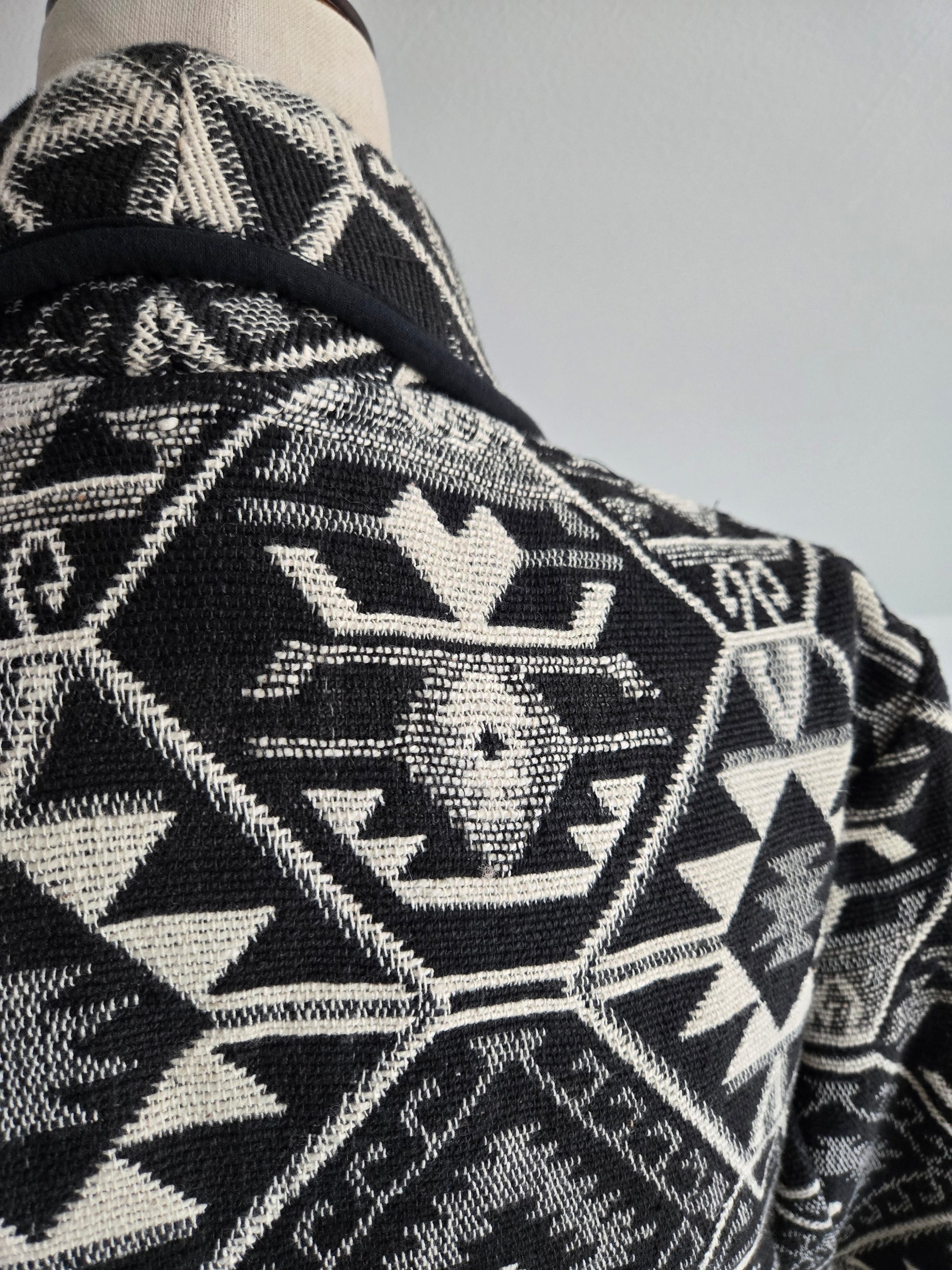 Vintage New Identity black and white western tapestry cropped jacket. It has a single button closure at the front and is a soft cotton that is broken in and comfortable. It is in amazing condition with no imperfections to call out. Made in India.