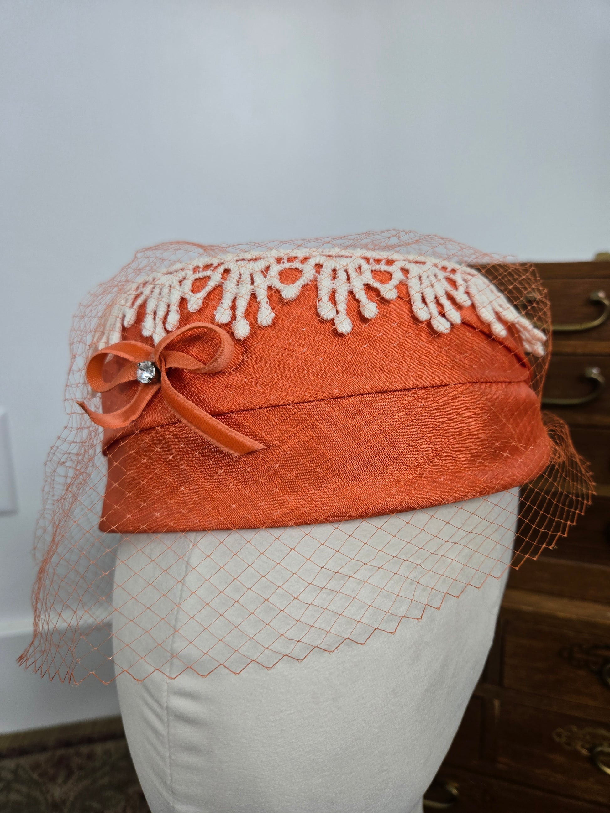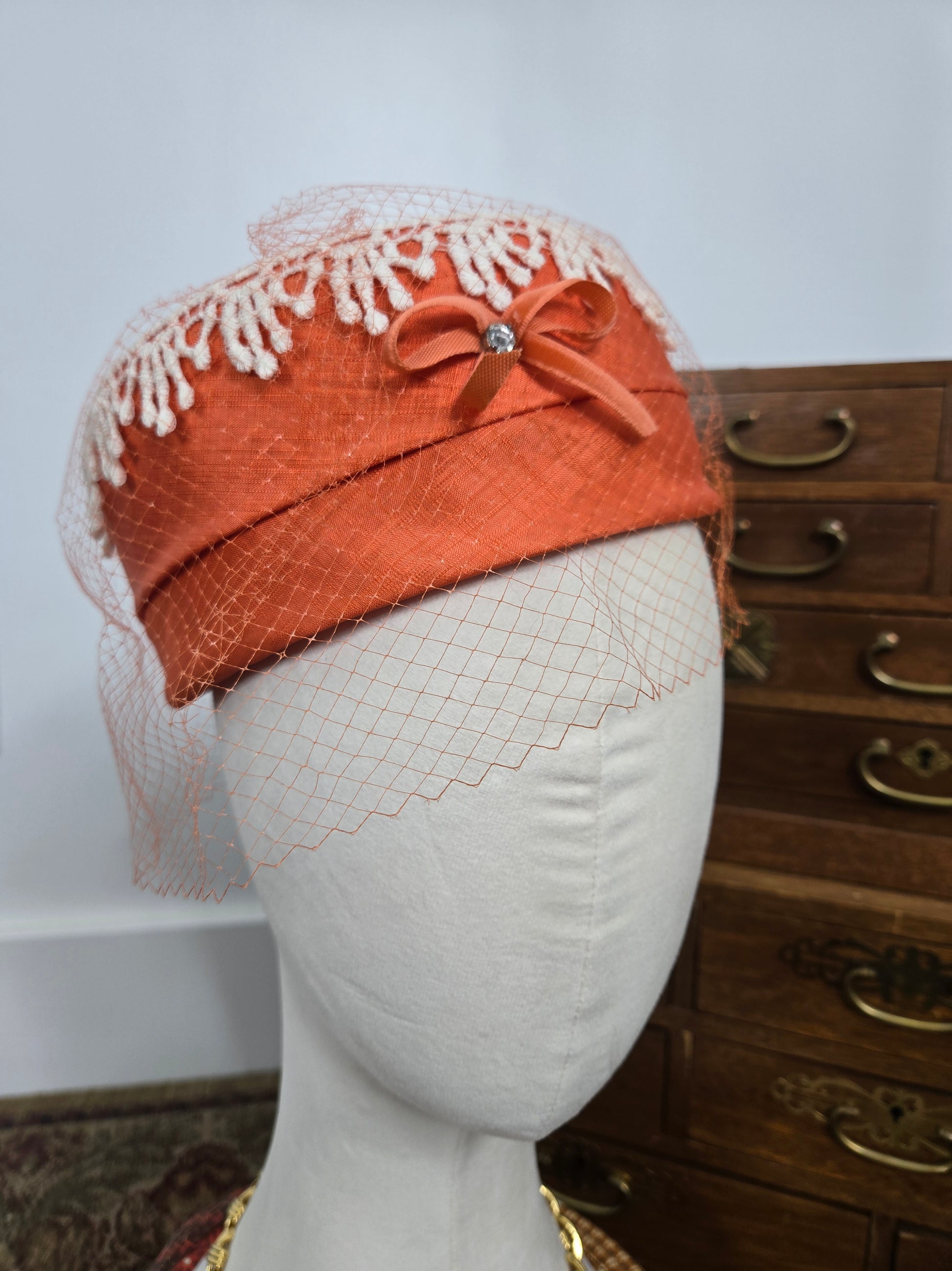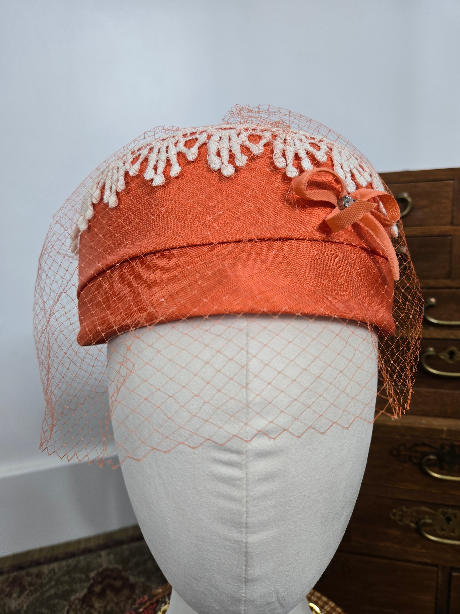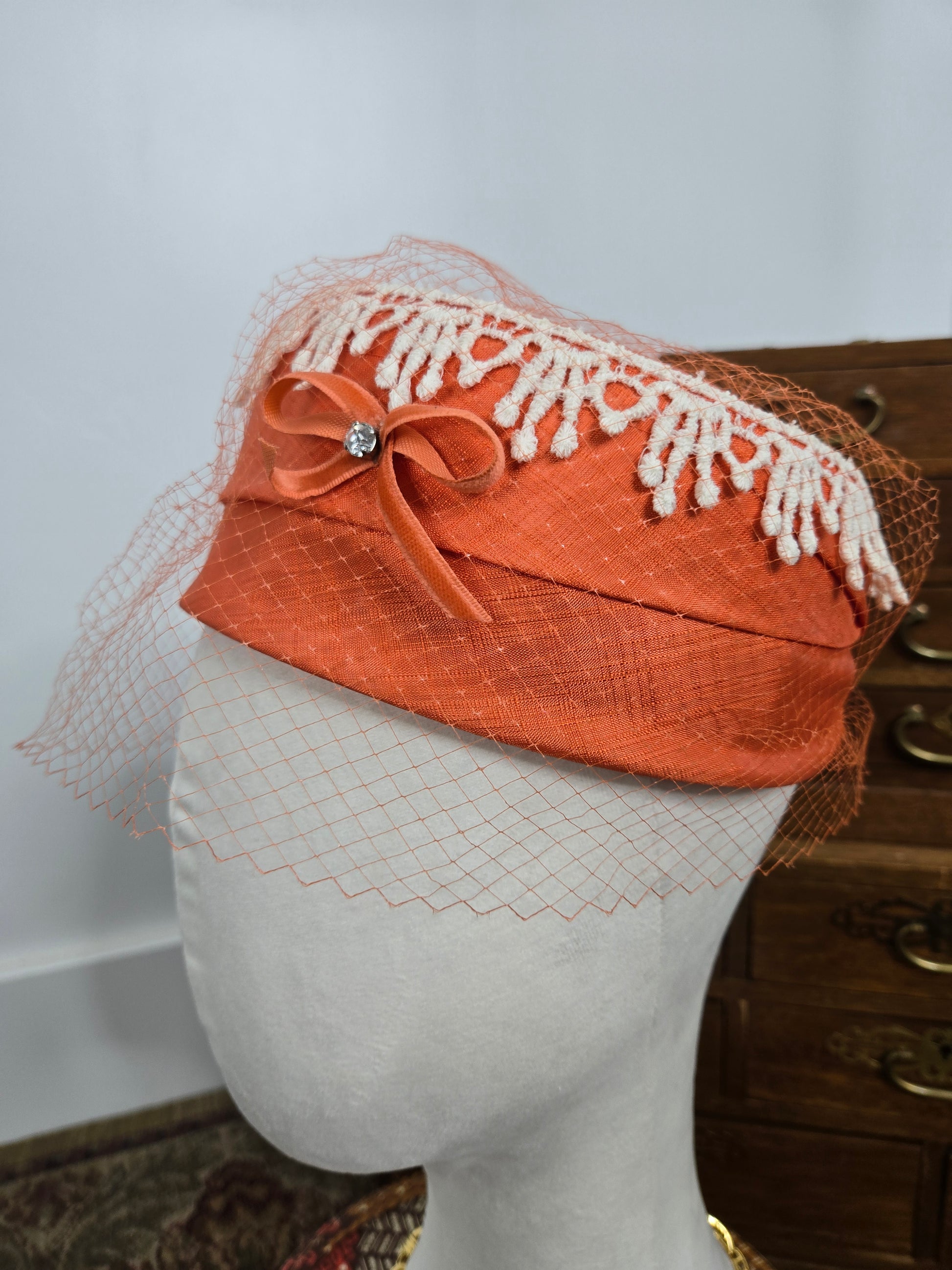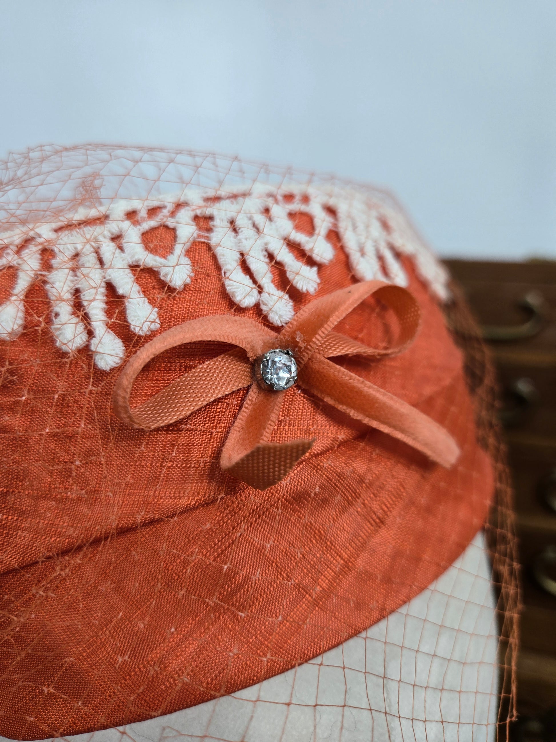 Vintage 1950s peachy orange pillbox hat with small lace detail around the top, a bow and rhinestone detail at the front, and mesh throughout. The mesh is in perfect condition with no holes or snags. It has a great structure and has perfect shape because it has been stored in it's original box. No tags on the inside, possibly custom made.