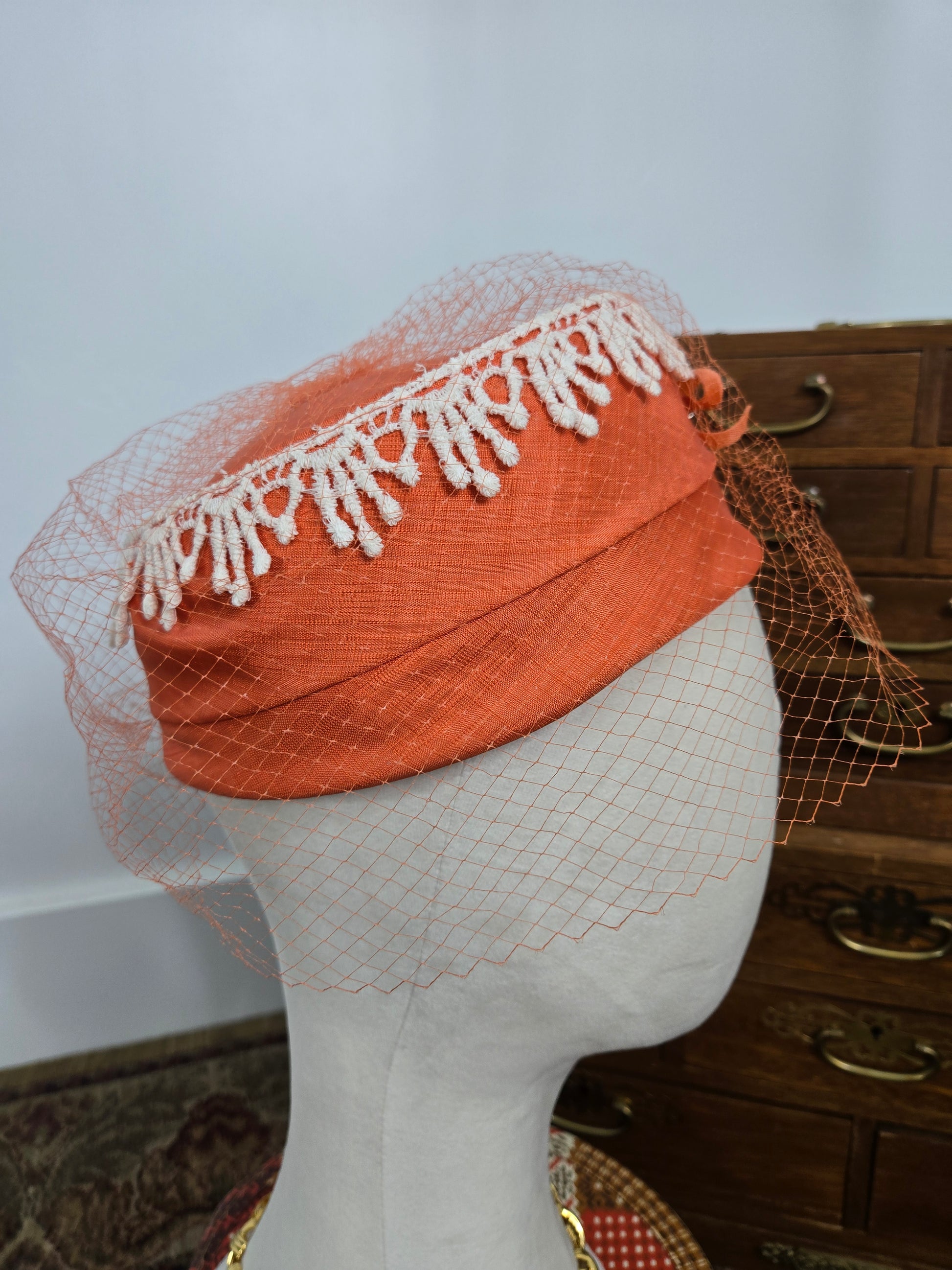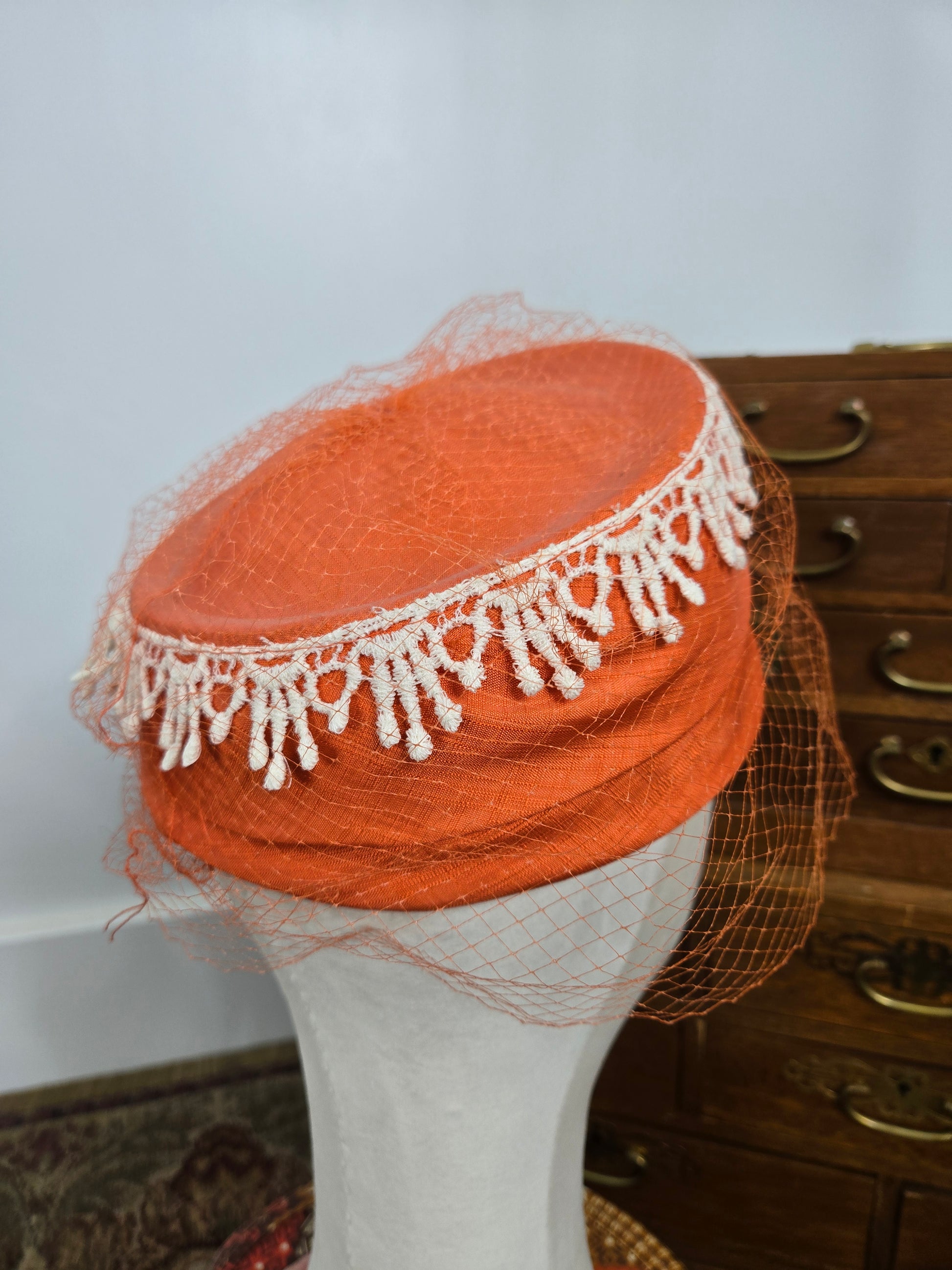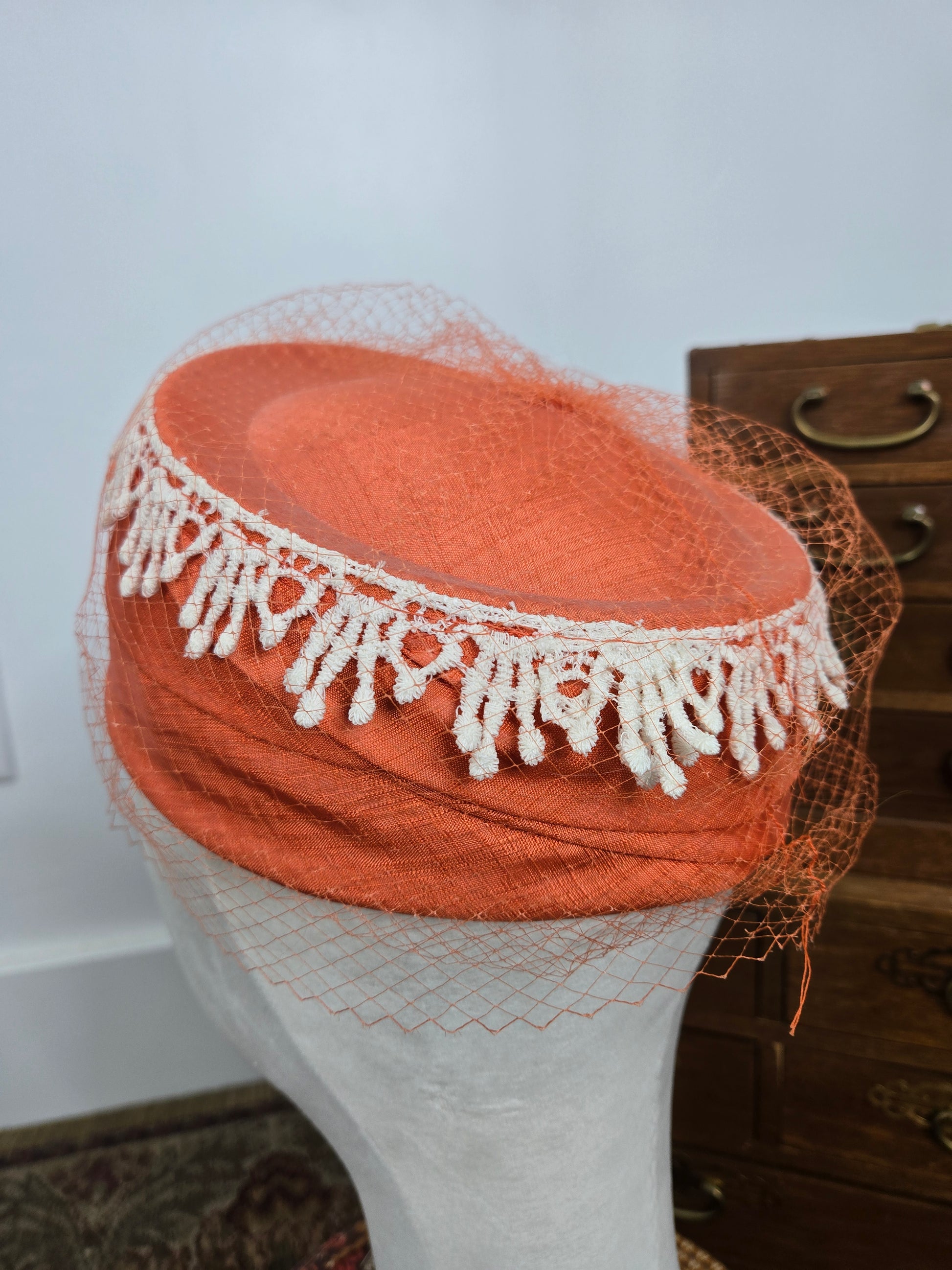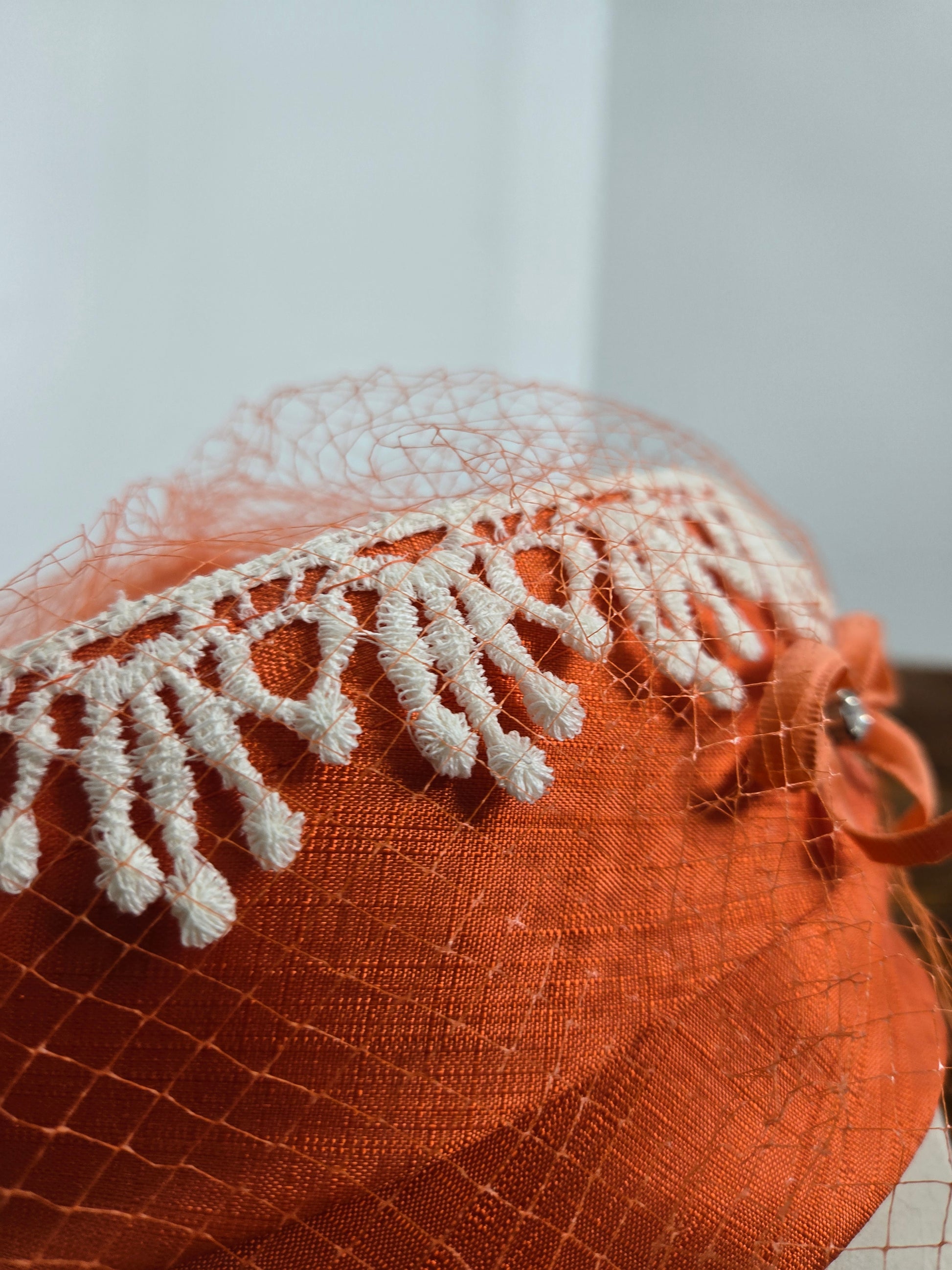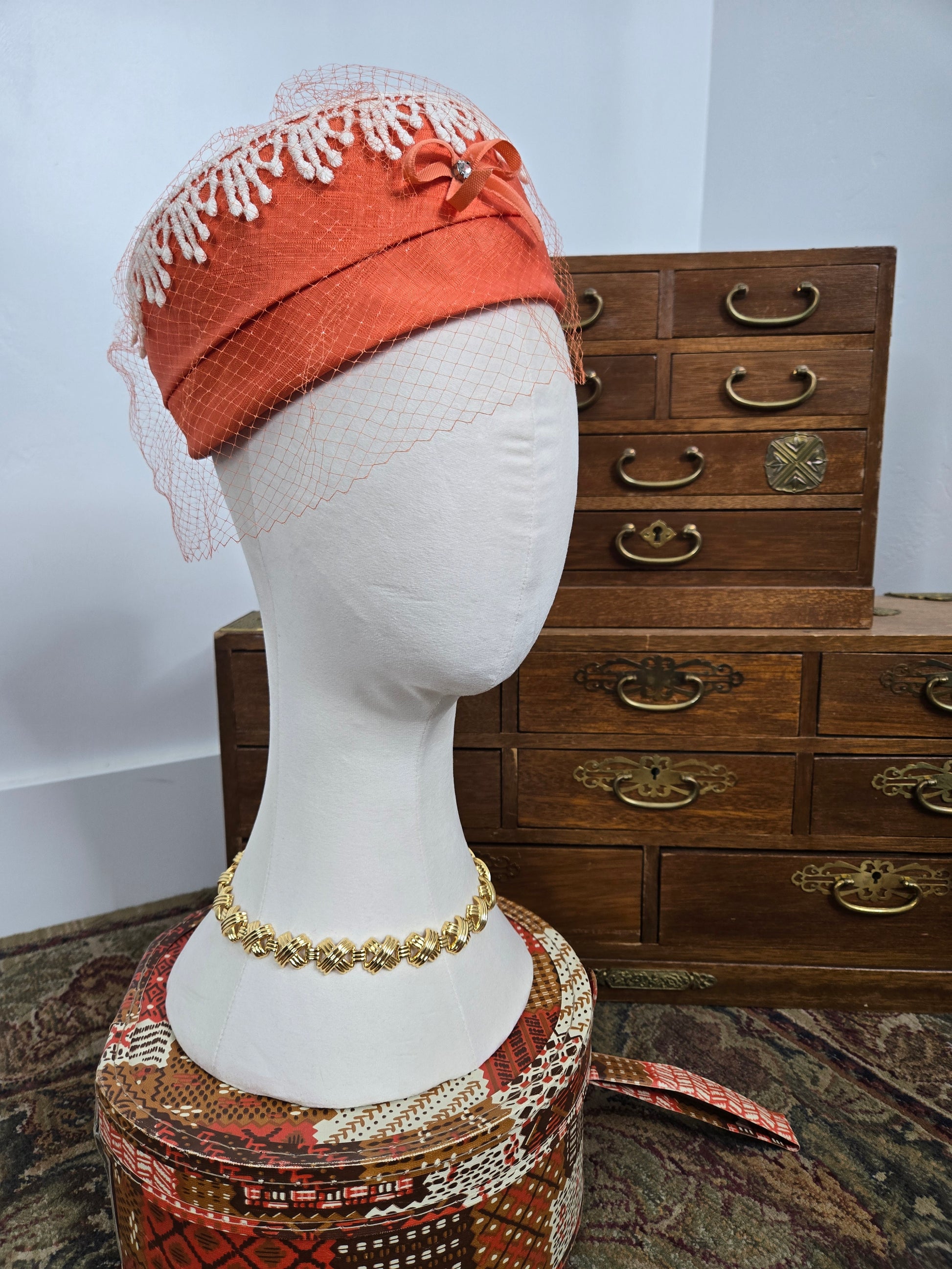 Vintage 1950s peachy orange pillbox hat with small lace detail around the top, a bow and rhinestone detail at the front, and mesh throughout. The mesh is in perfect condition with no holes or snags. It has a great structure and has perfect shape because it has been stored in it's original box. No tags on the inside, possibly custom made.