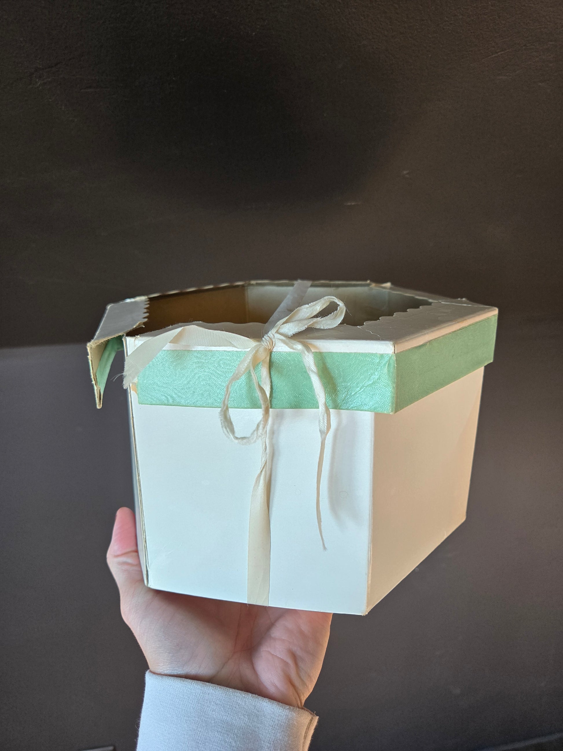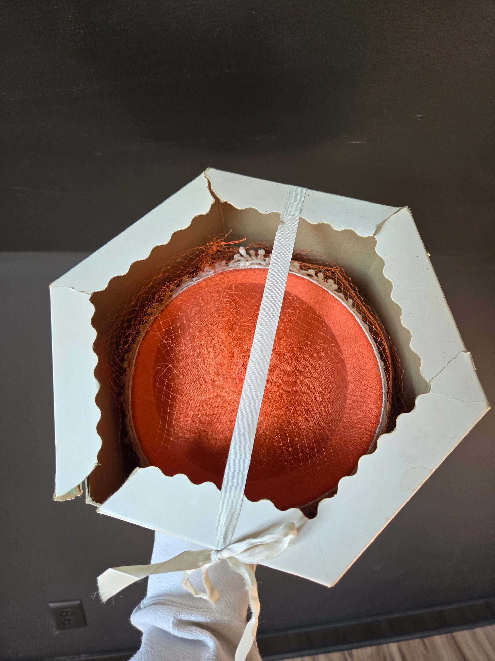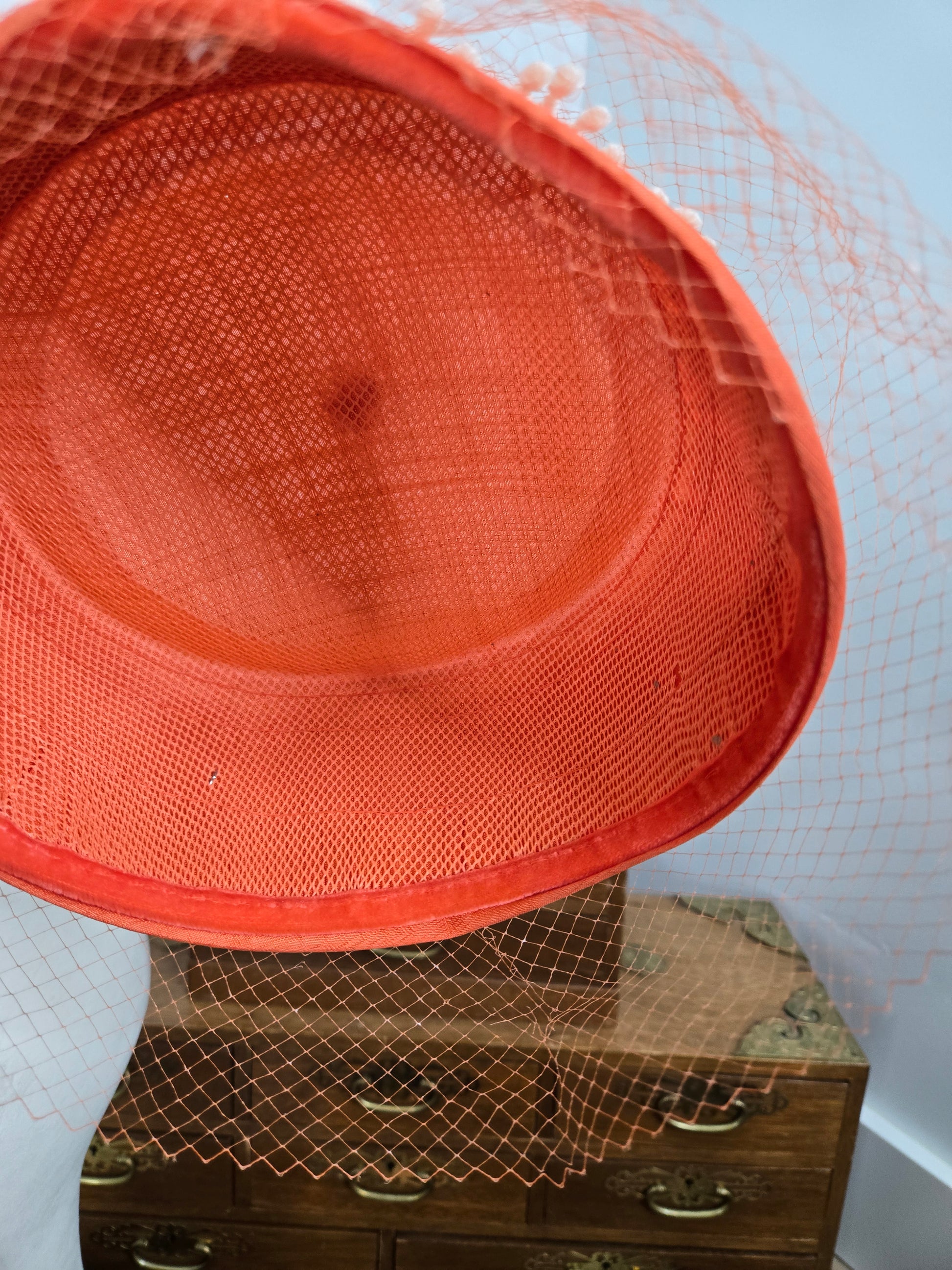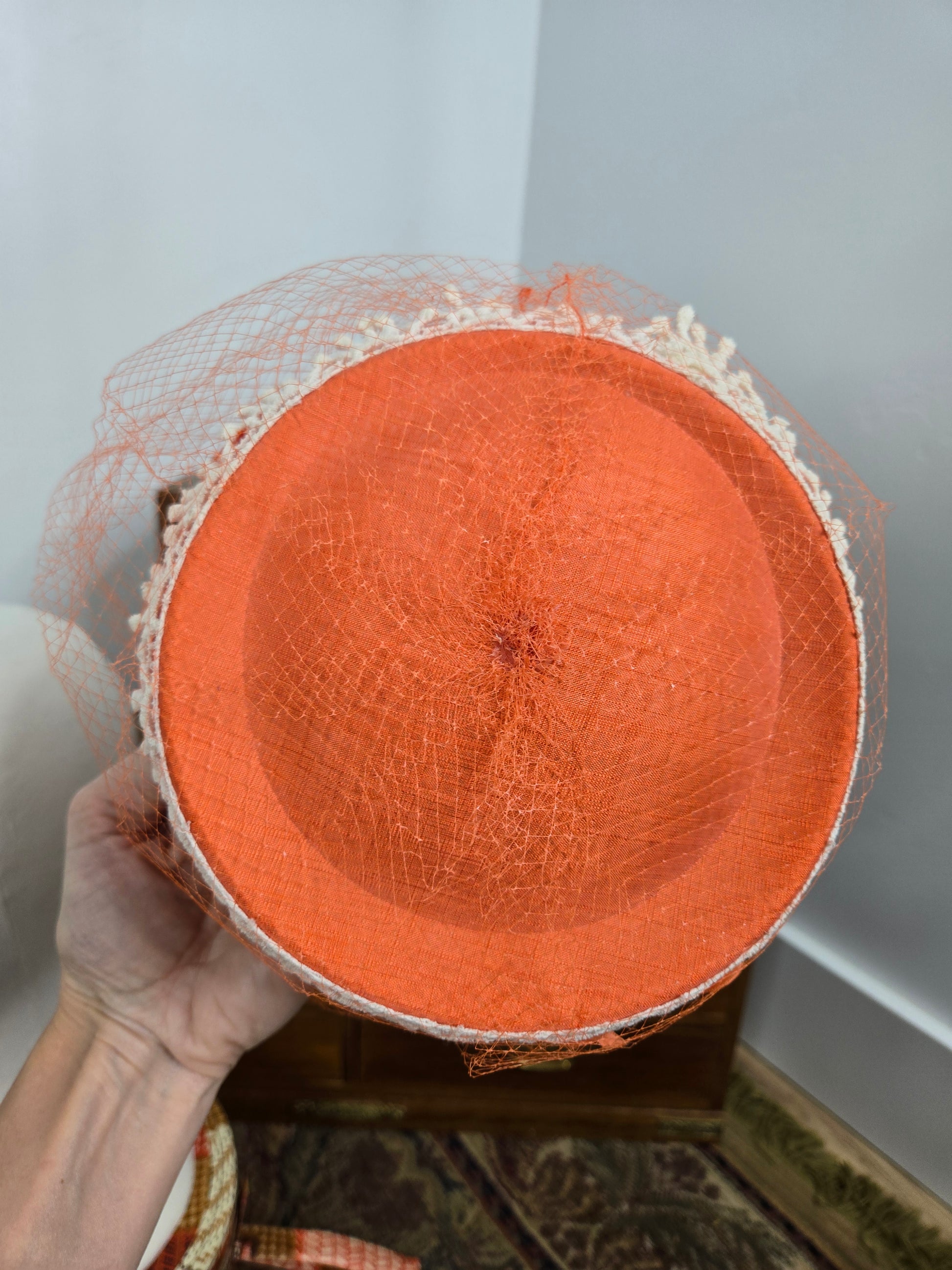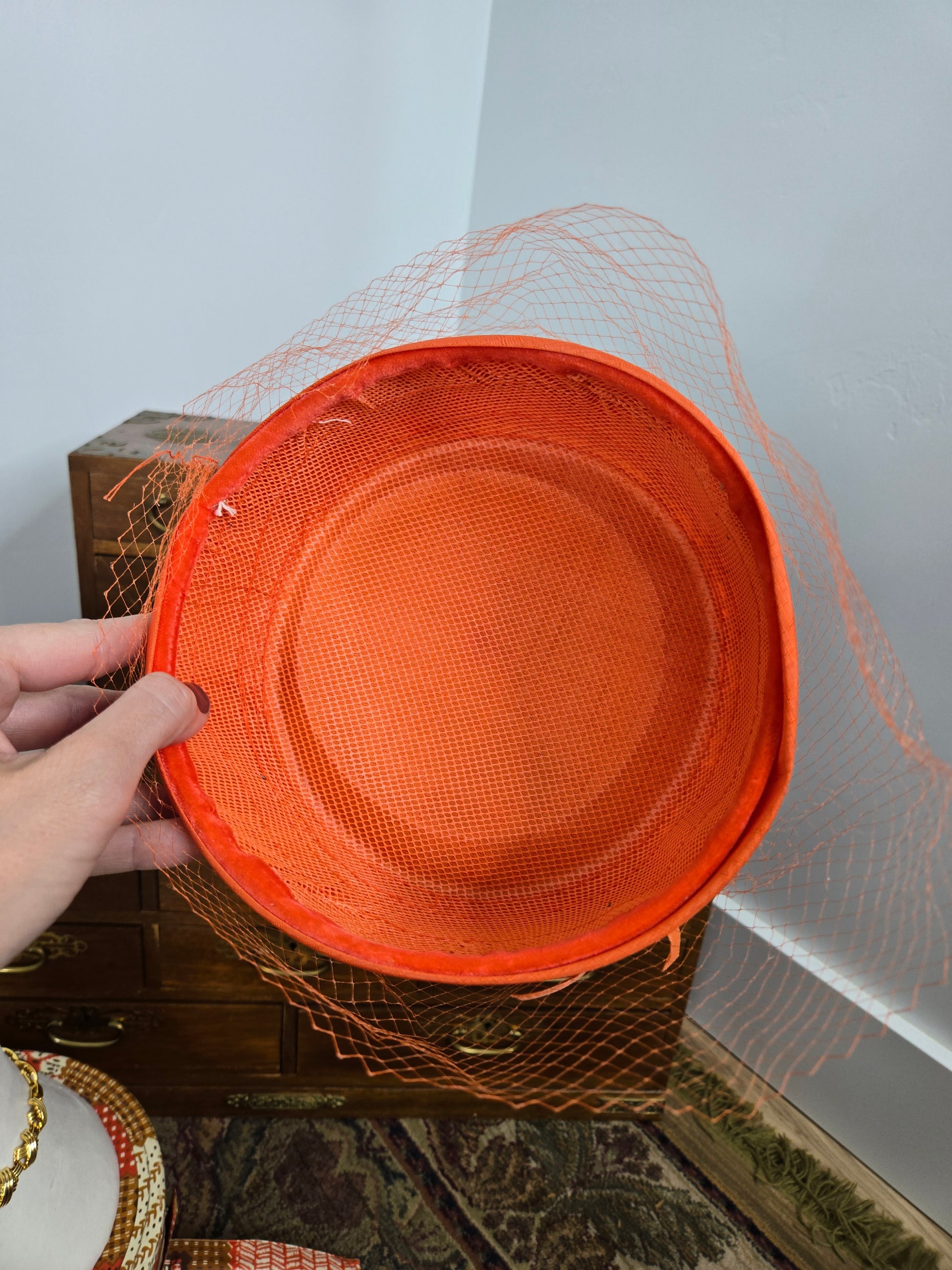 Vintage 1950s peachy orange pillbox hat with small lace detail around the top, a bow and rhinestone detail at the front, and mesh throughout. The mesh is in perfect condition with no holes or snags. It has a great structure and has perfect shape because it has been stored in it's original box. No tags on the inside, possibly custom made.