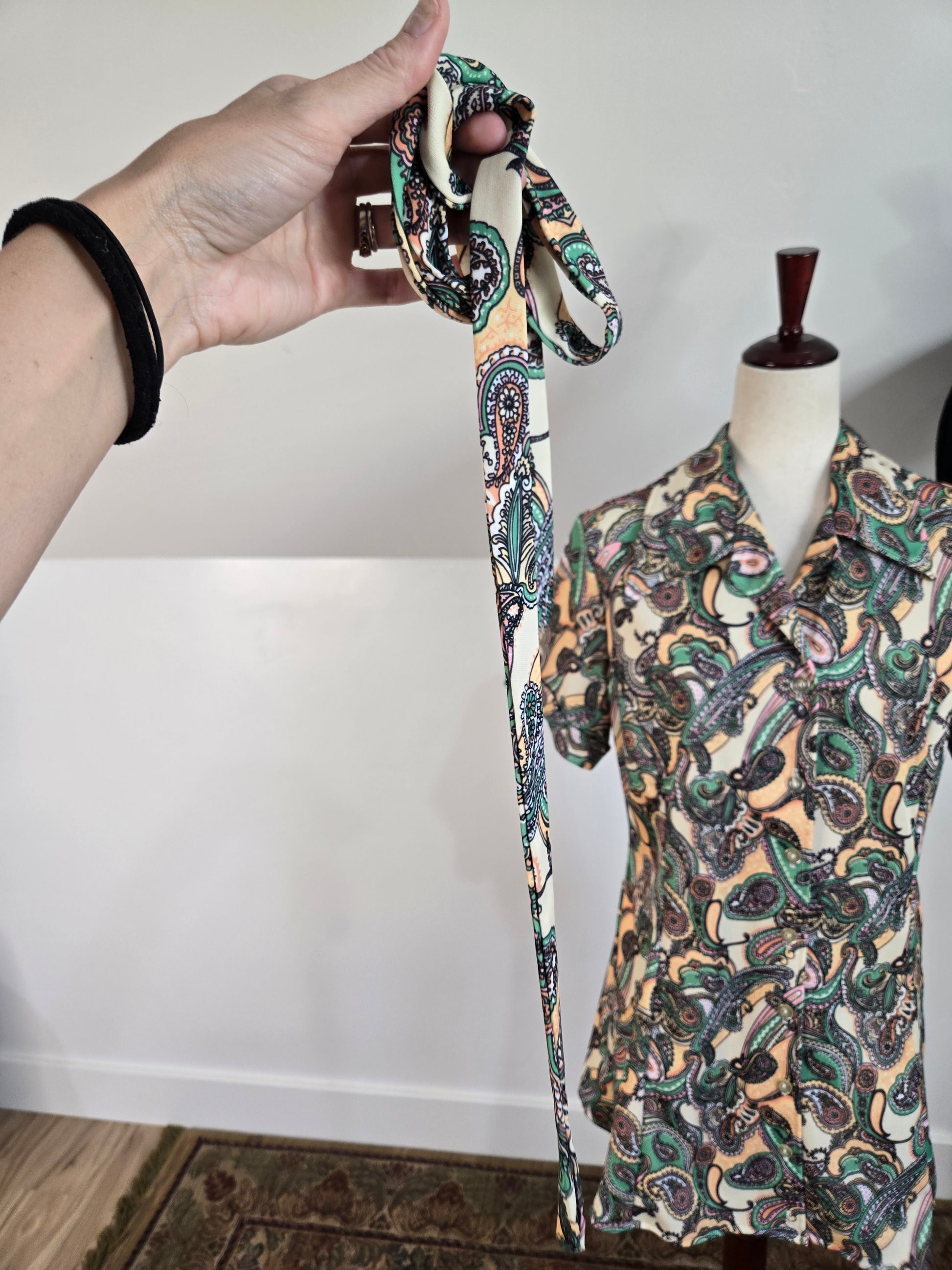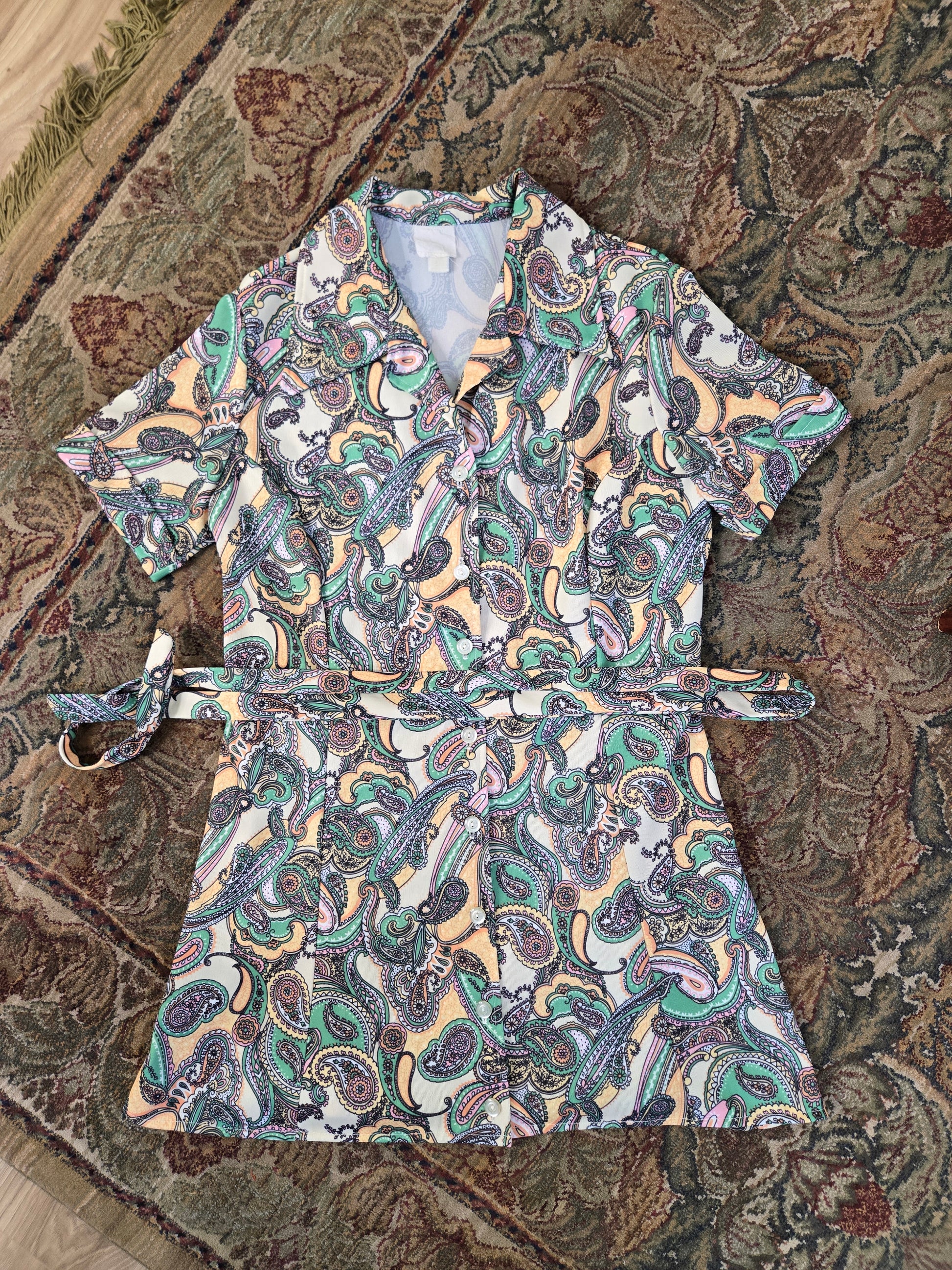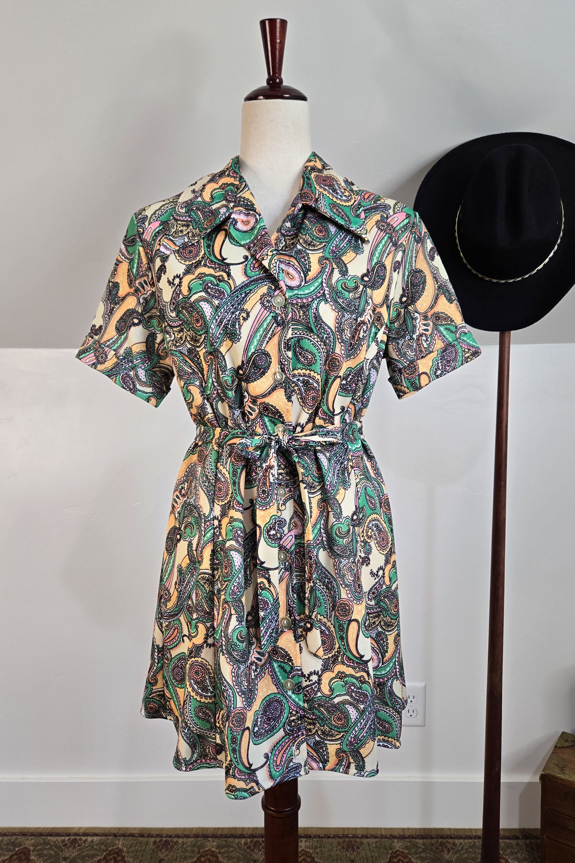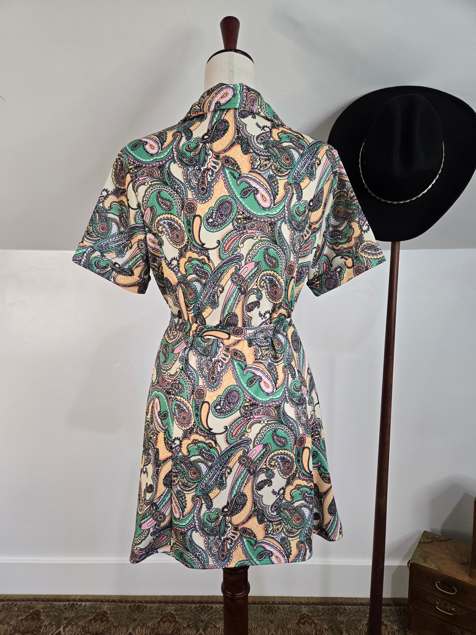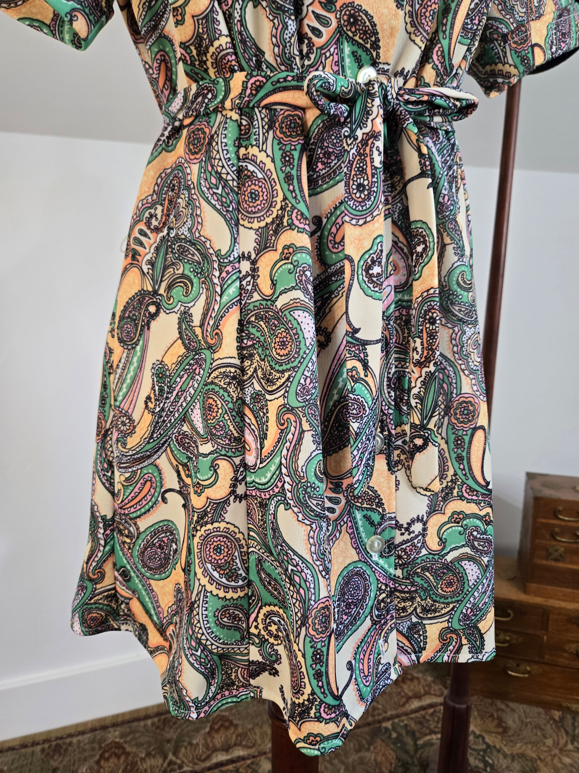 Vintage 1970s paisley print button down tunic/mini dress in a palette of green, yellow, pink, and black. It was a maxi but had an imperfection towards the bottom, so I had it tailored into a mini dress. It has a matching belt that is removable and a small dagger collar. It is in great condition, just note the alteration.