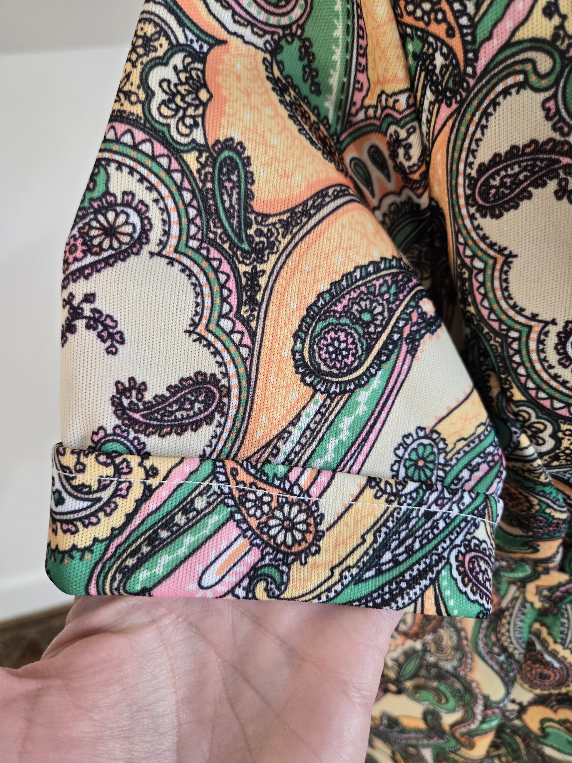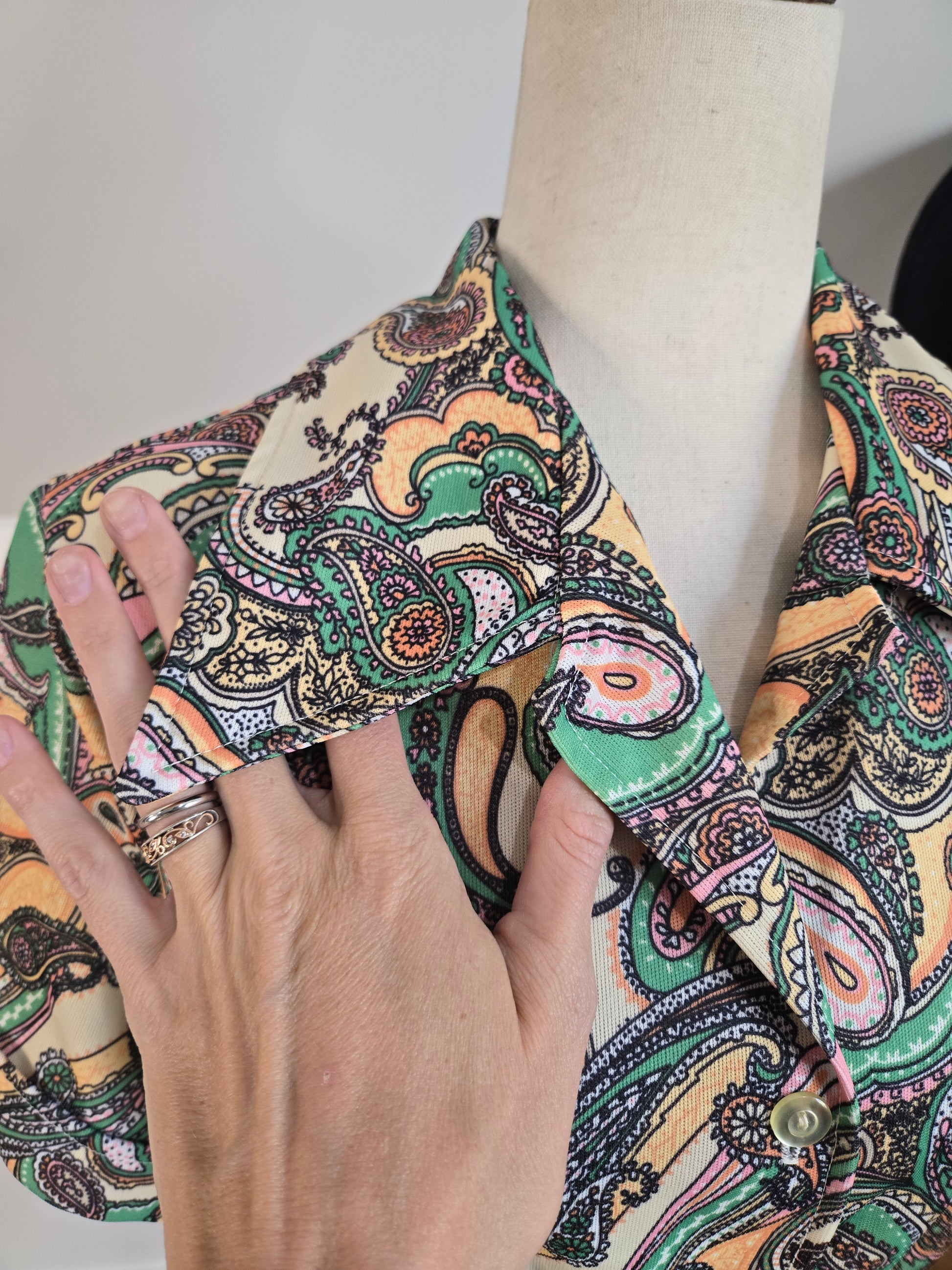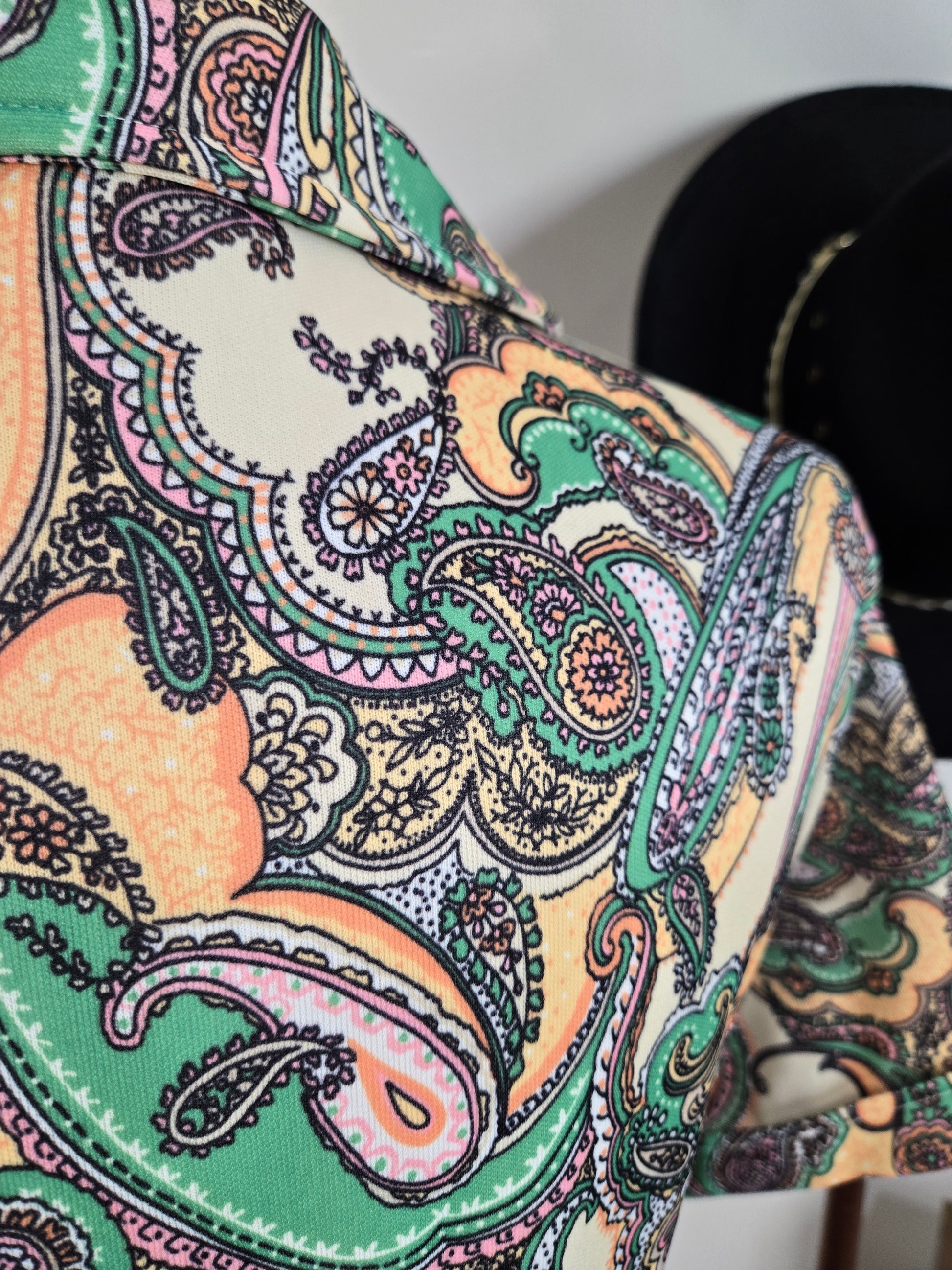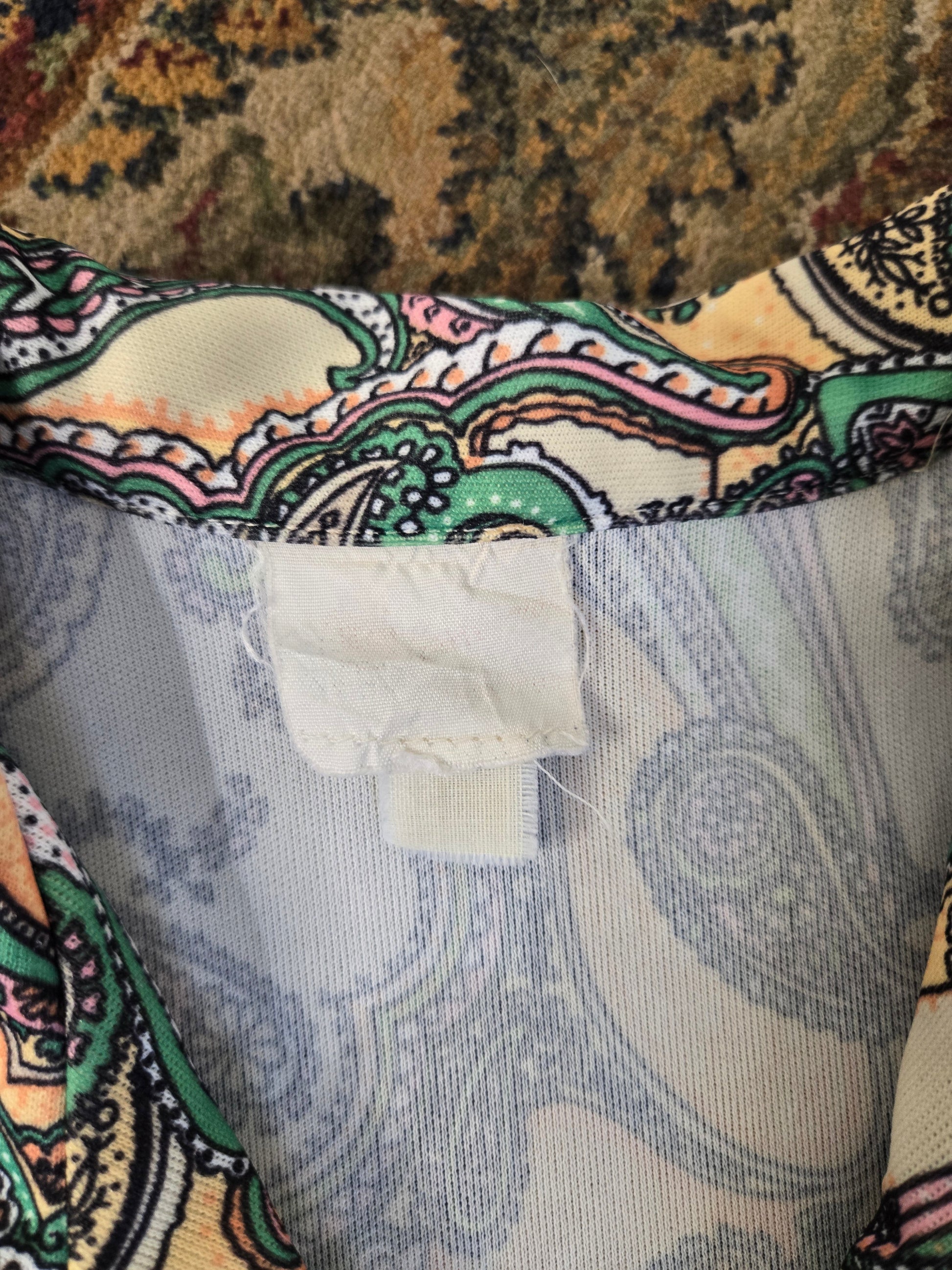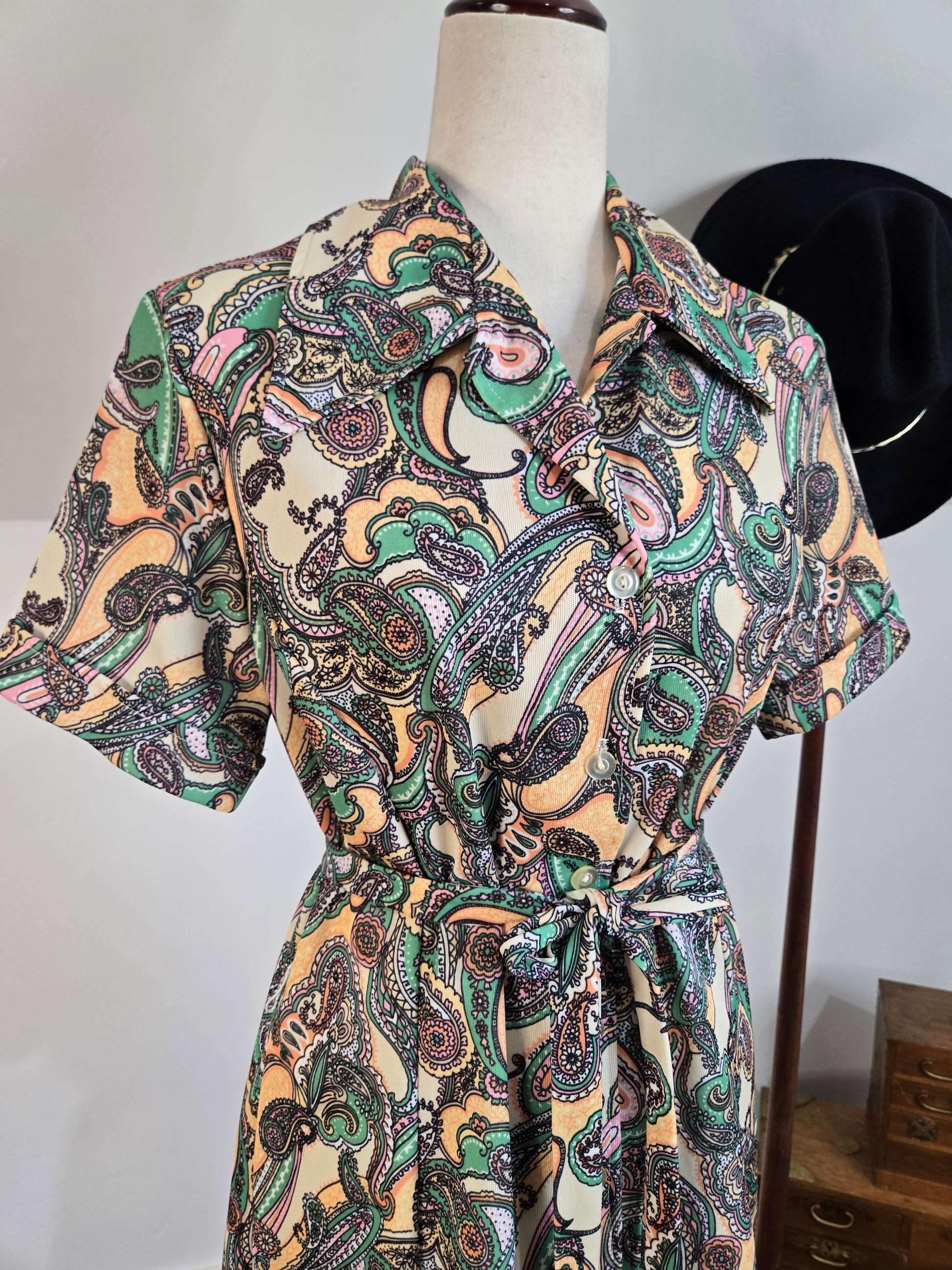 Vintage 1970s paisley print button down tunic/mini dress in a palette of green, yellow, pink, and black. It was a maxi but had an imperfection towards the bottom, so I had it tailored into a mini dress. It has a matching belt that is removable and a small dagger collar. It is in great condition, just note the alteration.