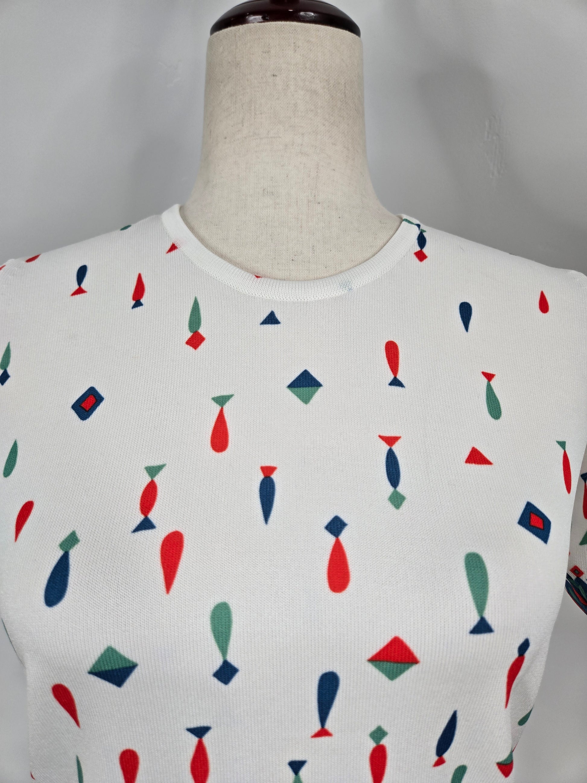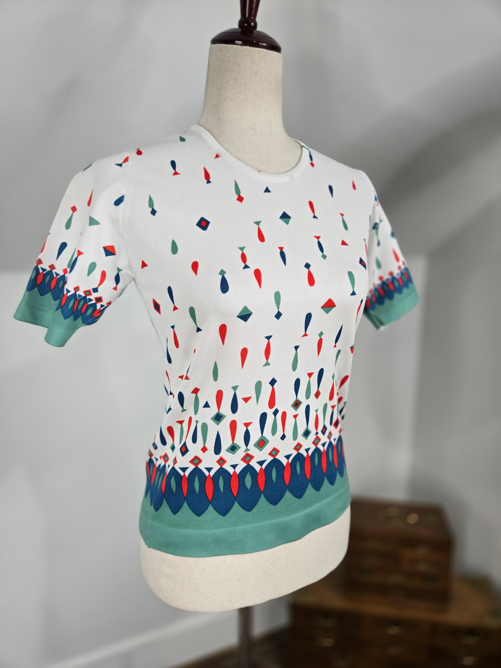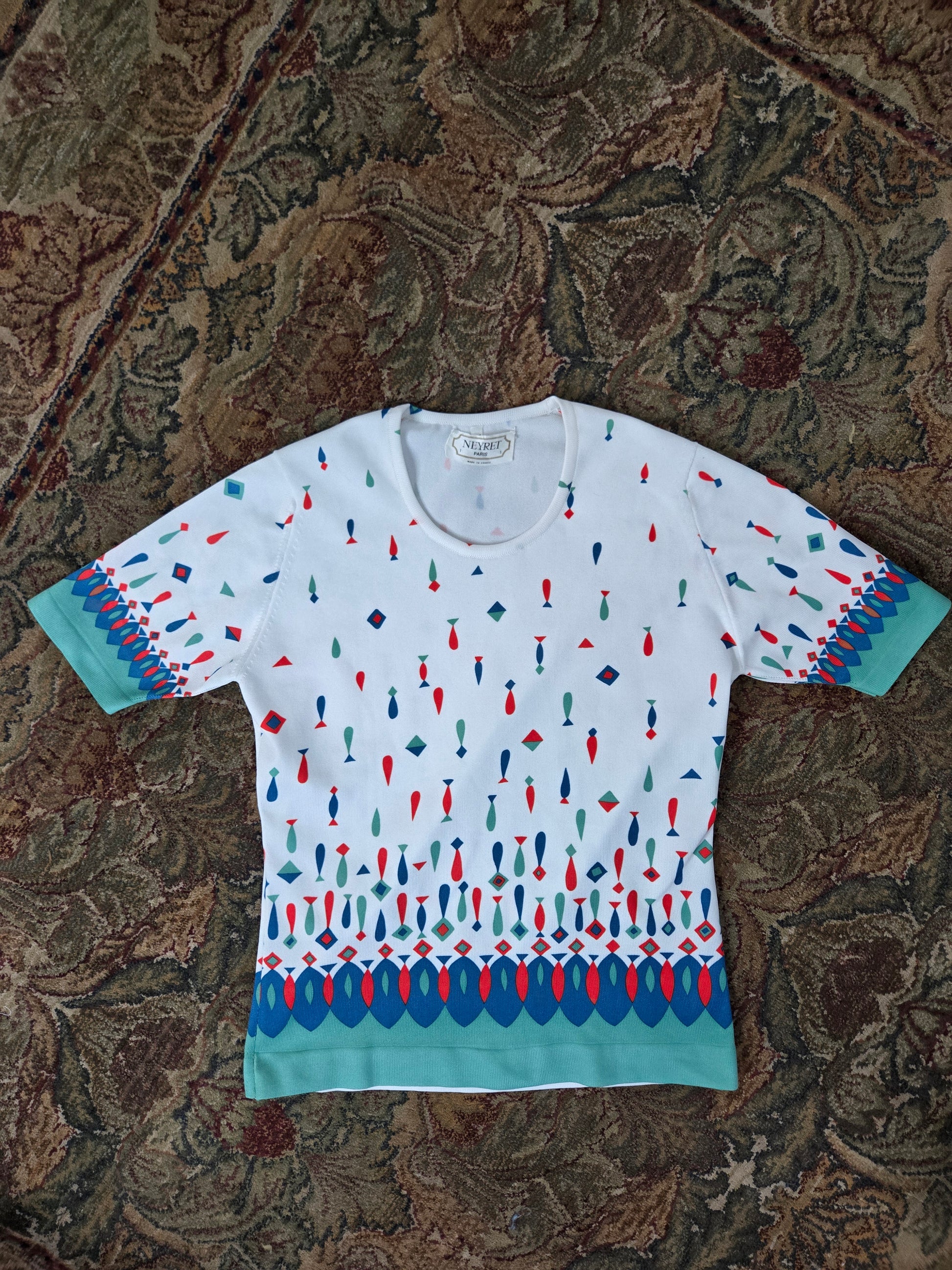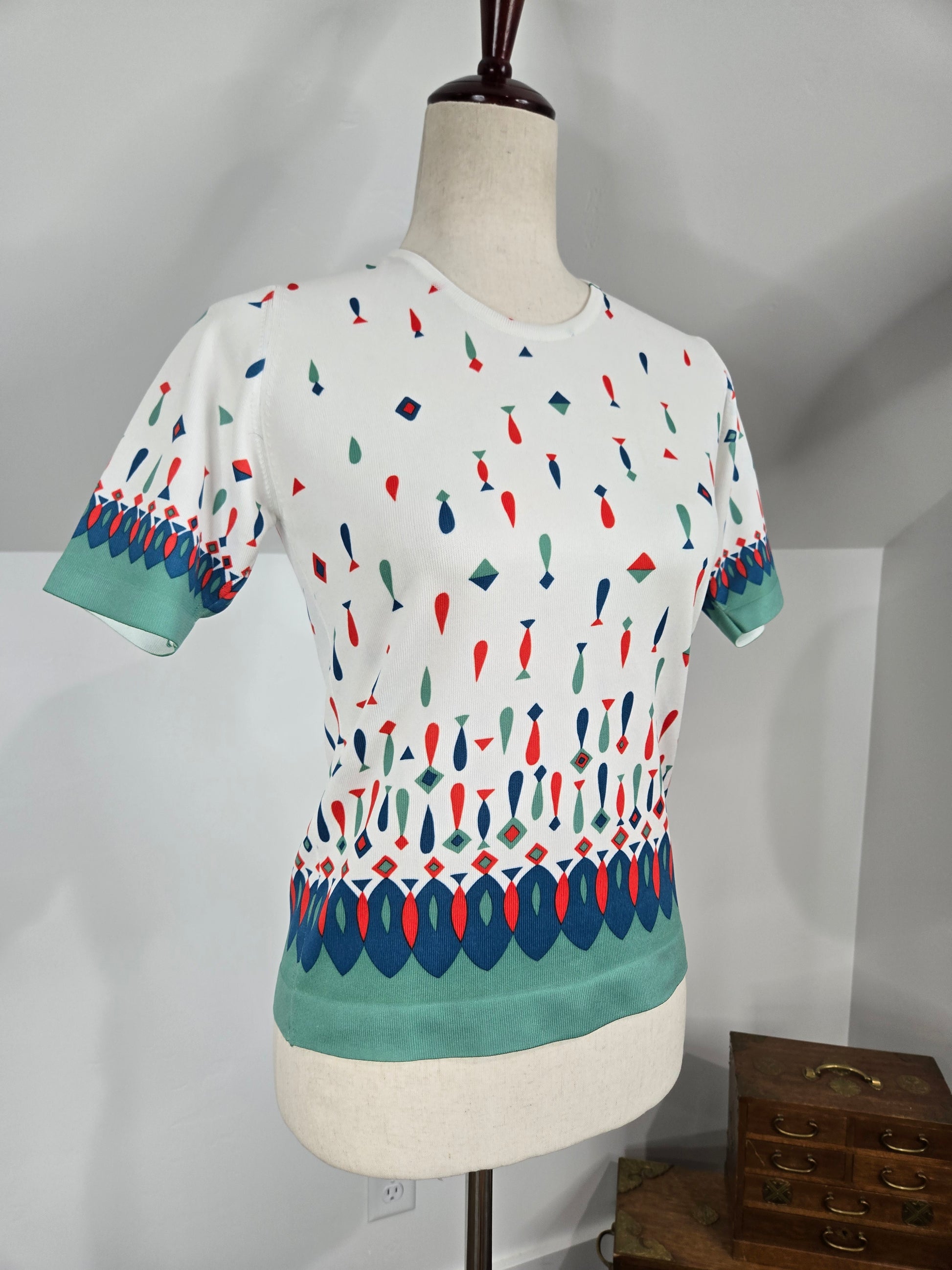 Neyret Paris made in France vintage mid century mod print knit tshirt. It is seamless at the hems, which is impressive for how old it is!! It is in amazing condition.