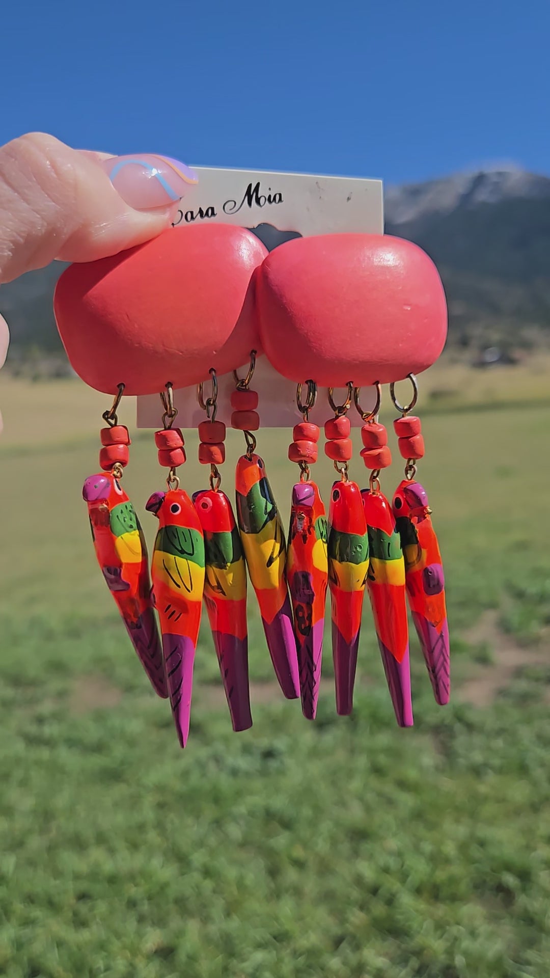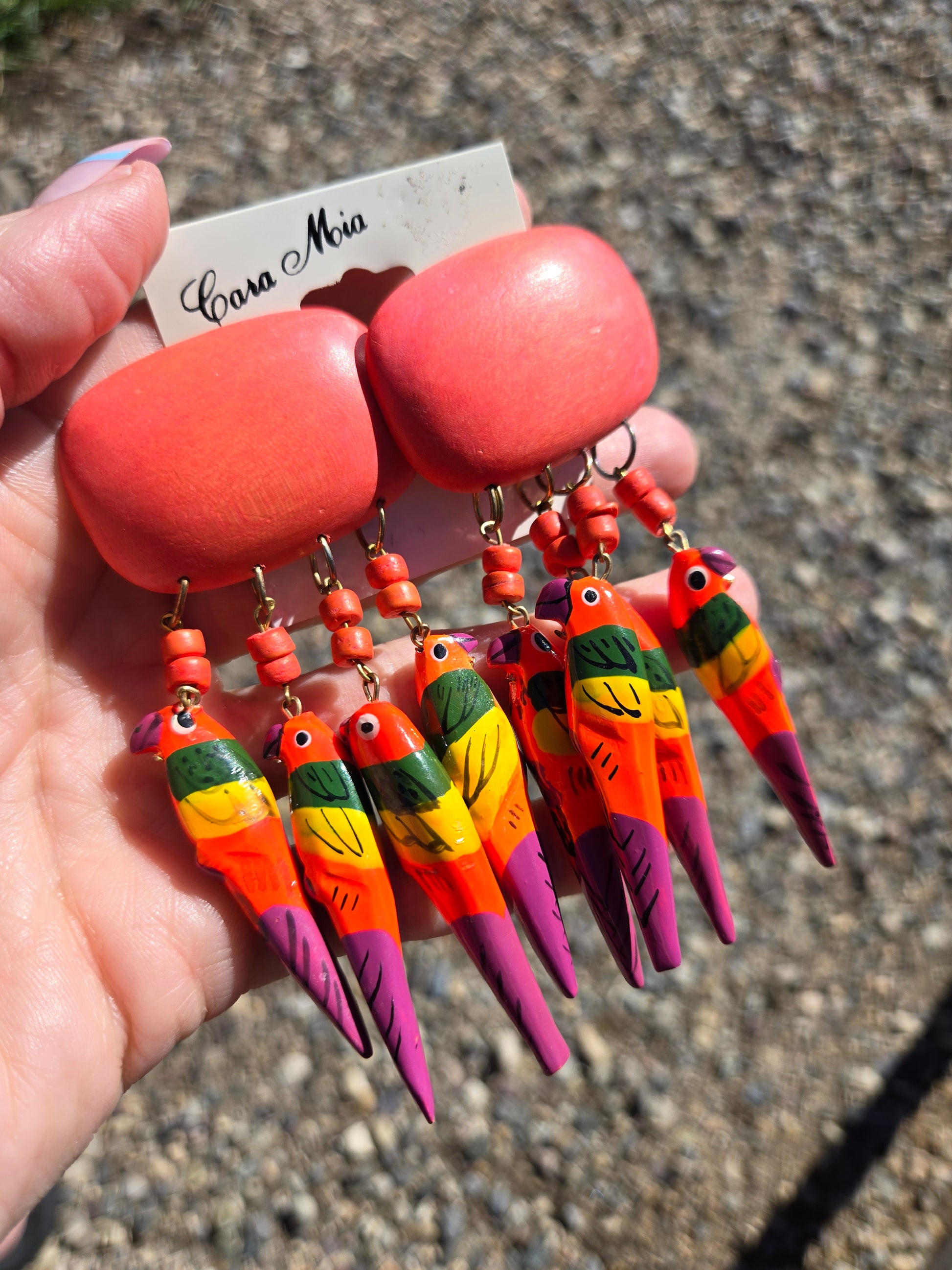 Vintage deadstock Cara Mia dangling neon parrots post back earrings for pierced ears. They are made of a lightweight wood material and are all hand painted in an array of bright neon dayglo colors. (Way brighter in person) I have put fresh backs on them. Made in Philippines.