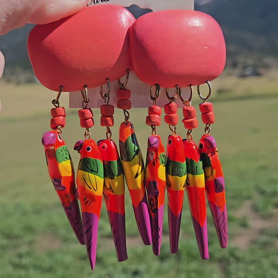 Deadstock Wood Dangling Neon Hand Painted Parrot Earrings