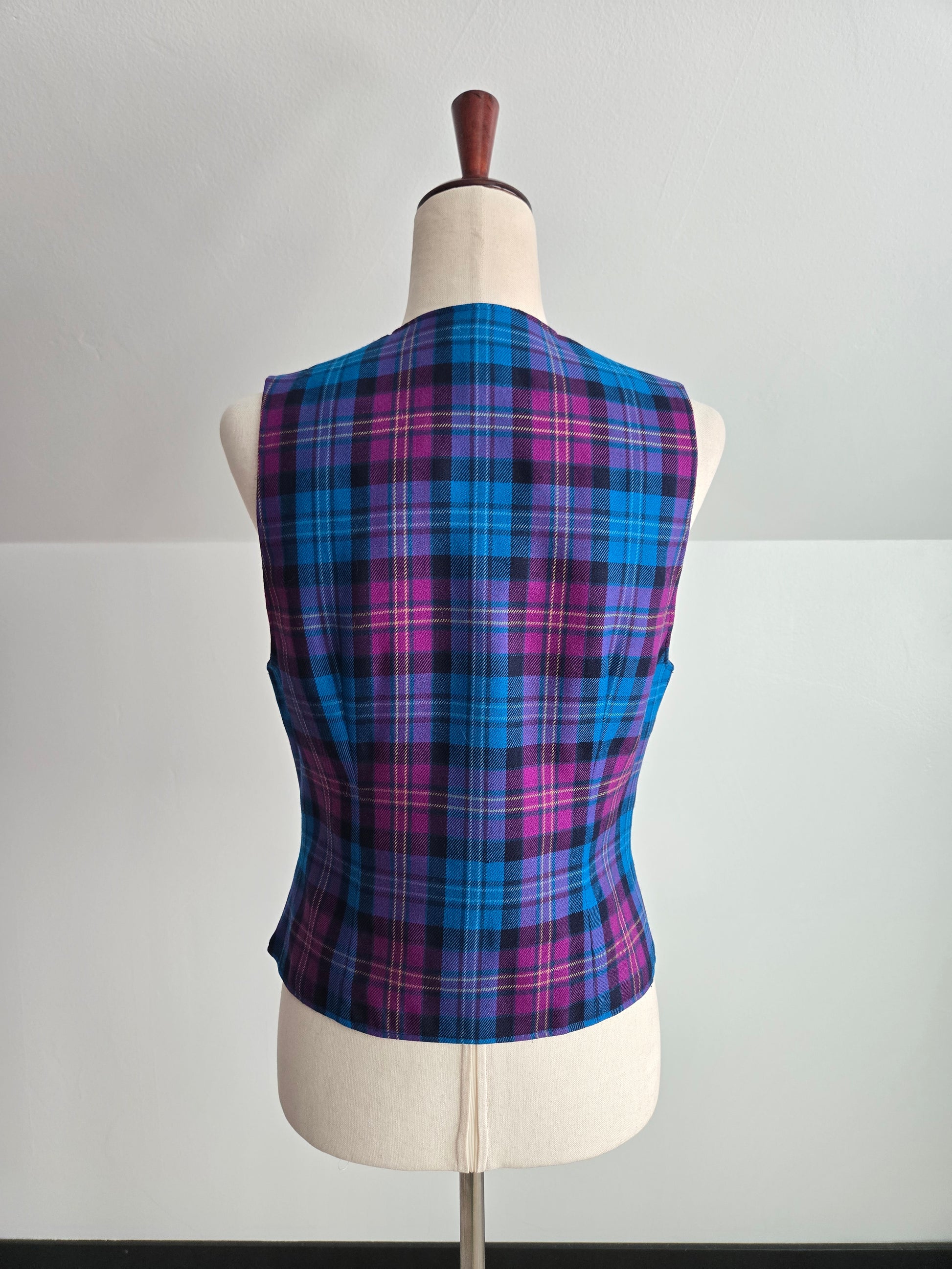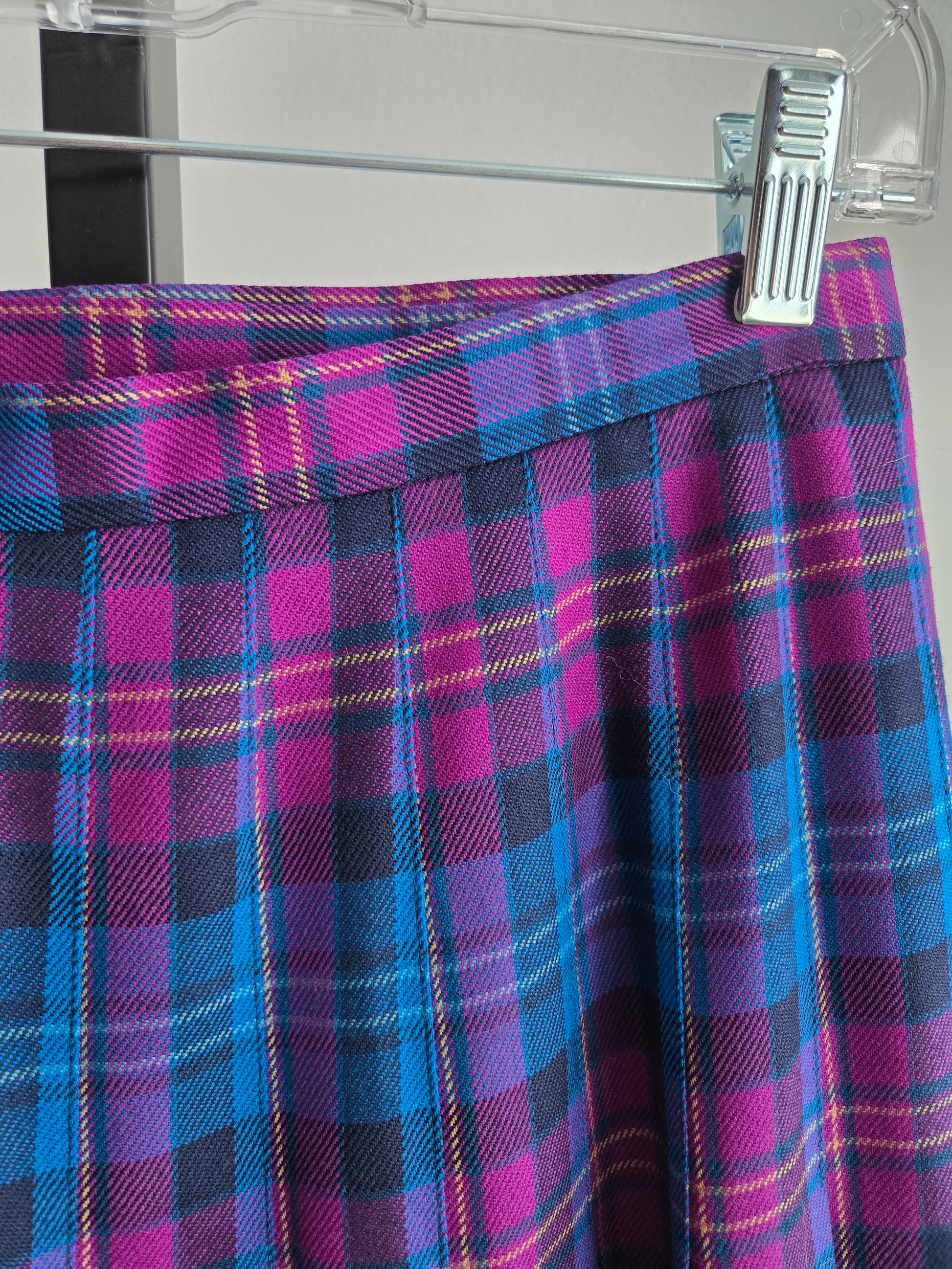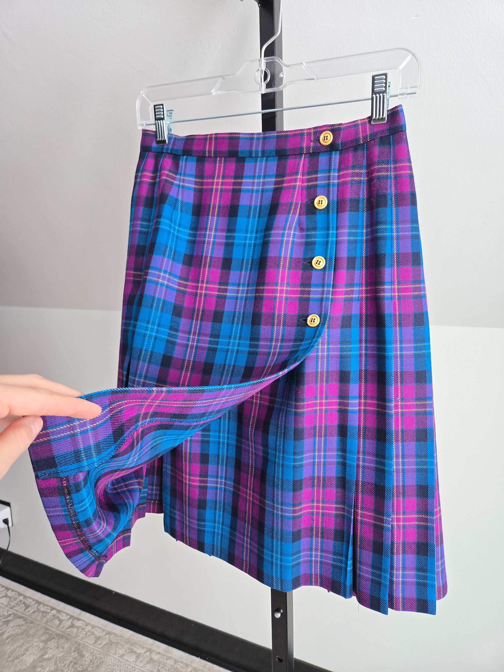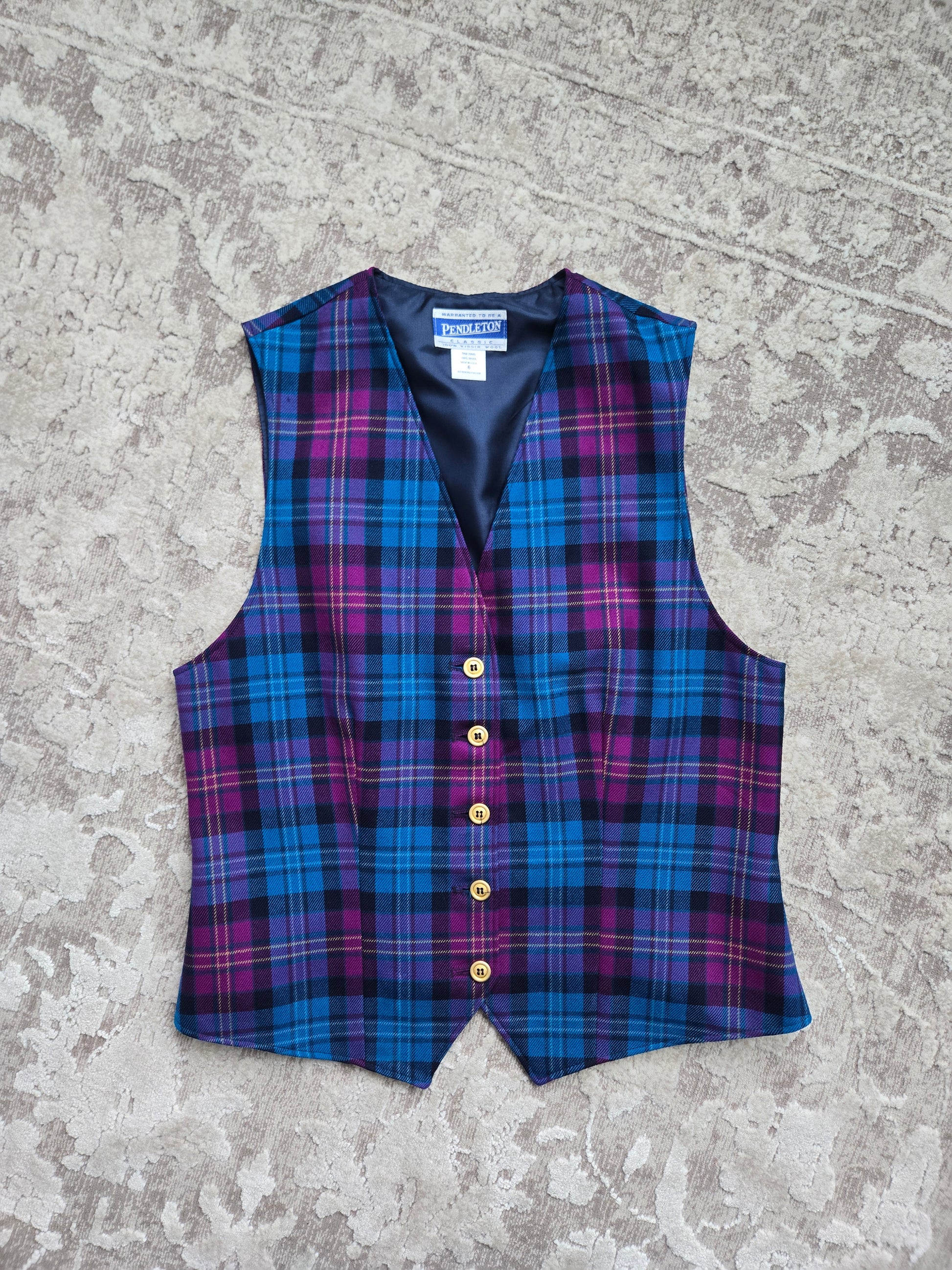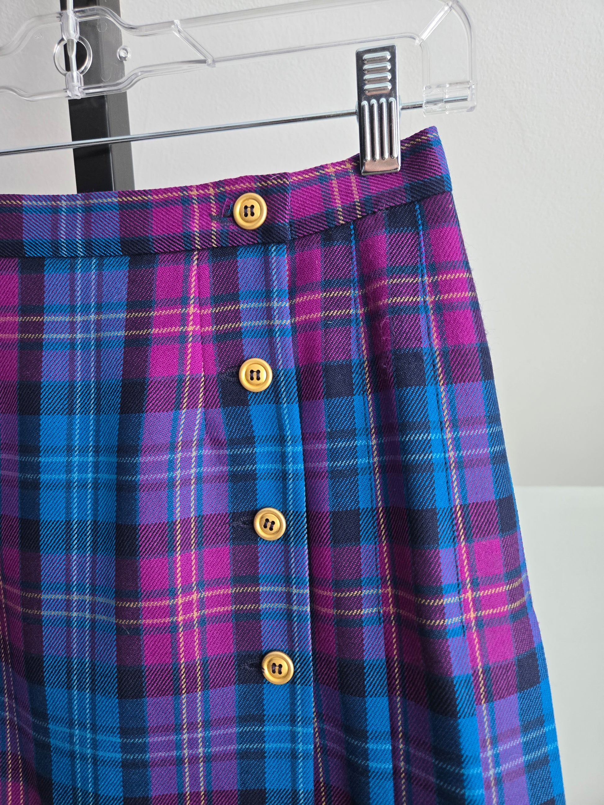 Vintage Pendleton blue and purple plaid wool two piece set. The vest is tailored and beautiful and has gold buttons down the front. The skirt is a wrap skirt with gold buttons at the side that has pleat work in the back. Both are fully lined and in perfect condition.