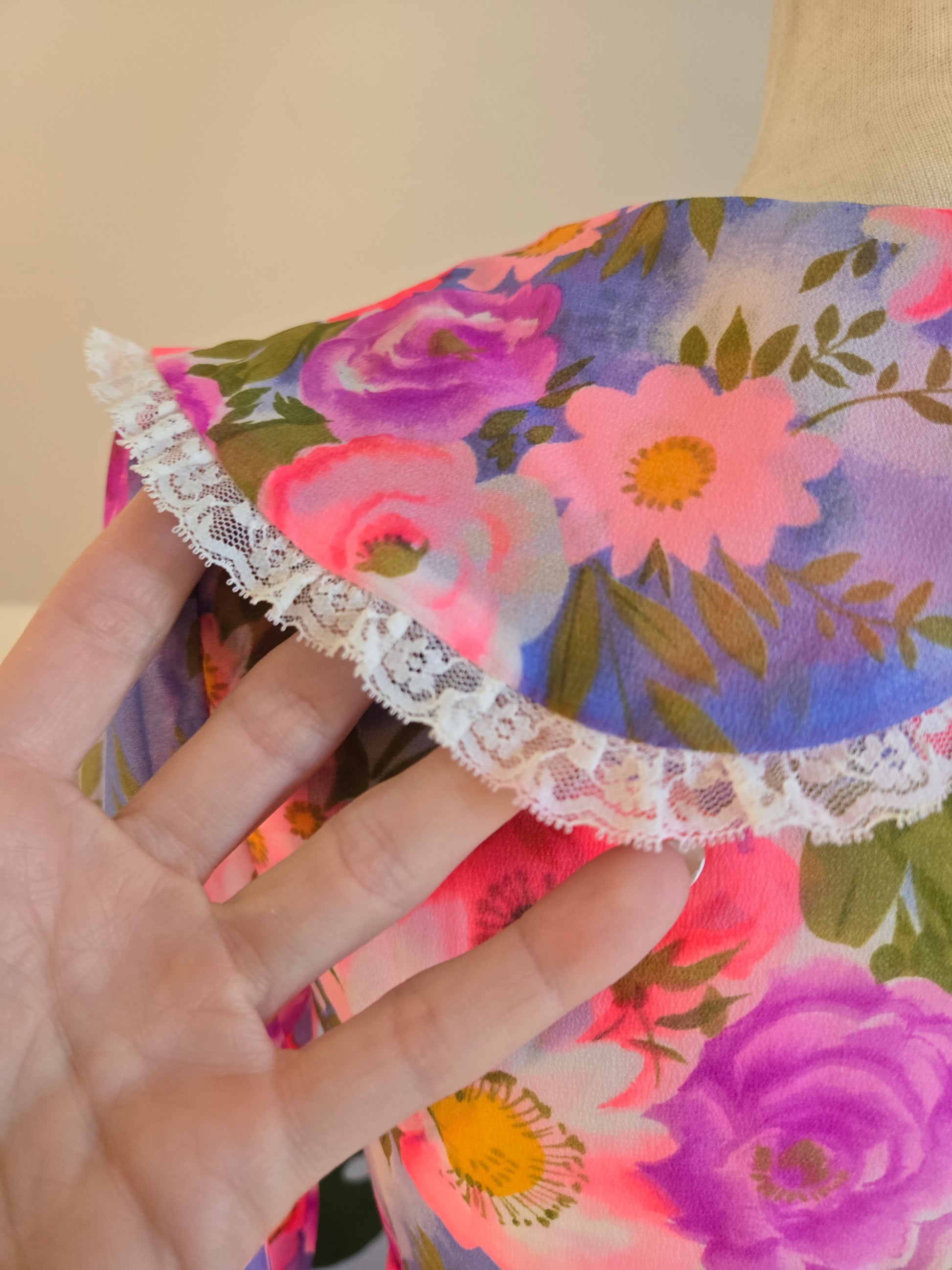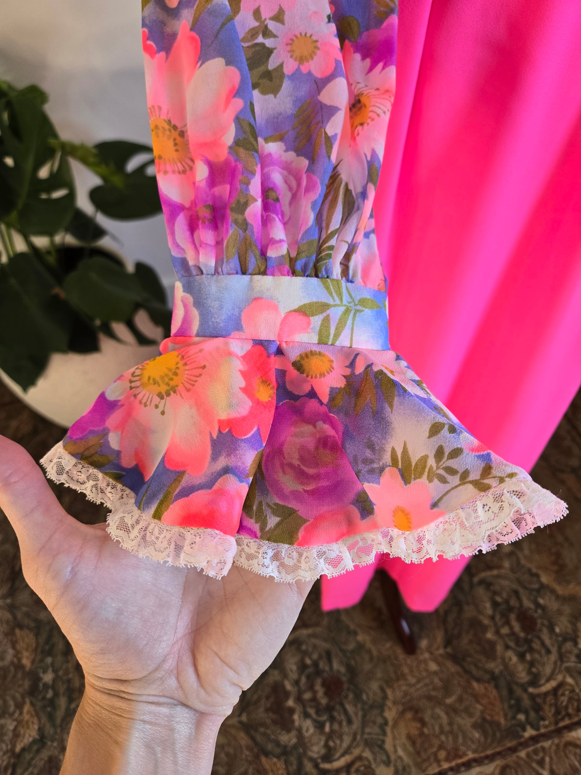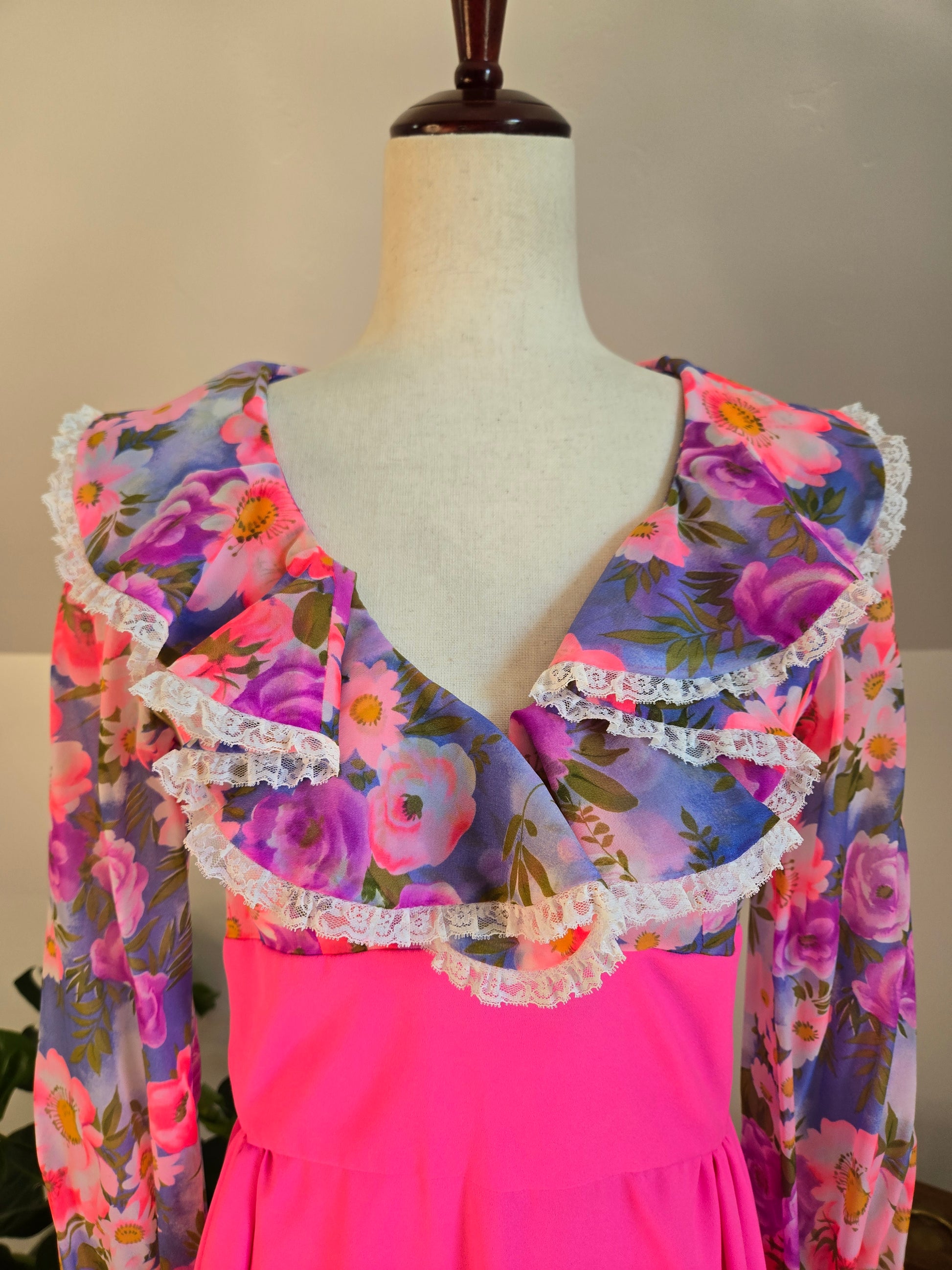 Vintage 1970s hot pink flower power maxi dress. It has the brightest, prettiest flower power print top with a ruffled collar trimmed in delicate lace at the collar and cuff. The flower power fabric areas are just chiffon, so it is semi-shear. There is a hot pink thicker polyester defined wide waistband and long skirt. There is an invisible zipper in the back and hook closure at the top. It has been washed and steamed and is in amazing condition with no imperfections.