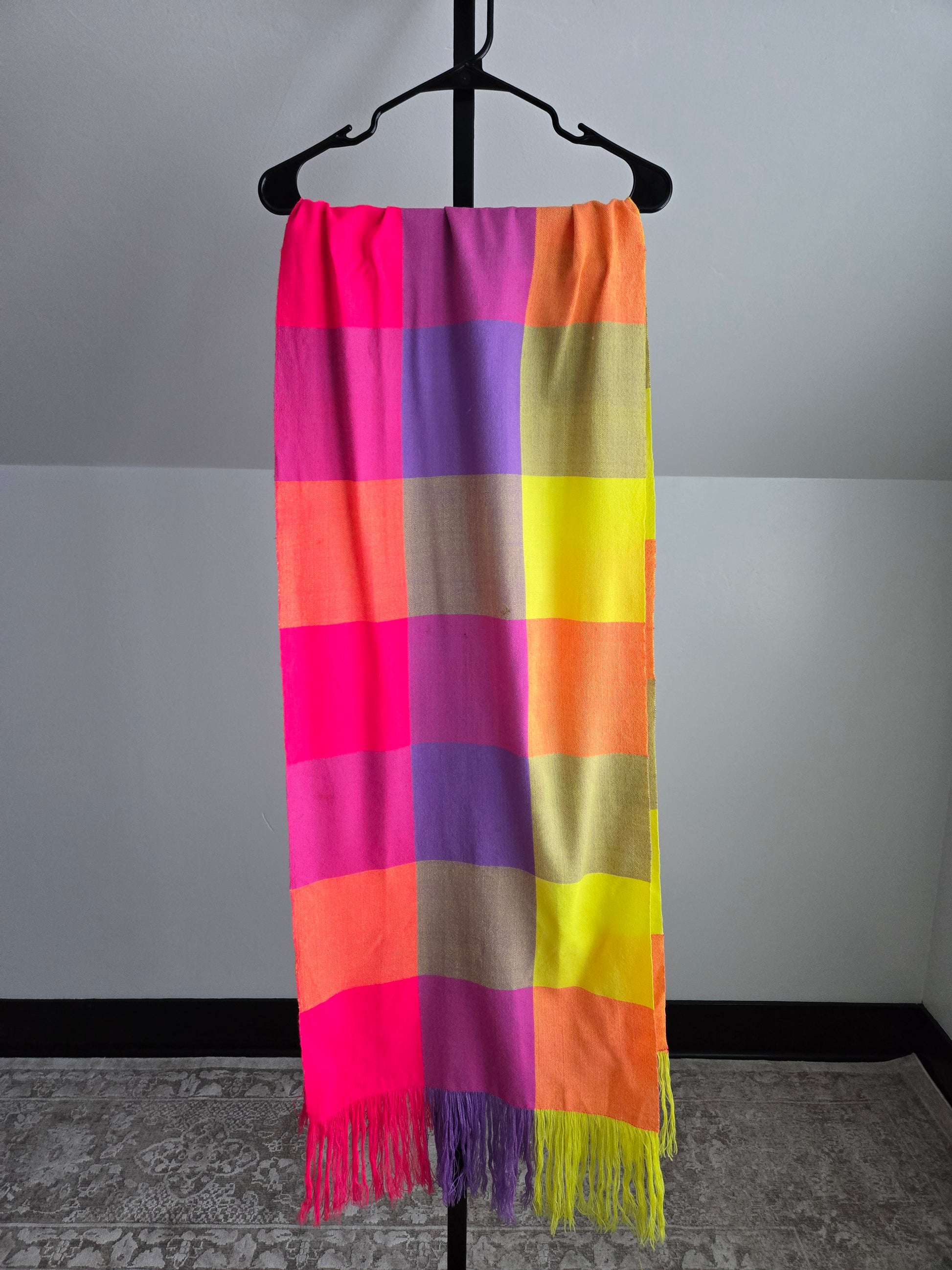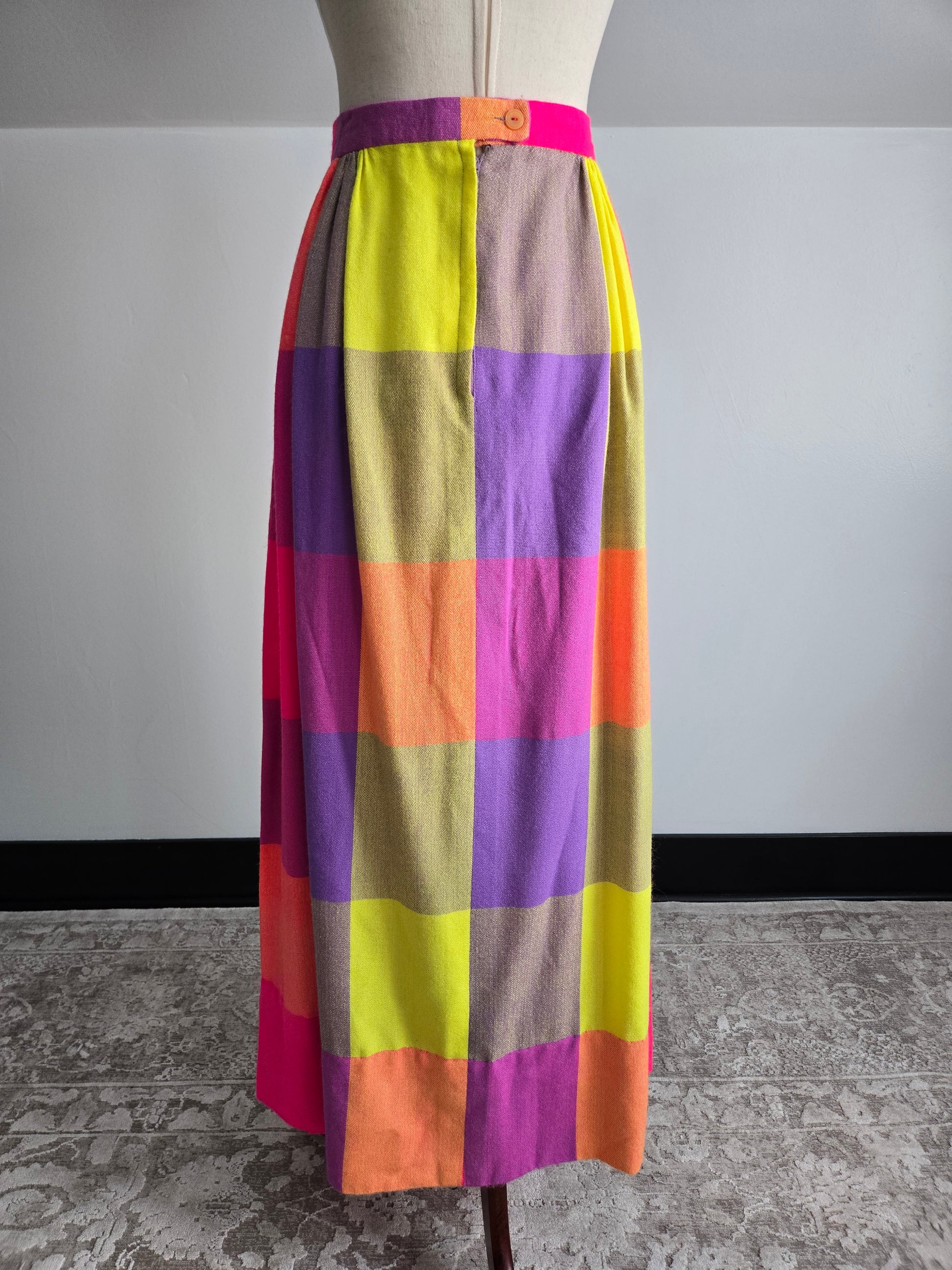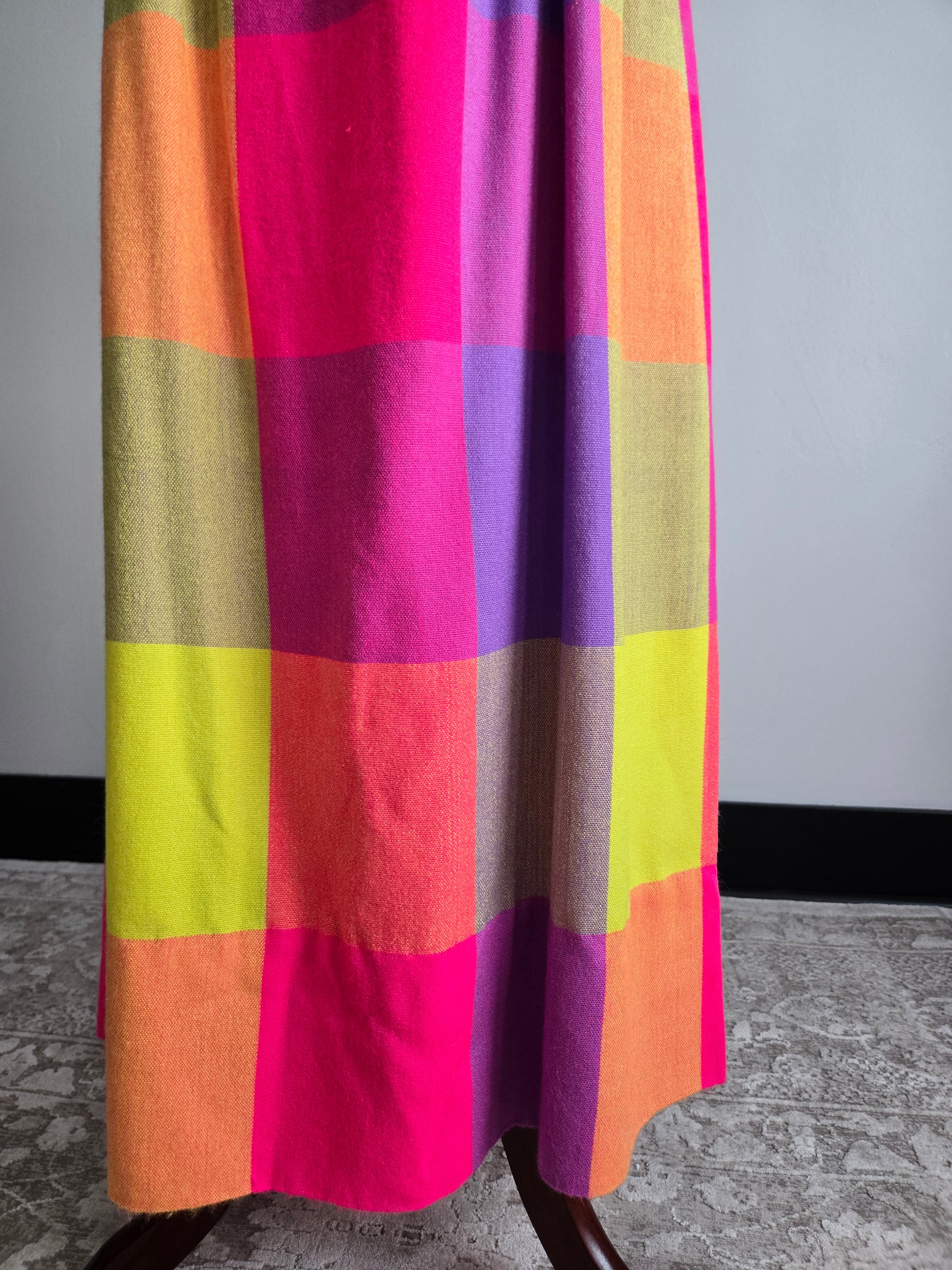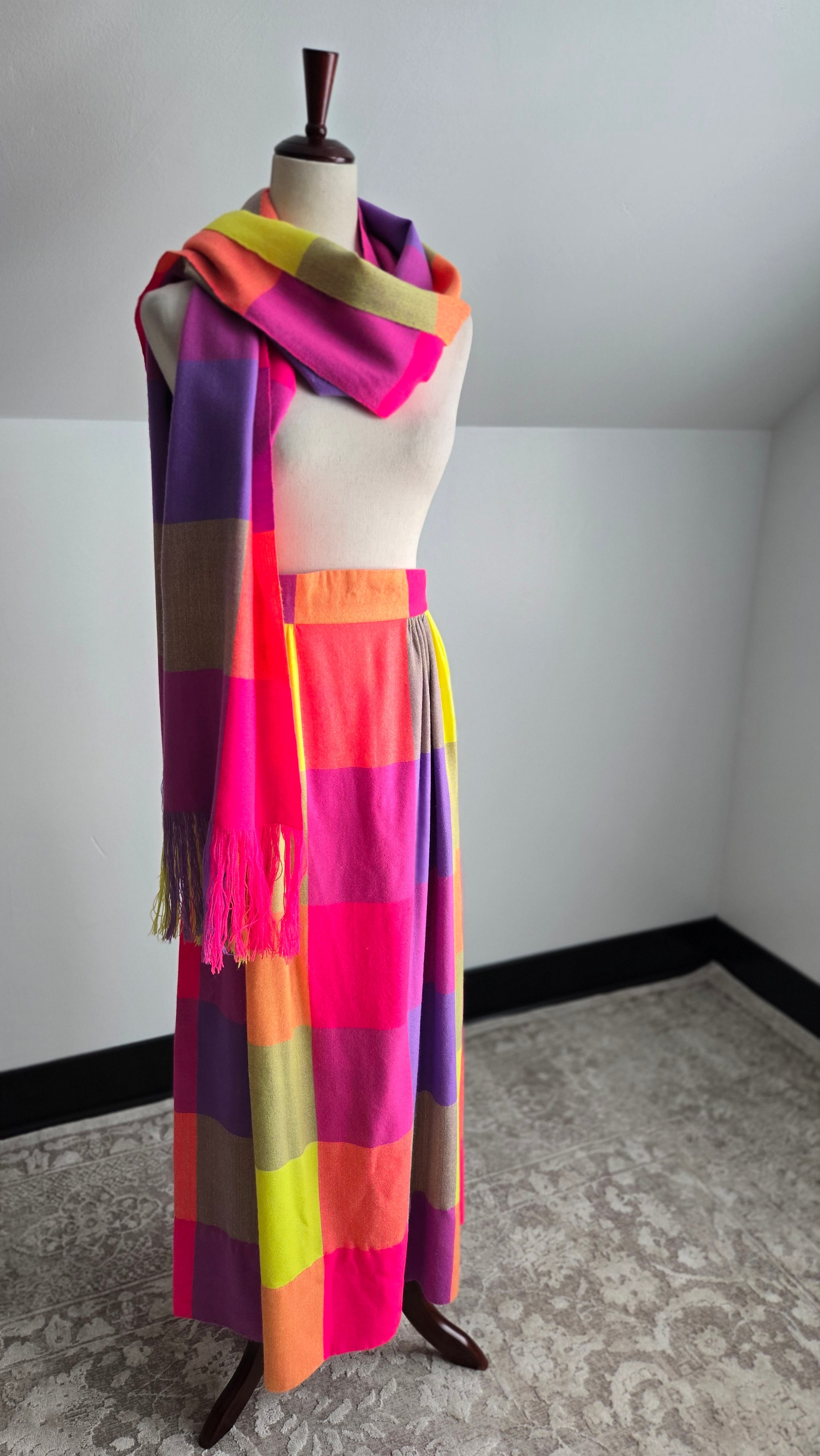 Vintage 70s neon plaid maxi skirt and matching scarf two piece set. The skirt has a tailored curved waistband for a flattering fit at the top and zips and buttons in the back. It is finished with a large hem and ribbon trim, so you could make it longer if needed. The matching scarf is large and has fringe at each end. This piece is so bright it was difficult to take pictures of! Perfect condition and is possibly hand made.