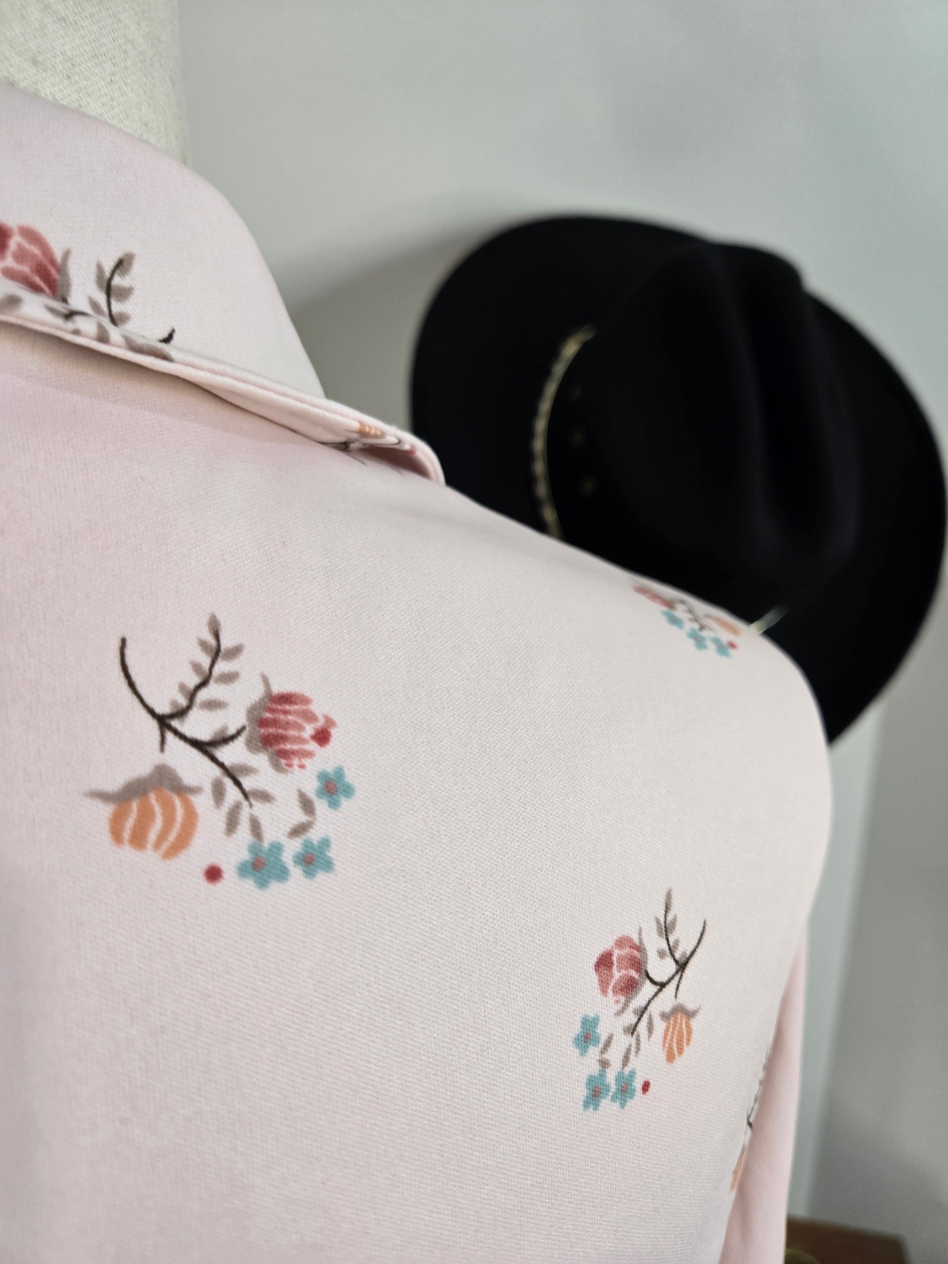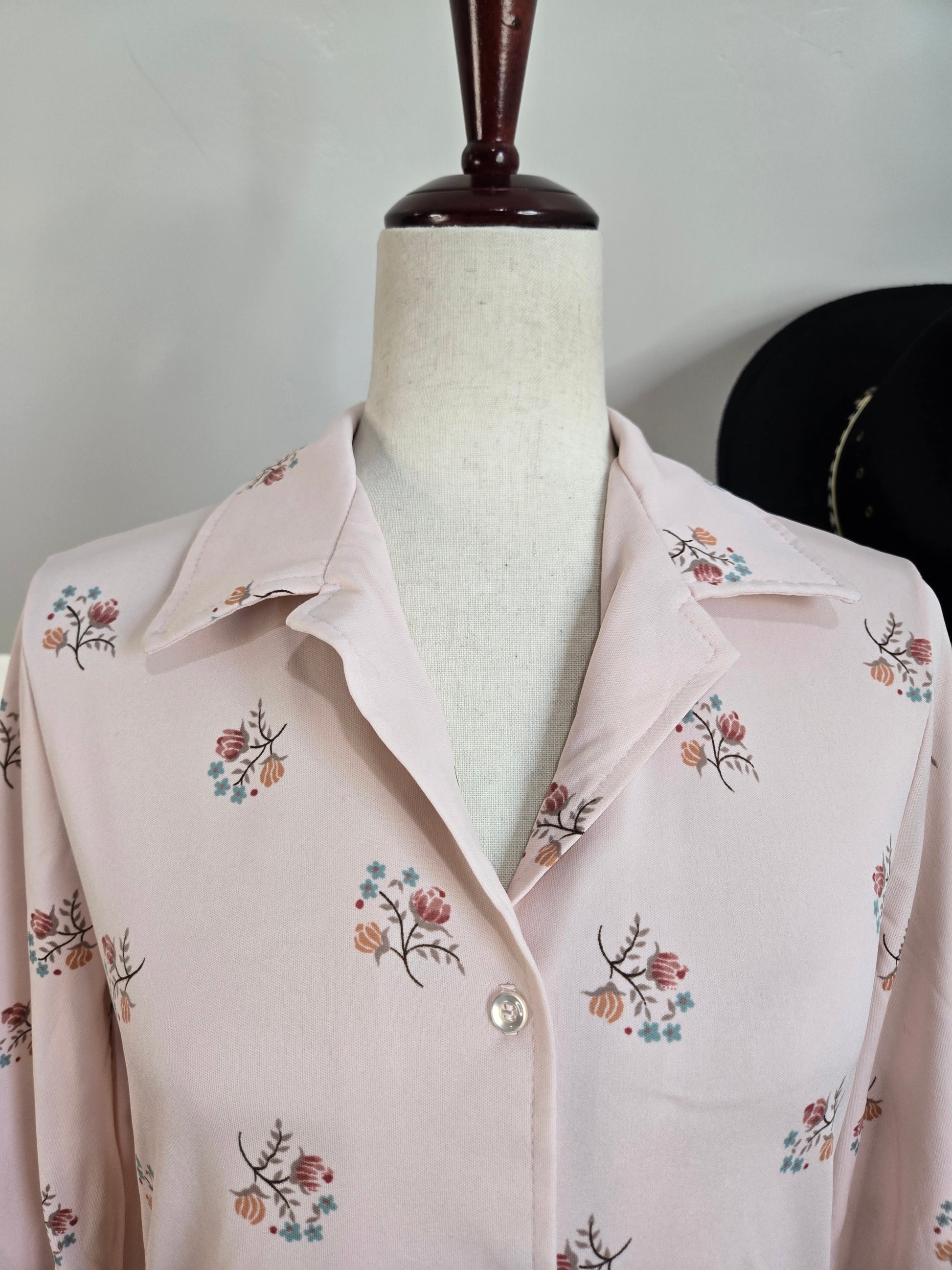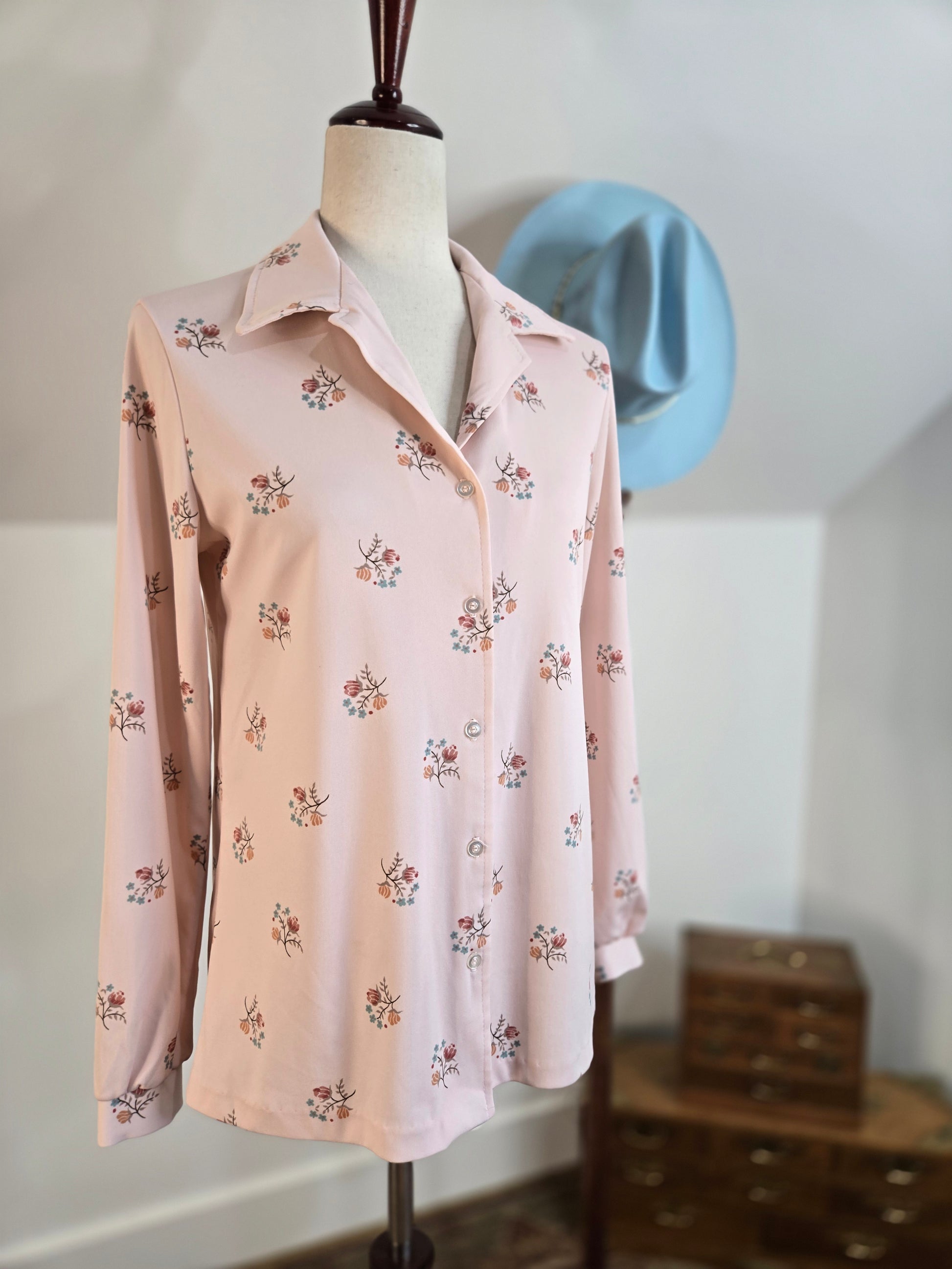 Ecco Bay vintage 70s pale pink top with whimsical florals throughout. It has a small dagger collar and buttons down the center front and cuff. It is in perfect condition and has been laundered and steamed.