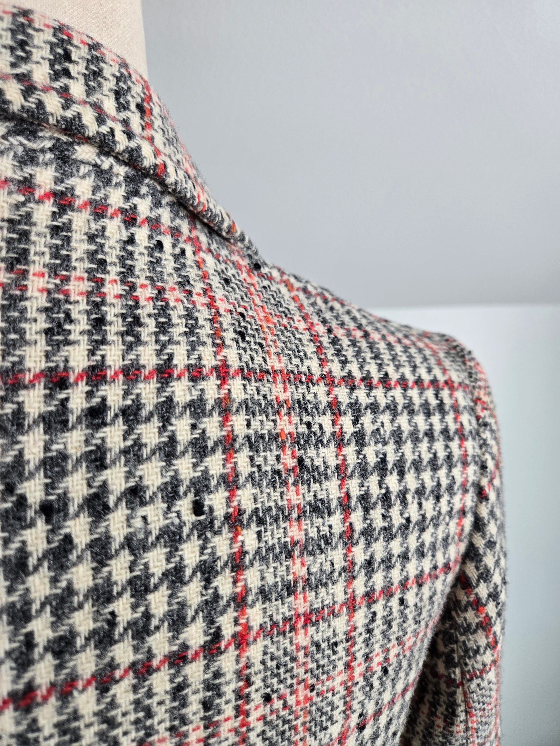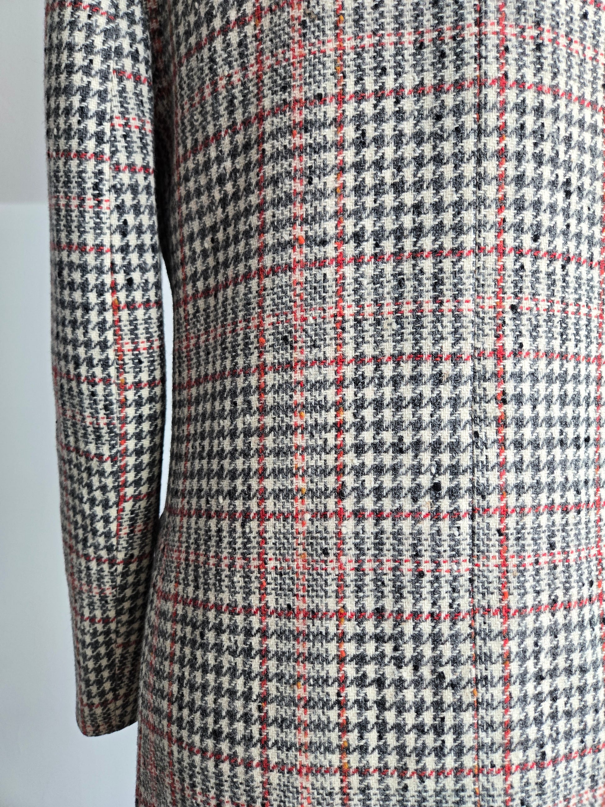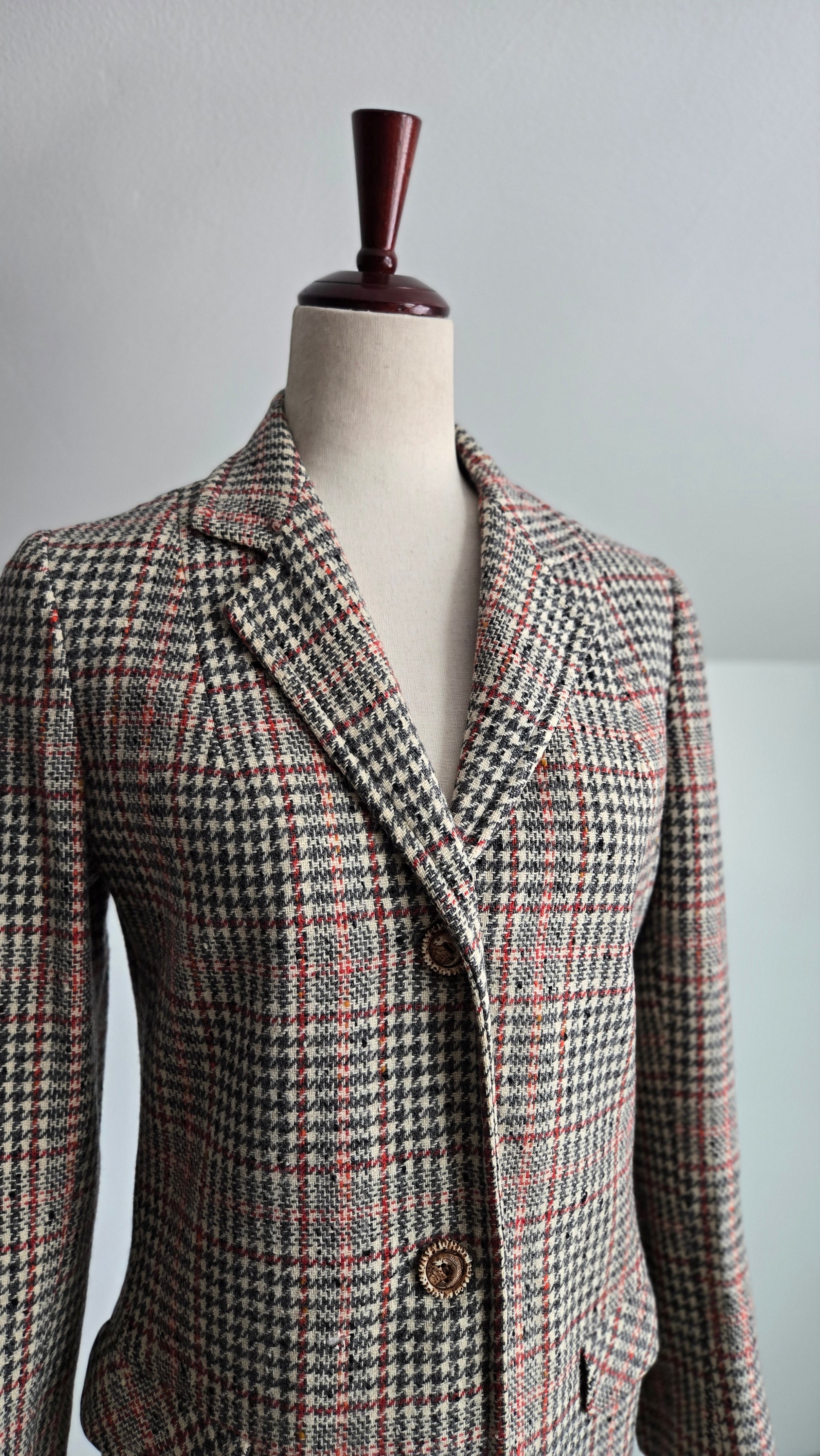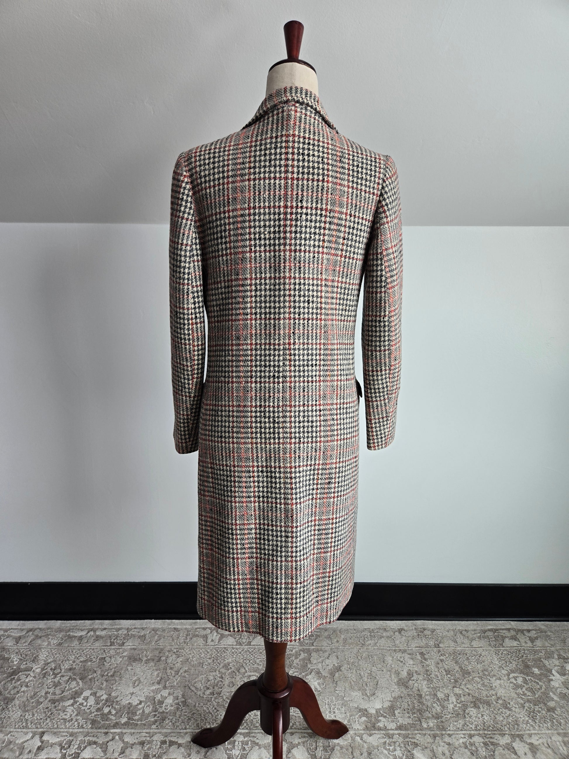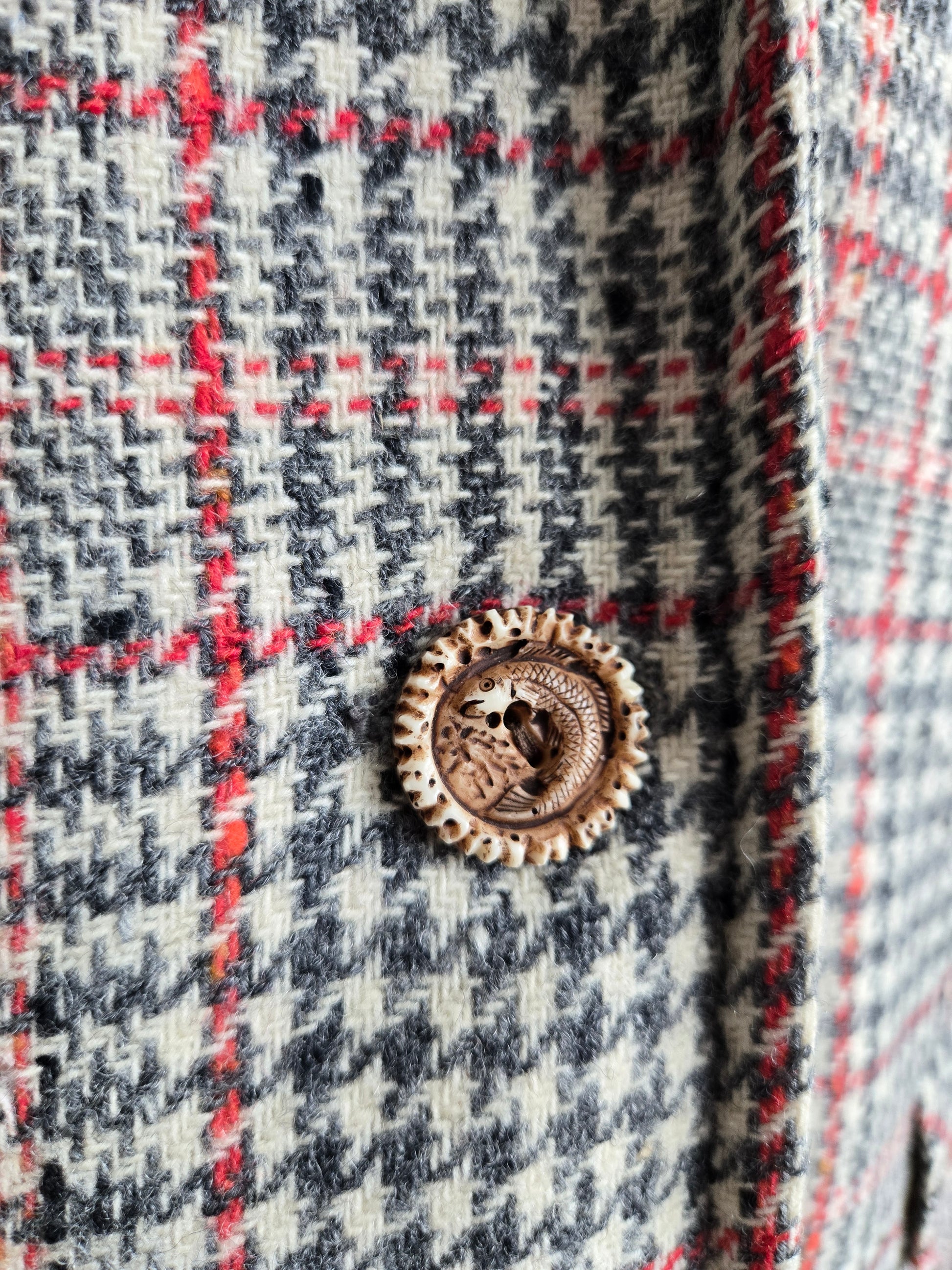 Seatona Suits by Seaton Hall vintage 1960s wool plaid long jacket. It is a beautiful palette of ivory, gray, and red with a slight slag yarn of a yellowish brown color that shows up throughout the plaid. It has the coolest buttons I have ever personally seen that seem to be fish carved into a type of bone or antler. Two drop pockets and a full acetate satin liner. It is in amazing conditions with no imperfections to note. It is almost more of a blazer weight, but has the silhouette of a jacket. Cool piece!!