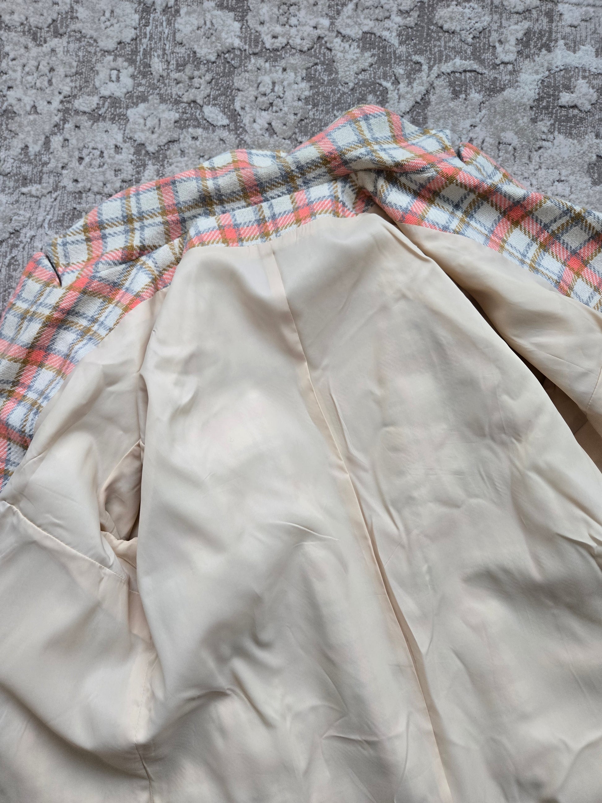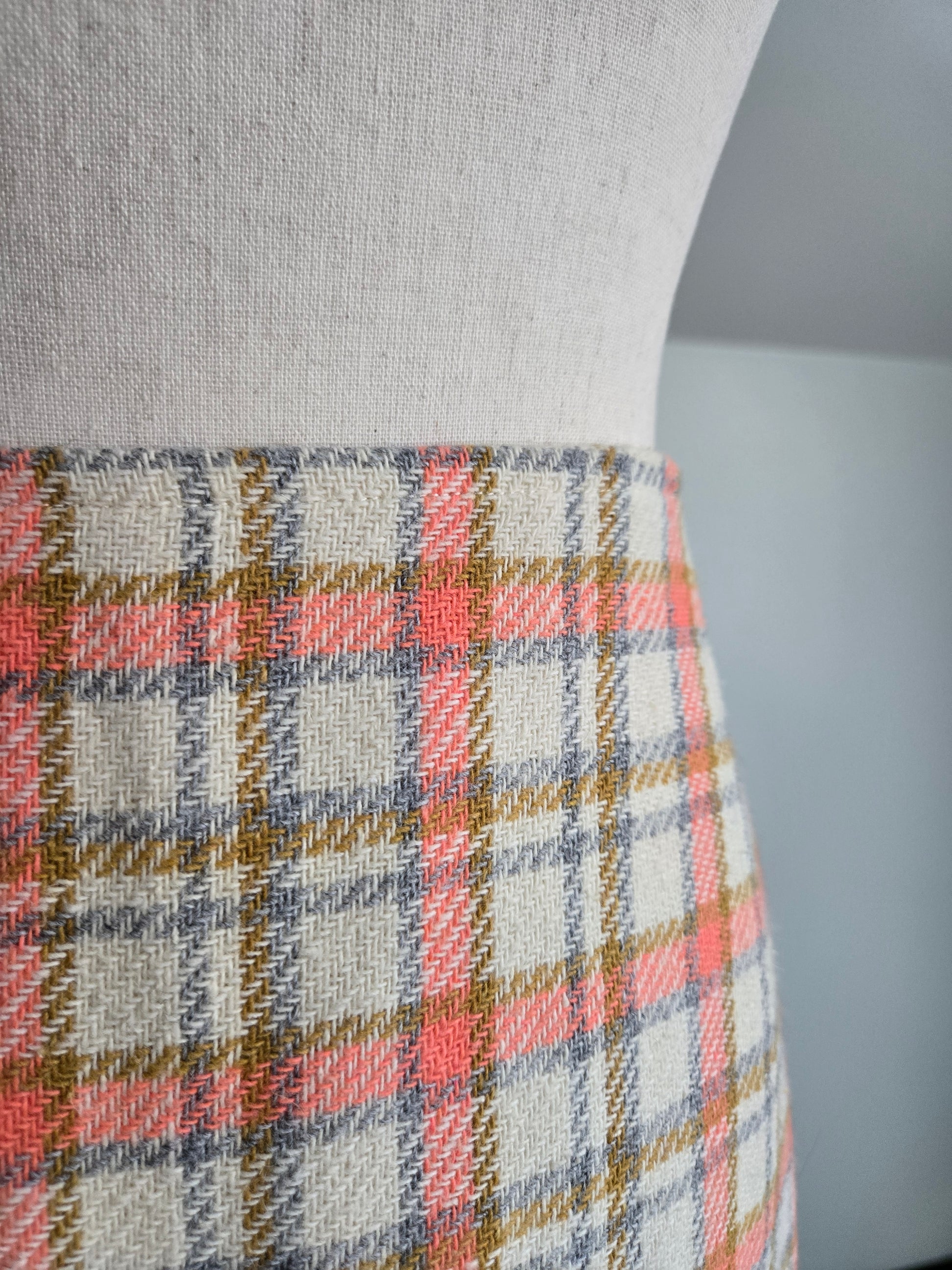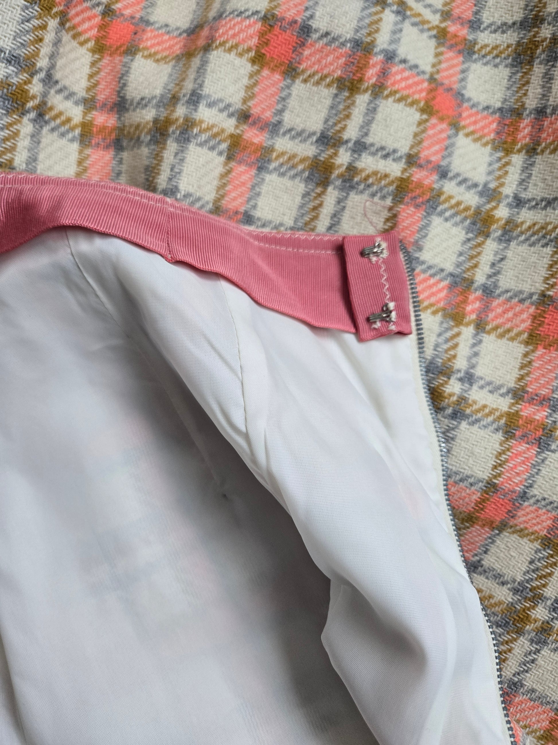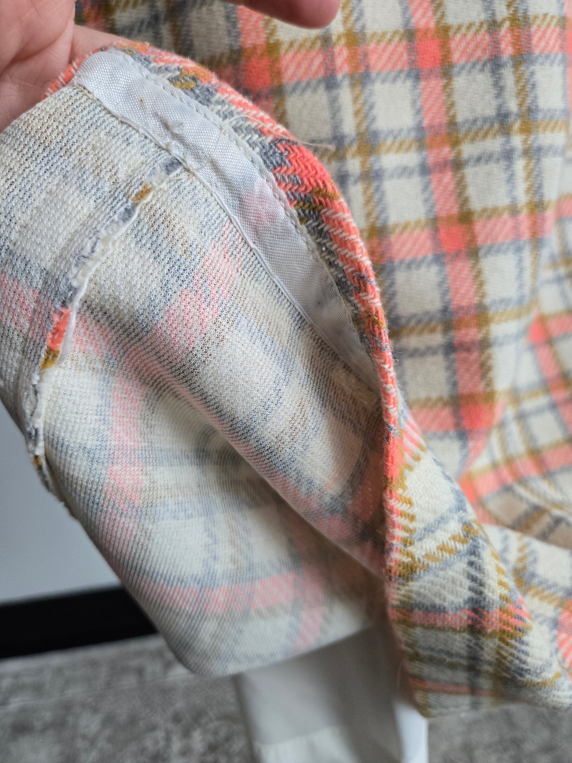 Vintage coral and brown plaid blazer and skirt two piece set. The plaid is a gorgeous palette of coral pink, olive green, gray, and ivory. It has fabric covered buttons at center front and the skirt has a metal zipper and hook closures. Both pieces are fully lined and very well made. Both are in perfect condition.