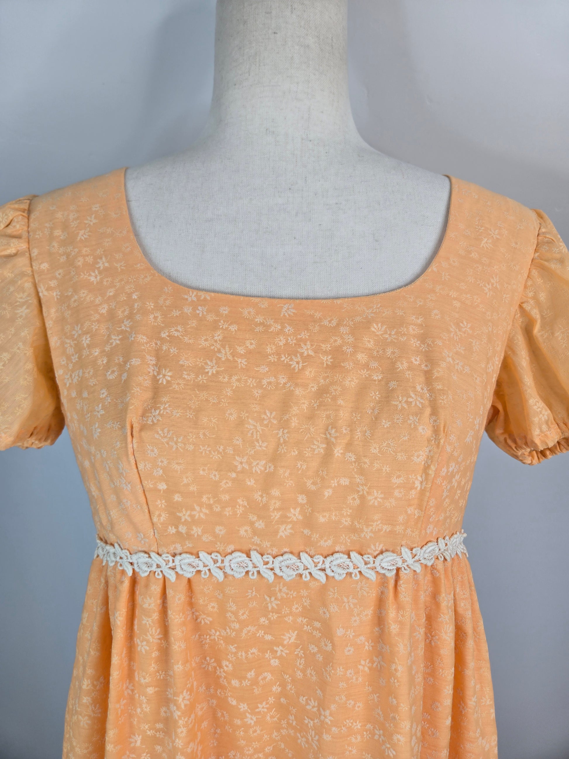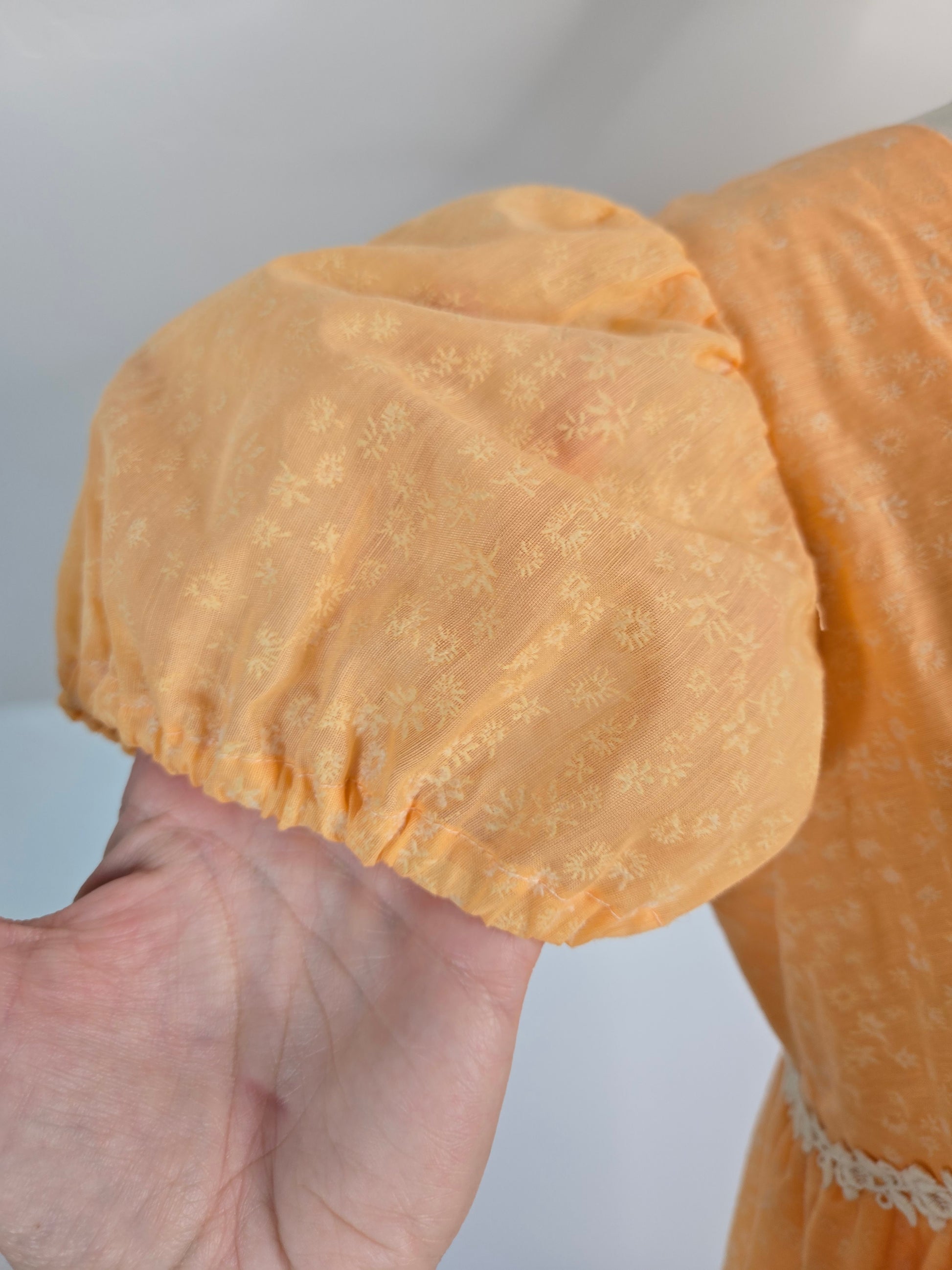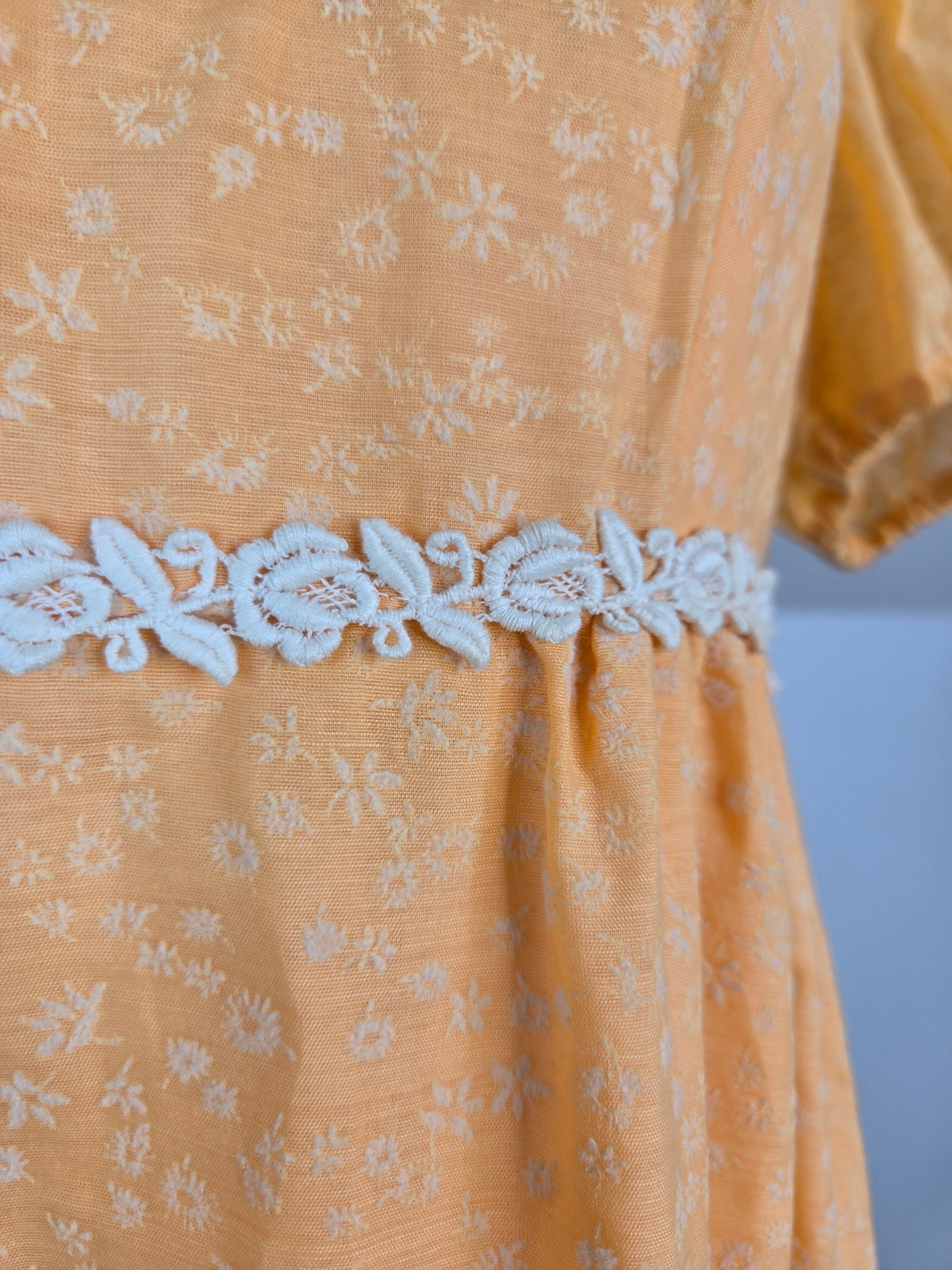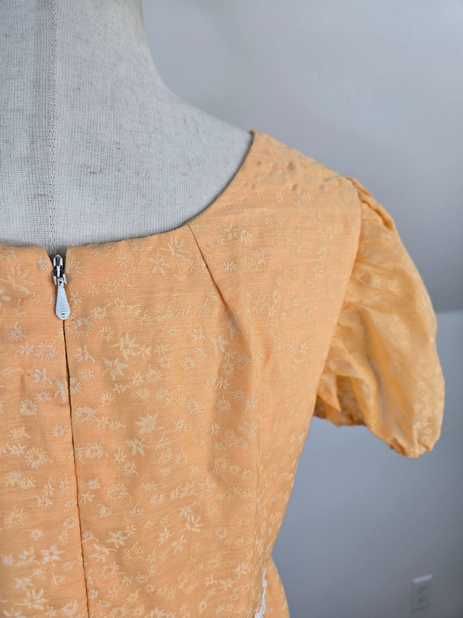 Vintage 1960s peach colored cotton coquette style empire waist dress. She has a textured floral jaquard throughout the main fabric and small lace details at the empire waist and around the bottom hem ruffle. There are small shear puff sleeves that have a corded band to create the ruching effect, but it is not elastic, so it is loose and there is no stretch. This was intentional and is not an imperfection. There is a metal zipper down center back and she is in perfect condition and has been cleaned.
