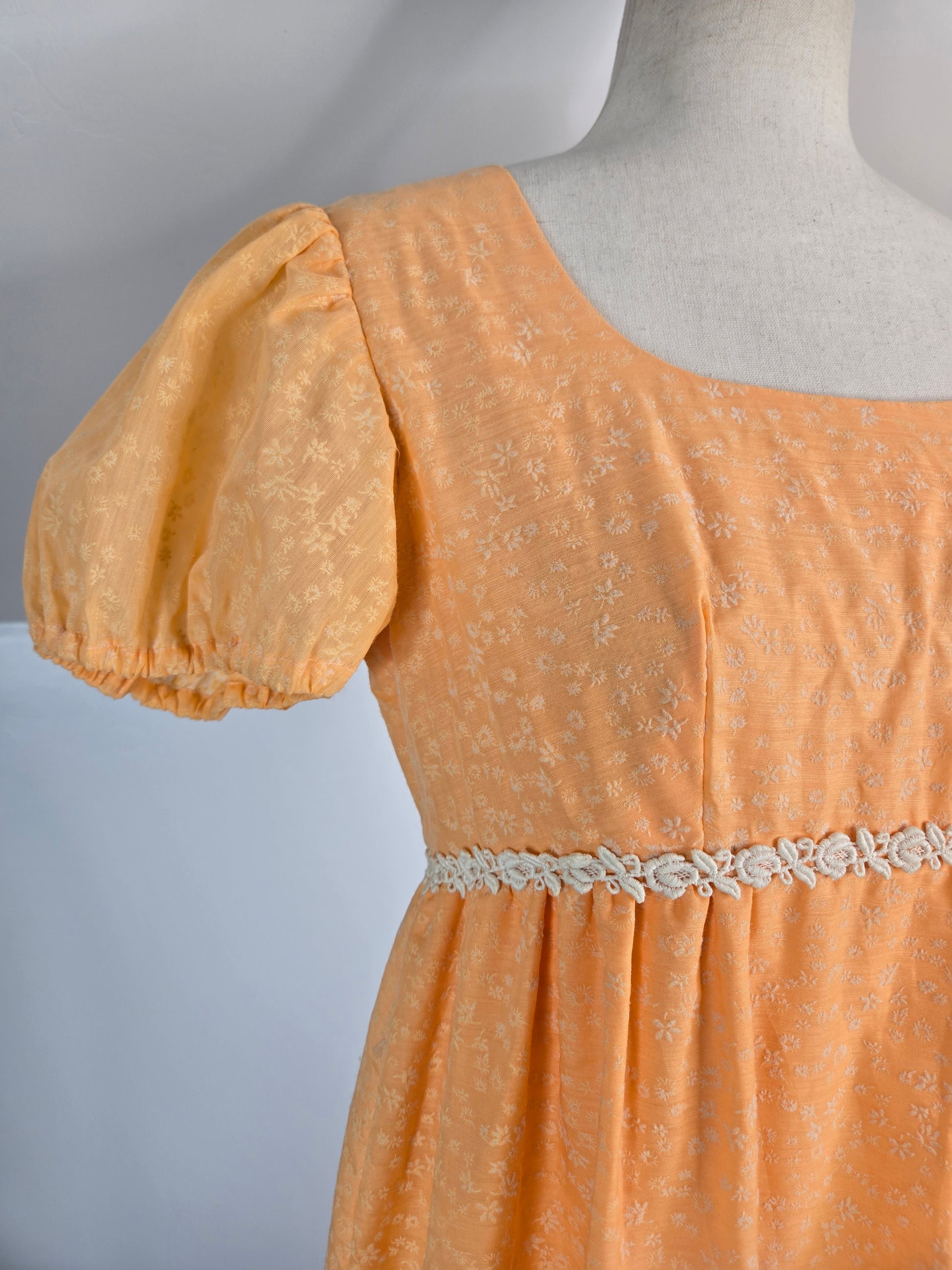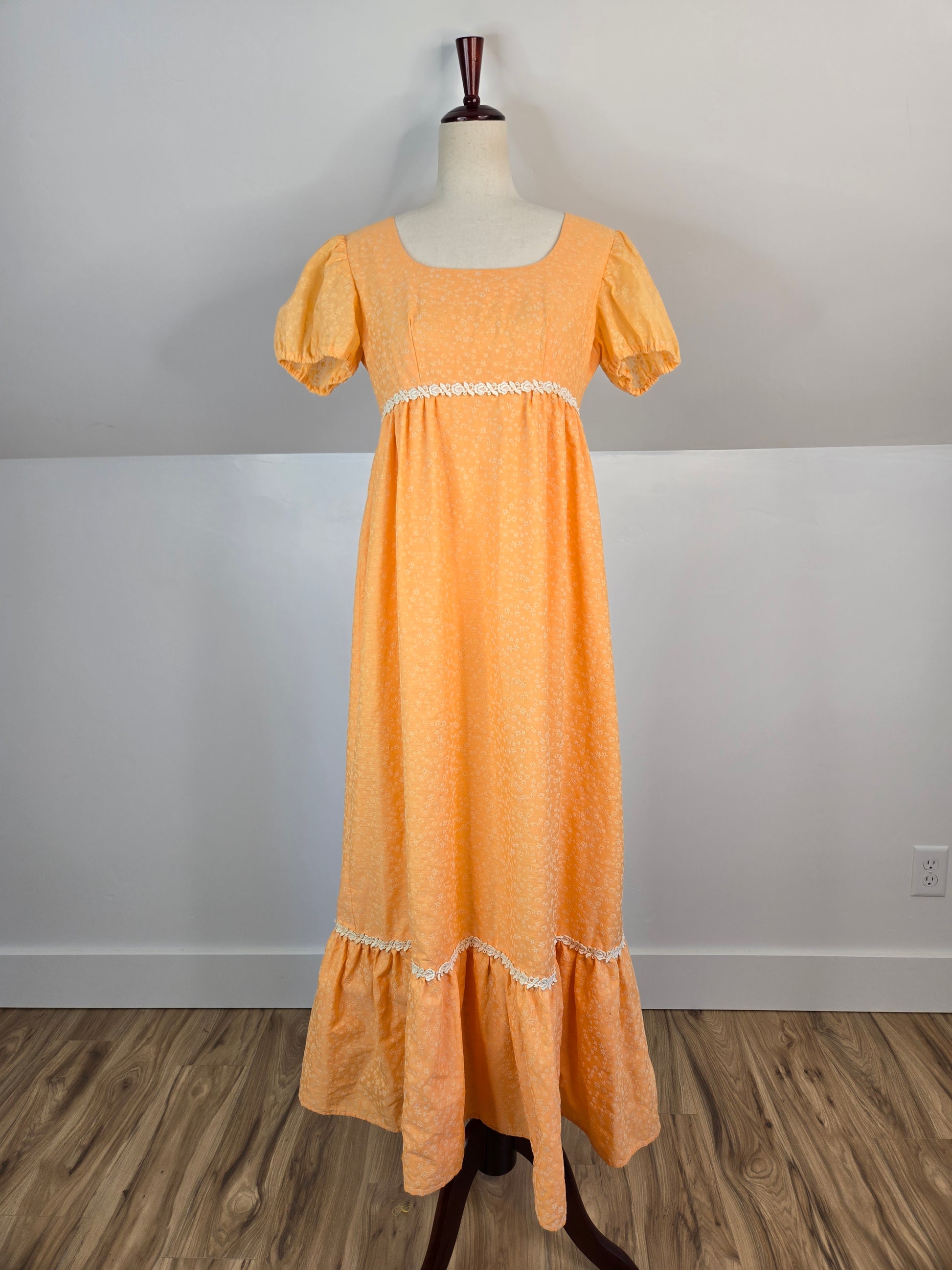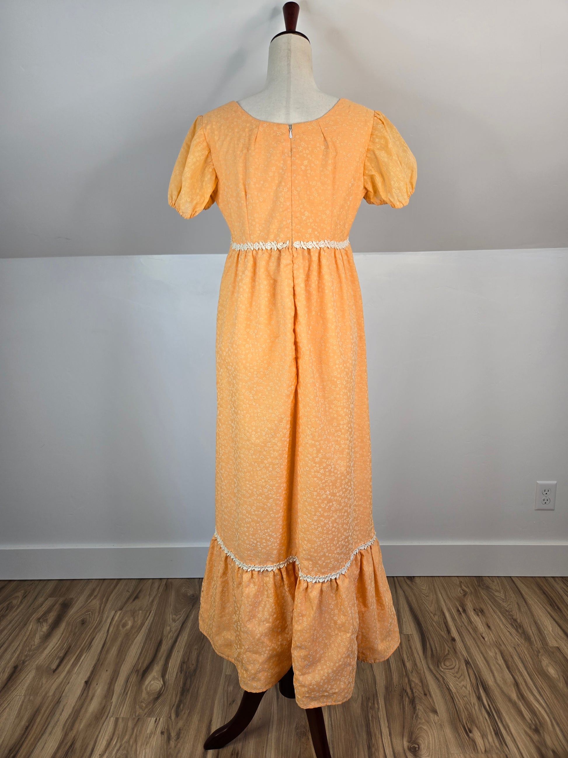 Vintage 1960s peach colored cotton coquette style empire waist dress. She has a textured floral jaquard throughout the main fabric and small lace details at the empire waist and around the bottom hem ruffle. There are small shear puff sleeves that have a corded band to create the ruching effect, but it is not elastic, so it is loose and there is no stretch. This was intentional and is not an imperfection. There is a metal zipper down center back and she is in perfect condition and has been cleaned.